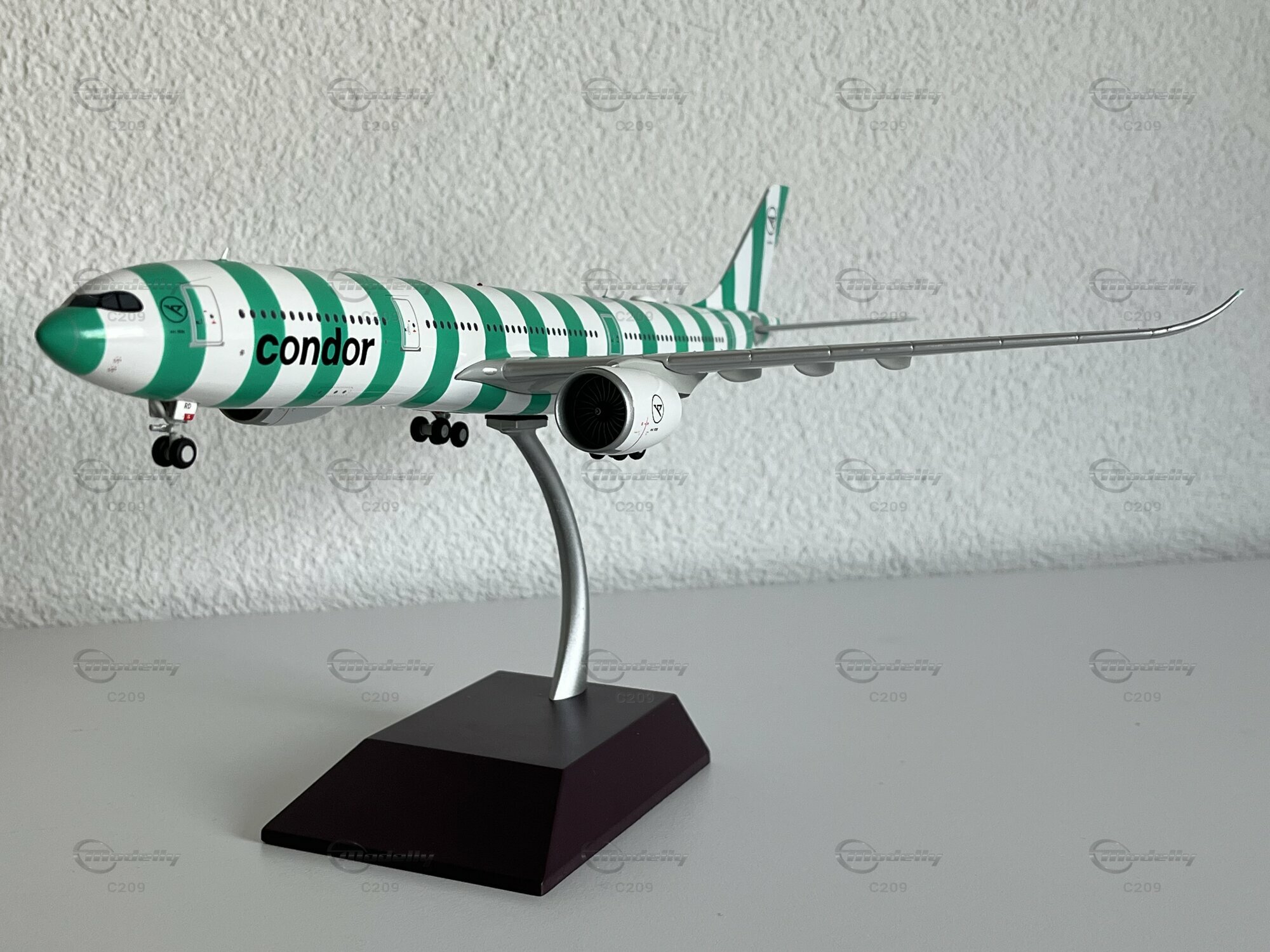 The model shows off a green-and-white stripe design that’s from the airline Condor. You can see meticulous details like the engine structure, the precise wing curvature, and the realistic landing gear as you gaze upon it. The airline logo and the website “condor.com” are displayed on the tail, along with the registration number D-ANRB, which is also easy to spot. Plus, it comes with a neat stand so you can show it off in all its flying glory.