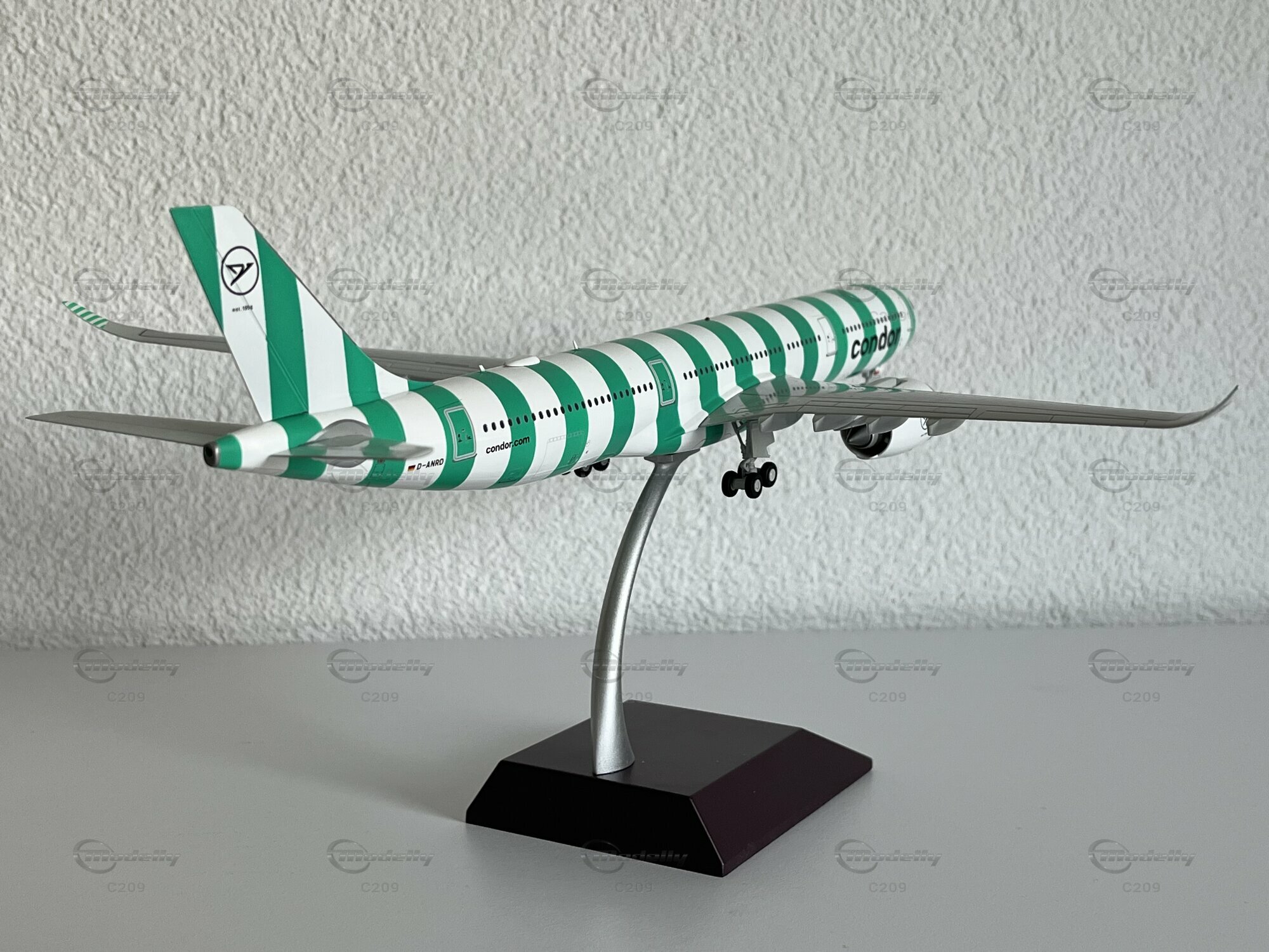 Condor was founded in 1955 and is based in Frankfurt am Main, Germany. It started out as a charter airline but has become one of the most popular holiday airlines in Europe. Condor operates a fleet of modern aircraft, including five Airbus A330-900neo planes mainly used for long-haul flights. Aside from Europe, Africa, and the Middle East, Condor flies to destinations like the Caribbean and North America. The green-and-white striped livery of the model represents the airline's refreshed corporate identity, launched in 2022, which aims to highlight Condor as the go-to “Holiday Carrier.”