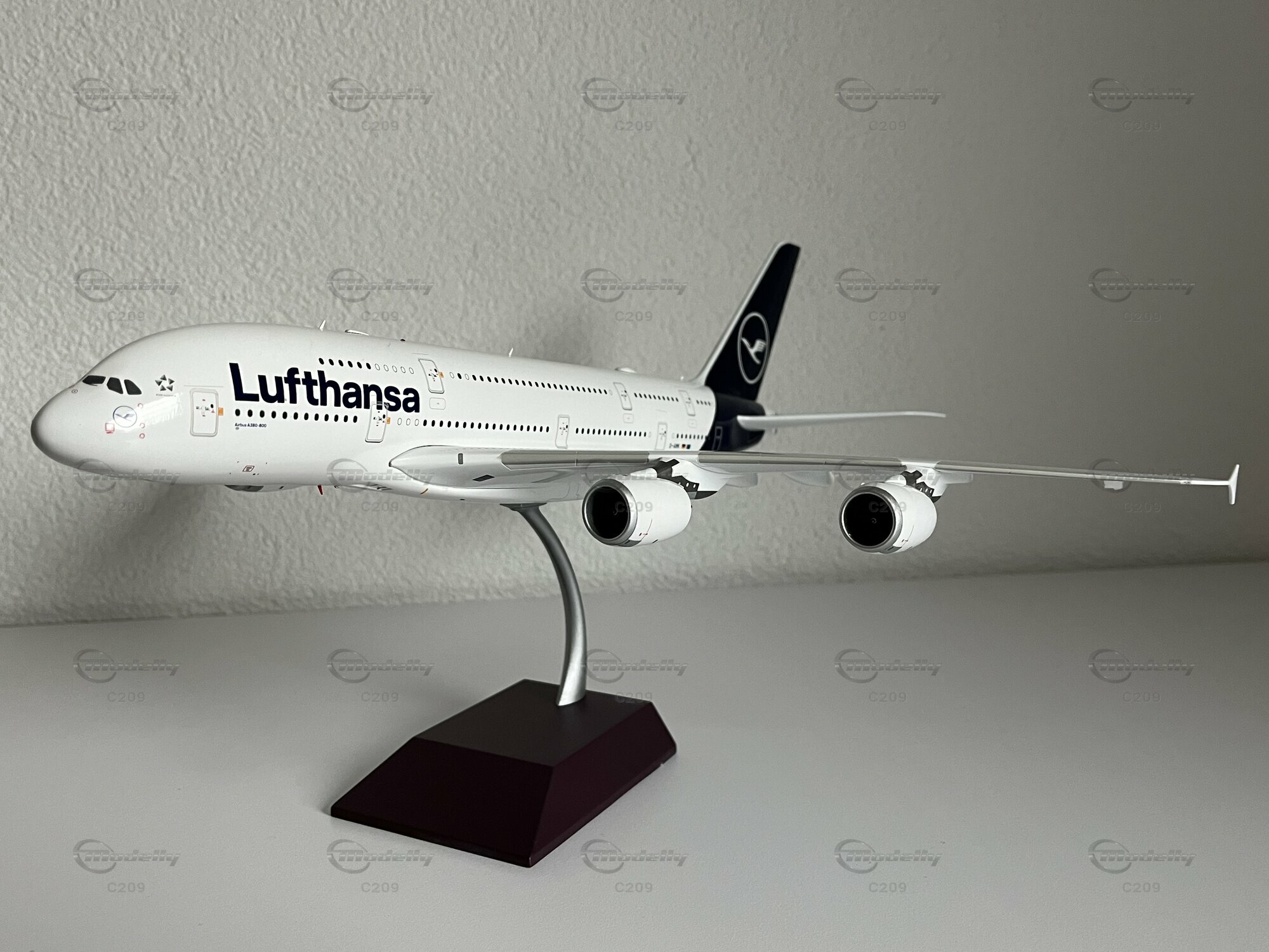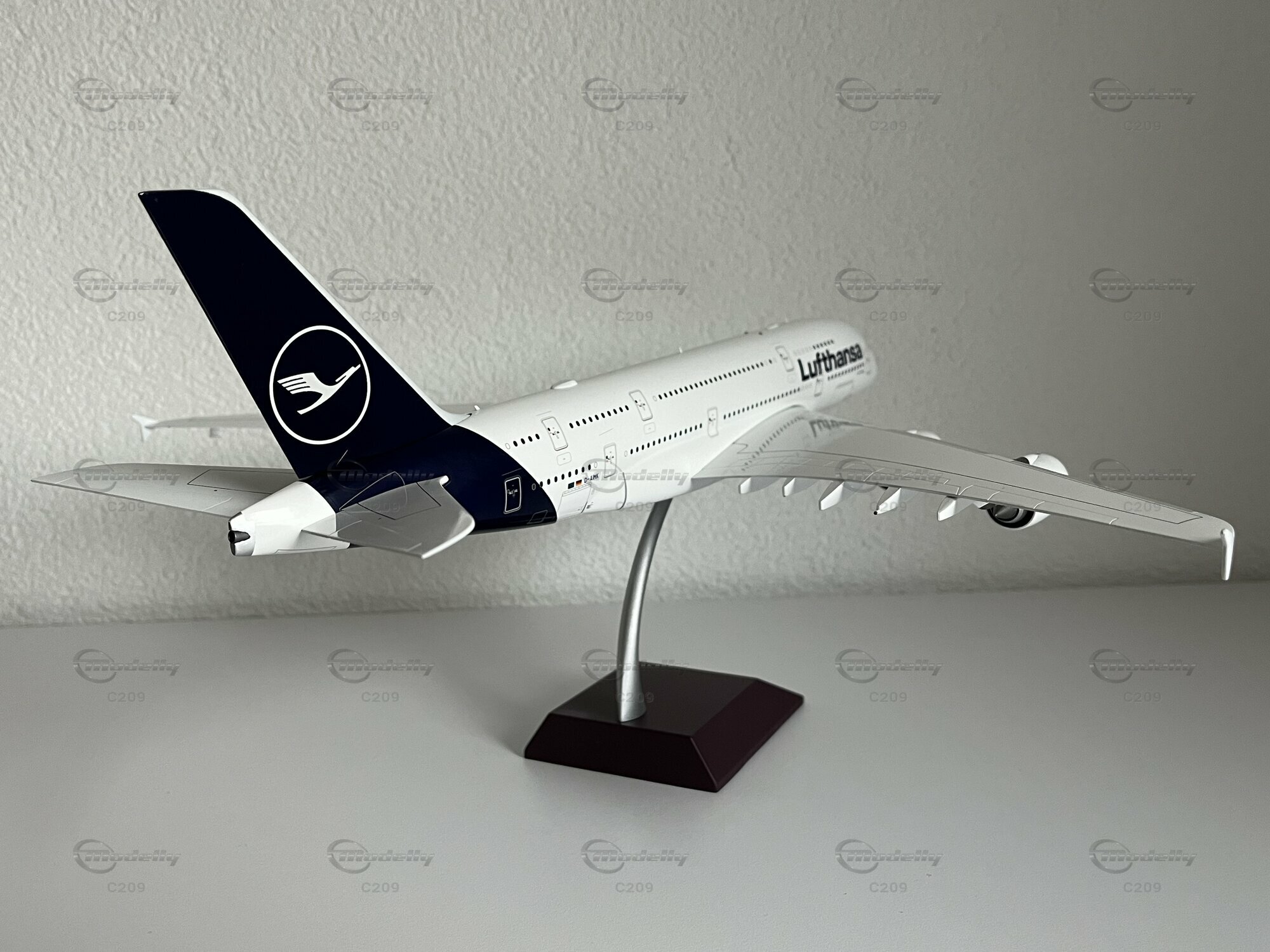 The livery depicted on the model belongs to Lufthansa, one of the most prominent and oldest airlines globally. Established in 1953, Lufthansa is headquartered in Germany. The airline operates multiple Airbus A380 aircraft, including the A380-841 represented in this miniature. The model showcases the distinctive Lufthansa livery with the dark blue tail and the iconic crane logo in white, as well as the "Lufthansa" lettering along the fuselage in large, clear letters. This detailed livery offers a realistic portrayal of the actual aircraft, enhancing the value of the model in any collector's display case.