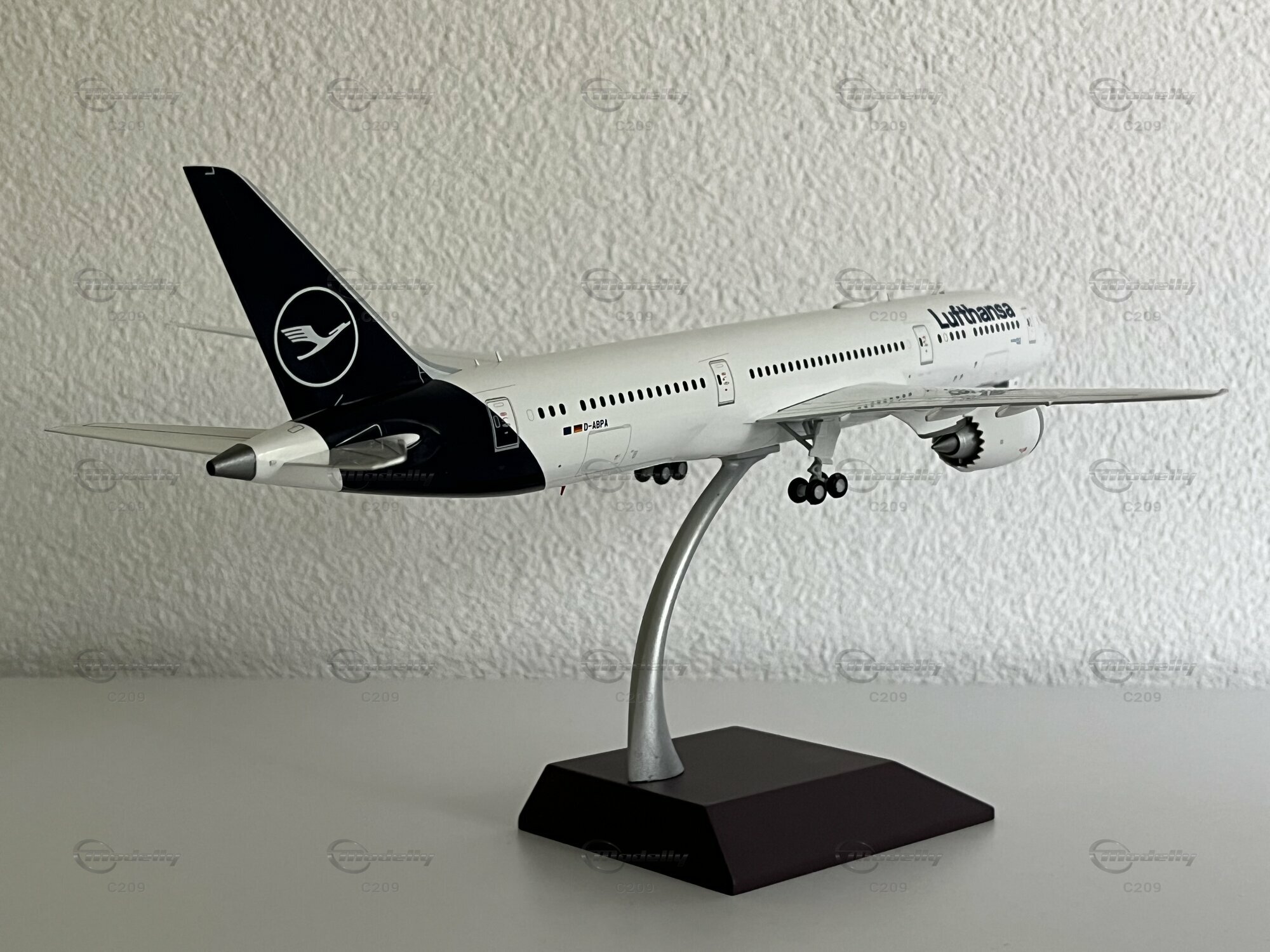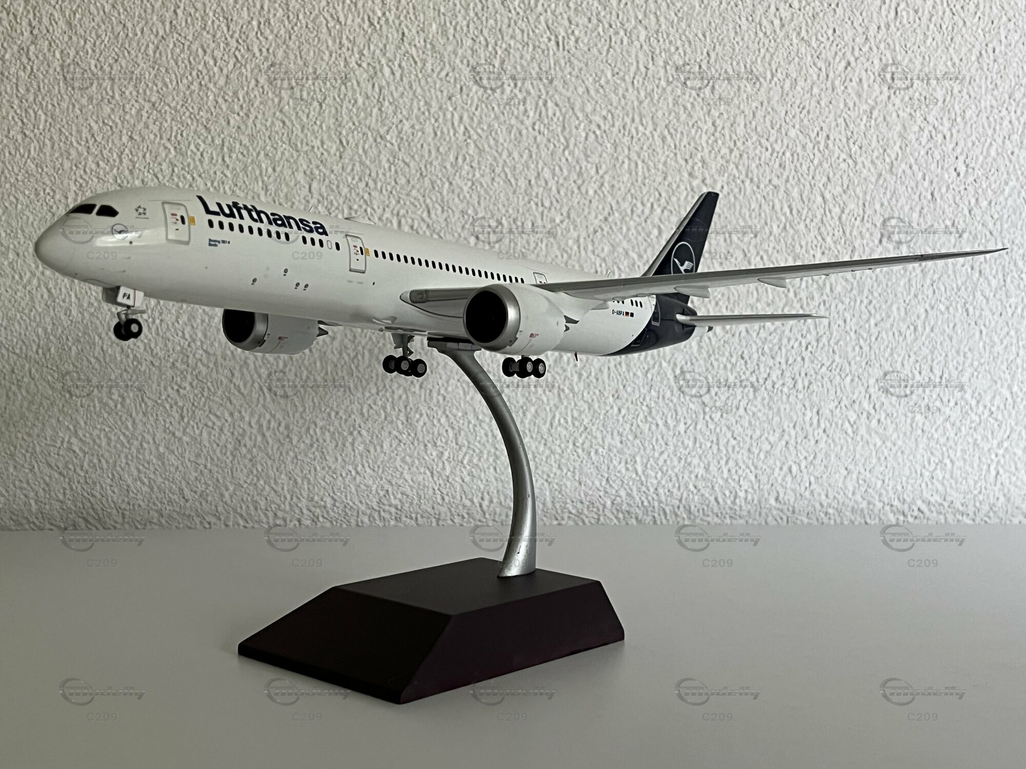 The 1/200 scale reproduction from Gemini Jets shown in the pictures features the Lufthansa design. Lufthansa, founded on January 6, 1953, is the largest German airline headquartered in Cologne. They operate around 30 units of the Boeing 787-9 "Dreamliner". The dark blue tail fin and other distinctive elements of the livery blend harmoniously with the overall aircraft, reflecting Lufthansa's brand identity. The detailed portrayal of the livery on the model makes it a special piece for collectors.