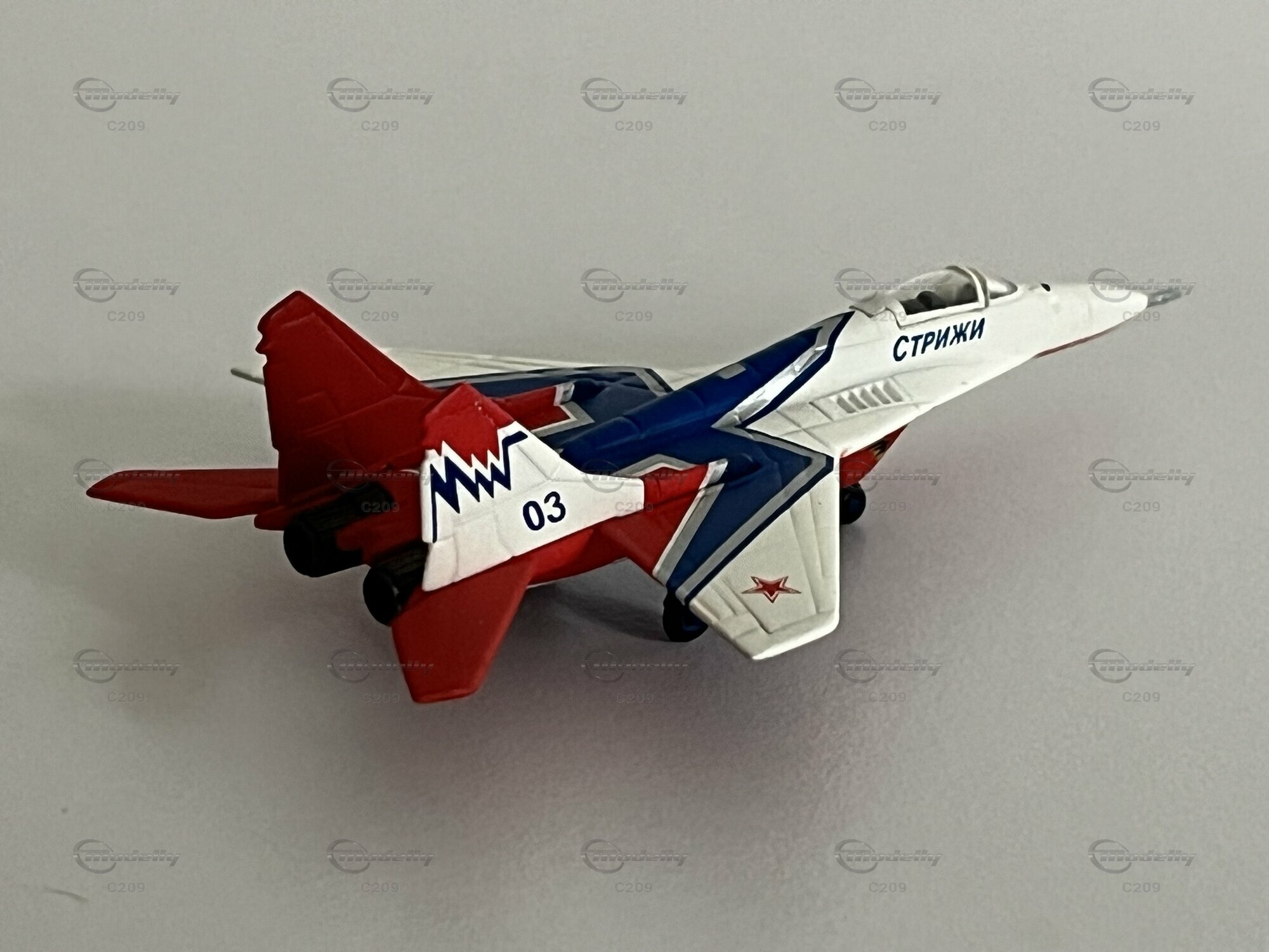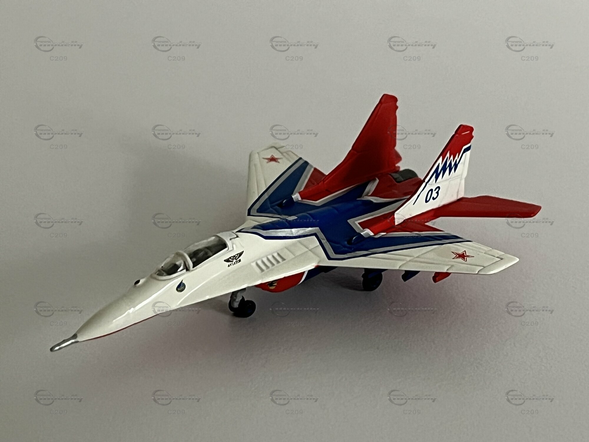 The miniature shown here is a 1/200 scale model of the Mikoyan-Gurevich MiG-29, manufactured by Herpa Wings. This model stands out for its faithful reproduction of the original and high-quality material. The miniature is made of diecast metal, allowing for a resilient and precise replication. This particular miniature belongs to the collection of Modelly member "C209" and is labeled as number 03. The model is true to scale and painted with attention to detail, faithfully representing a real MiG-29 aircraft, including the distinctive red stars on the wings.