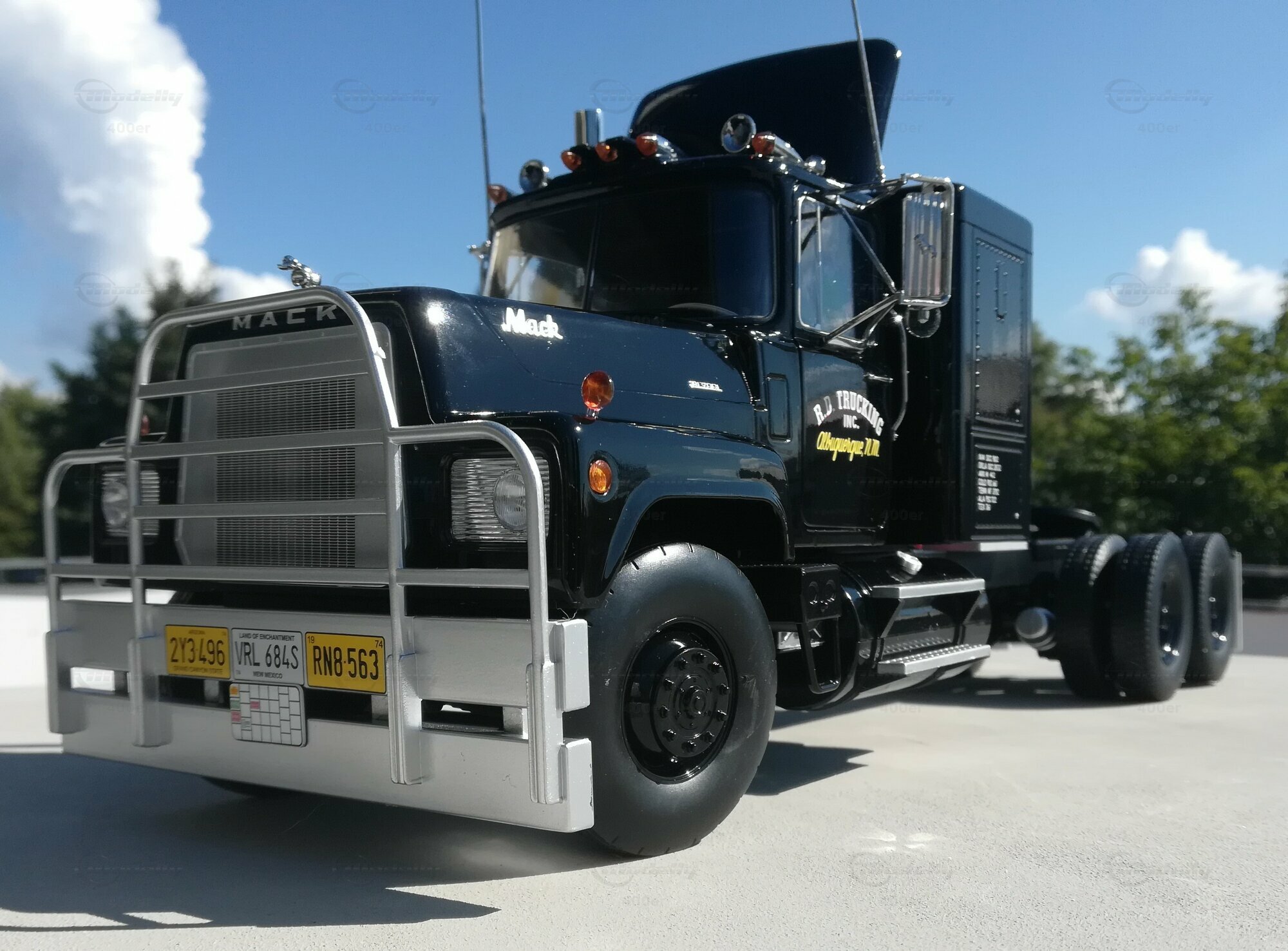 In terms of appearance, the model displays impressive precision. It is painted in a deep black color and features the inscription "R.D. Trucking Inc." in yellow lettering on the cabin. These markings are executed clearly and sharply, enhancing the model's authenticity. The wheels and tires are also accurately designed, providing a realistic portrayal of the heavy-duty vehicle. The small front headlights and the hood ornament – a small dog, the trademark of MACK – have been meticulously replicated. The replica of the MACK RS700 by Road Kings in a scale of 1/18 is not only an excellent collector's item but also a respectful homage to a classic of road history.