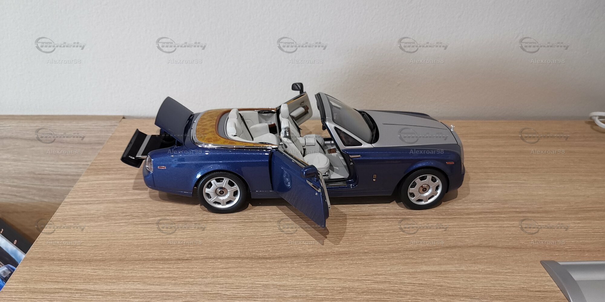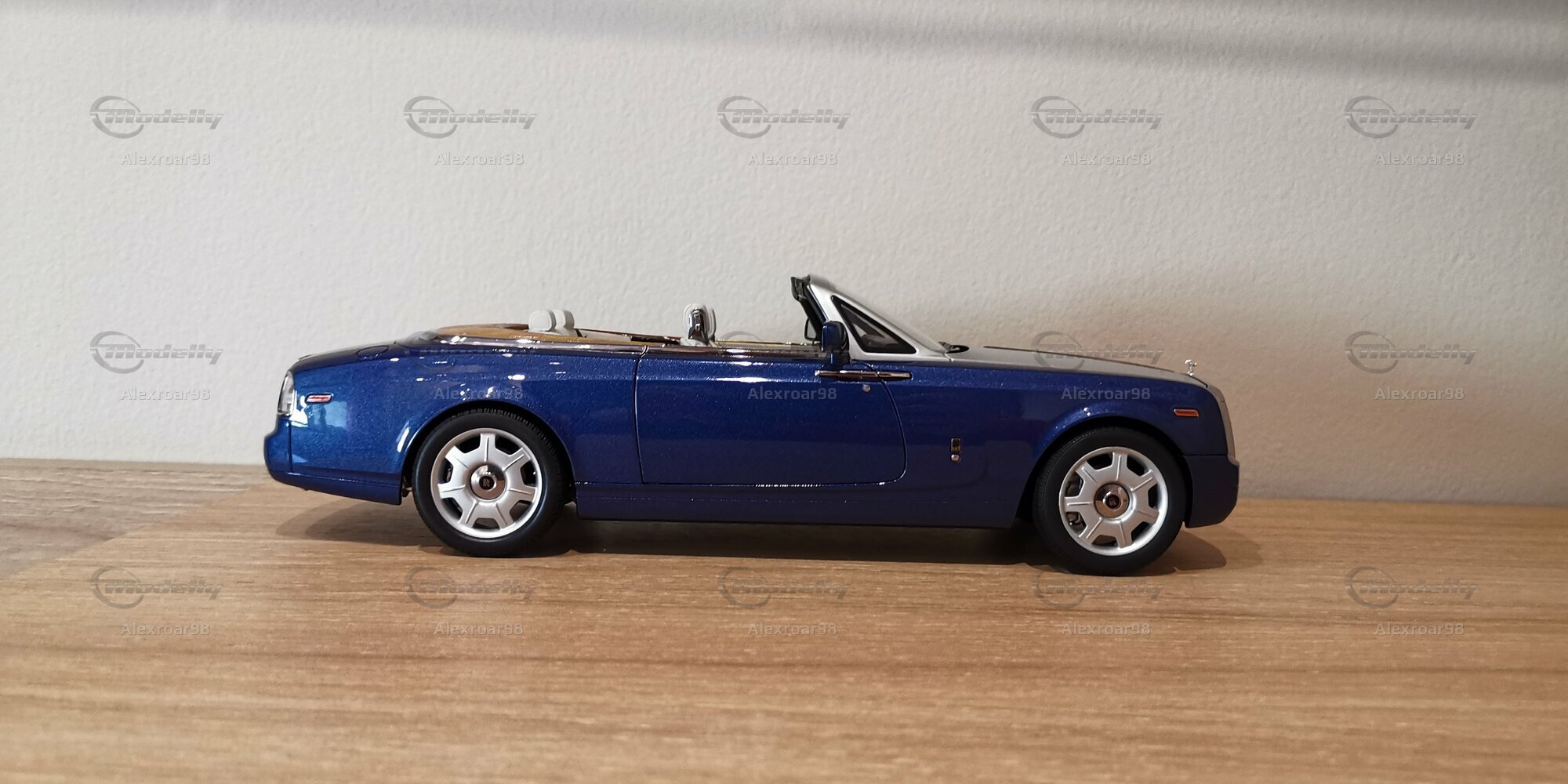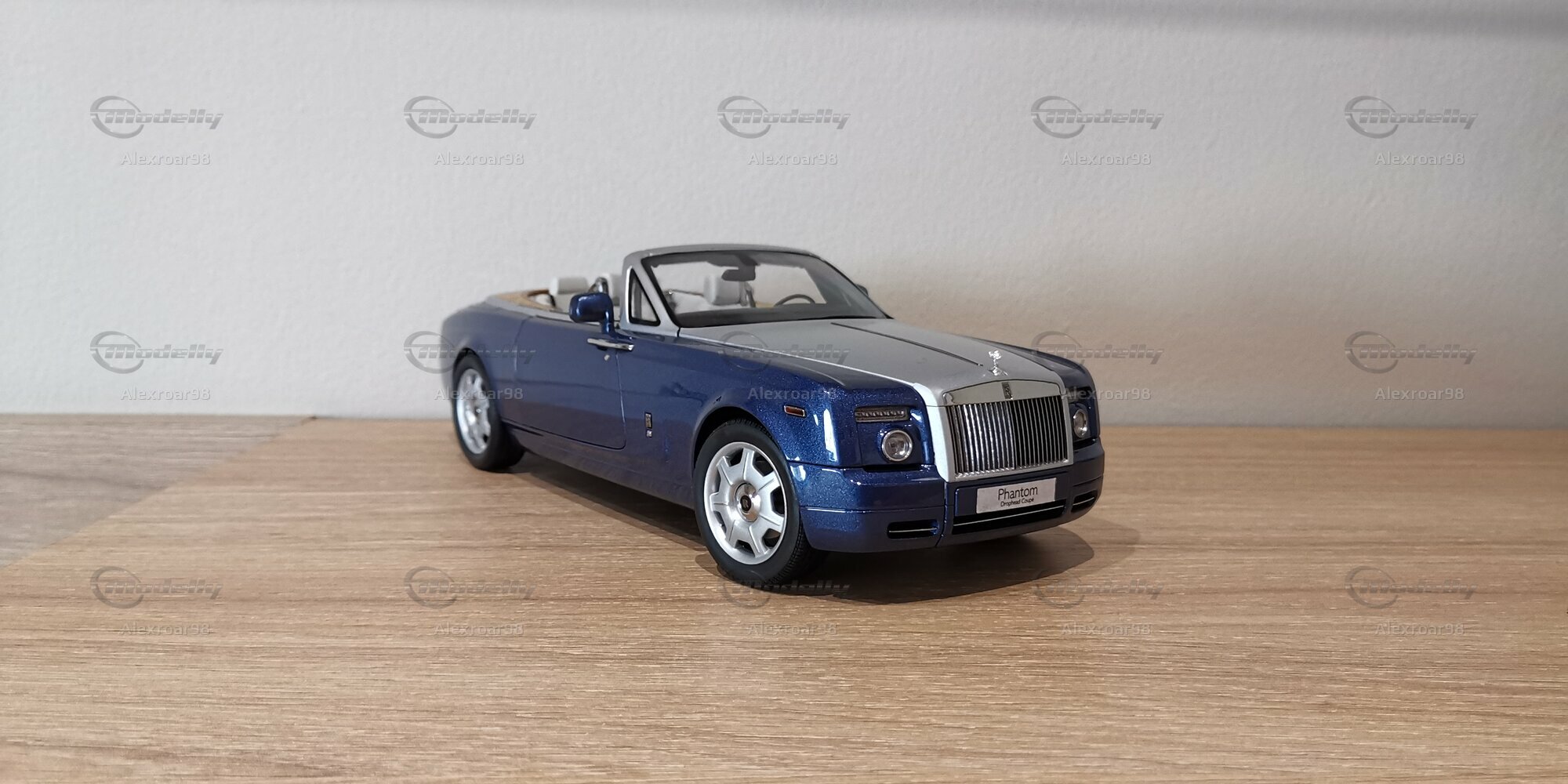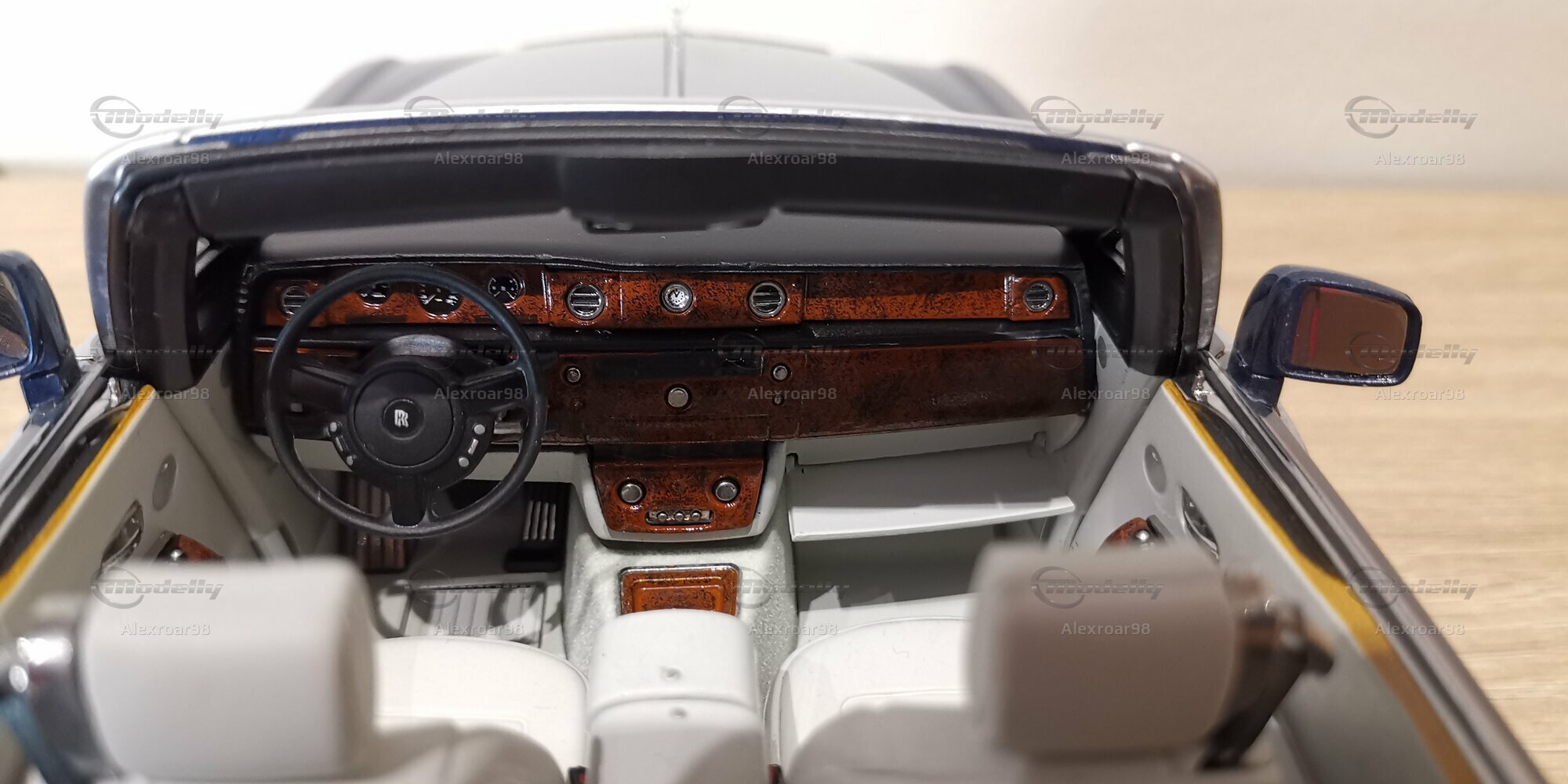 The model shown here is a 1/18 replica of the Rolls-Royce Phantom Drophead Coupé, made by Kyosho. These 1/18 scale replicas are super popular among collectors since they use diecast materials, making them sturdy while also capturing fine details. The precision with which the proportions and lines of the body were replicated reflects the elegance of the original. Special attention was also given to the interior design. The model’s interior features light-colored seating that resembles the luxurious leather of the original, complemented by realistic wood elements on the rear deck.