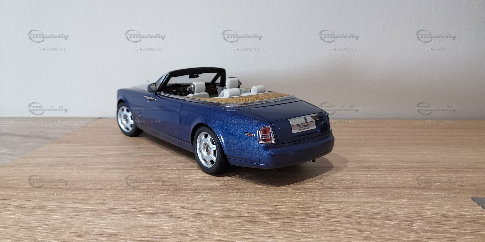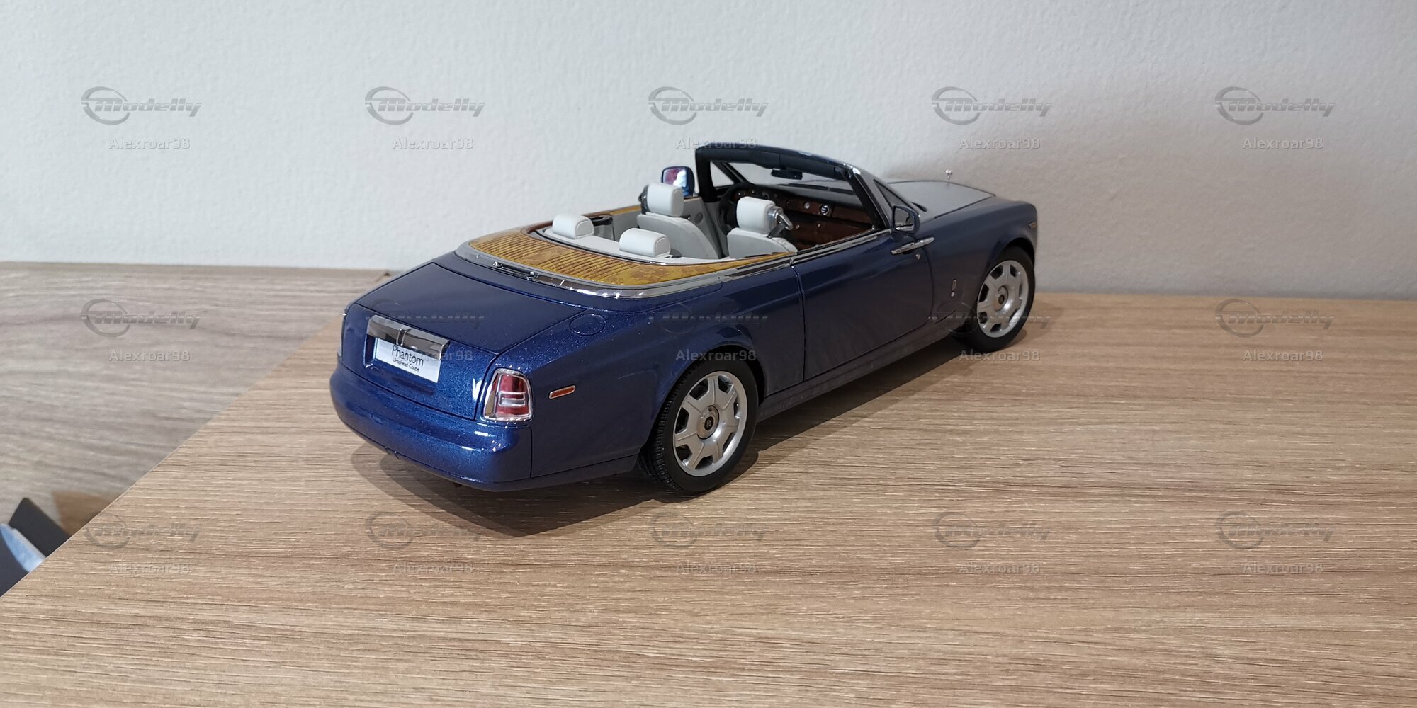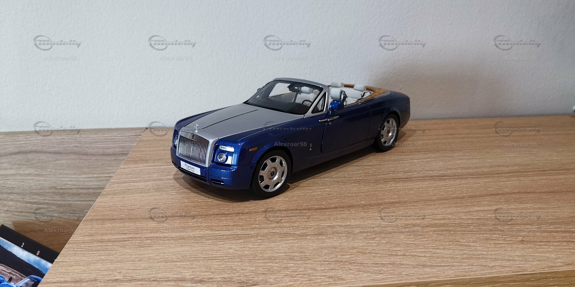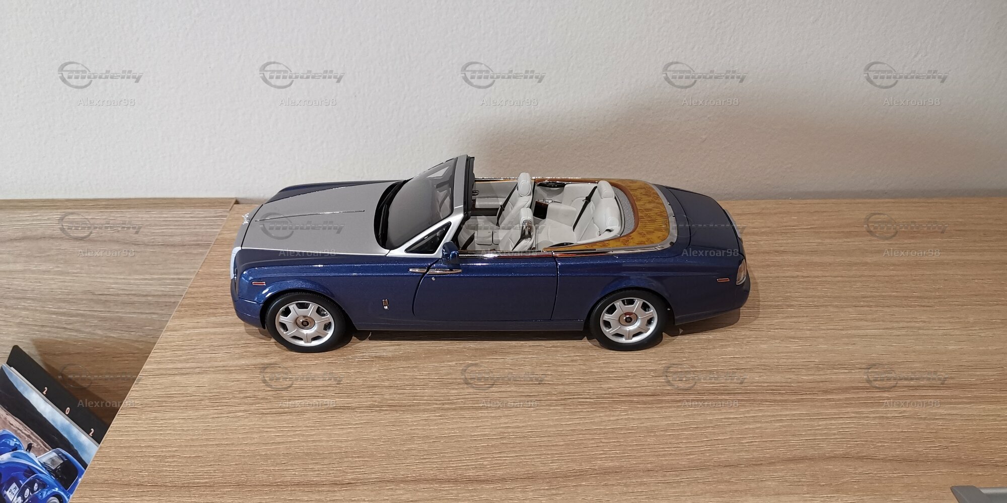 The model shown here is a 1/18 replica of the Rolls-Royce Phantom Drophead Coupé, made by Kyosho. These 1/18 scale replicas are super popular among collectors since they use diecast materials, making them sturdy while also capturing fine details. The precision with which the proportions and lines of the body were replicated reflects the elegance of the original. Special attention was also given to the interior design. The model’s interior features light-colored seating that resembles the luxurious leather of the original, complemented by realistic wood elements on the rear deck.