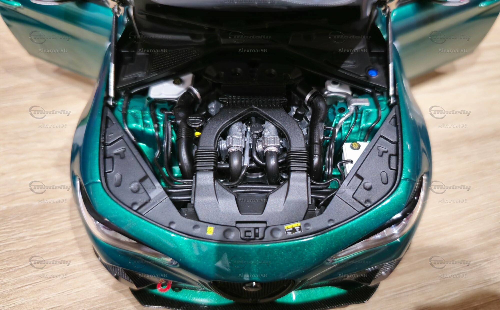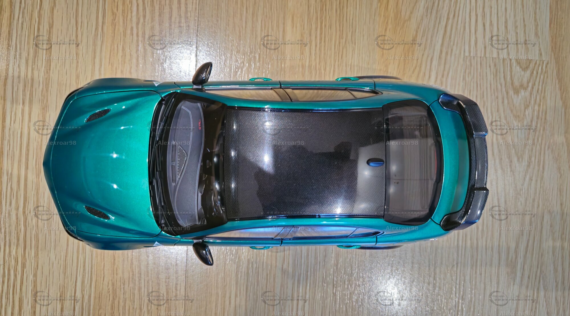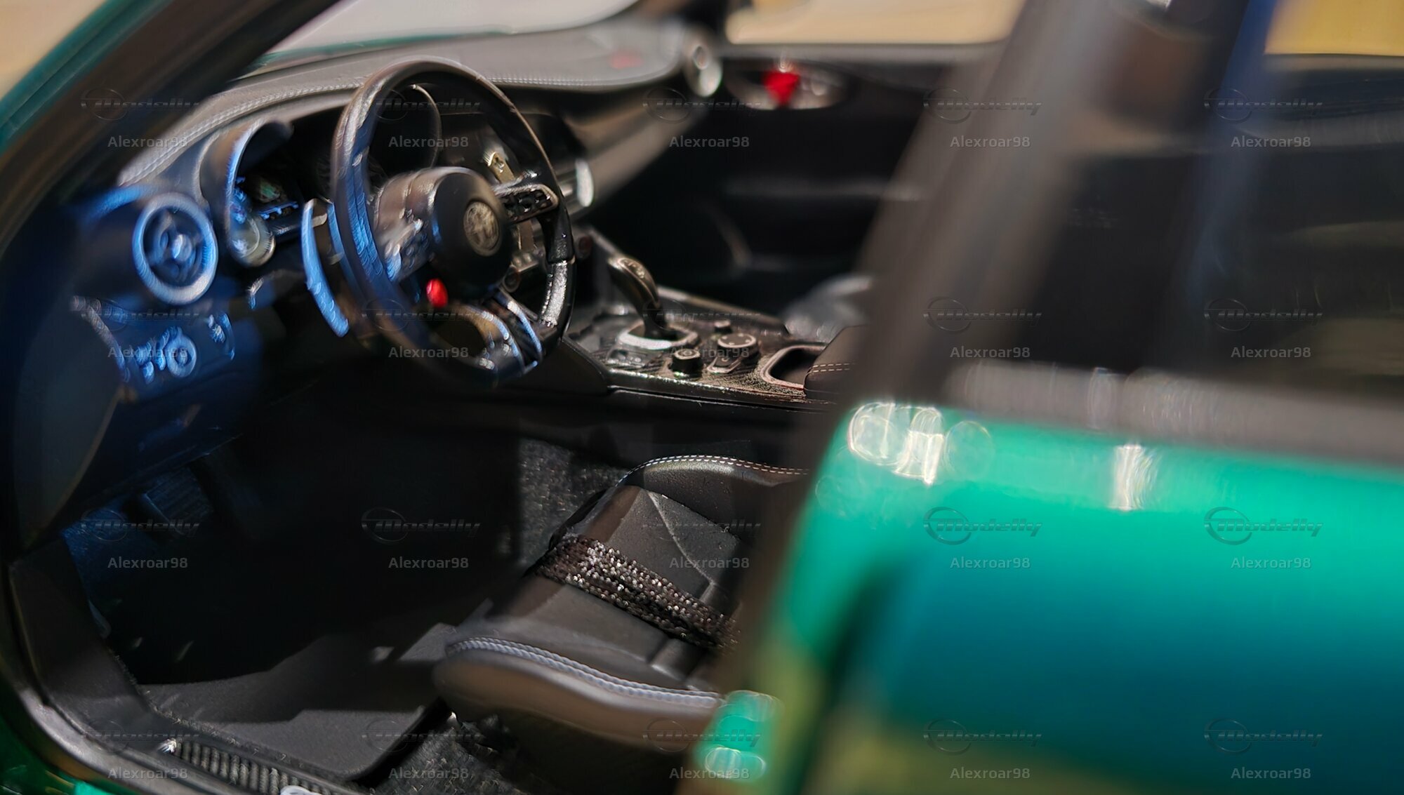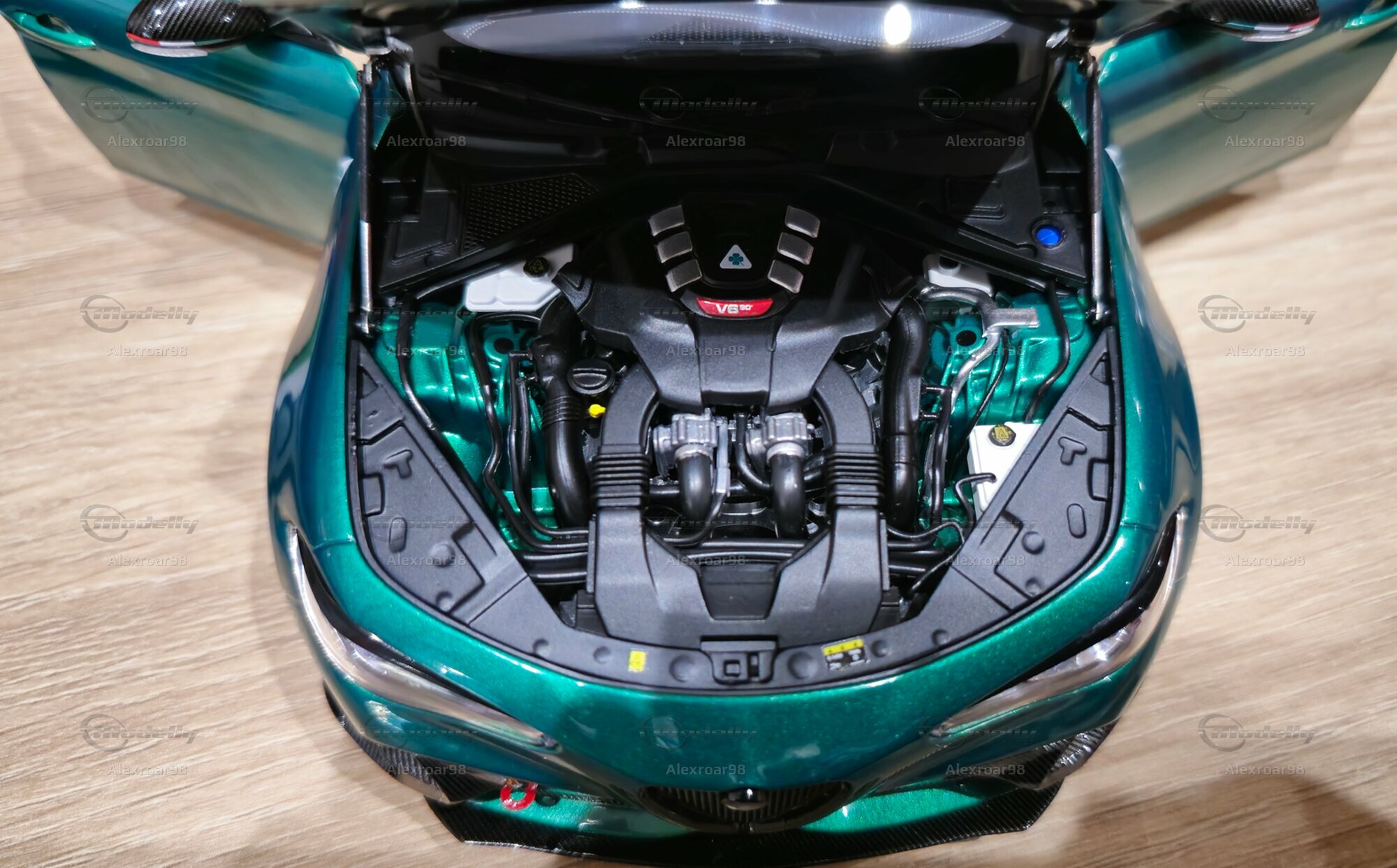 The 1/18 model shown in the picture is eye-catching with its vibrant green paint job and black accents. This color choice reflects the original paint of some limited edition GTAm models. The striking Alfa Romeo branding elements and the meticulously replicated air vents are impressive details. The big black Akrapovič wheels give the model an aggressive edge and are a signature feature of the real deal. The bright yellow Brembo brake components add to the sporty vibe of the ride. They didn’t skimp on the details when it comes to the signature rear spoiler and exhaust system that highlight its sporty design.
