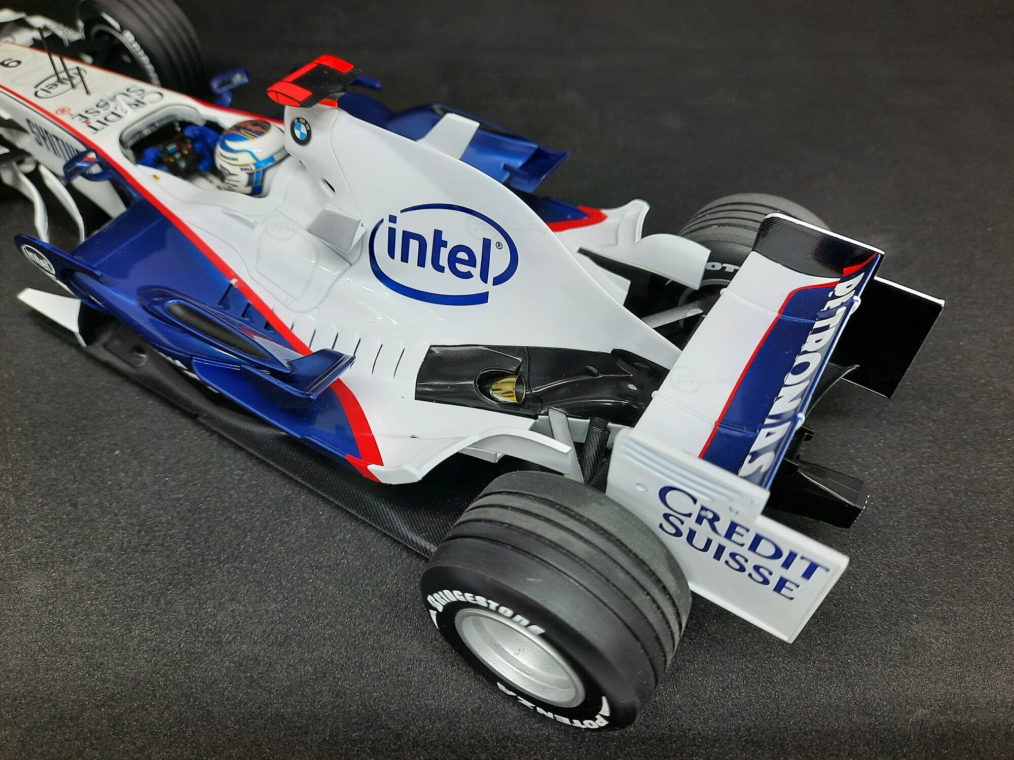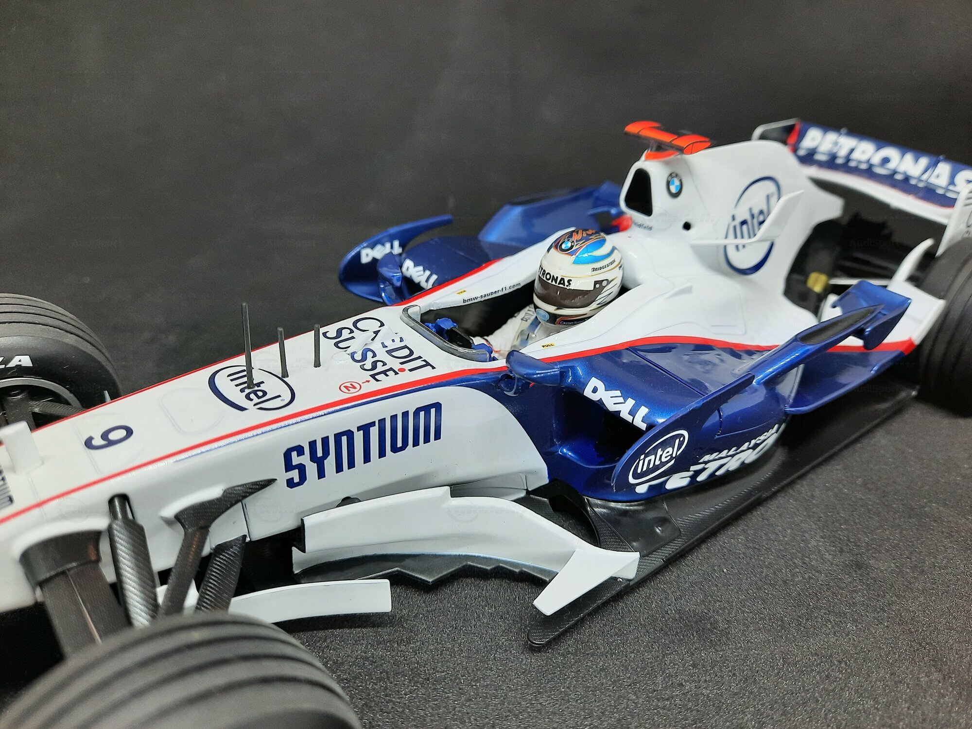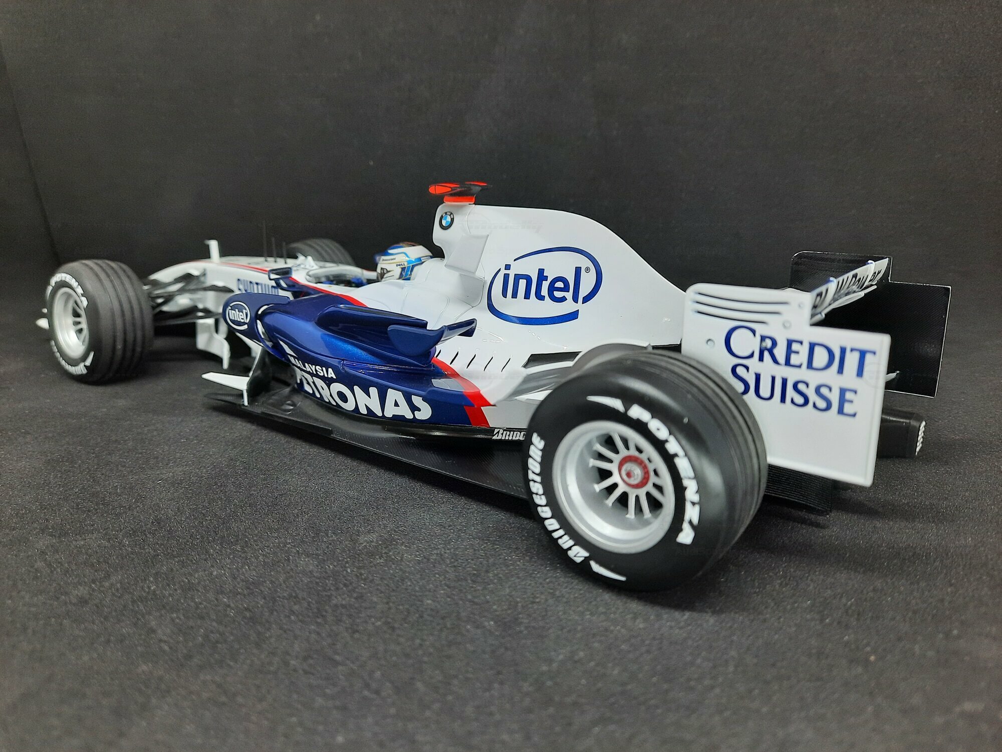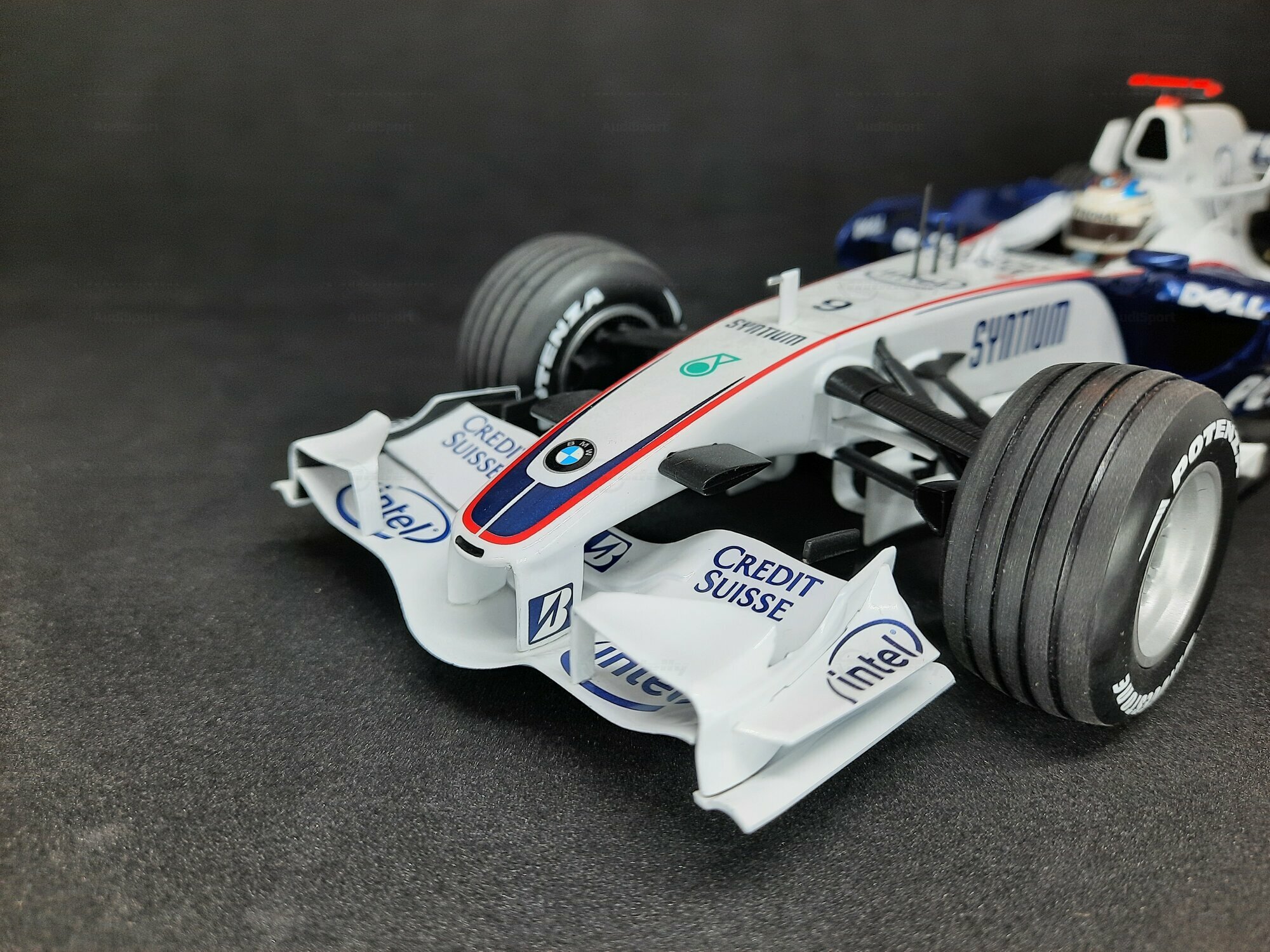 The 1/18 scale model of the BMW Sauber F1.07, manufactured by Minichamps, stands out for its meticulous attention to detail and precision. Made of resin, it showcases all the essential features of the original in impressive accuracy. The model in 1/18 scale, seen in the collection of Modelly member "AudiSport," bears the same sponsor logos as the actual vehicle, including the prominent brands of Petronas, Intel, and Credit Suisse. The color scheme combines white, dark blue, and red, giving the model a distinctive and authentic aesthetic. The Bridgestone tires are accurately represented, as well as the front, side, and rear spoilers meeting the aerodynamic demands of the real racing machine.