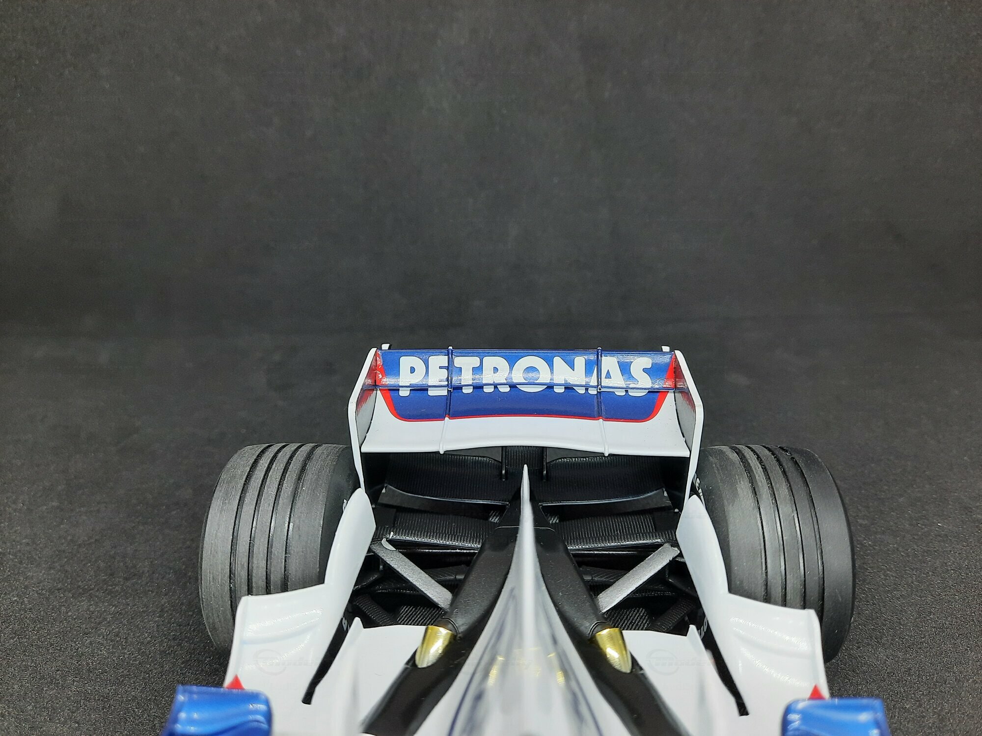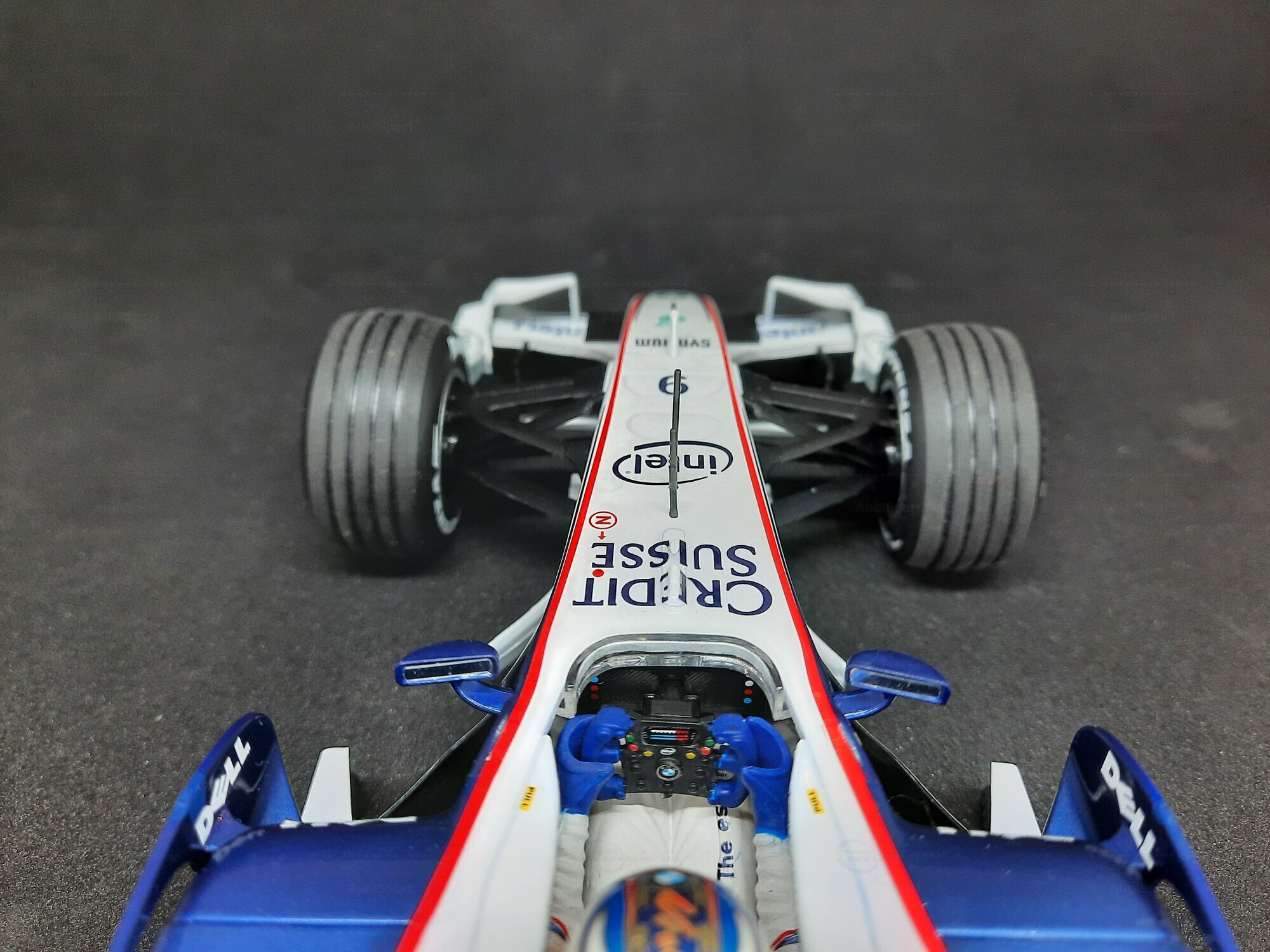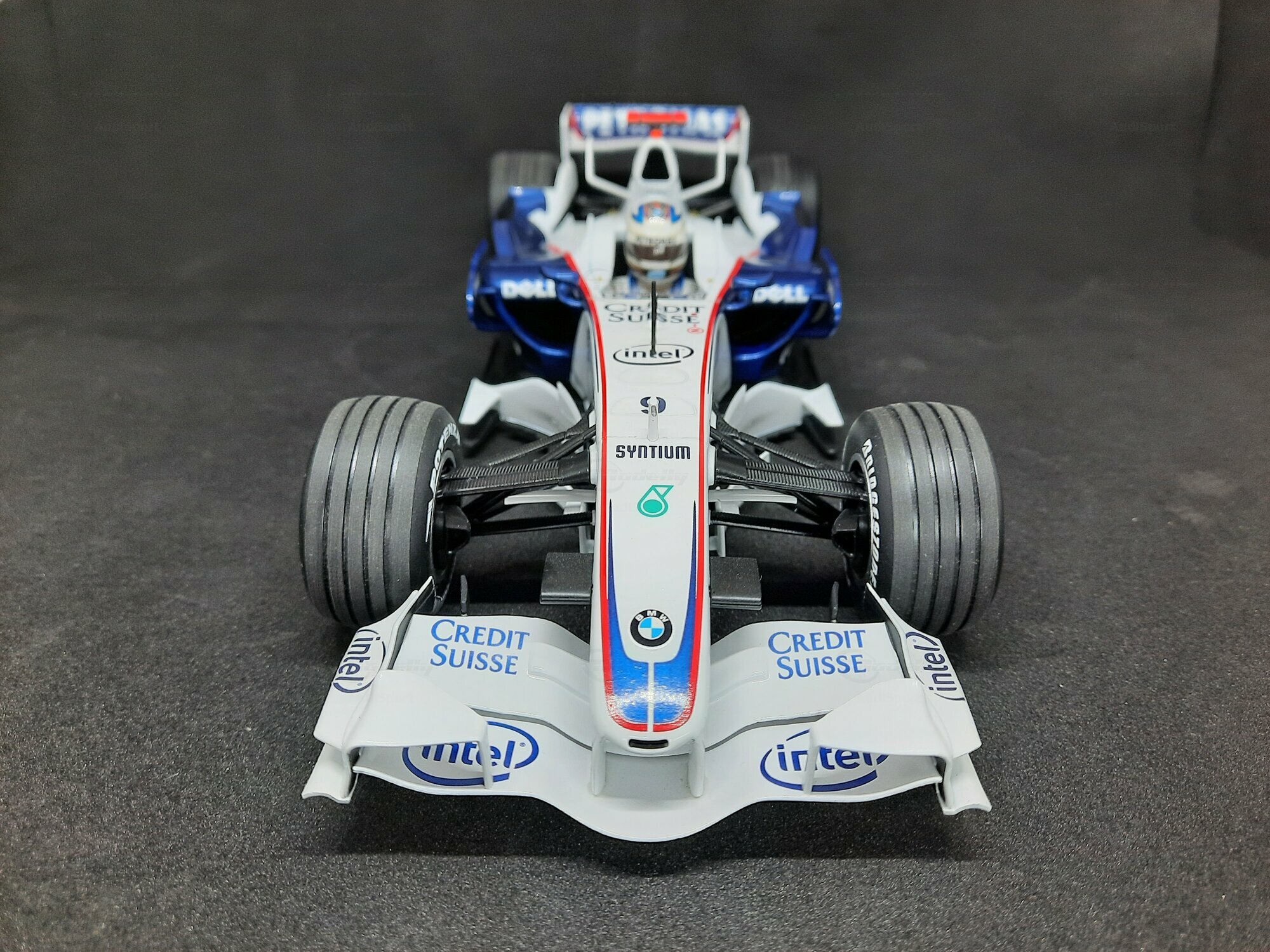 The 1/18 scale model of the BMW Sauber F1.07, manufactured by Minichamps, stands out for its meticulous attention to detail and precision. Made of resin, it showcases all the essential features of the original in impressive accuracy. The model in 1/18 scale, seen in the collection of Modelly member "AudiSport," bears the same sponsor logos as the actual vehicle, including the prominent brands of Petronas, Intel, and Credit Suisse. The color scheme combines white, dark blue, and red, giving the model a distinctive and authentic aesthetic. The Bridgestone tires are accurately represented, as well as the front, side, and rear spoilers meeting the aerodynamic demands of the real racing machine.