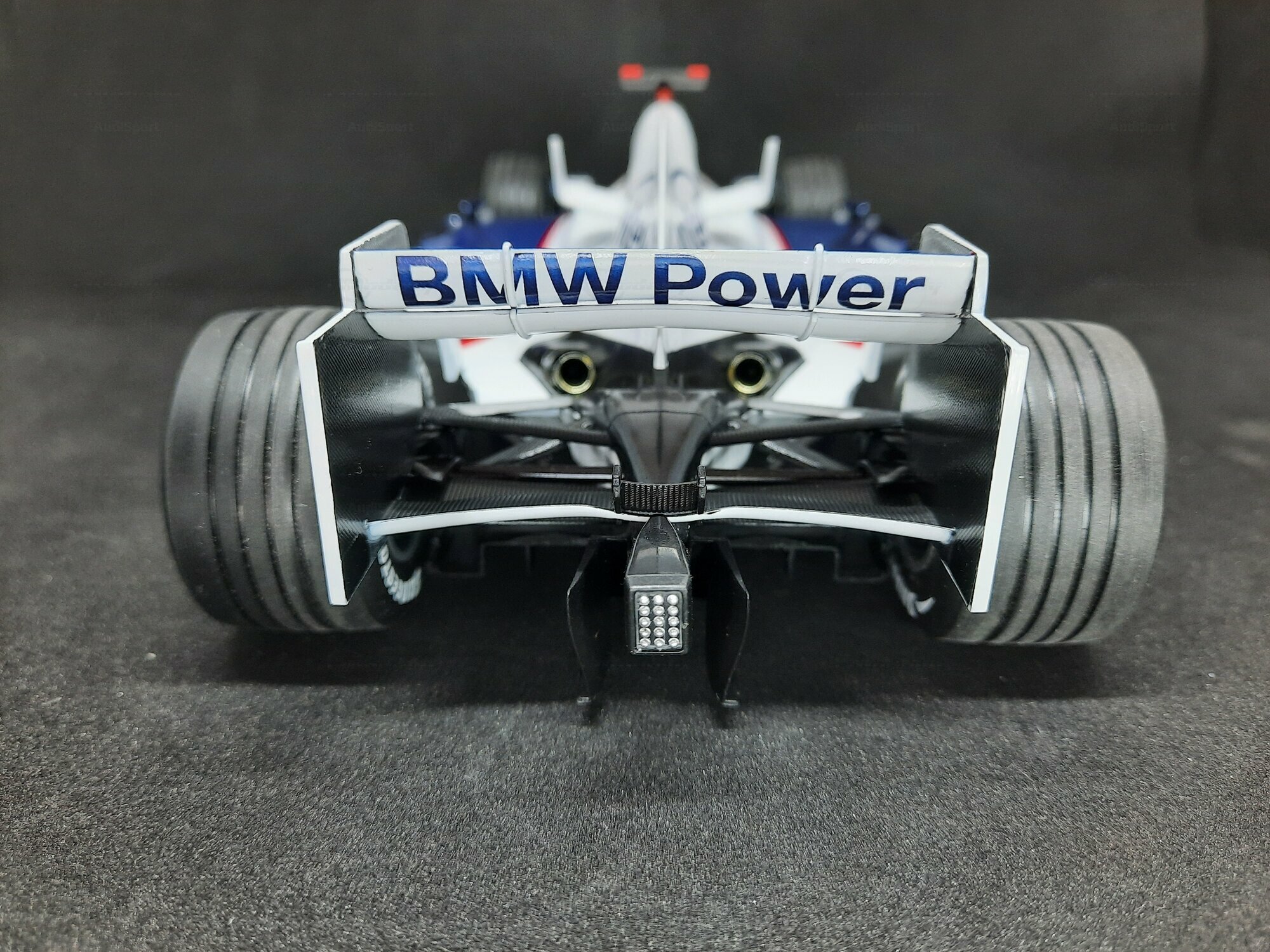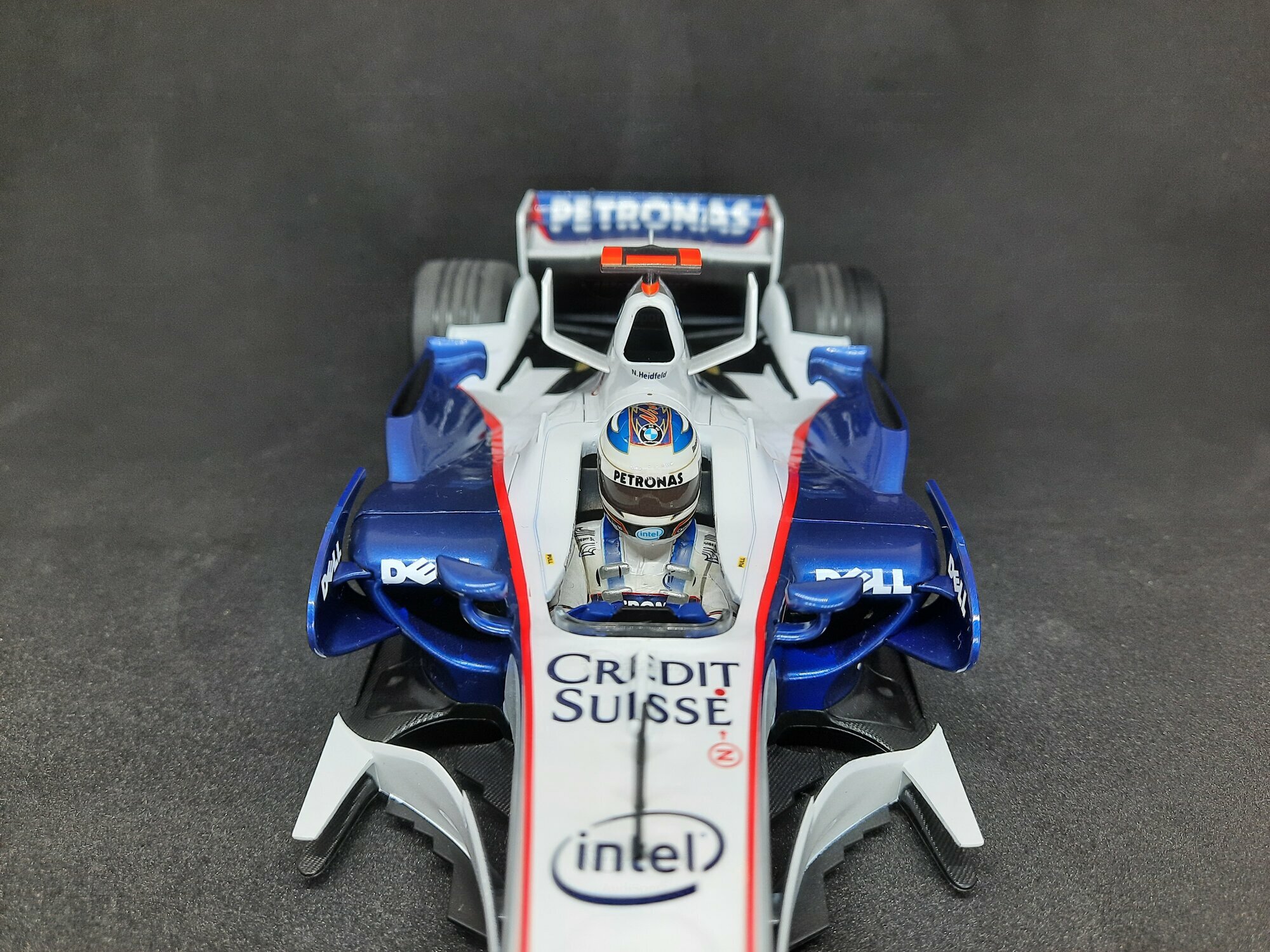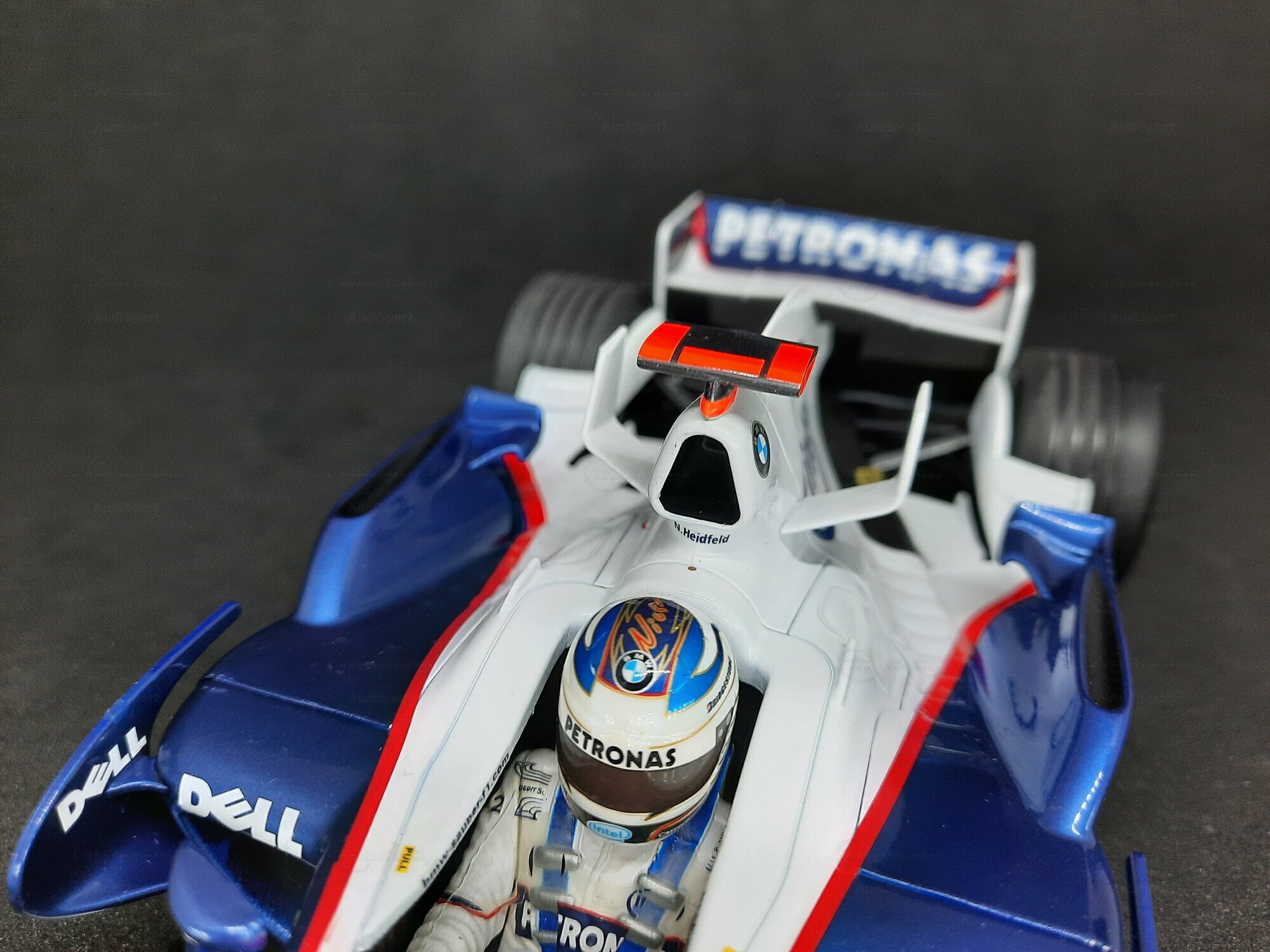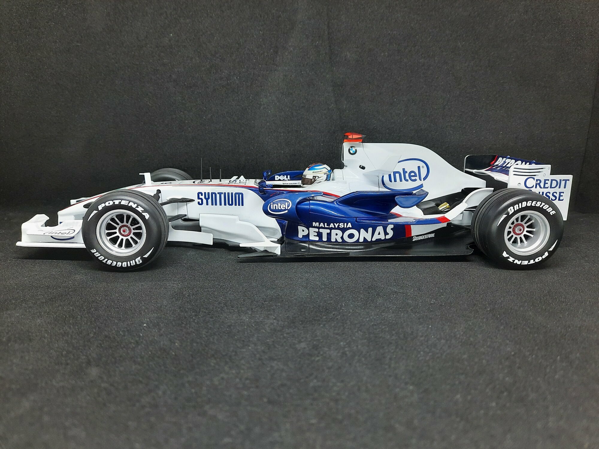 The 1/18 scale model of the BMW Sauber F1.07, manufactured by Minichamps, stands out for its meticulous attention to detail and precision. Made of resin, it showcases all the essential features of the original in impressive accuracy. The model in 1/18 scale, seen in the collection of Modelly member "AudiSport," bears the same sponsor logos as the actual vehicle, including the prominent brands of Petronas, Intel, and Credit Suisse. The color scheme combines white, dark blue, and red, giving the model a distinctive and authentic aesthetic. The Bridgestone tires are accurately represented, as well as the front, side, and rear spoilers meeting the aerodynamic demands of the real racing machine.
