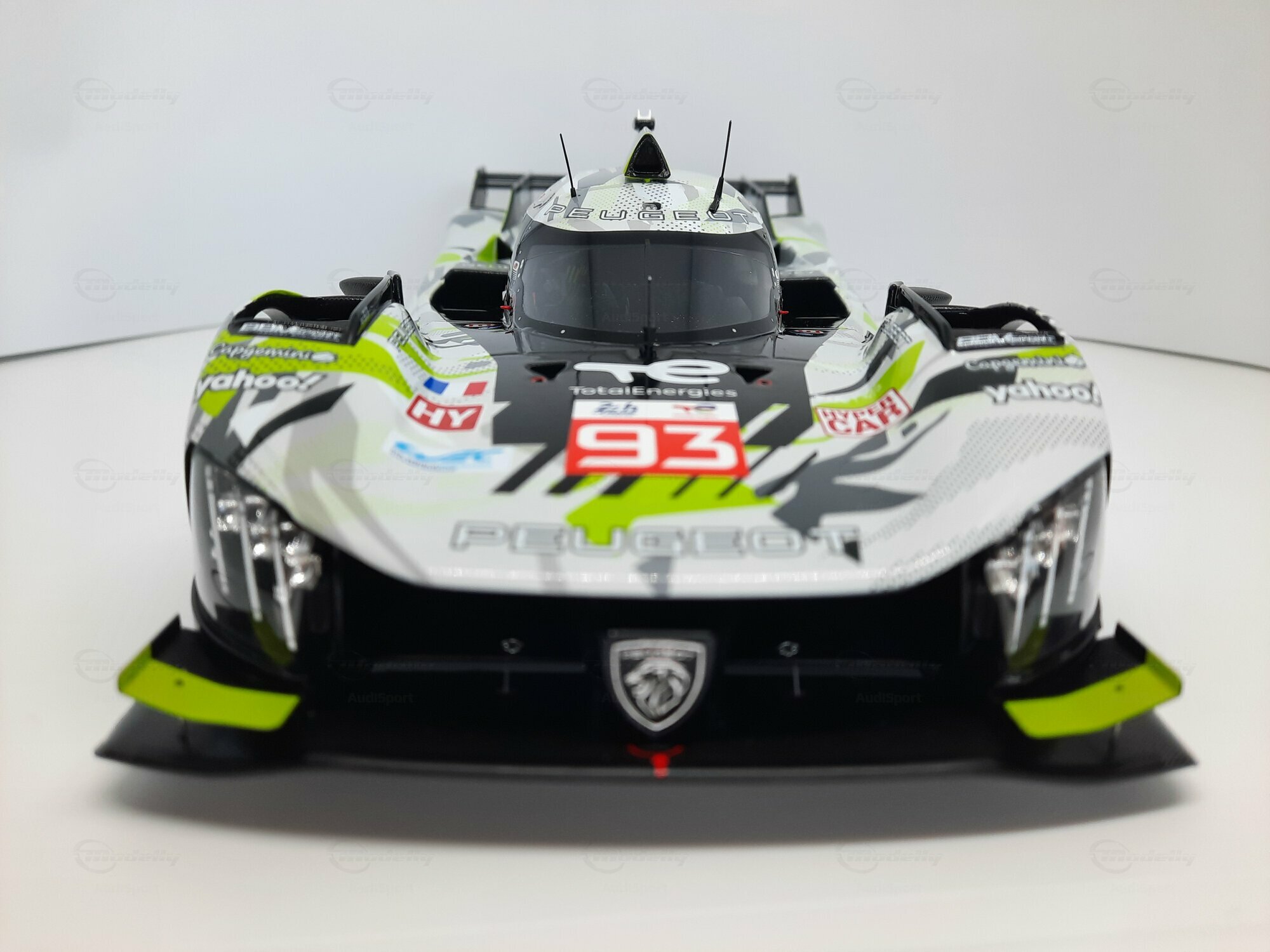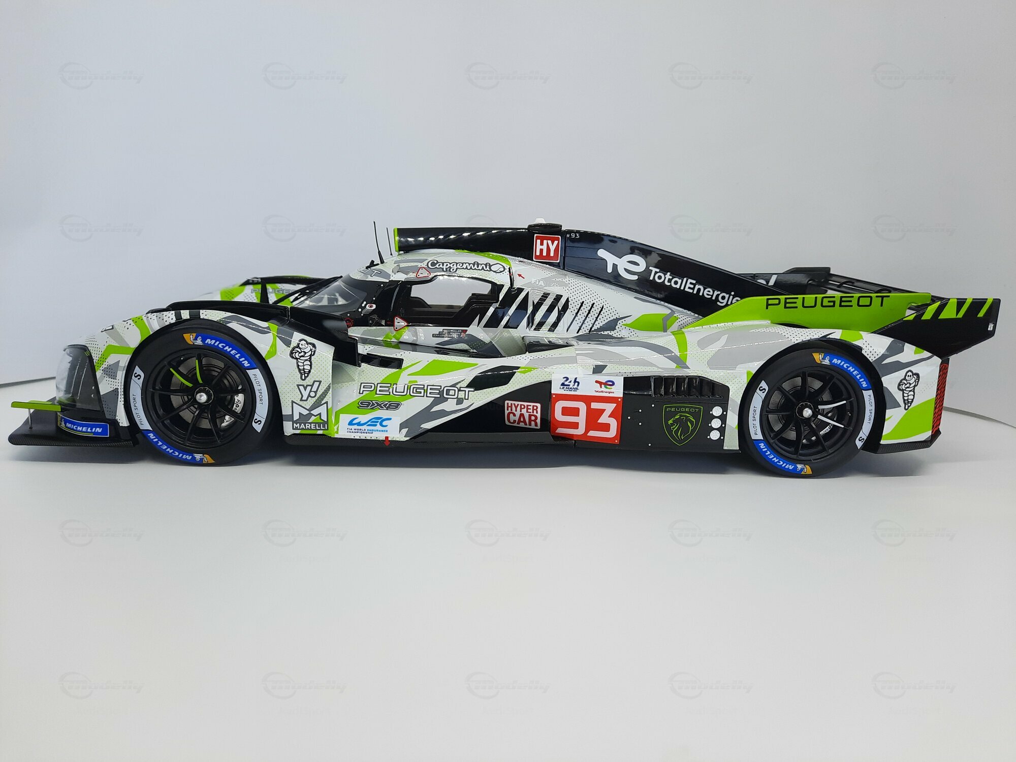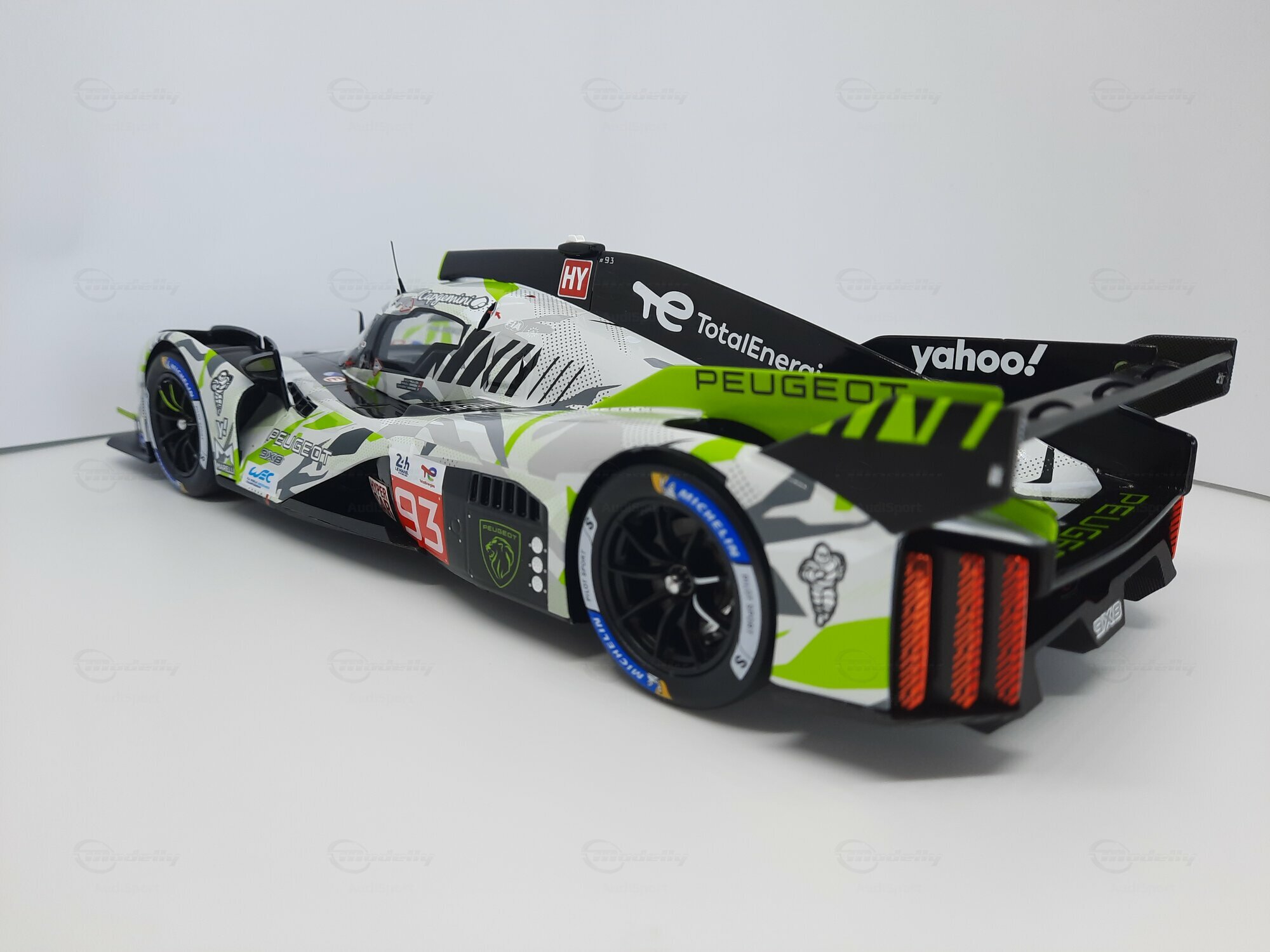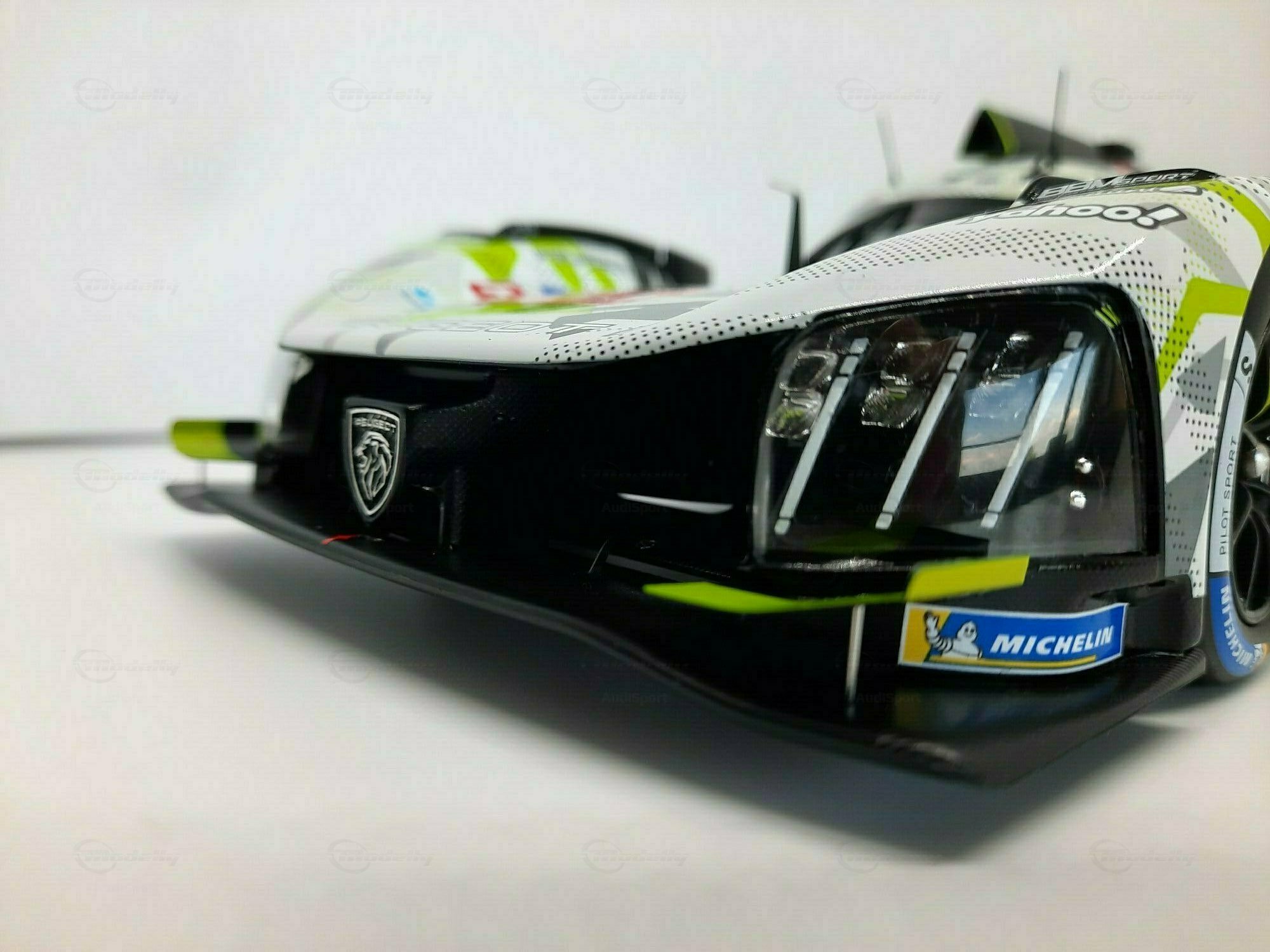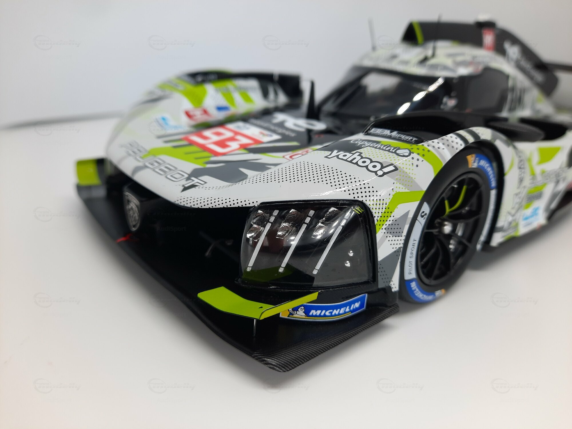 The model shown here is a 1/18 scale piece from SPARK and is part of the collection of the Modelly member “AudiSport”. The miniature recreates the Peugeot 9X8 very accurately: the front with its deep splitter, the angular light signature and the small aero fins are cleanly reproduced. The visible material mix — a combination of resin, plastic and finely applied photo‑etched parts — gives crisp edges, sharp air intakes and a realistic carbon weave on the lip and diffuser. The wheels match the real car with a central lock; the tyre shoulders show the blue Michelin markings and compound identification. The paint follows the known launch/WEC design: grey and white panels with dot‑fade patterns broken up by bright lime accents. Logos from Yahoo!, Capgemini, TotalEnergies and Marelli are clearly legible; the number 93 and the “Hypercar” graphics sit on the sidepod. Even the tiny antennas, roof air intake and side fin structure are well done. This 1/18 model from SPARK captures the character of the Peugeot 9X8 and — thanks to SPARK’s usual material mix — is sturdy enough for a display case while detailed enough for close‑ups.