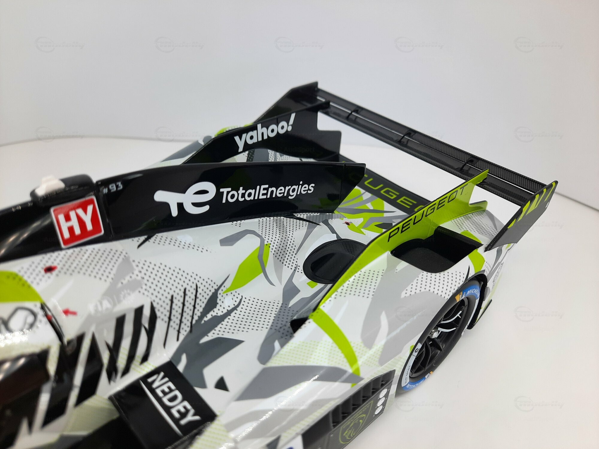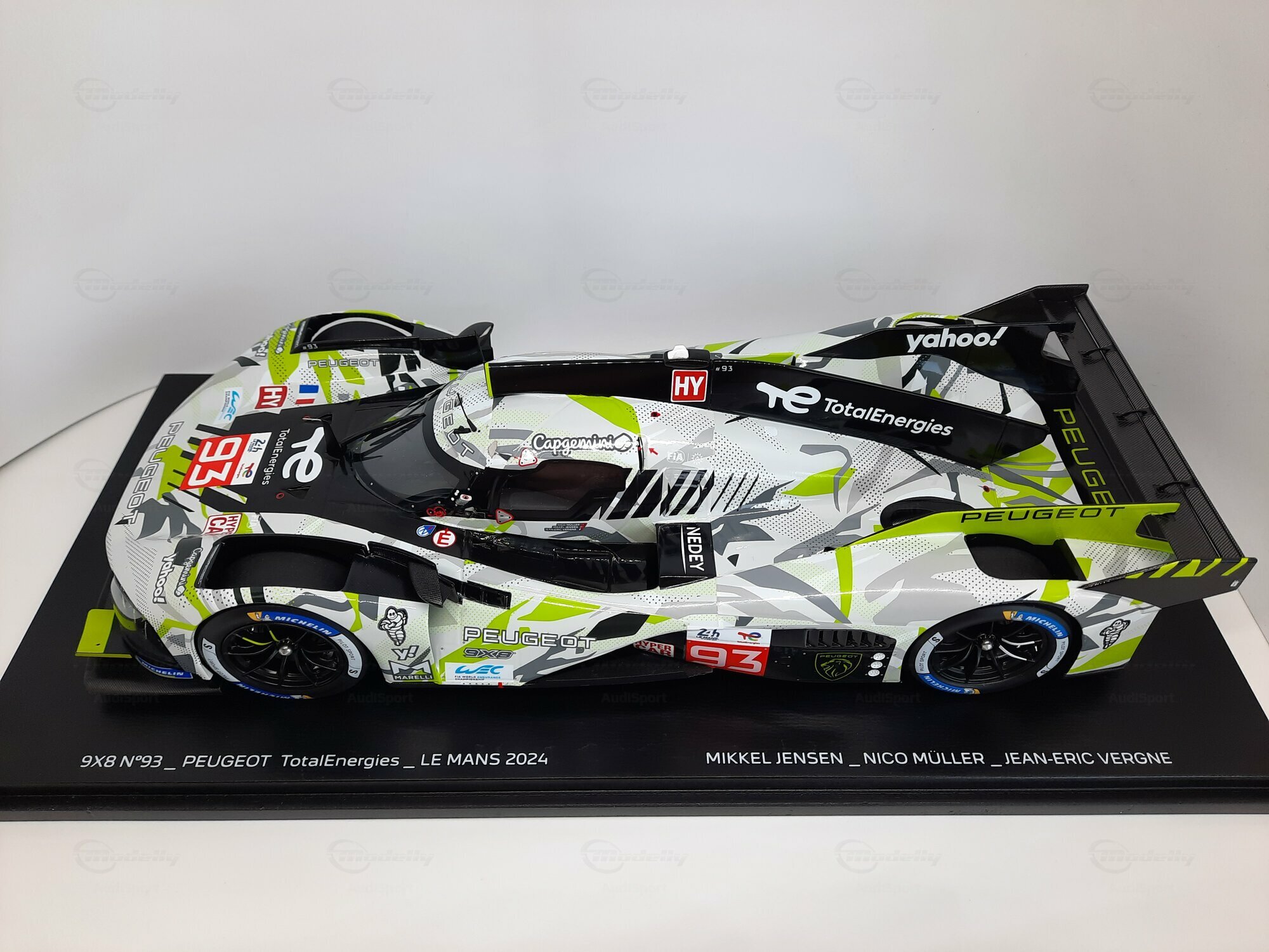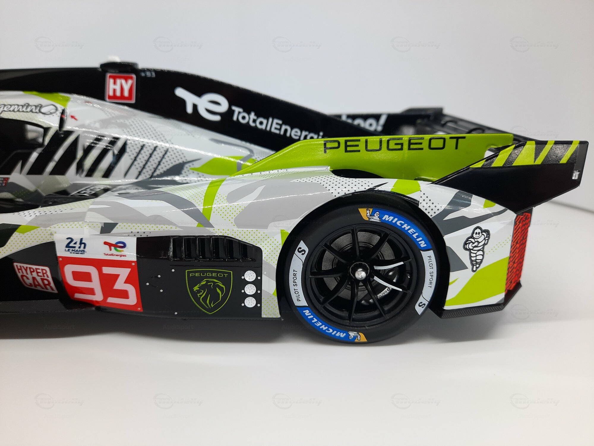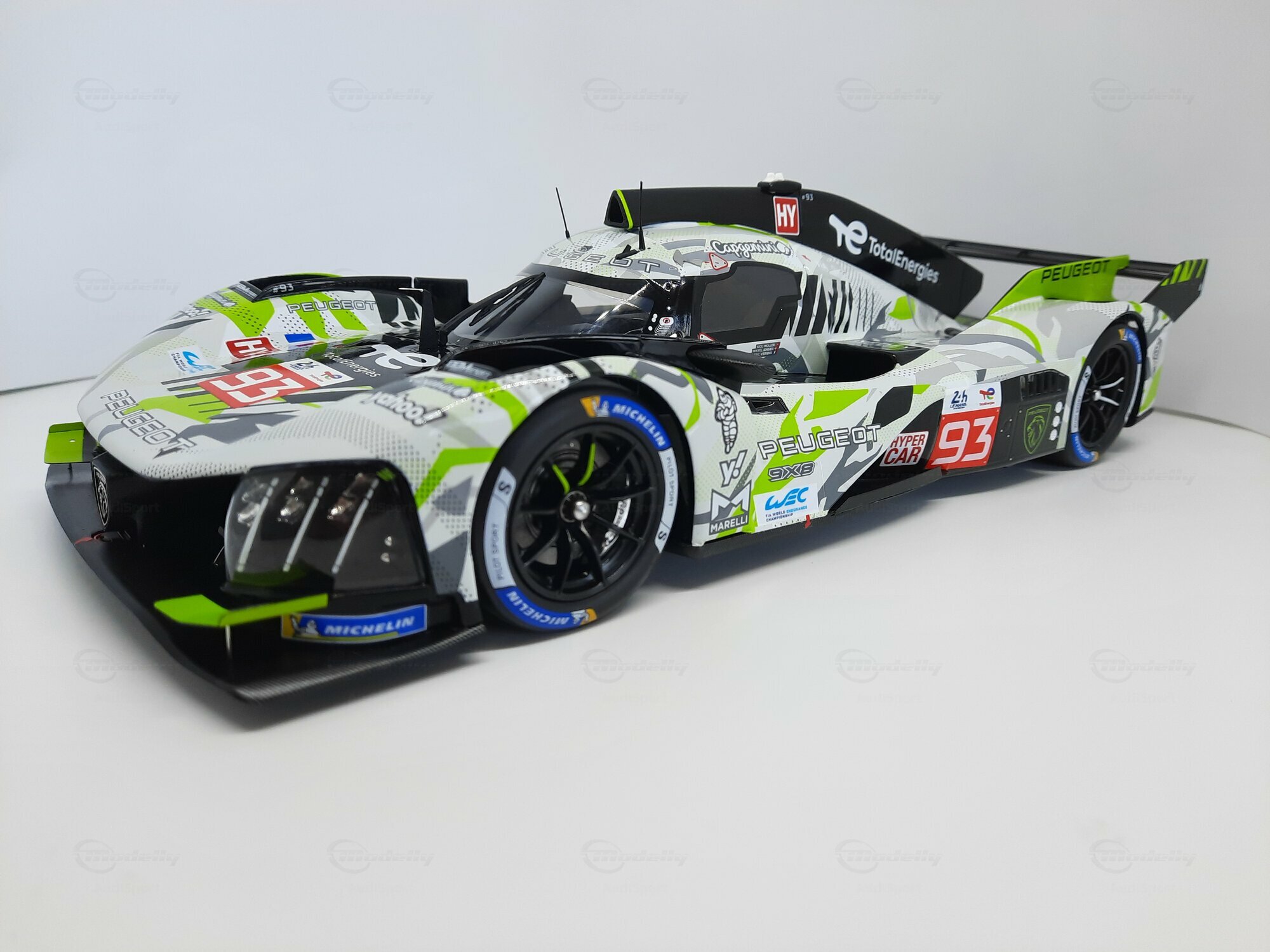 The model shown here is a 1/18 scale piece from SPARK and is part of the collection of the Modelly member “AudiSport”. The miniature recreates the Peugeot 9X8 very accurately: the front with its deep splitter, the angular light signature and the small aero fins are cleanly reproduced. The visible material mix — a combination of resin, plastic and finely applied photo‑etched parts — gives crisp edges, sharp air intakes and a realistic carbon weave on the lip and diffuser. The wheels match the real car with a central lock; the tyre shoulders show the blue Michelin markings and compound identification. The paint follows the known launch/WEC design: grey and white panels with dot‑fade patterns broken up by bright lime accents. Logos from Yahoo!, Capgemini, TotalEnergies and Marelli are clearly legible; the number 93 and the “Hypercar” graphics sit on the sidepod. Even the tiny antennas, roof air intake and side fin structure are well done. This 1/18 model from SPARK captures the character of the Peugeot 9X8 and — thanks to SPARK’s usual material mix — is sturdy enough for a display case while detailed enough for close‑ups.