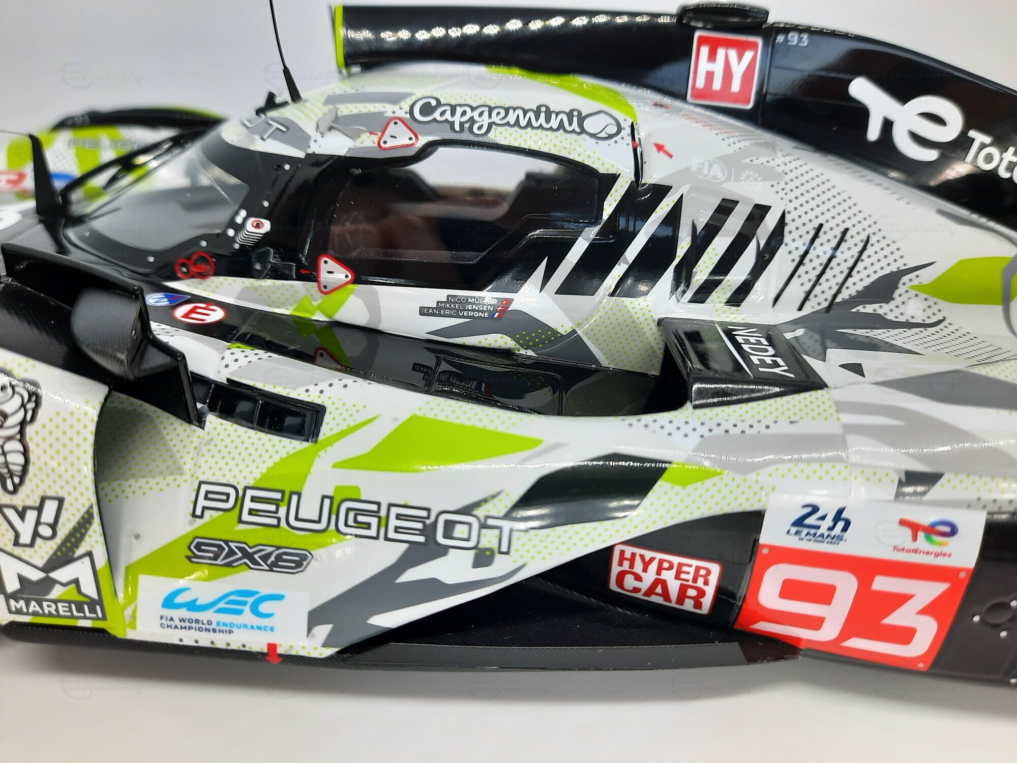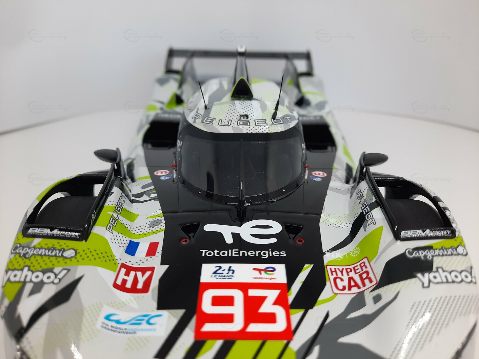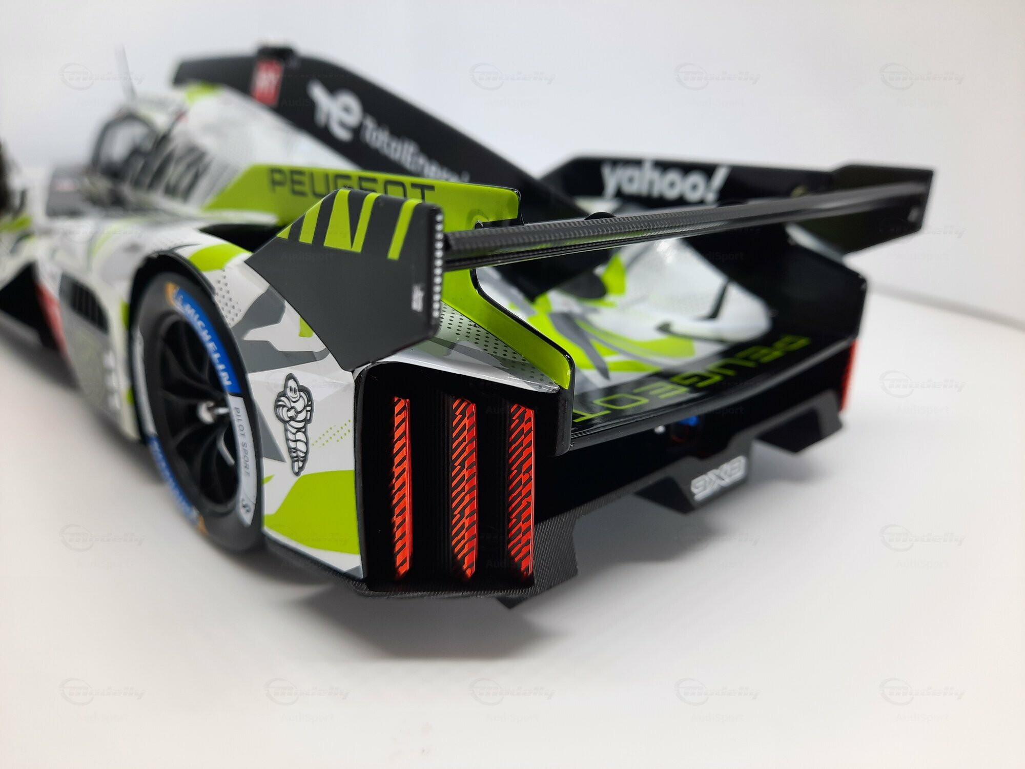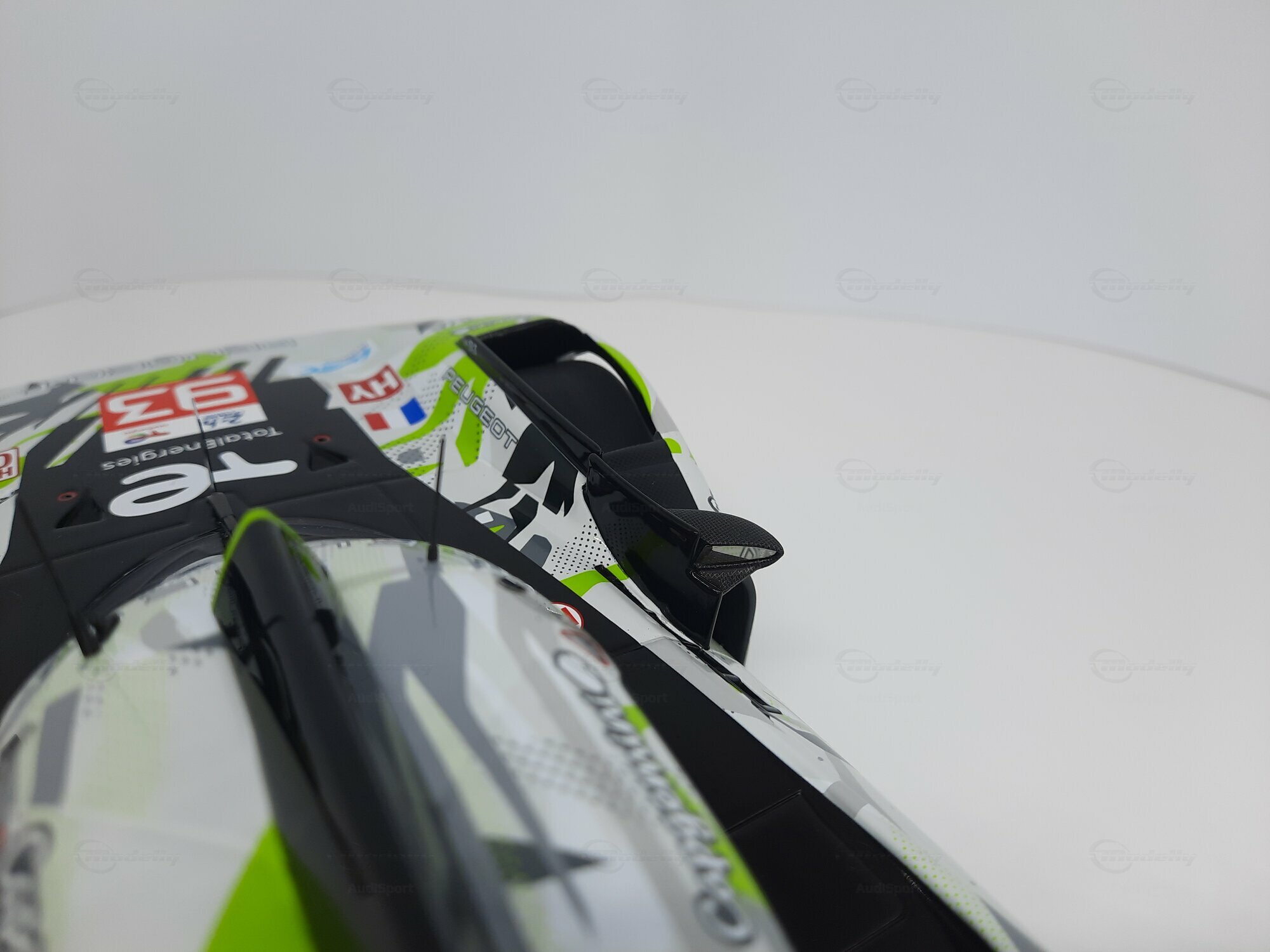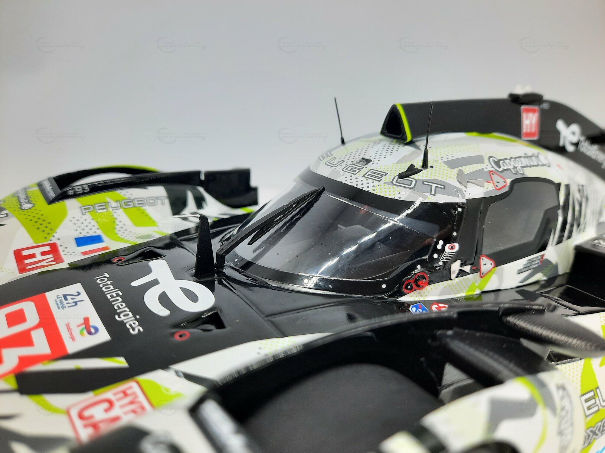 The model shown here is a 1/18 scale piece from SPARK and is part of the collection of the Modelly member “AudiSport”. The miniature recreates the Peugeot 9X8 very accurately: the front with its deep splitter, the angular light signature and the small aero fins are cleanly reproduced. The visible material mix — a combination of resin, plastic and finely applied photo‑etched parts — gives crisp edges, sharp air intakes and a realistic carbon weave on the lip and diffuser. The wheels match the real car with a central lock; the tyre shoulders show the blue Michelin markings and compound identification. The paint follows the known launch/WEC design: grey and white panels with dot‑fade patterns broken up by bright lime accents. Logos from Yahoo!, Capgemini, TotalEnergies and Marelli are clearly legible; the number 93 and the “Hypercar” graphics sit on the sidepod. Even the tiny antennas, roof air intake and side fin structure are well done. This 1/18 model from SPARK captures the character of the Peugeot 9X8 and — thanks to SPARK’s usual material mix — is sturdy enough for a display case while detailed enough for close‑ups.