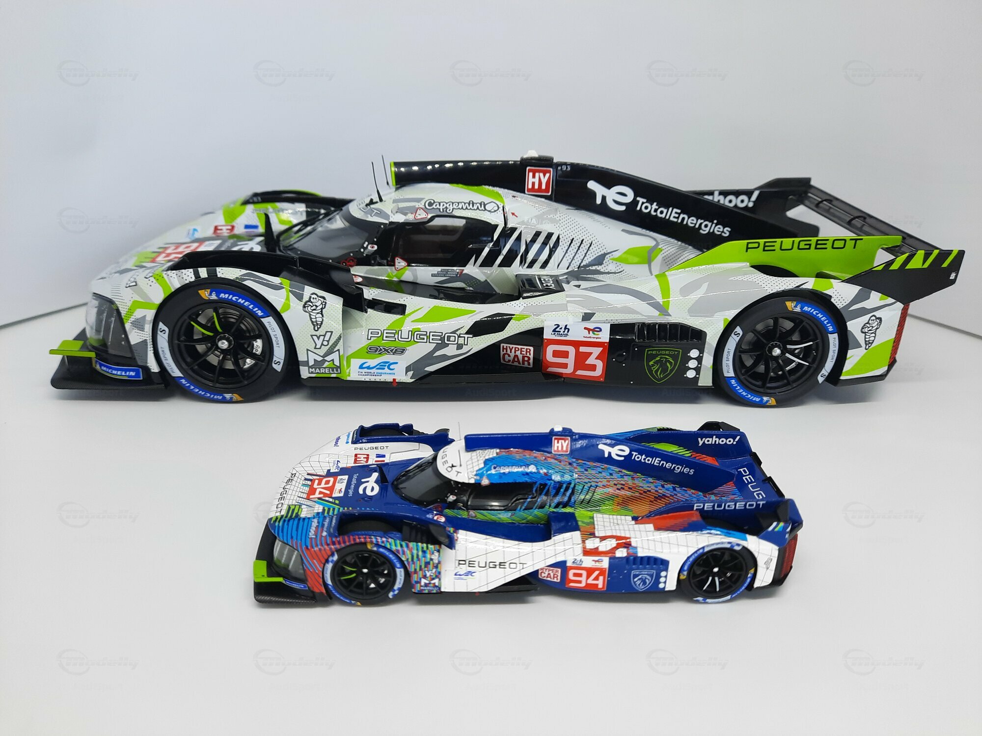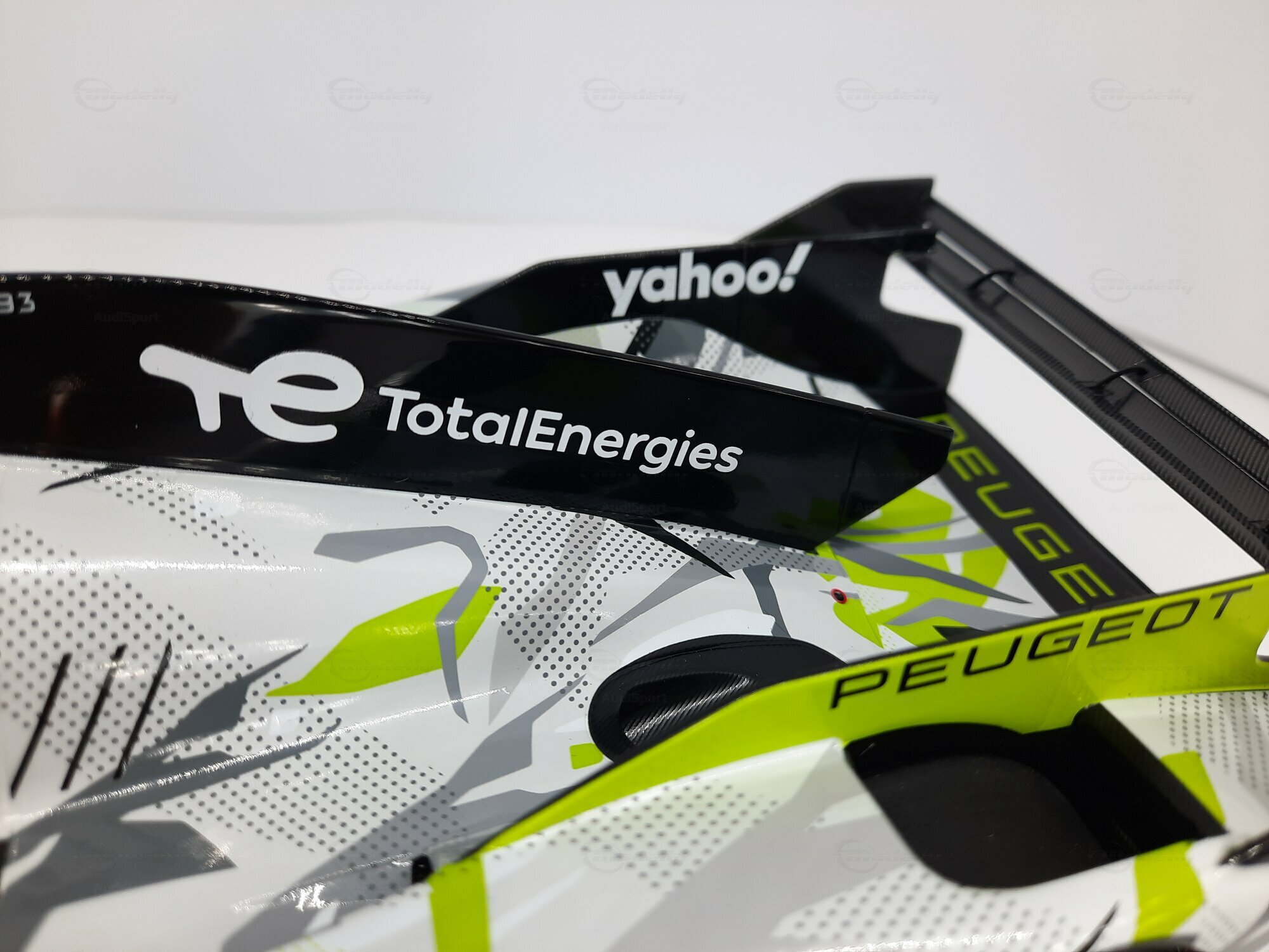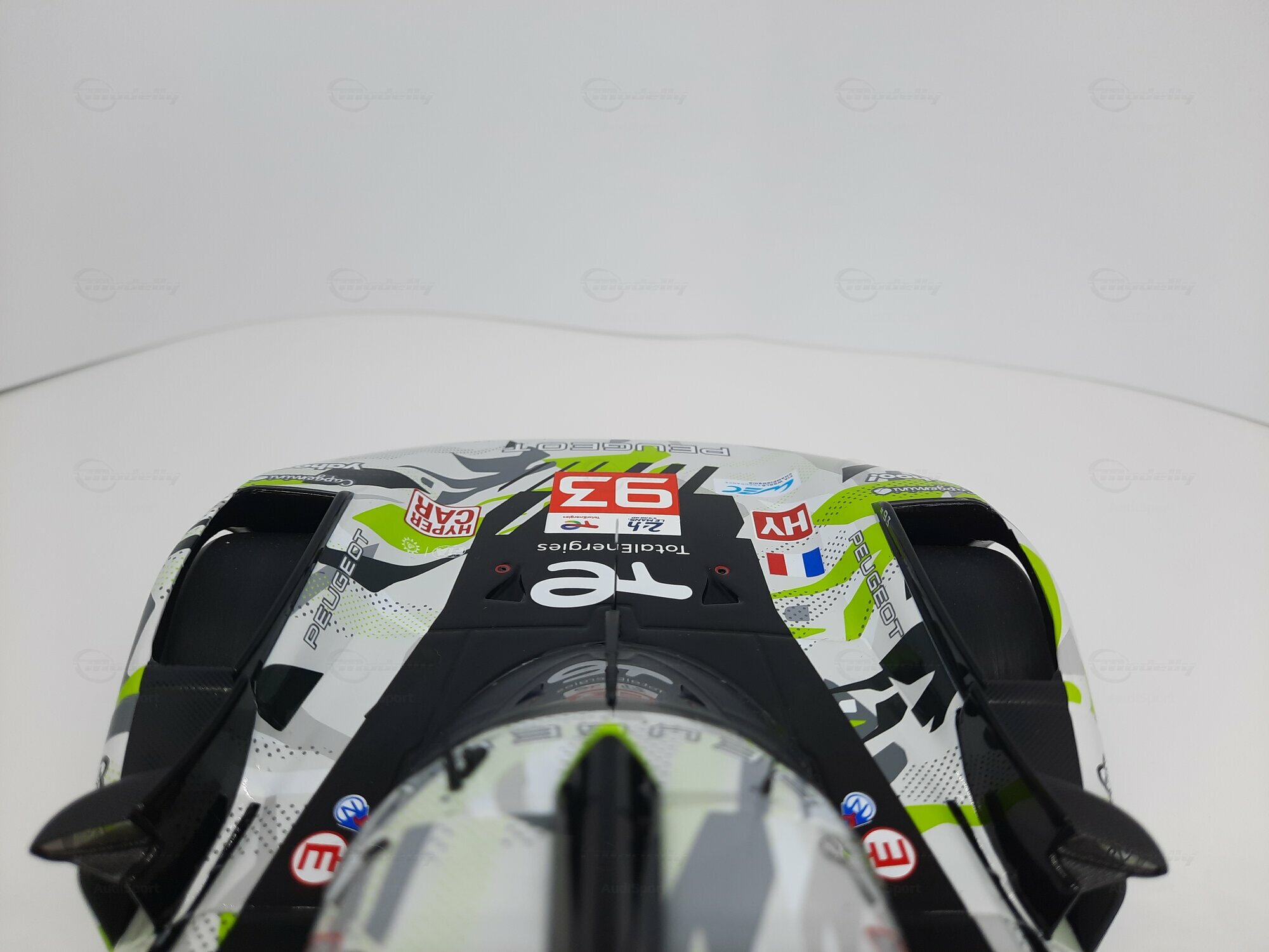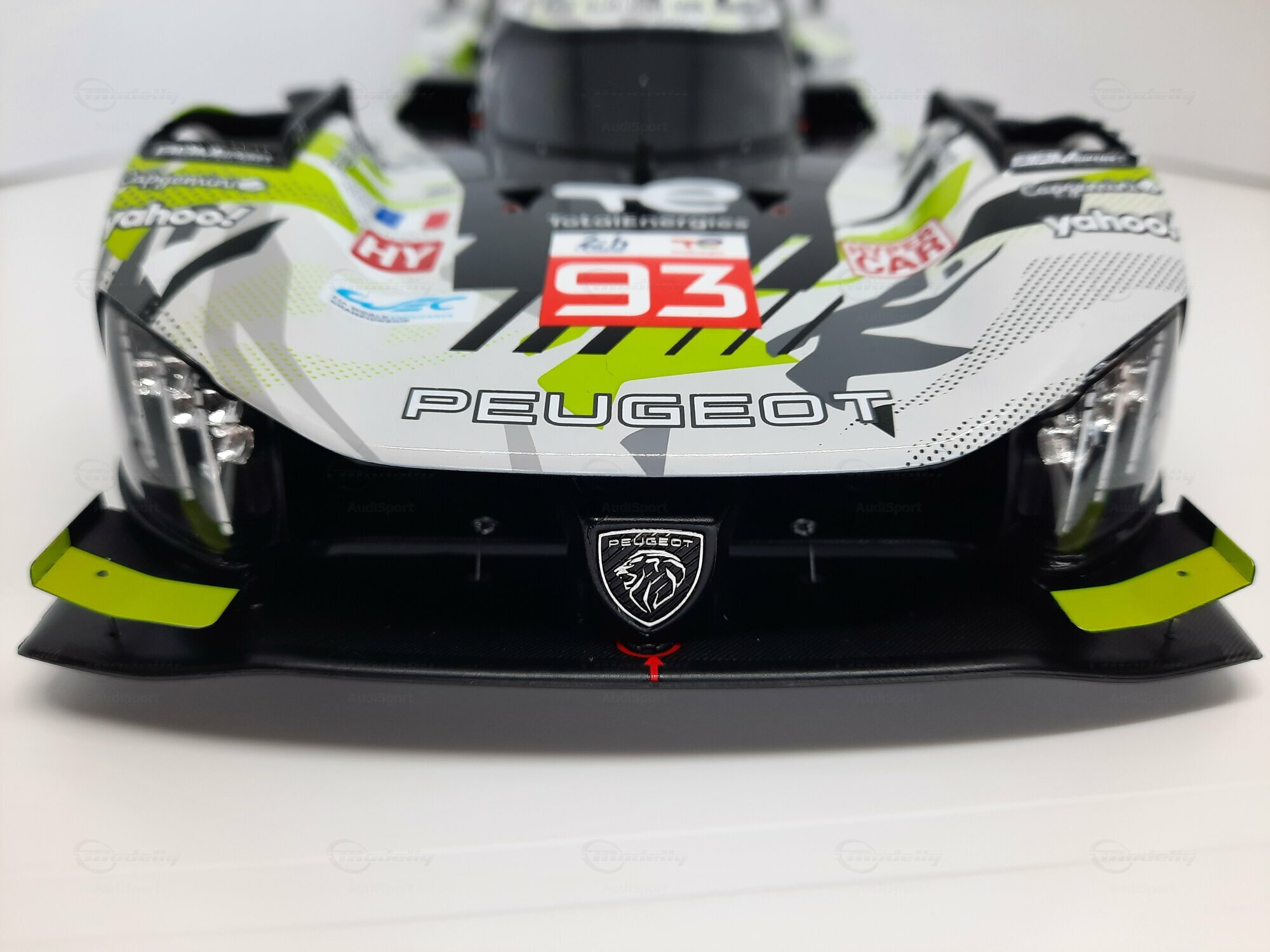 The model shown here is a 1/18 scale piece from SPARK and is part of the collection of the Modelly member “AudiSport”. The miniature recreates the Peugeot 9X8 very accurately: the front with its deep splitter, the angular light signature and the small aero fins are cleanly reproduced. The visible material mix — a combination of resin, plastic and finely applied photo‑etched parts — gives crisp edges, sharp air intakes and a realistic carbon weave on the lip and diffuser. The wheels match the real car with a central lock; the tyre shoulders show the blue Michelin markings and compound identification. The paint follows the known launch/WEC design: grey and white panels with dot‑fade patterns broken up by bright lime accents. Logos from Yahoo!, Capgemini, TotalEnergies and Marelli are clearly legible; the number 93 and the “Hypercar” graphics sit on the sidepod. Even the tiny antennas, roof air intake and side fin structure are well done. This 1/18 model from SPARK captures the character of the Peugeot 9X8 and — thanks to SPARK’s usual material mix — is sturdy enough for a display case while detailed enough for close‑ups.