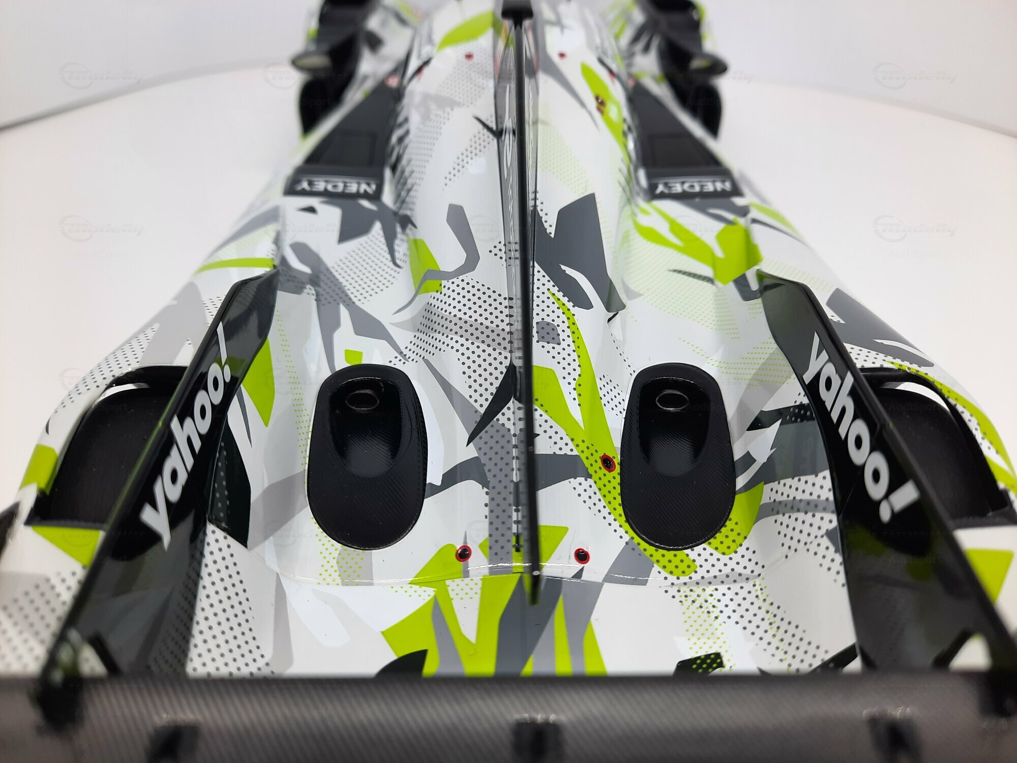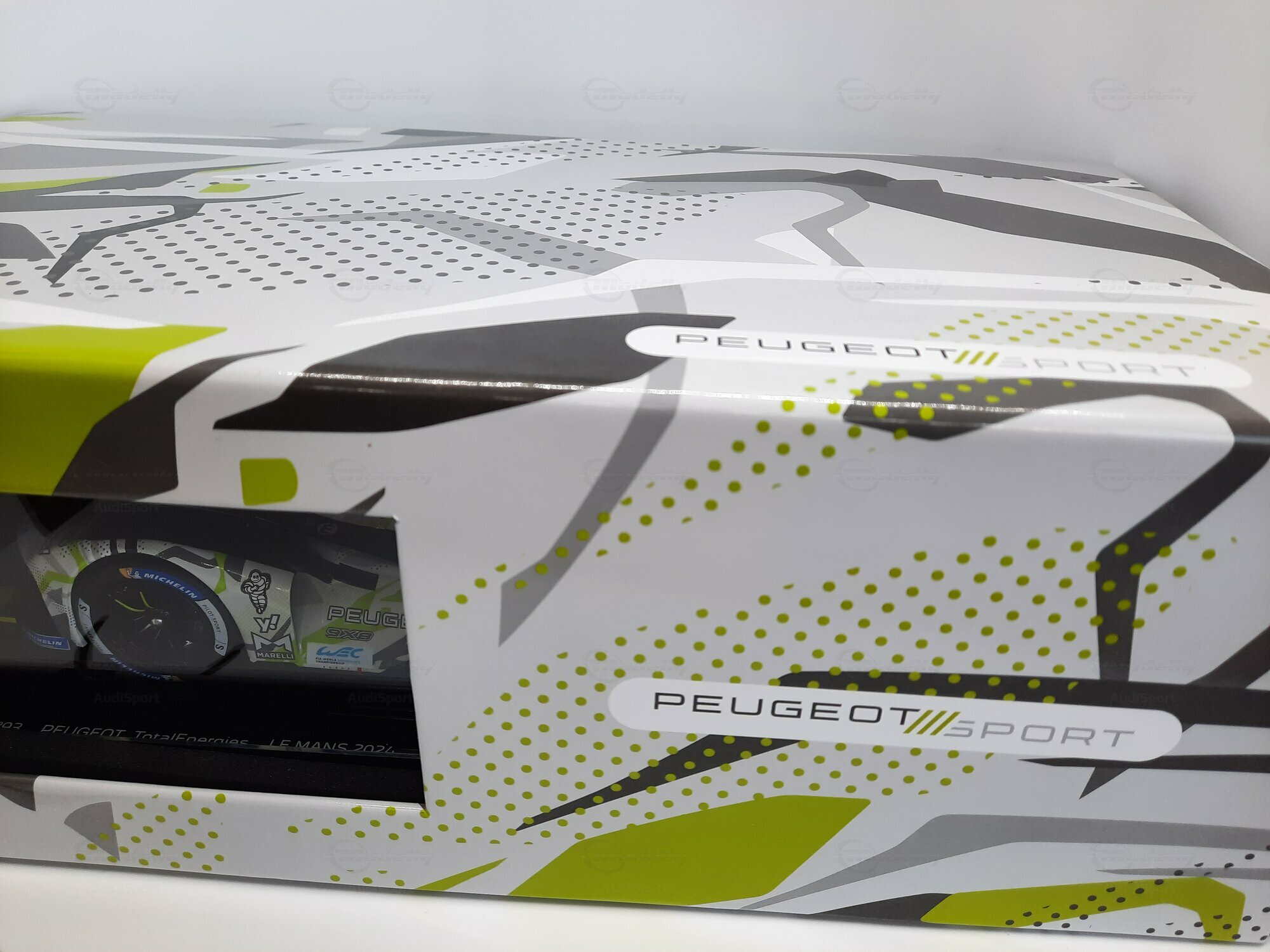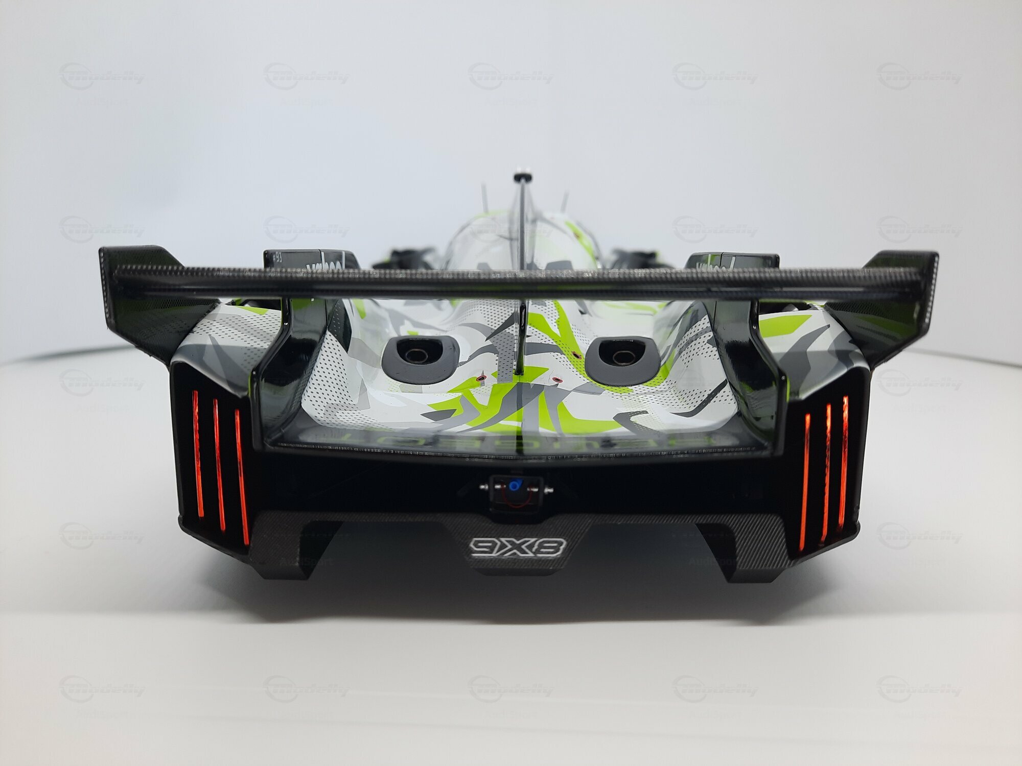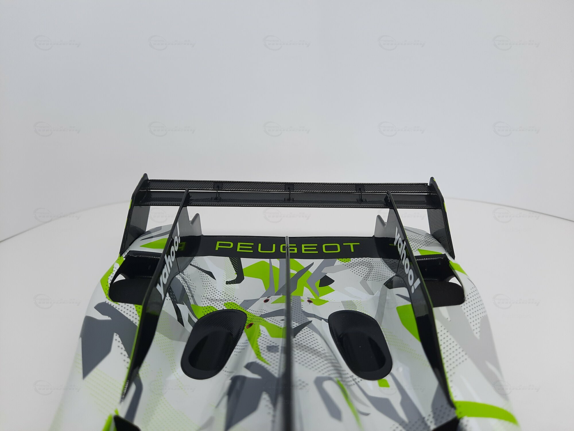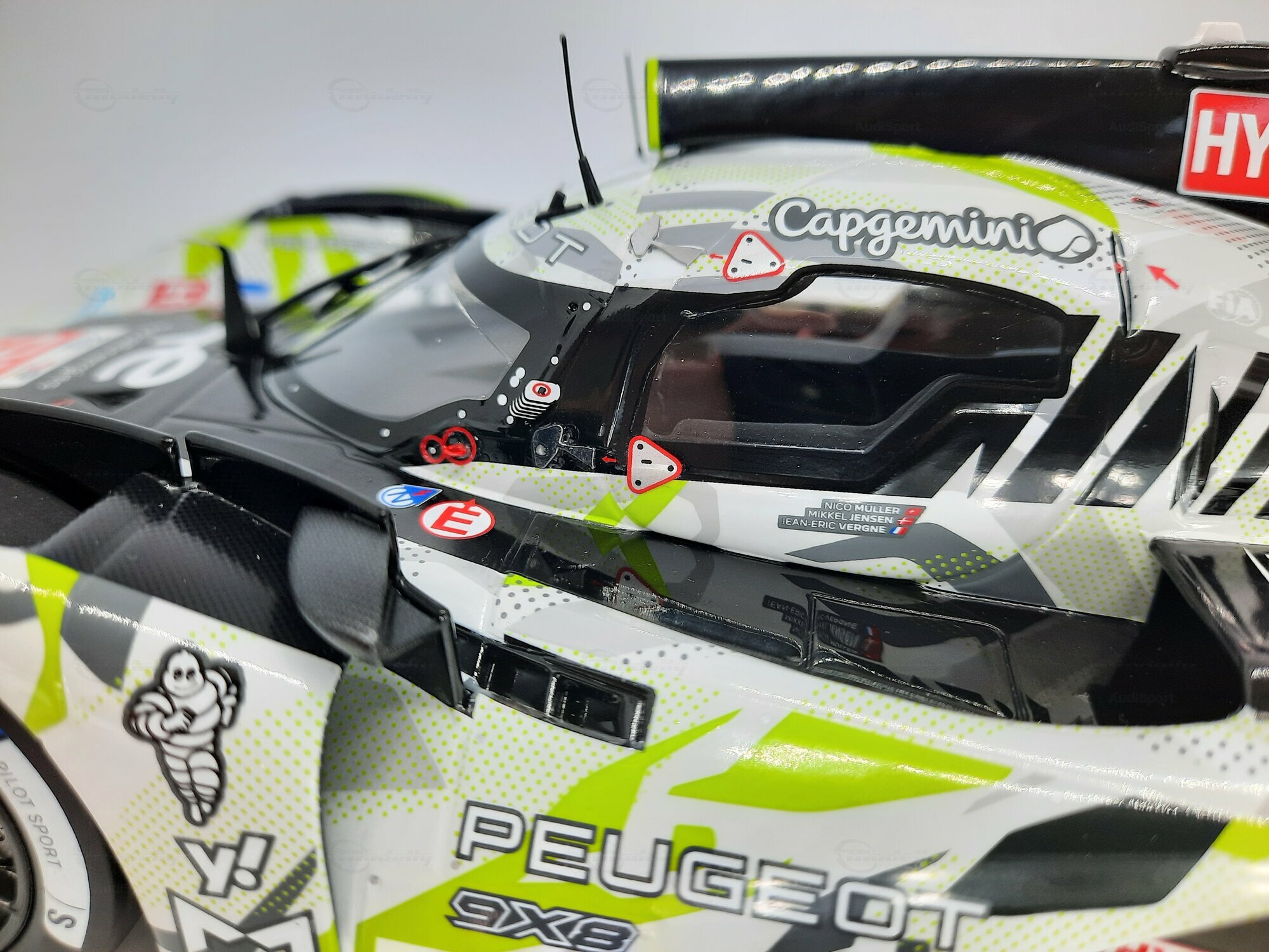 The model shown here is a 1/18 scale piece from SPARK and is part of the collection of the Modelly member “AudiSport”. The miniature recreates the Peugeot 9X8 very accurately: the front with its deep splitter, the angular light signature and the small aero fins are cleanly reproduced. The visible material mix — a combination of resin, plastic and finely applied photo‑etched parts — gives crisp edges, sharp air intakes and a realistic carbon weave on the lip and diffuser. The wheels match the real car with a central lock; the tyre shoulders show the blue Michelin markings and compound identification. The paint follows the known launch/WEC design: grey and white panels with dot‑fade patterns broken up by bright lime accents. Logos from Yahoo!, Capgemini, TotalEnergies and Marelli are clearly legible; the number 93 and the “Hypercar” graphics sit on the sidepod. Even the tiny antennas, roof air intake and side fin structure are well done. This 1/18 model from SPARK captures the character of the Peugeot 9X8 and — thanks to SPARK’s usual material mix — is sturdy enough for a display case while detailed enough for close‑ups.