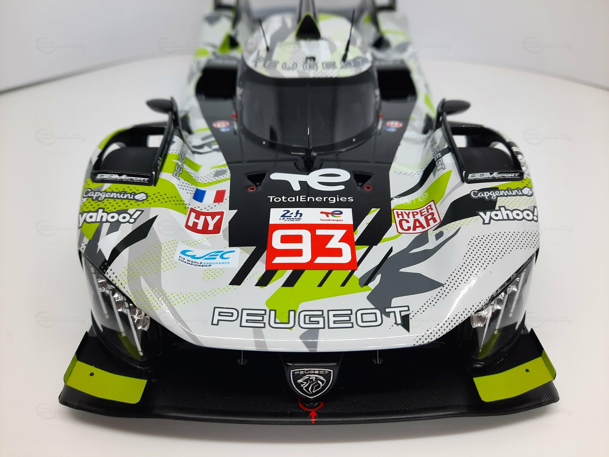 Peugeot Sport runs the Peugeot 9X8 with two entries across the full WEC season. The cars are part of a factory program that taps into development centers in Satory and Montigny‑le‑Bretonneux. The team structure mixes series engineering staff with racing specialists; there’s a strong focus on software and energy recovery. Prominent brands on the livery include Michelin as tyre partner, Yahoo! on the front fenders, Capgemini on the bonnet and Marelli on the sidepods; the energy partnership with TotalEnergies influences the systems engineering. The photos of the model clearly show the WEC and “HY” hybrid class markings. Those graphics, together with race number 93 and the “Hypercar” designation, identify the car as an LMH entry. The Peugeot 9X8 was consciously developed as a technology carrier to test aero and energy management in a regulated environment and to transfer learnings to future production projects.