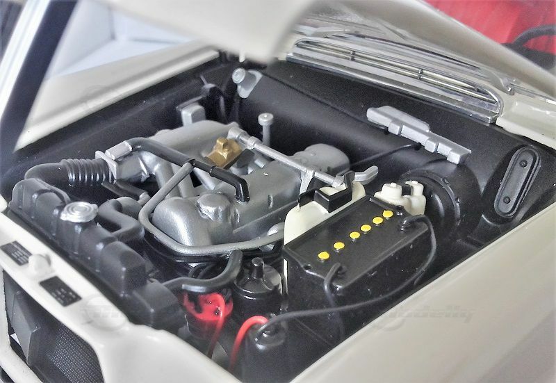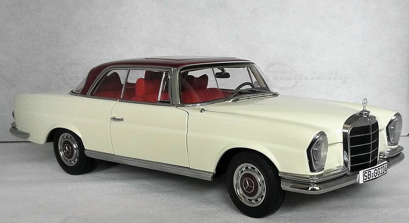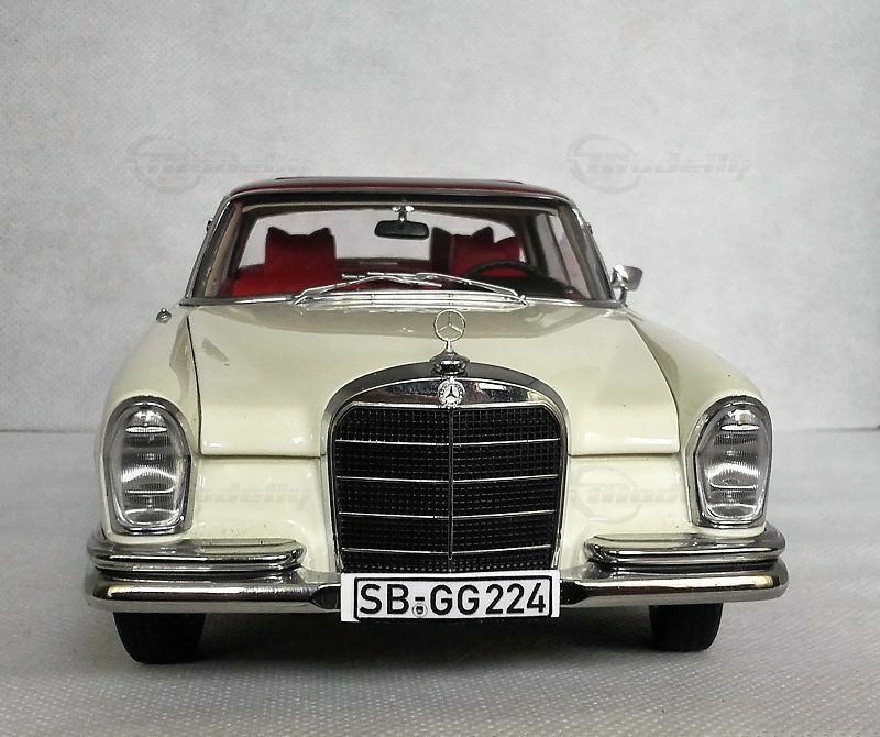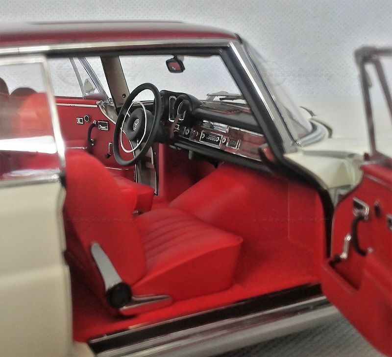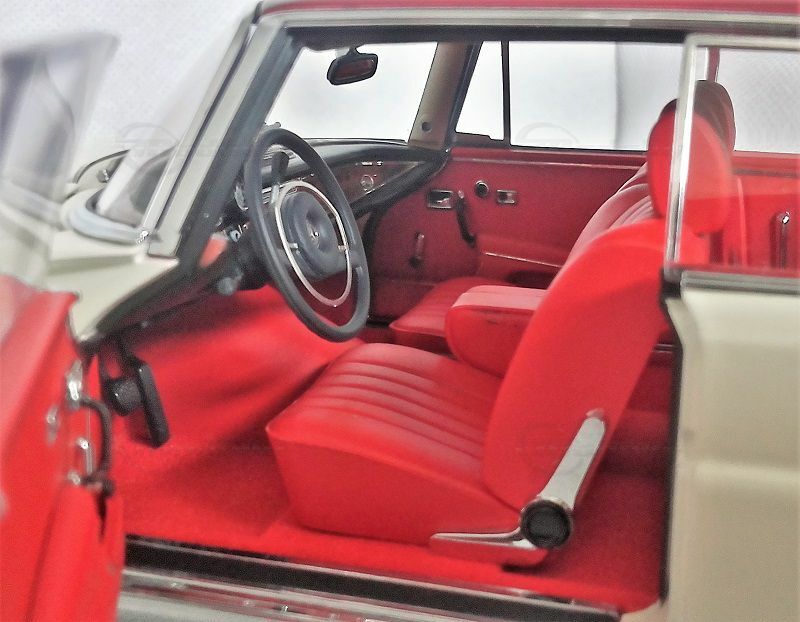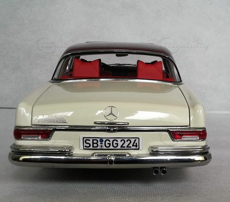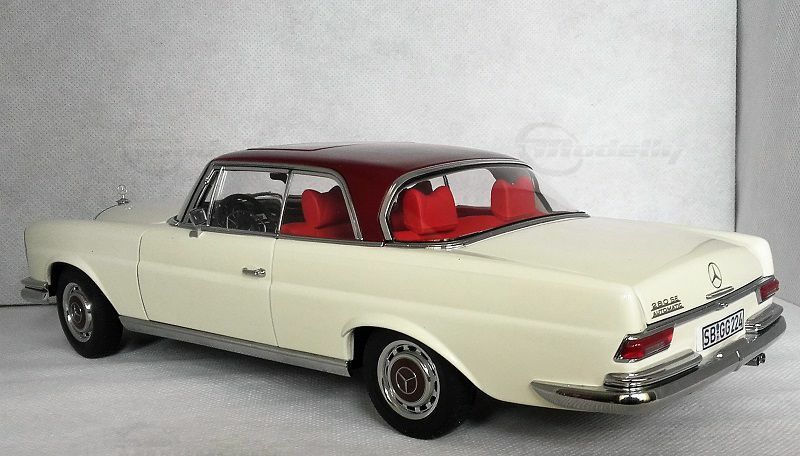 The model car in 1/18 scale of the Mercedes-Benz 280 SE (W 111) Coupé shown here is a special collector's item from AUTOart. It was crafted from die-cast material, contributing to the model's durability and accuracy. The photos clearly depict the modified elements of this model, which do not adhere to AUTOart's original production standards. Variations in the paint job and interior furnishings are noticeable. This particular specimen was custom modified, standing out from the standard models. The owner, known in the model car community as "BenzW110," has given the model a two-tone cream and wine red paint finish. The bright red interior complements the elegant color scheme and represents a bold interpretation of the original. This model is evidence of collectors' passion and dedication to adding a personal touch to their models.
