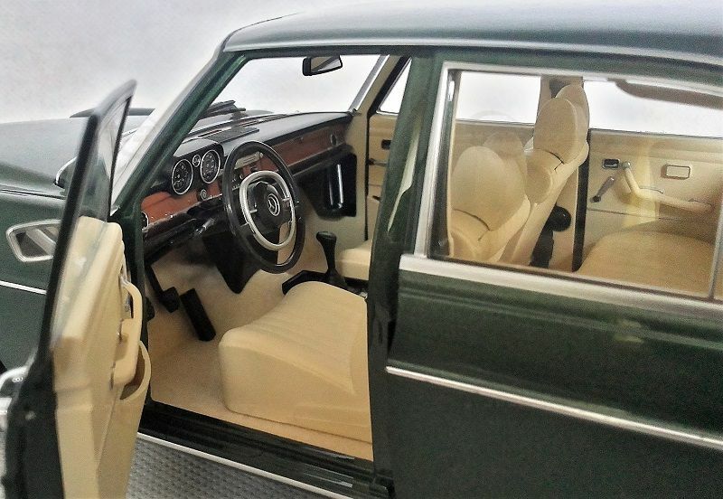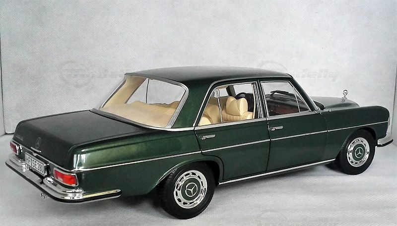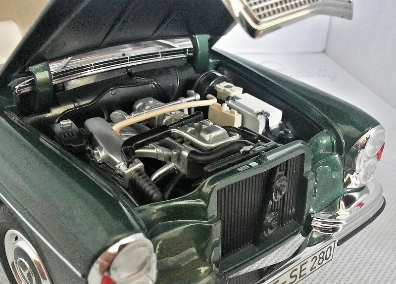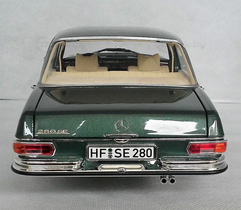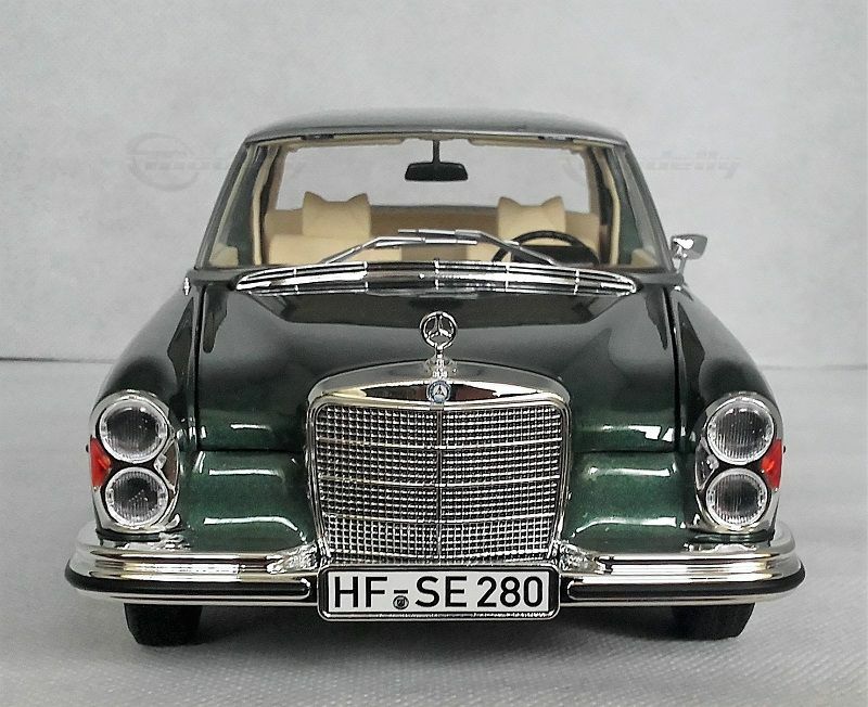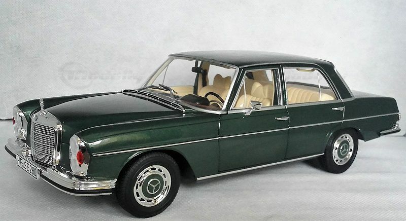 The model shown here is a 1/18 scale model car produced by Norev. It is made of high-quality die-cast material and exhibits a high level of detail accuracy to the original vehicle. This miniature model belongs to the collection of Modelly member "BenzW110" and impressively represents the elegance and timeless design of the Mercedes-Benz 280 SE. The replica showcases an authentic deep green color with a beige interior, capturing the luxurious charm of the original. The intricate chrome details and precise wheel and radiator emblem further enhance the model's attention to detail.