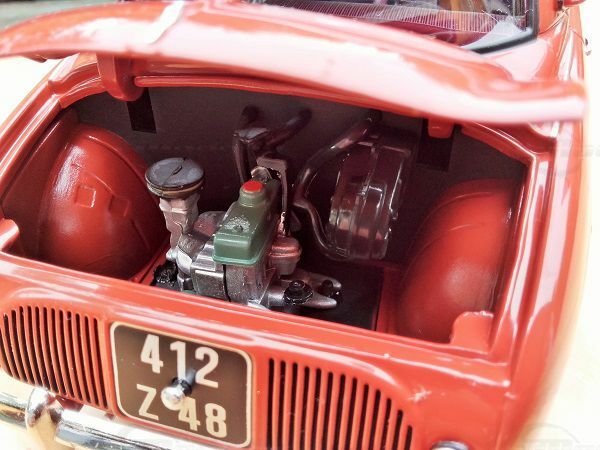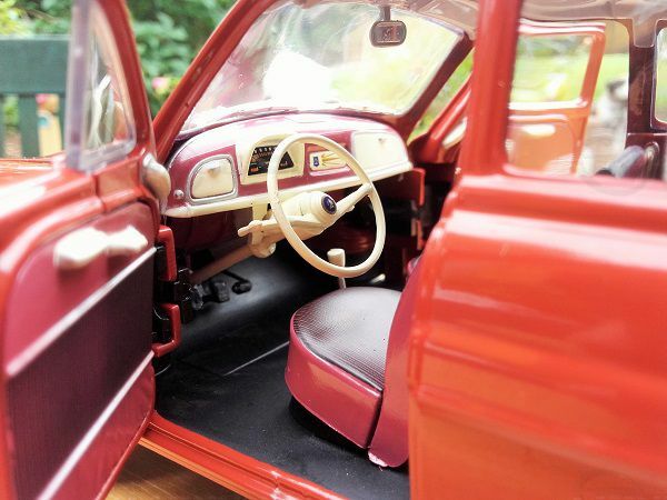 Norev's 1/18 scale model stands out for its meticulous attention to detail. The iconic round headlights and distinctive grille are accurately replicated. The model showcases the typical red paintwork popular in the 50s. In addition to the correct proportions, the delicate chrome bumpers and faithfully reproduced wheels with white-wall tires catch the eye. The license plates are also detailed, bearing the inscription "412 Z 48," emphasizing the vehicle's regional character.