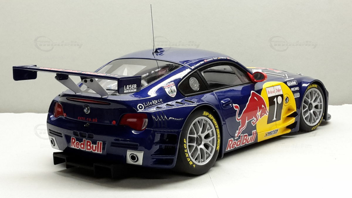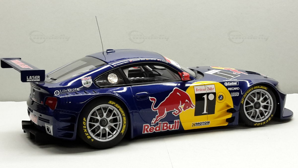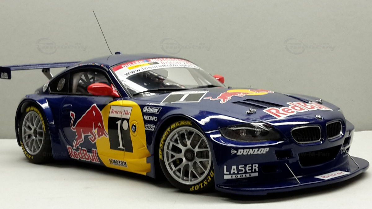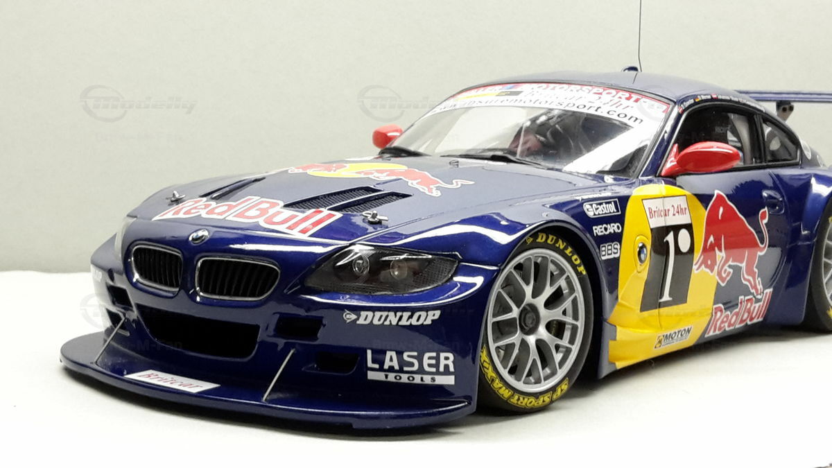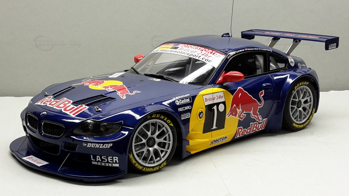 The model car collected by Bmw-M-Fan is a 1/18 replica of the BMW E86 Z4 24h Silverstone 2007, manufactured by AUTOart. This detailed reproduction is made from die-cast material, emphasizing its durability and authenticity. The precise rendition includes all essential details of the original, from the distinctive livery to the sponsor logos. The model accurately showcases the aggressive front end with air intakes and the large rear wing designed to optimize aerodynamics. The careful replica allows collectors to examine the technical intricacies and design of the race car up close. The logos of sponsors like Red Bull, Dunlop, and Laser adorn the model car, making it a sought-after collector's item for fans and enthusiasts of motorsports. This 1/18 scale, crafted by AUTOart, is a perfect example of detailed model art and a passion for racing history.