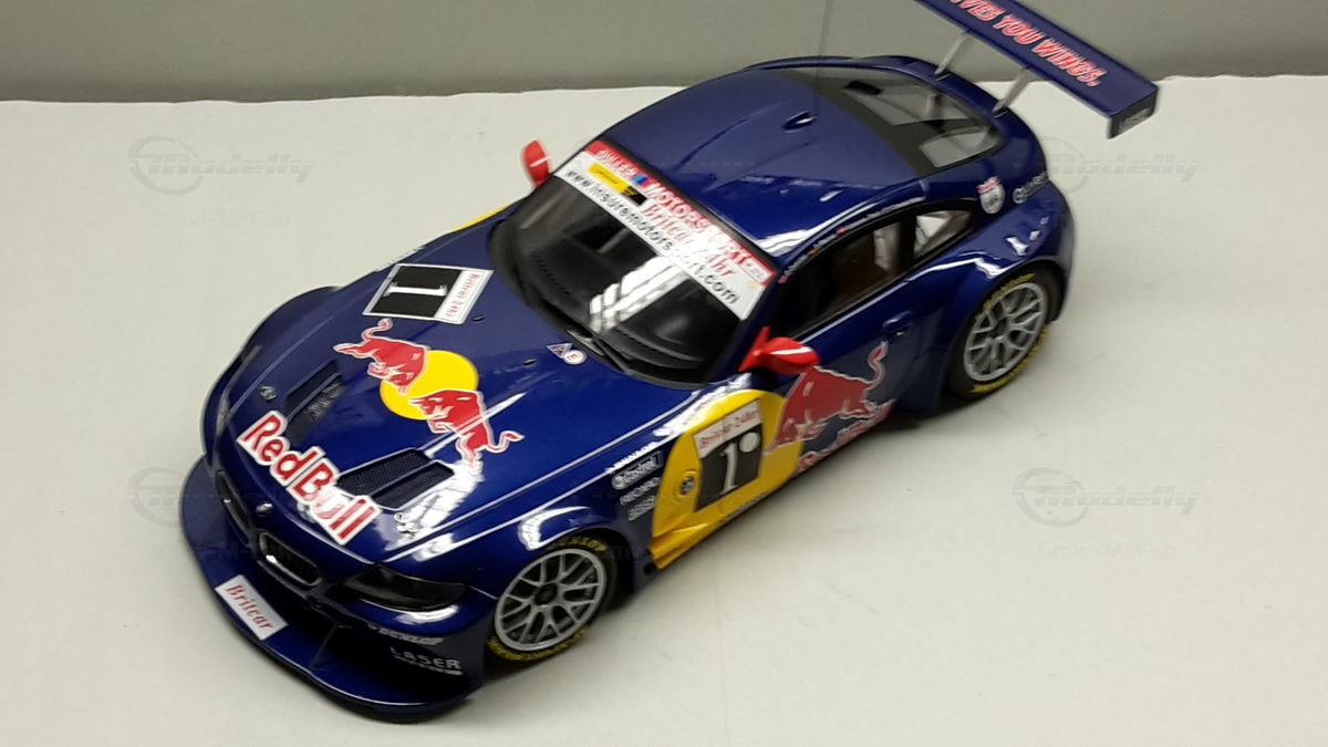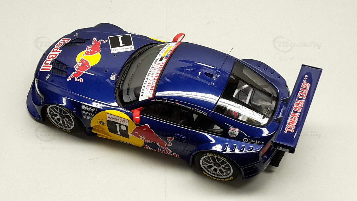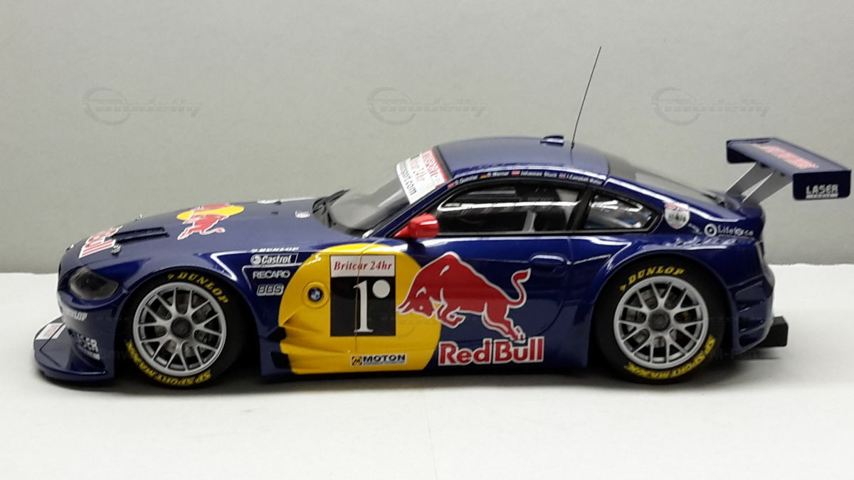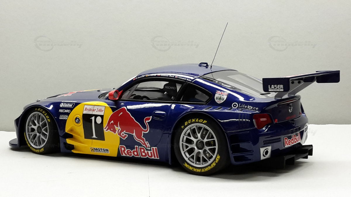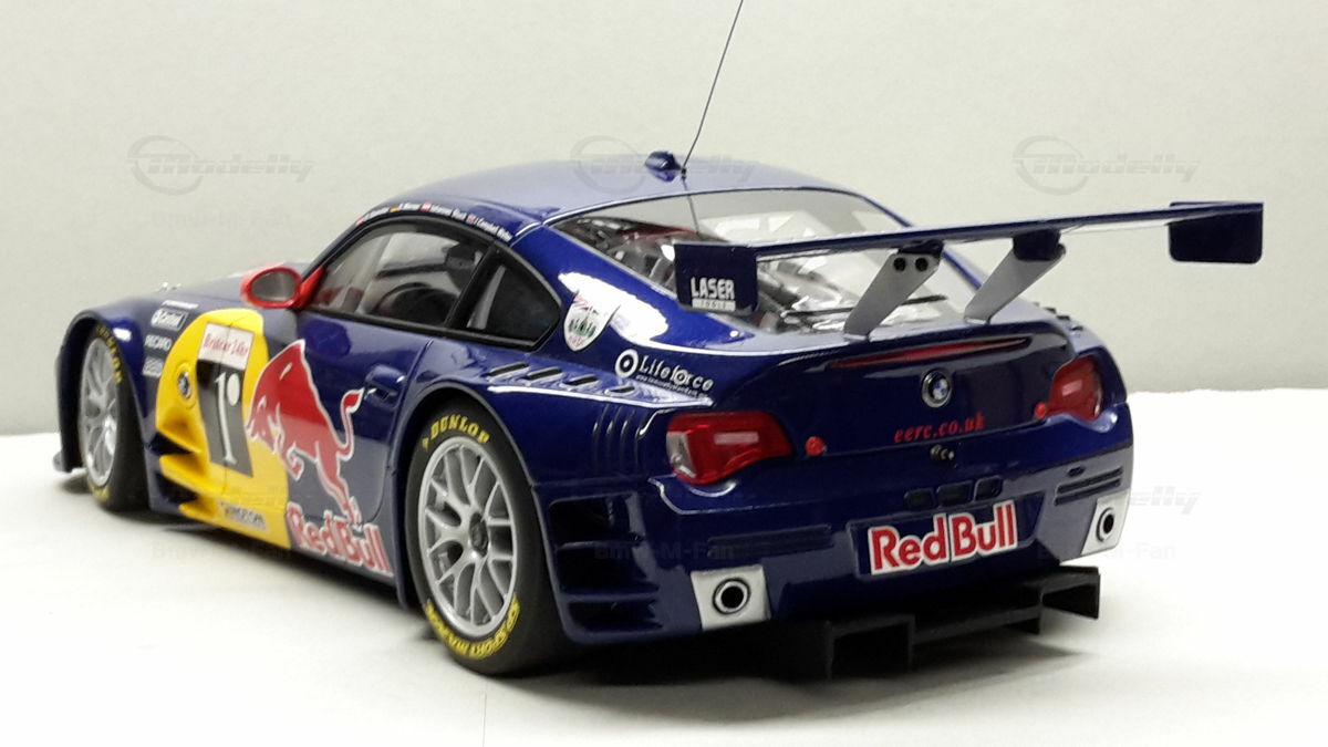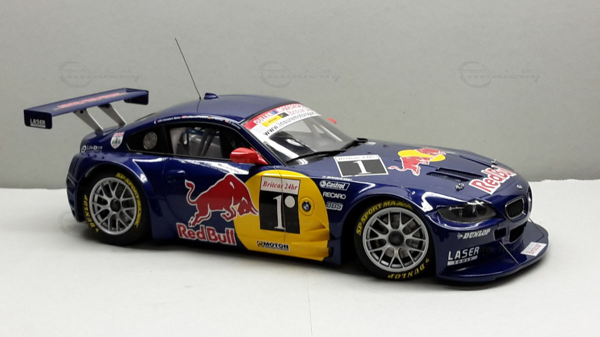 The model car collected by Bmw-M-Fan is a 1/18 replica of the BMW E86 Z4 24h Silverstone 2007, manufactured by AUTOart. This detailed reproduction is made from die-cast material, emphasizing its durability and authenticity. The precise rendition includes all essential details of the original, from the distinctive livery to the sponsor logos. The model accurately showcases the aggressive front end with air intakes and the large rear wing designed to optimize aerodynamics. The careful replica allows collectors to examine the technical intricacies and design of the race car up close. The logos of sponsors like Red Bull, Dunlop, and Laser adorn the model car, making it a sought-after collector's item for fans and enthusiasts of motorsports. This 1/18 scale, crafted by AUTOart, is a perfect example of detailed model art and a passion for racing history.