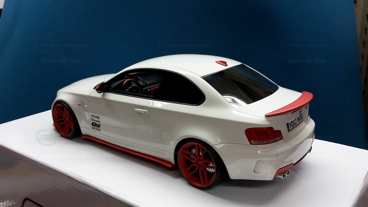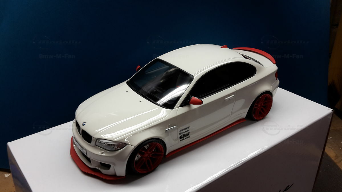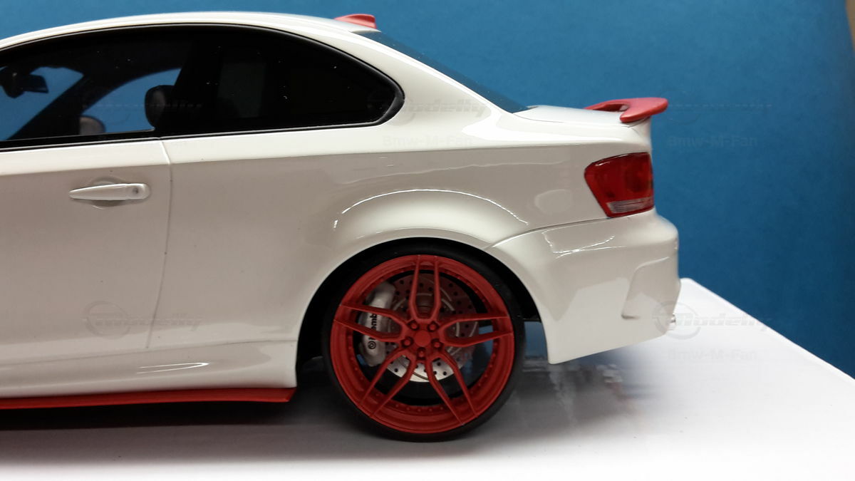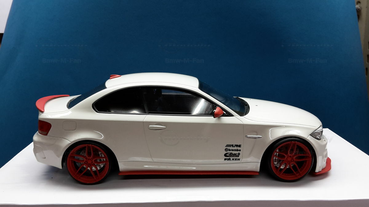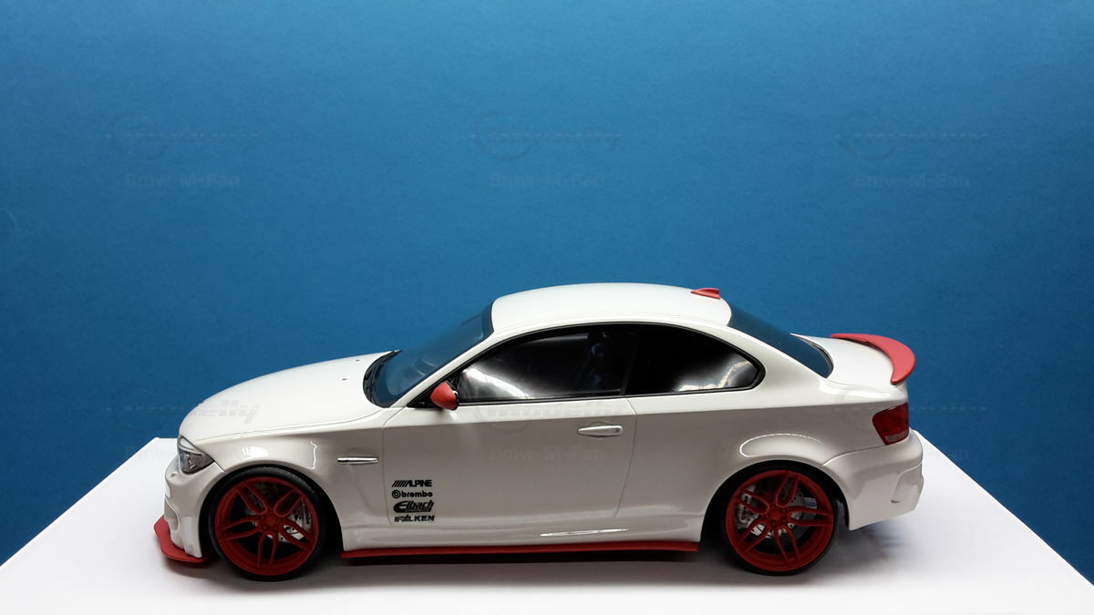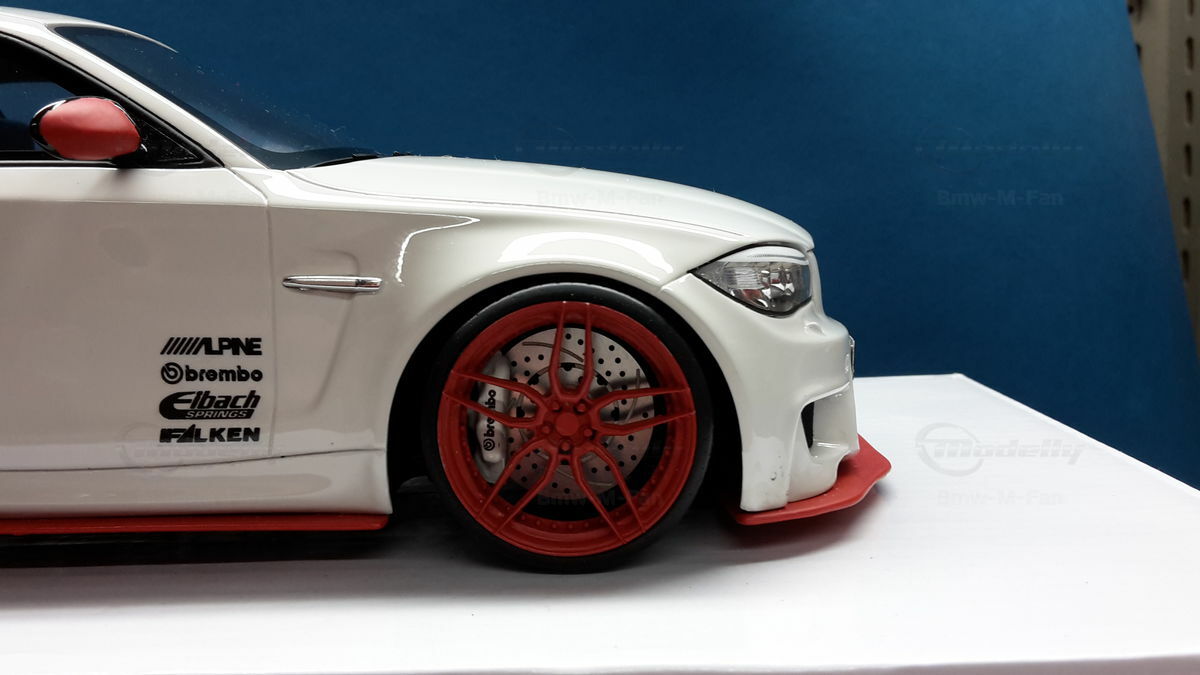 The scale model shown in 1/18 scale is a replica of the BMW E82 1M Coupe and was manufactured by GT Spirit. It is a highly modified version that does not represent the originally produced product by GT Spirit. This model is made of Resin material, known for its detail and durability. The striking red rims and details give the model a special touch. The applied decals of brands like Alpina, Brembo, Eibach, and Falken contribute to the authenticity and appeal of the model. The noticeable red accents on the mirror caps and front spoiler complete the overall look. It is clear that this is a lovingly designed and personalized miniature owned by Modelly member "Bmw-M-Fan."