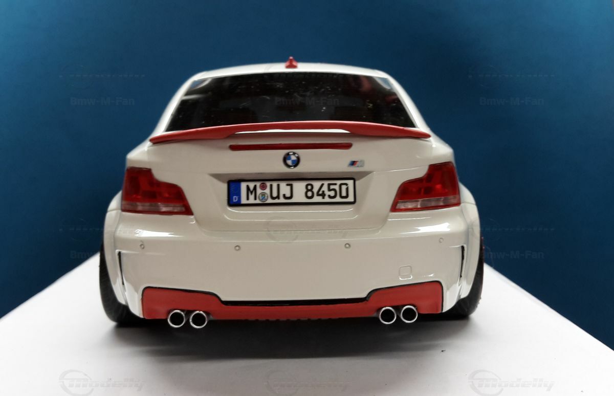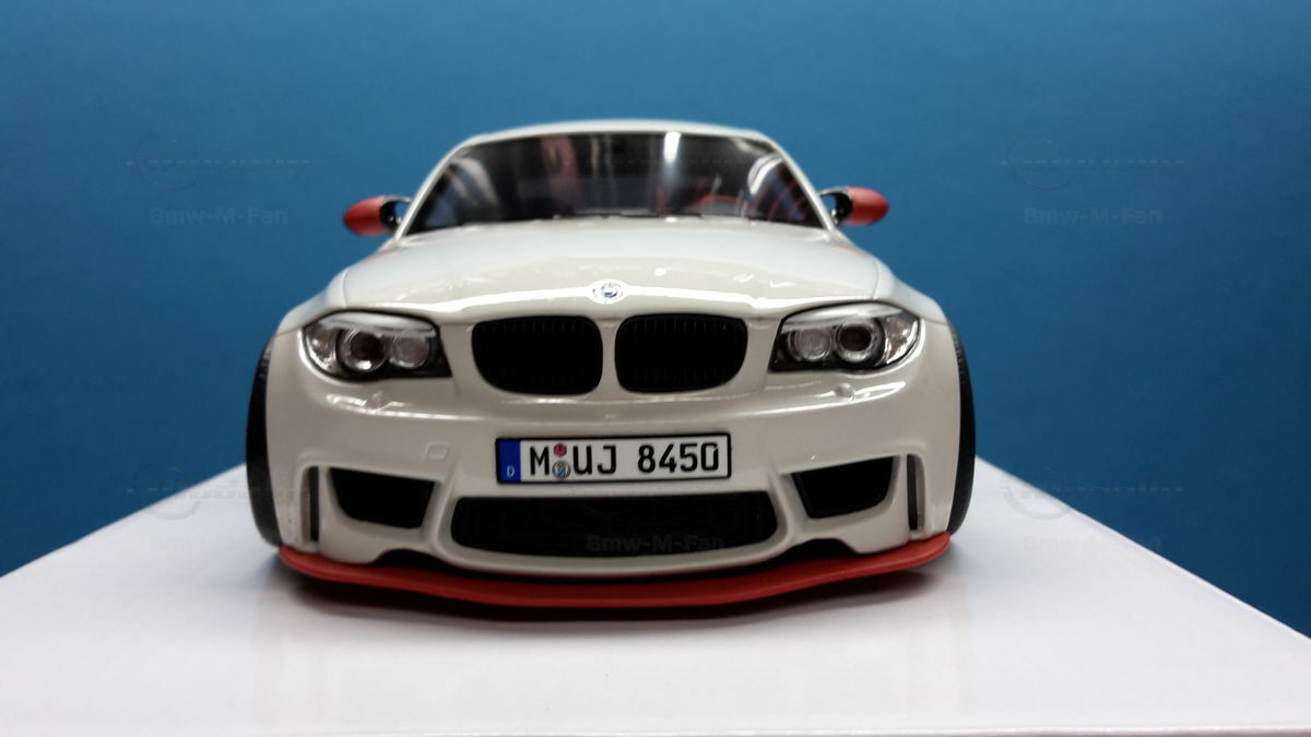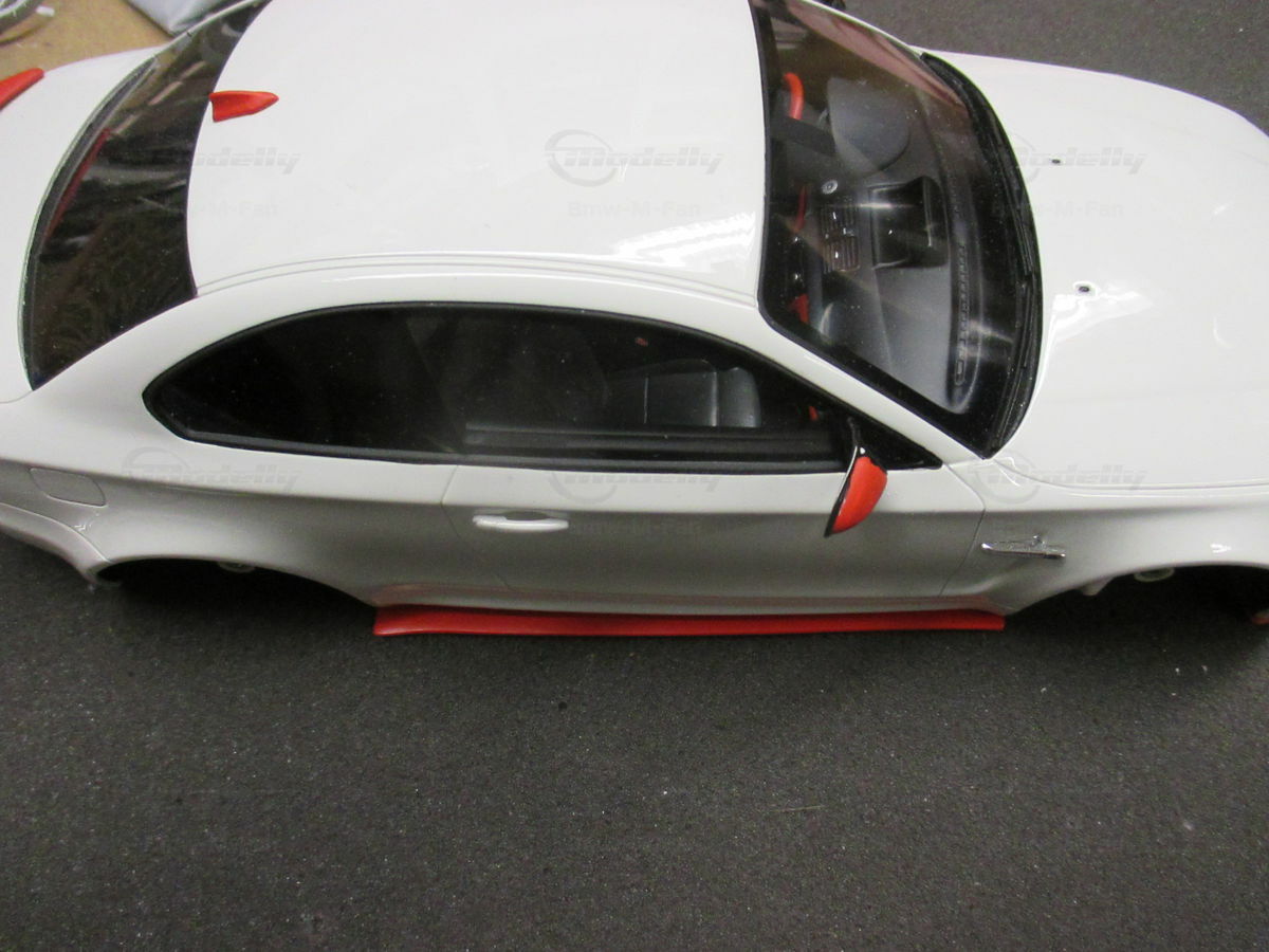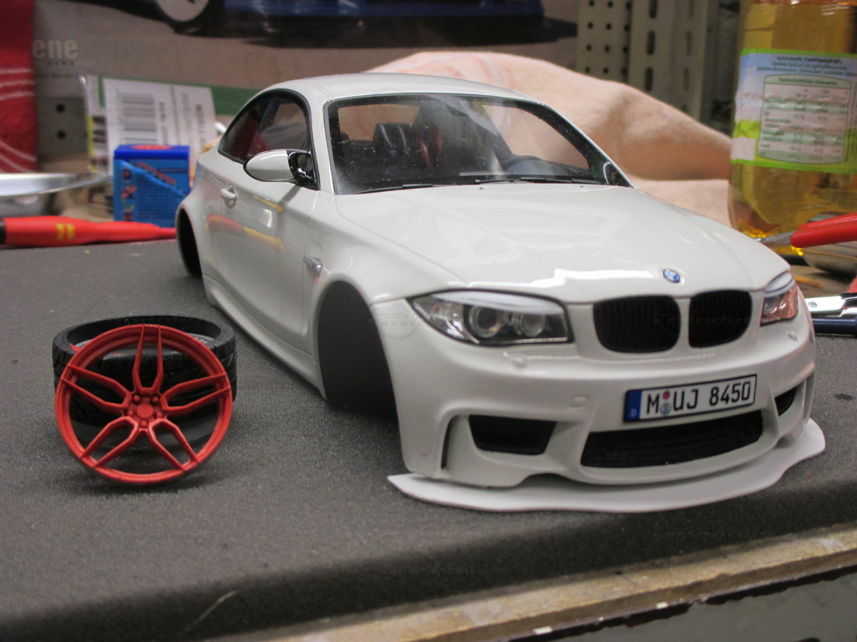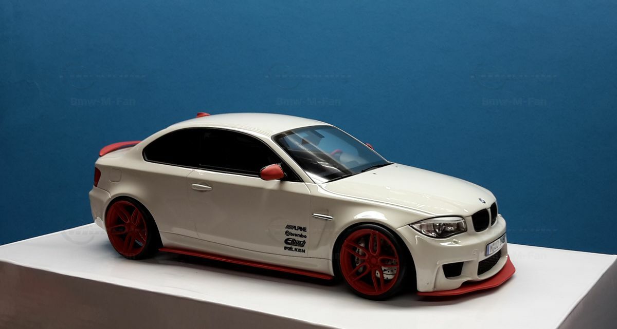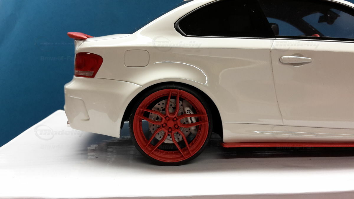 The scale model shown in 1/18 scale is a replica of the BMW E82 1M Coupe and was manufactured by GT Spirit. It is a highly modified version that does not represent the originally produced product by GT Spirit. This model is made of Resin material, known for its detail and durability. The striking red rims and details give the model a special touch. The applied decals of brands like Alpina, Brembo, Eibach, and Falken contribute to the authenticity and appeal of the model. The noticeable red accents on the mirror caps and front spoiler complete the overall look. It is clear that this is a lovingly designed and personalized miniature owned by Modelly member "Bmw-M-Fan."