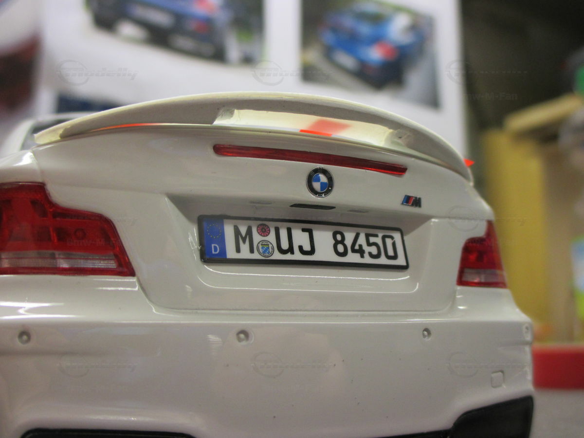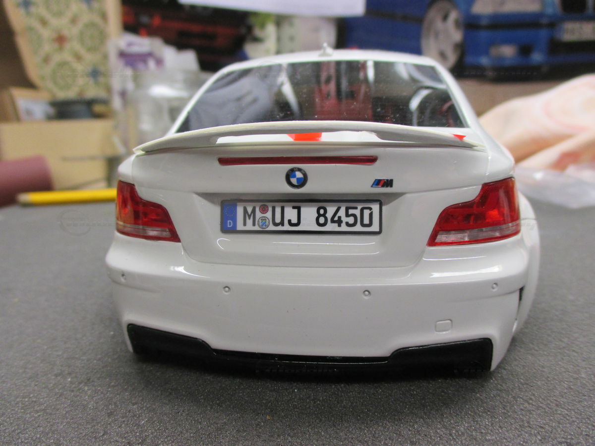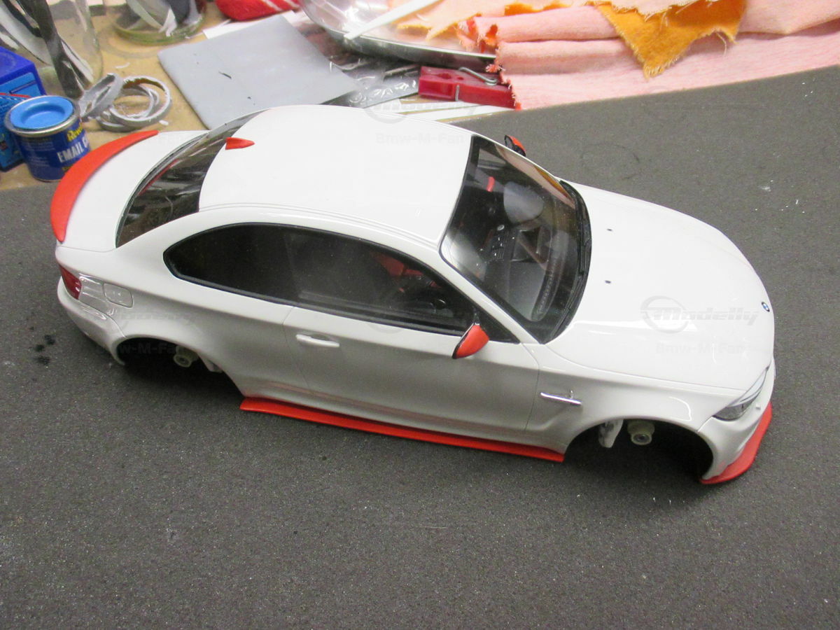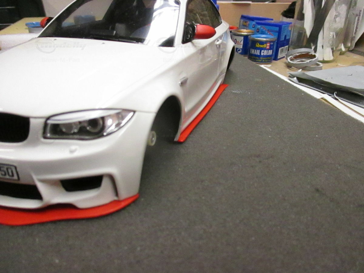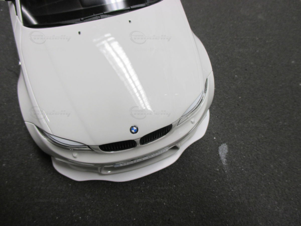 The scale model shown in 1/18 scale is a replica of the BMW E82 1M Coupe and was manufactured by GT Spirit. It is a highly modified version that does not represent the originally produced product by GT Spirit. This model is made of Resin material, known for its detail and durability. The striking red rims and details give the model a special touch. The applied decals of brands like Alpina, Brembo, Eibach, and Falken contribute to the authenticity and appeal of the model. The noticeable red accents on the mirror caps and front spoiler complete the overall look. It is clear that this is a lovingly designed and personalized miniature owned by Modelly member "Bmw-M-Fan."