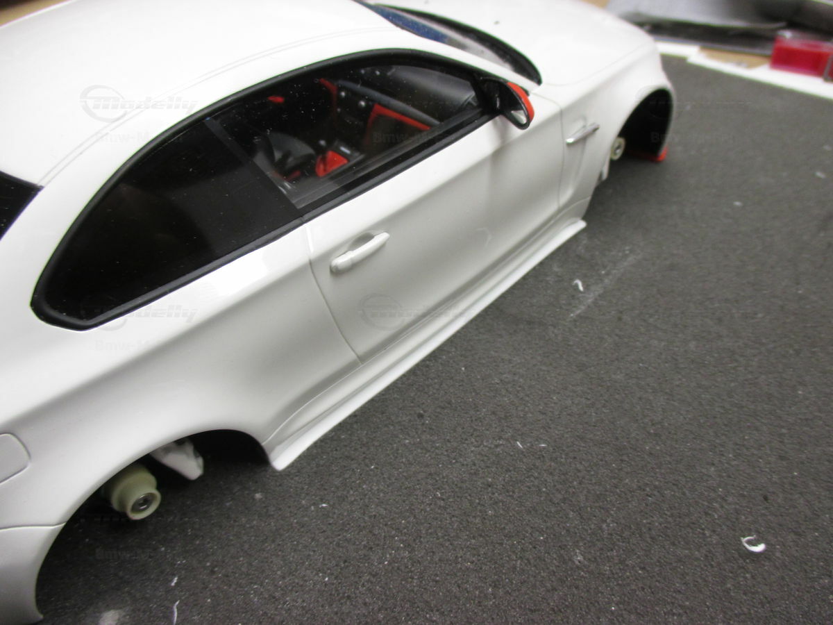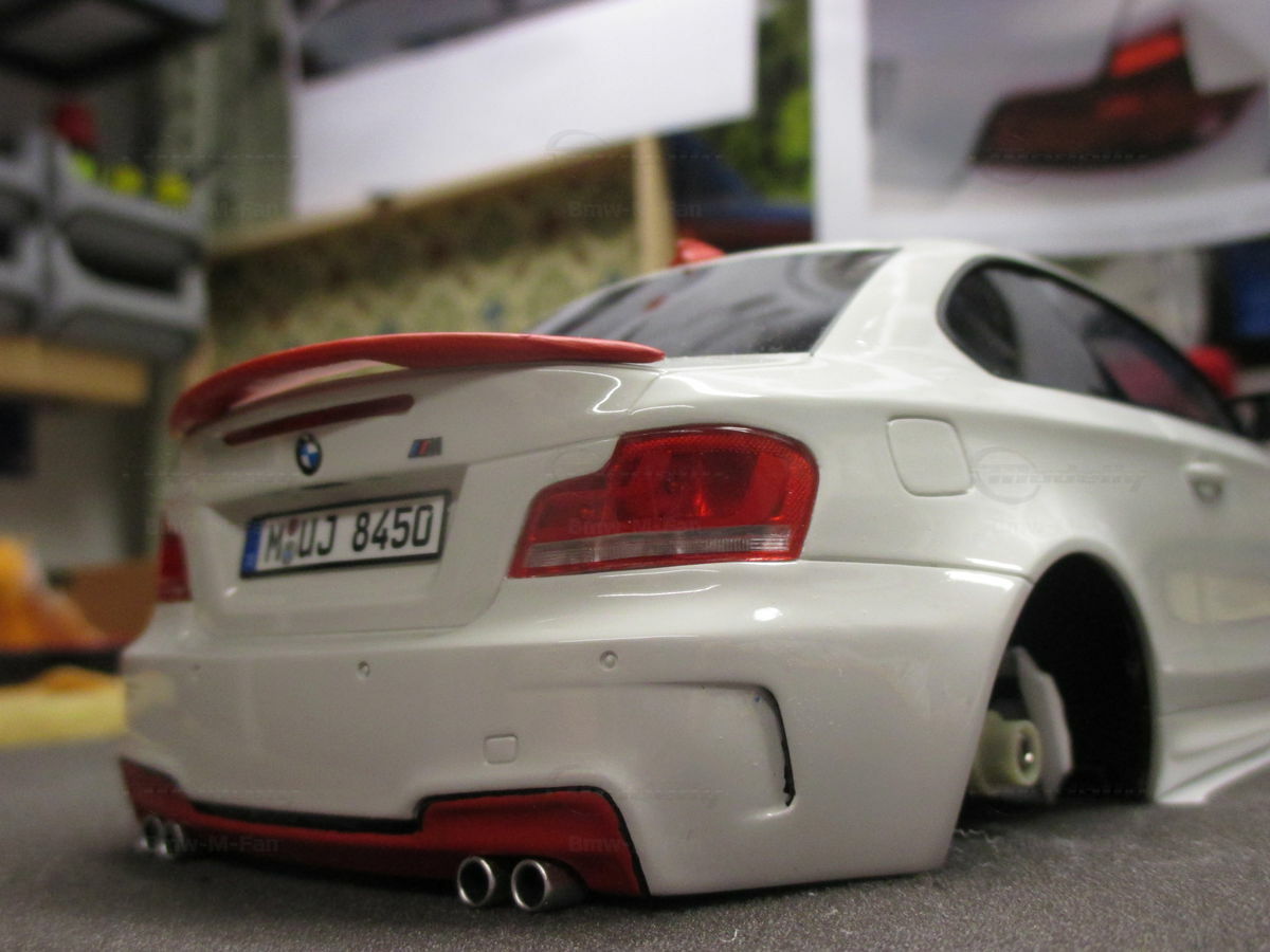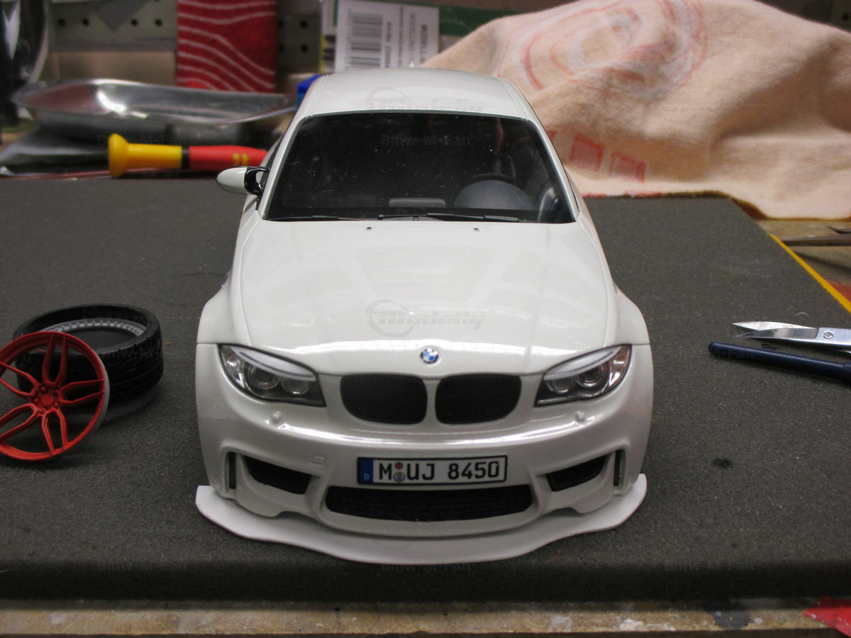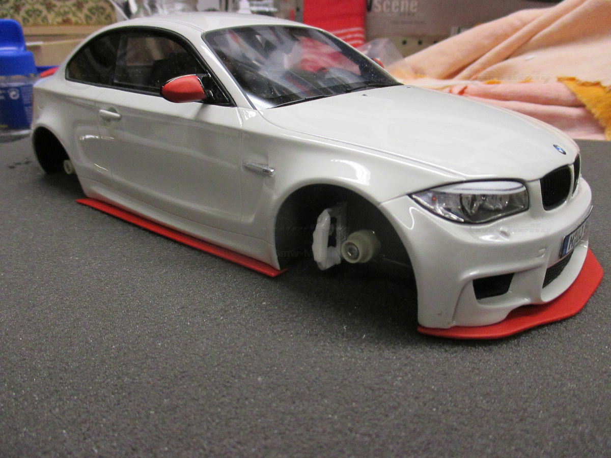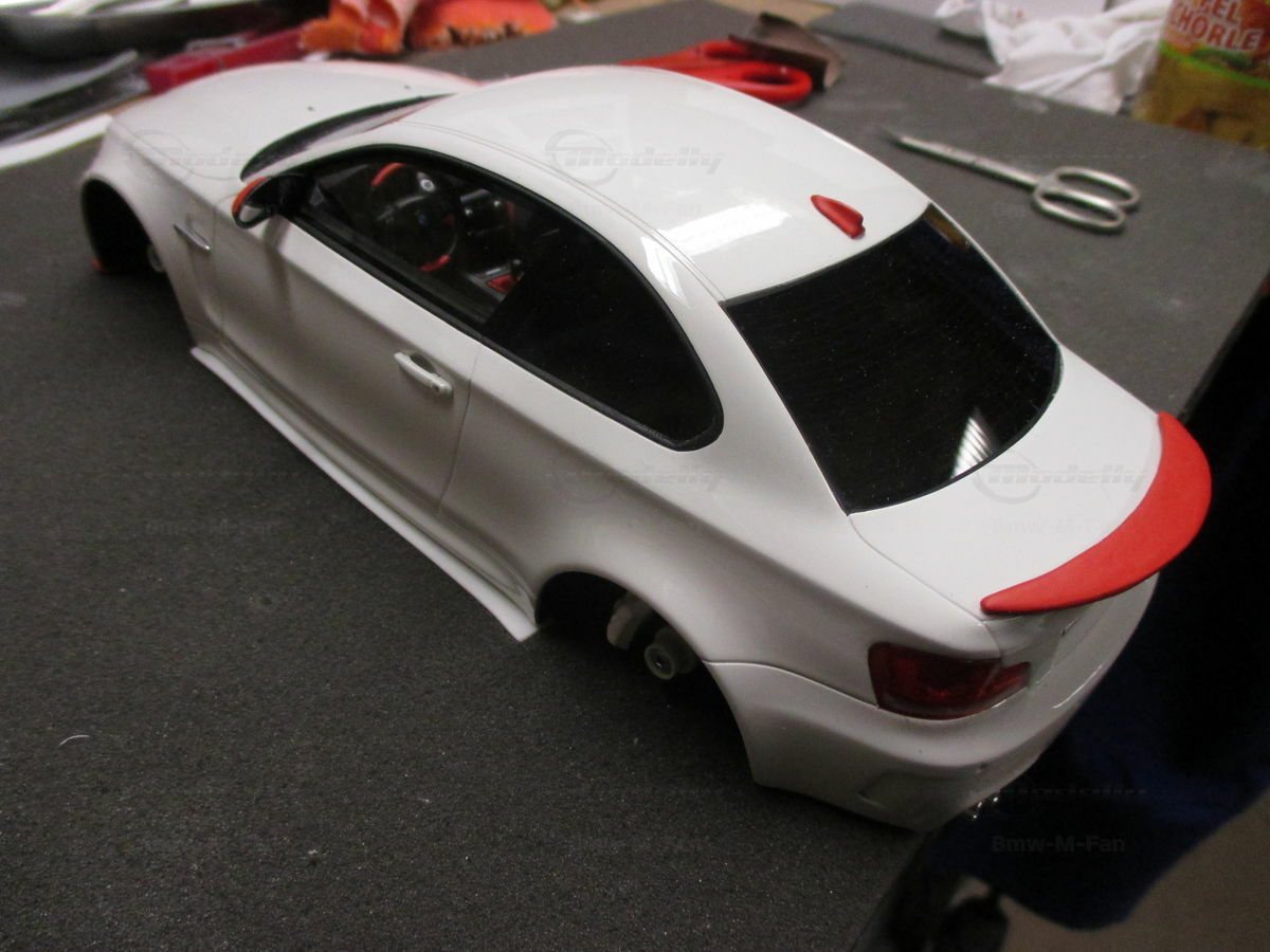 The scale model shown in 1/18 scale is a replica of the BMW E82 1M Coupe and was manufactured by GT Spirit. It is a highly modified version that does not represent the originally produced product by GT Spirit. This model is made of Resin material, known for its detail and durability. The striking red rims and details give the model a special touch. The applied decals of brands like Alpina, Brembo, Eibach, and Falken contribute to the authenticity and appeal of the model. The noticeable red accents on the mirror caps and front spoiler complete the overall look. It is clear that this is a lovingly designed and personalized miniature owned by Modelly member "Bmw-M-Fan."
