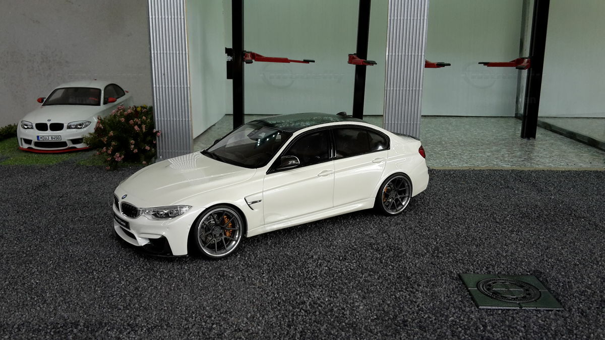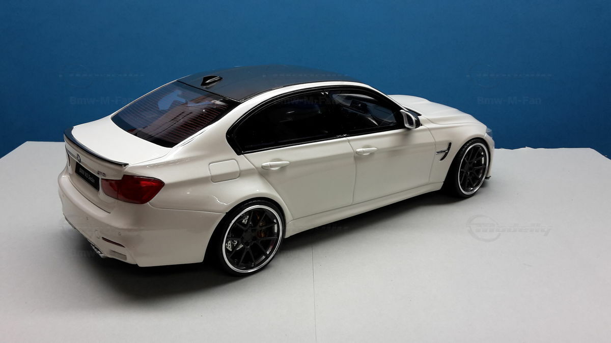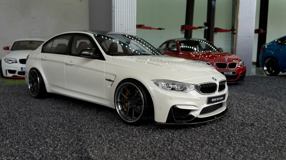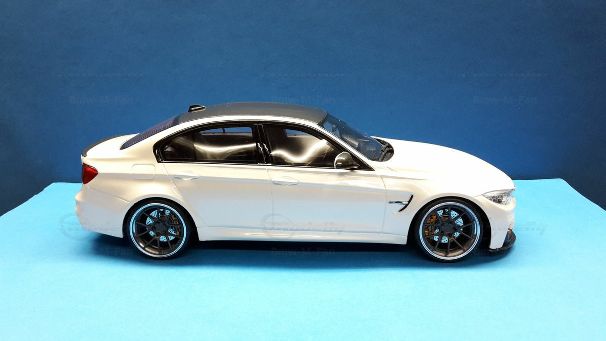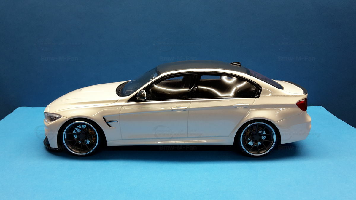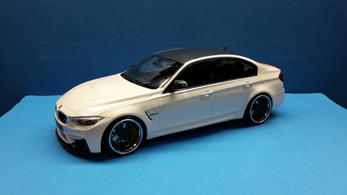 The model’s body is painted white, a shade that resembles BMW Mineral White. The contrast to the black roof and dark aero parts highlights the car’s lines. Proportions look right, panel lines are clean, and the light signatures front and rear are accurately printed. The photos give the vibe of tuner cars sometimes called “Carbon Edition” — those custom builds often use carbon add‑ons and wheels from makers like ADV.1 Wheels (founded 2009 in the USA). You can’t definitively ID the rims in the pictures, so I’m leaving that open. For collectors it’s important to note: this is a 1/18 resin model by GT Spirit and it has been modified after purchase — it doesn’t represent the untouched factory model from GT Spirit. Still, typical features from the maker like the closed construction, faithful bodywork and crisp engraving of the lines are visible. On the shelf the piece makes a strong impression thanks to its slammed stance, big wheels and clear contours, while still staying true to the character of the BMW M3 F80. If you like technical authenticity, the model gives you cues from the real car: suggested vents in the fenders, the M‑specific front with larger openings for brake and charge‑air cooling, and the dark roof referencing the production car’s carbon roof. All in all, it’s a straightforward but collector‑friendly depiction of a modified 1/18 scale BMW M3 F80.