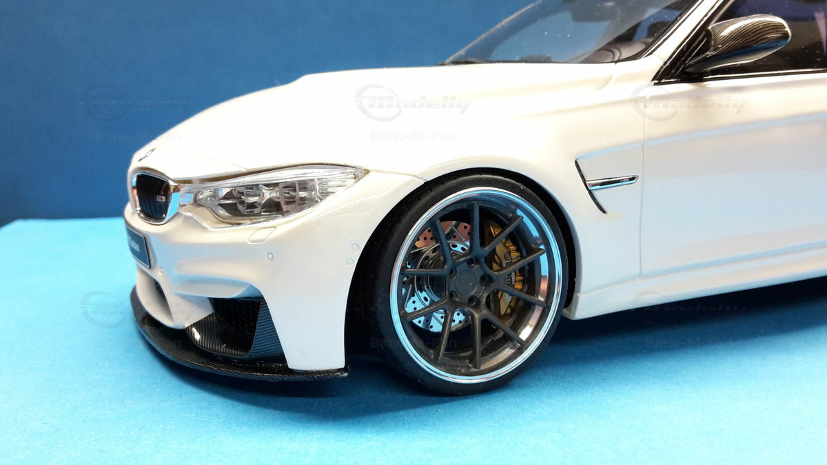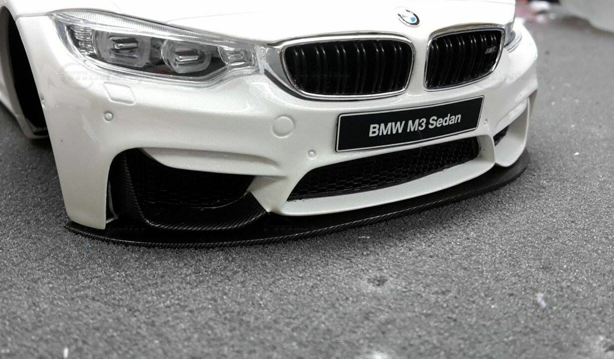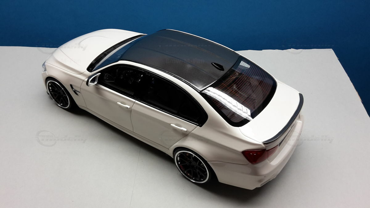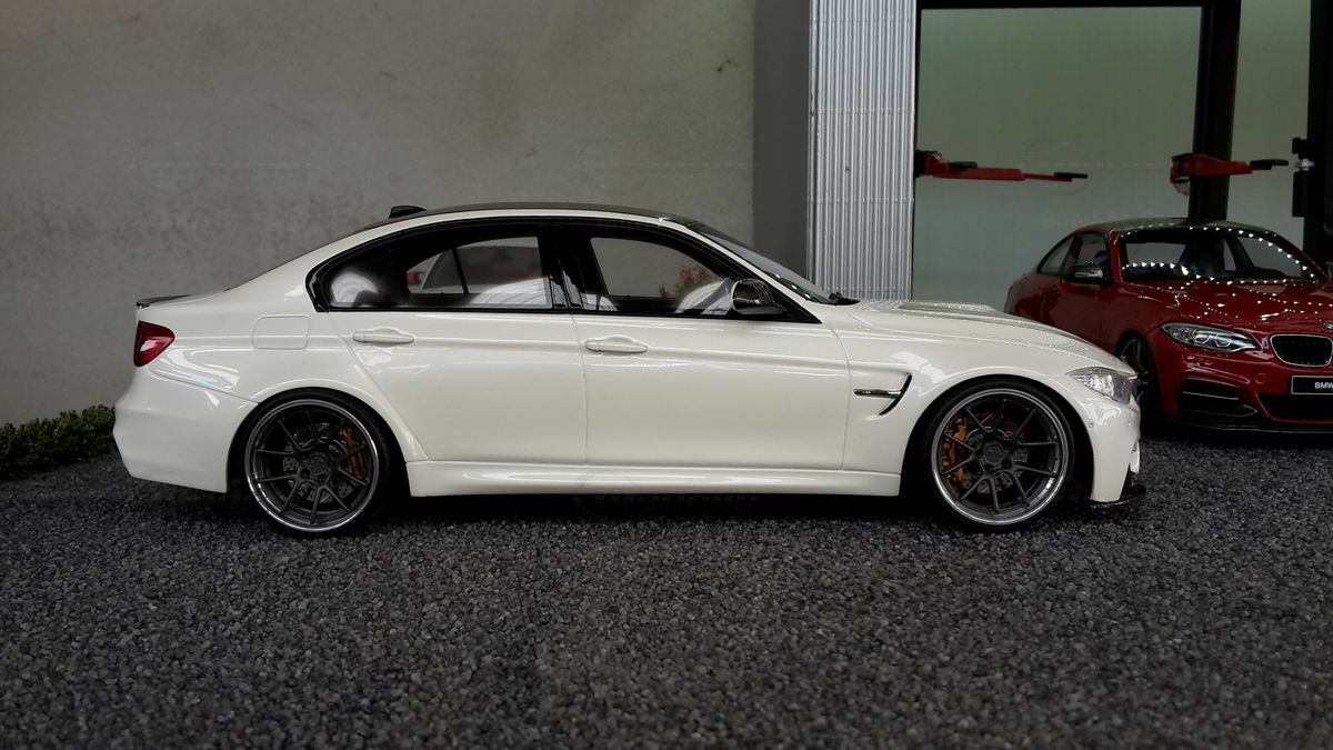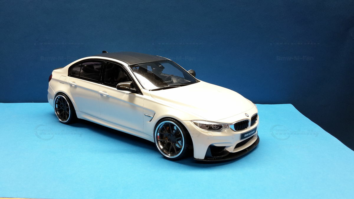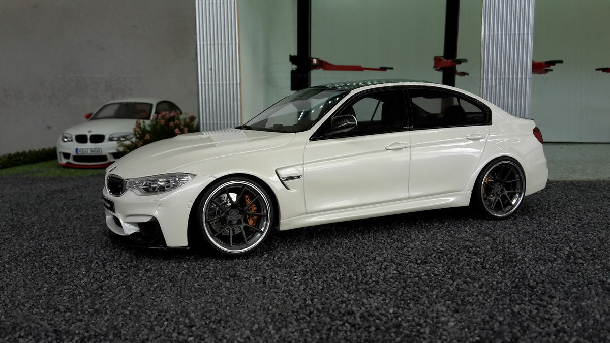 The model’s body is painted white, a shade that resembles BMW Mineral White. The contrast to the black roof and dark aero parts highlights the car’s lines. Proportions look right, panel lines are clean, and the light signatures front and rear are accurately printed. The photos give the vibe of tuner cars sometimes called “Carbon Edition” — those custom builds often use carbon add‑ons and wheels from makers like ADV.1 Wheels (founded 2009 in the USA). You can’t definitively ID the rims in the pictures, so I’m leaving that open. For collectors it’s important to note: this is a 1/18 resin model by GT Spirit and it has been modified after purchase — it doesn’t represent the untouched factory model from GT Spirit. Still, typical features from the maker like the closed construction, faithful bodywork and crisp engraving of the lines are visible. On the shelf the piece makes a strong impression thanks to its slammed stance, big wheels and clear contours, while still staying true to the character of the BMW M3 F80. If you like technical authenticity, the model gives you cues from the real car: suggested vents in the fenders, the M‑specific front with larger openings for brake and charge‑air cooling, and the dark roof referencing the production car’s carbon roof. All in all, it’s a straightforward but collector‑friendly depiction of a modified 1/18 scale BMW M3 F80.