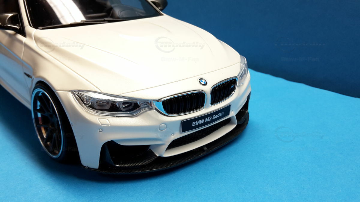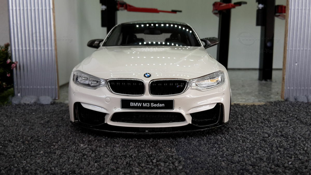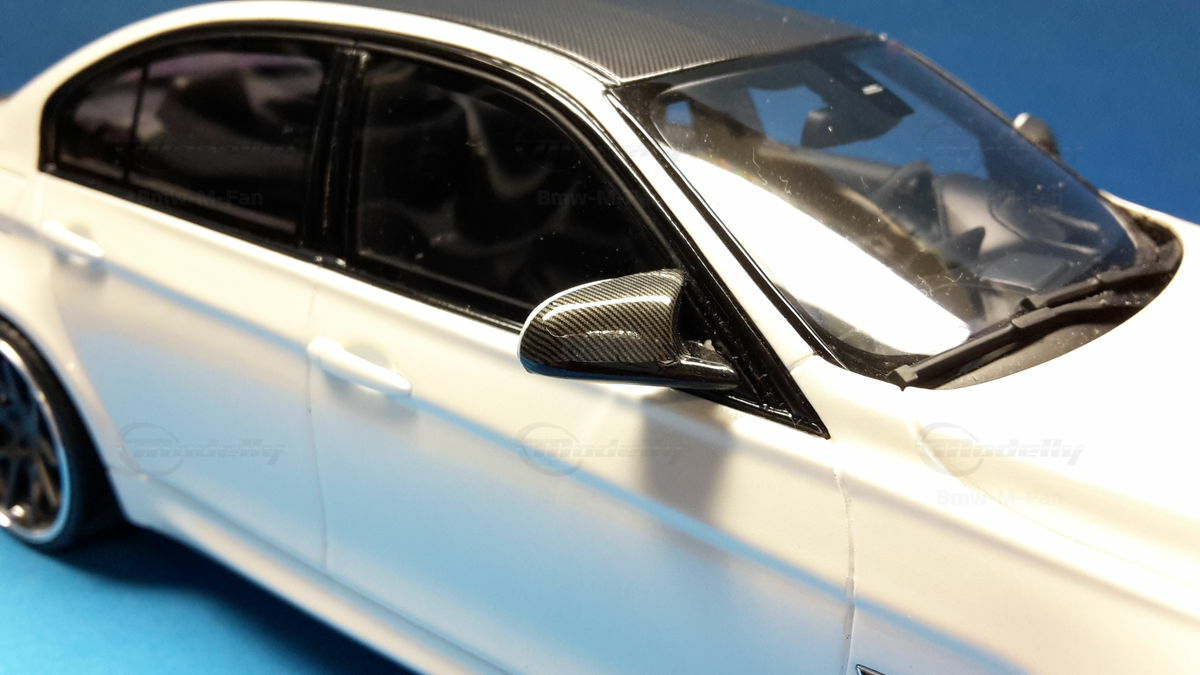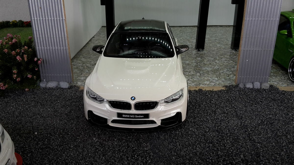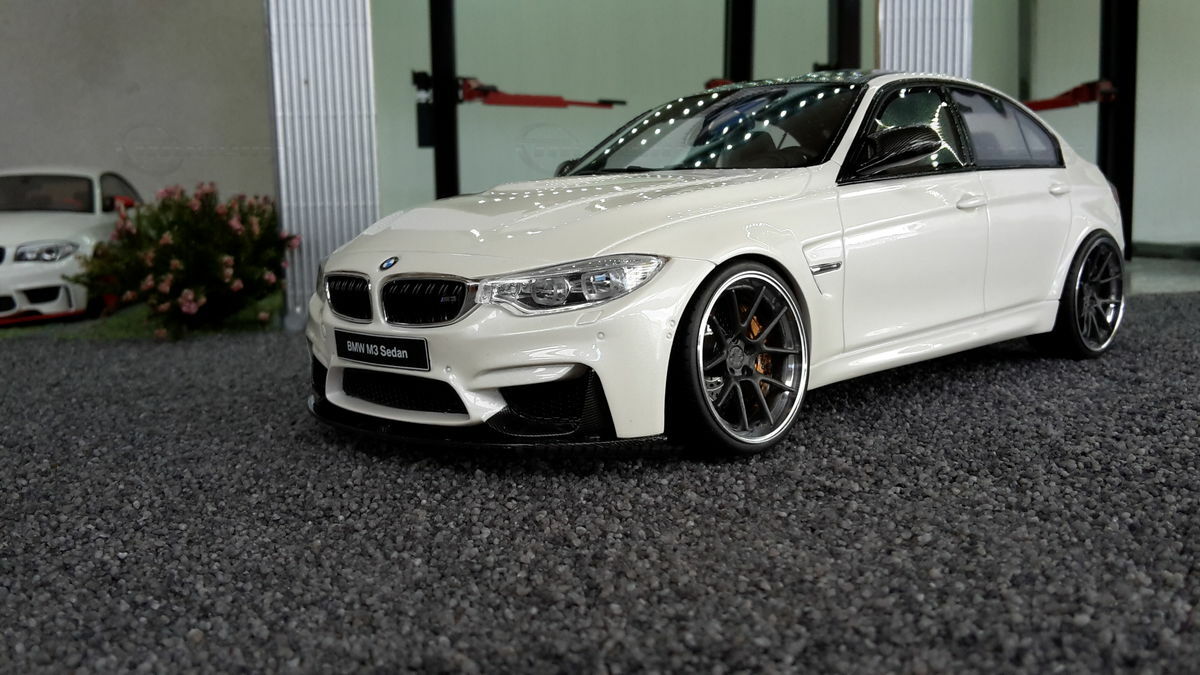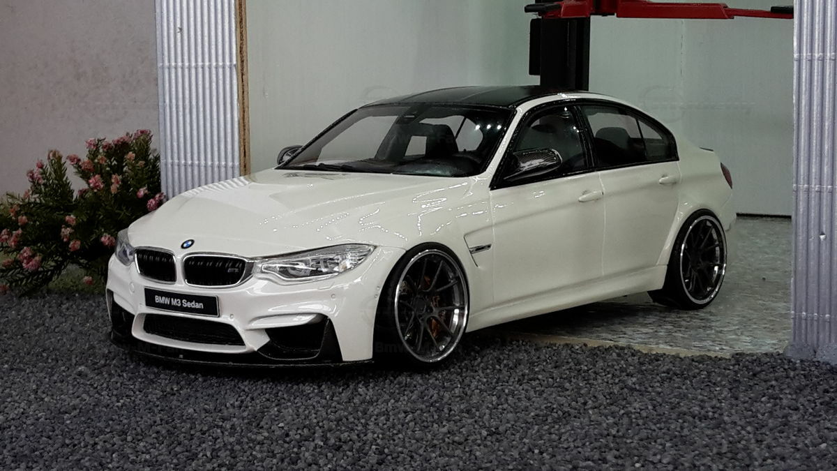 The model’s body is painted white, a shade that resembles BMW Mineral White. The contrast to the black roof and dark aero parts highlights the car’s lines. Proportions look right, panel lines are clean, and the light signatures front and rear are accurately printed. The photos give the vibe of tuner cars sometimes called “Carbon Edition” — those custom builds often use carbon add‑ons and wheels from makers like ADV.1 Wheels (founded 2009 in the USA). You can’t definitively ID the rims in the pictures, so I’m leaving that open. For collectors it’s important to note: this is a 1/18 resin model by GT Spirit and it has been modified after purchase — it doesn’t represent the untouched factory model from GT Spirit. Still, typical features from the maker like the closed construction, faithful bodywork and crisp engraving of the lines are visible. On the shelf the piece makes a strong impression thanks to its slammed stance, big wheels and clear contours, while still staying true to the character of the BMW M3 F80. If you like technical authenticity, the model gives you cues from the real car: suggested vents in the fenders, the M‑specific front with larger openings for brake and charge‑air cooling, and the dark roof referencing the production car’s carbon roof. All in all, it’s a straightforward but collector‑friendly depiction of a modified 1/18 scale BMW M3 F80.