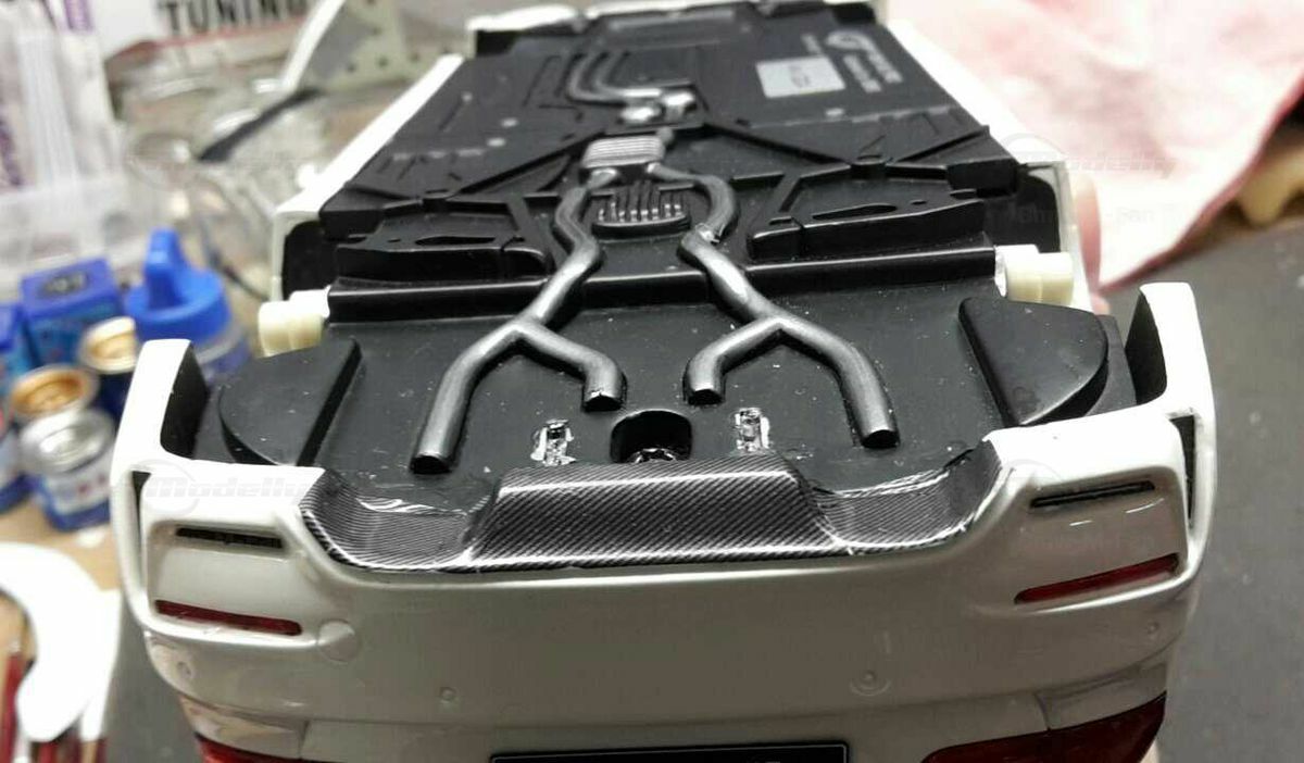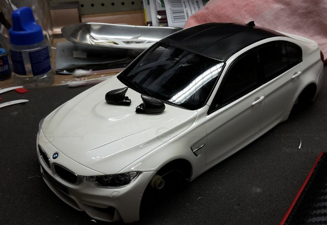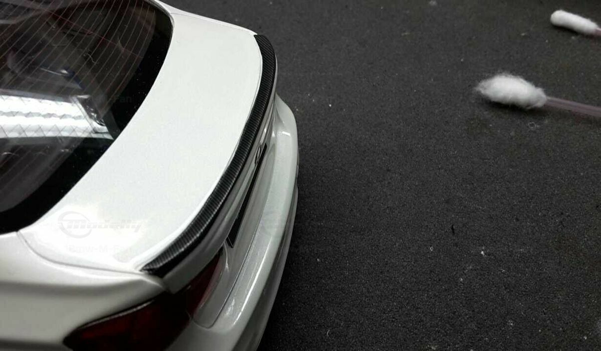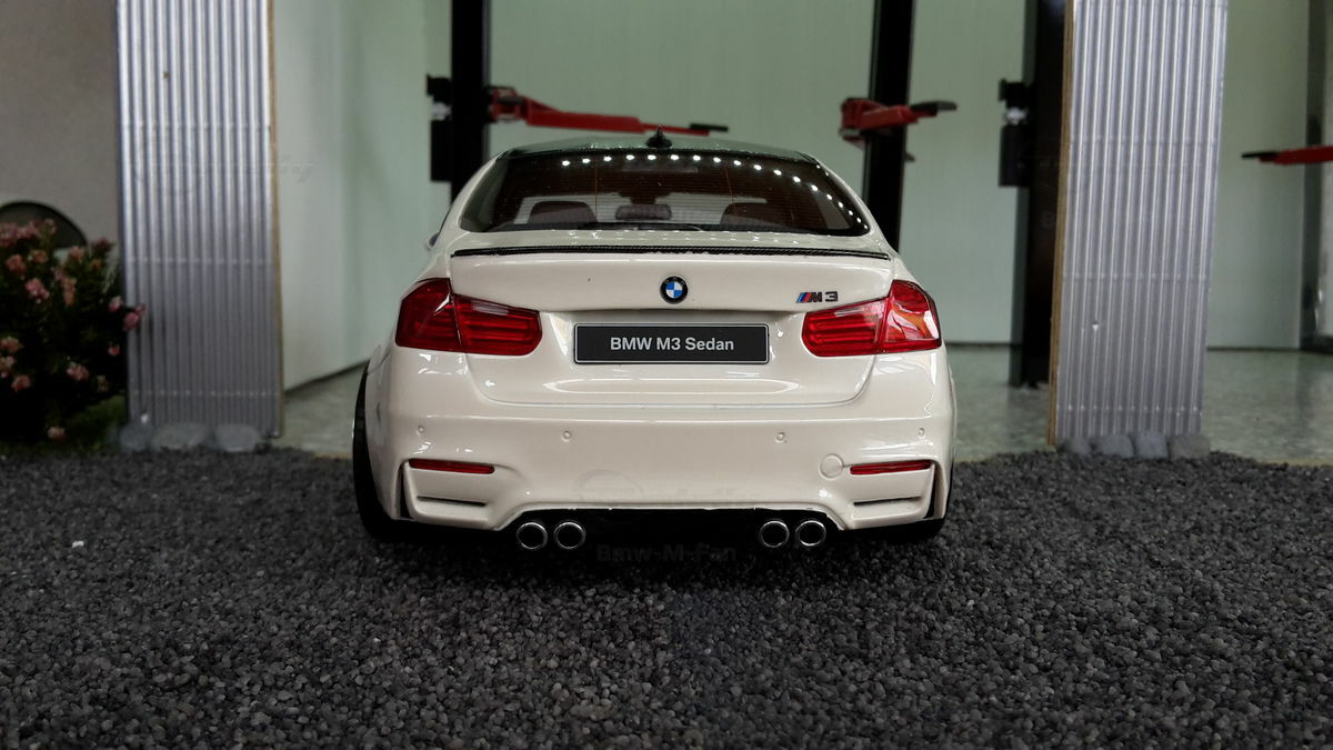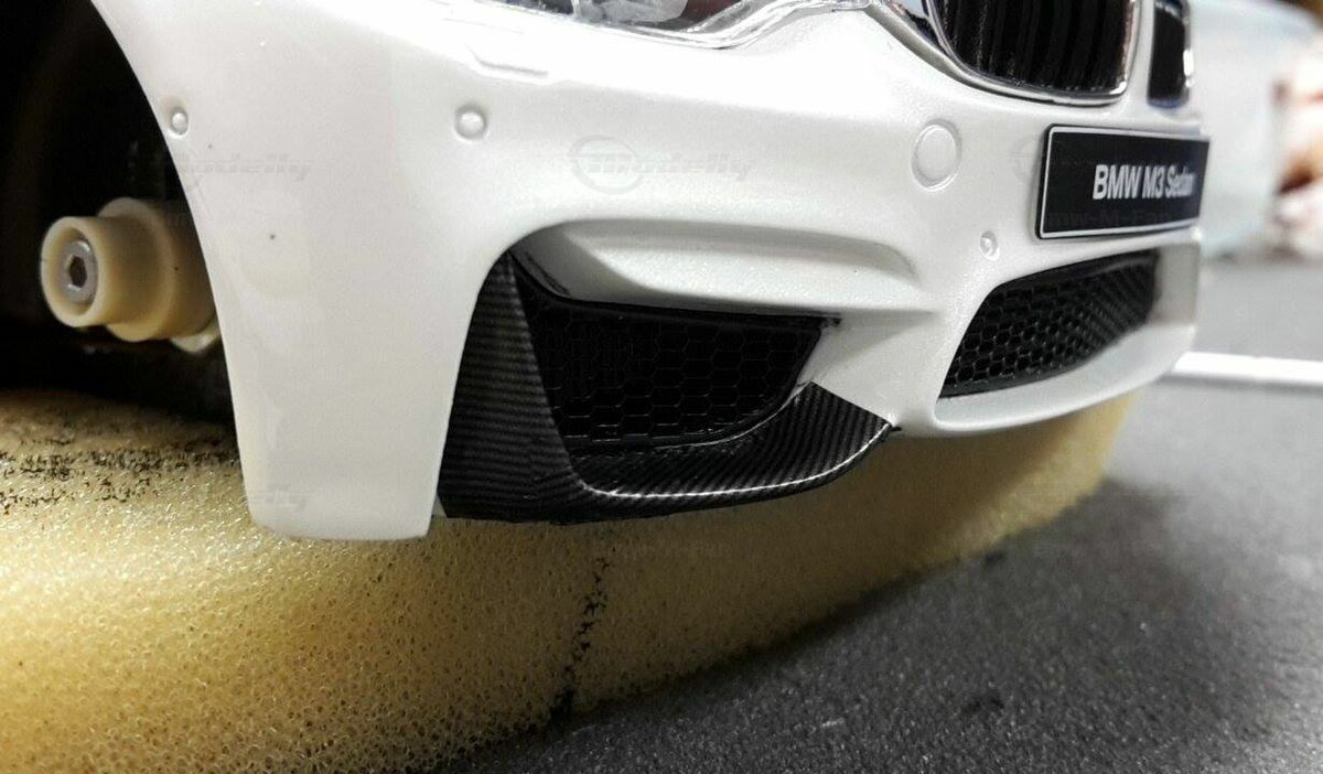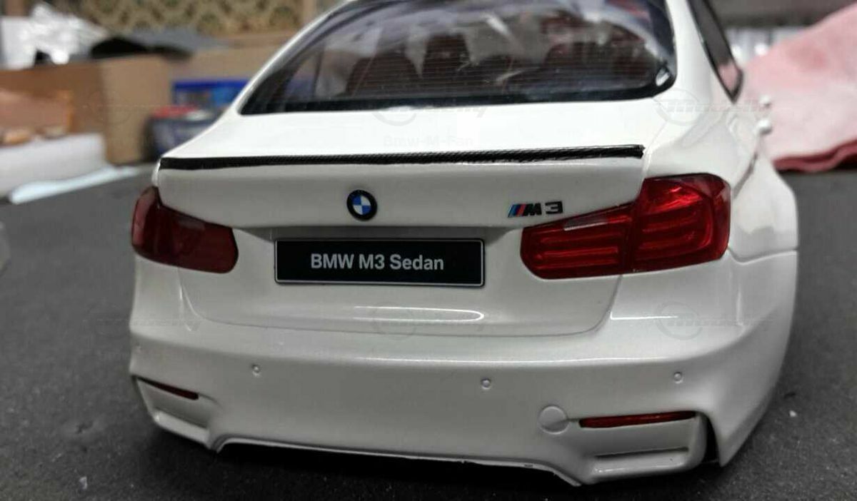 The model’s body is painted white, a shade that resembles BMW Mineral White. The contrast to the black roof and dark aero parts highlights the car’s lines. Proportions look right, panel lines are clean, and the light signatures front and rear are accurately printed. The photos give the vibe of tuner cars sometimes called “Carbon Edition” — those custom builds often use carbon add‑ons and wheels from makers like ADV.1 Wheels (founded 2009 in the USA). You can’t definitively ID the rims in the pictures, so I’m leaving that open. For collectors it’s important to note: this is a 1/18 resin model by GT Spirit and it has been modified after purchase — it doesn’t represent the untouched factory model from GT Spirit. Still, typical features from the maker like the closed construction, faithful bodywork and crisp engraving of the lines are visible. On the shelf the piece makes a strong impression thanks to its slammed stance, big wheels and clear contours, while still staying true to the character of the BMW M3 F80. If you like technical authenticity, the model gives you cues from the real car: suggested vents in the fenders, the M‑specific front with larger openings for brake and charge‑air cooling, and the dark roof referencing the production car’s carbon roof. All in all, it’s a straightforward but collector‑friendly depiction of a modified 1/18 scale BMW M3 F80.