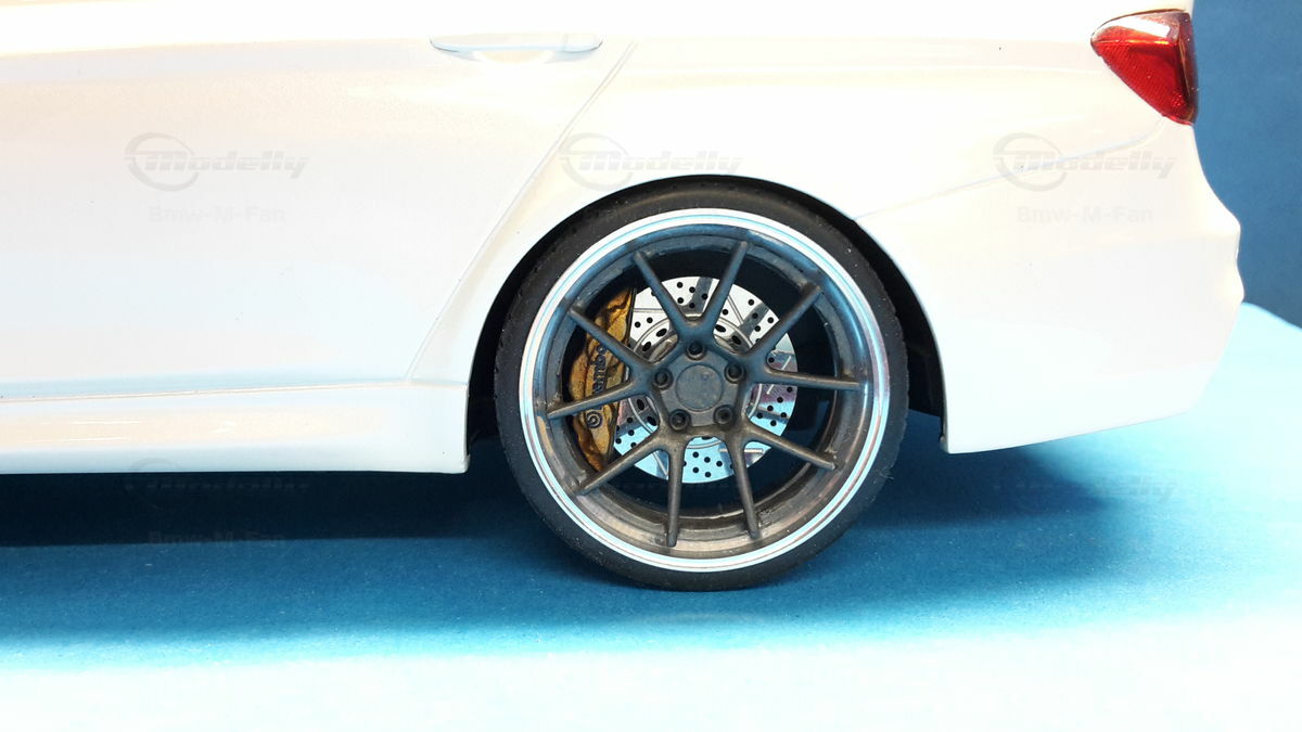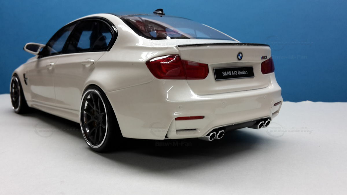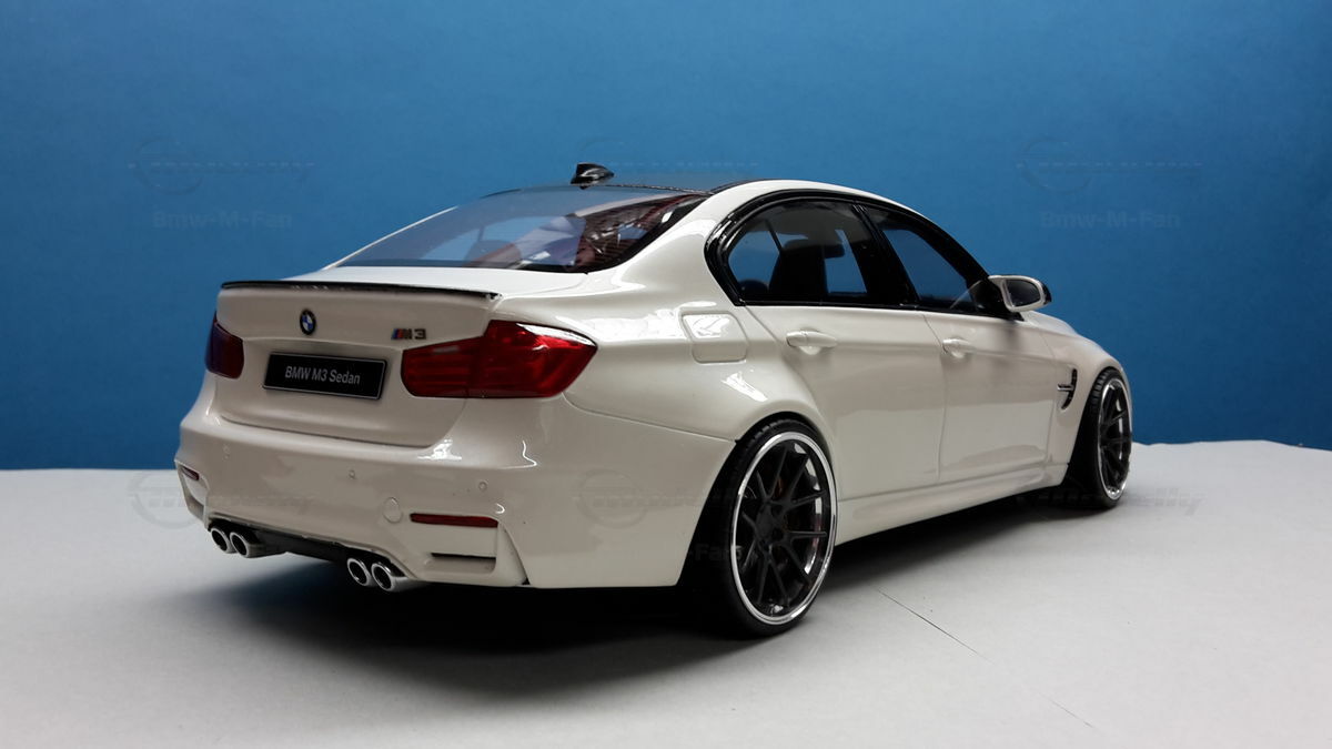 The car shown here is a 1/18 scale resin model from GT Spirit, part of the collection of the Modelly member “Bmw‑M‑Fan”. IMPORTANT NOTE: This piece has been modified after purchase; it’s a customized miniature and not the unaltered product originally sold by GT Spirit. Resin construction means a closed body with non‑opening parts, but with neat panel lines and finely modelled details. On this example the very low ride height and the concave multi‑spoke wheels stand out — both point to an aftermarket lowering and wheel swap done after delivery. The brake calipers are painted a copper/gold tone and look good with the large discs. The front shows black inserts in the spoiler area, the sideblades and air intakes are dark too; there’s a front splitter in a carbon look. The badge “BMW M3 Sedan” on the license area clearly ties the model to the BMW M3 F80. The roof is done in black, echoing the real car’s CFRP roof. Gloss‑black kidney grilles, a subtle trunk spoiler and sculpted side skirts are well executed. Behind the lightly tinted windows you can spot a reproduced interior with sport seats and an M‑specific steering wheel.
