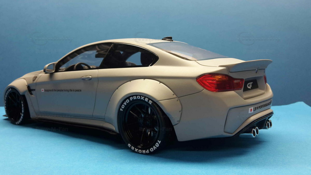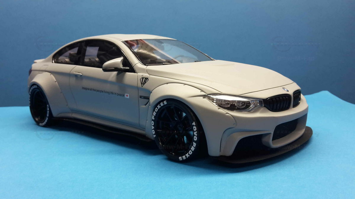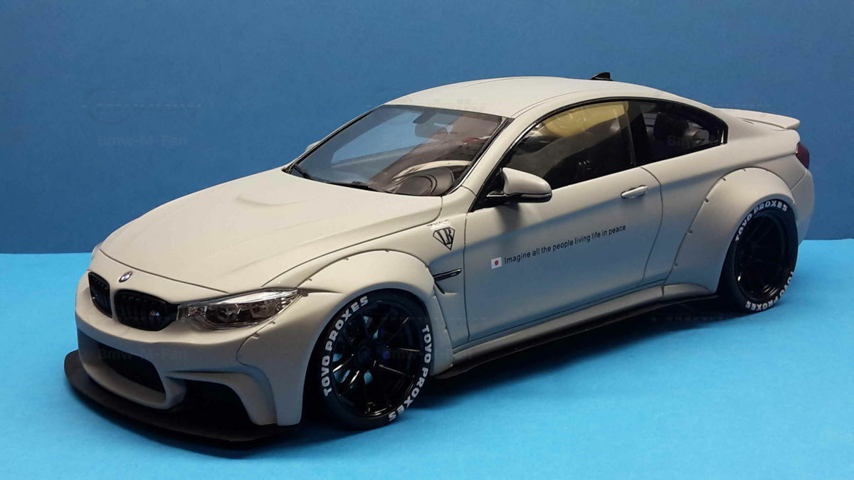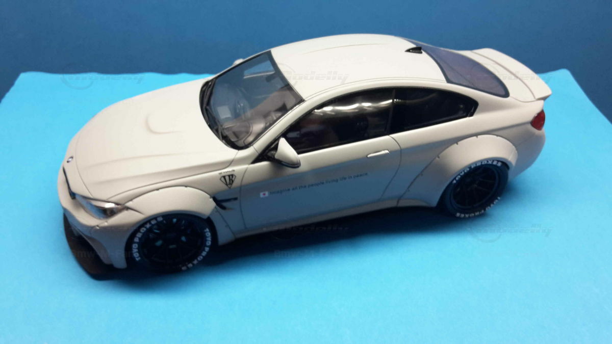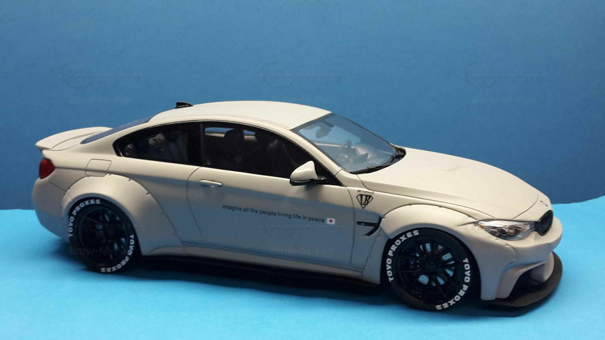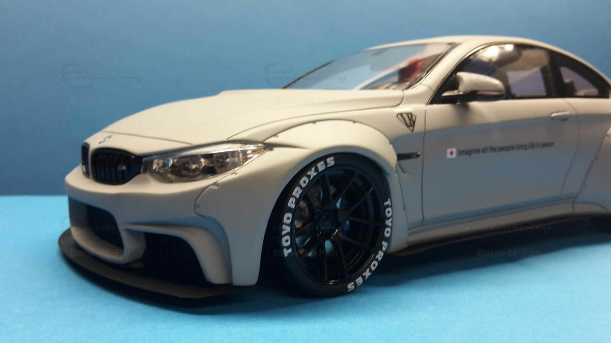 The special design of the miniature showcased here, belonging to Modelly member "Bmw-M-Fan", has been modified by Liberty Walk. Liberty Walk is a Japanese tuning company founded in 2008, known for its eye-catching widebody kits. These modifications include widened fenders, lowered suspension, and special aerodynamic components. In the photos of the 1/18 scale model, the aggressive stance is clearly visible through the prominently flared wheel arches and the lowering kit. The wheels used are from Liberty Walk, identified by the specially designed Toyo Proxes tires.
