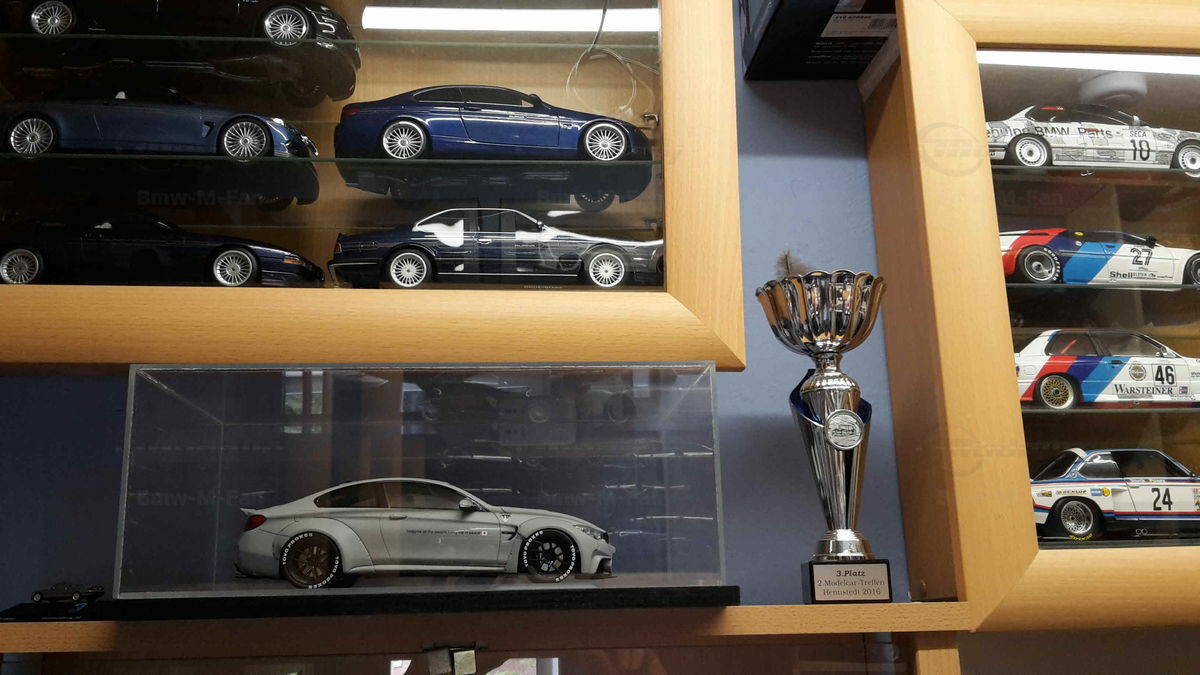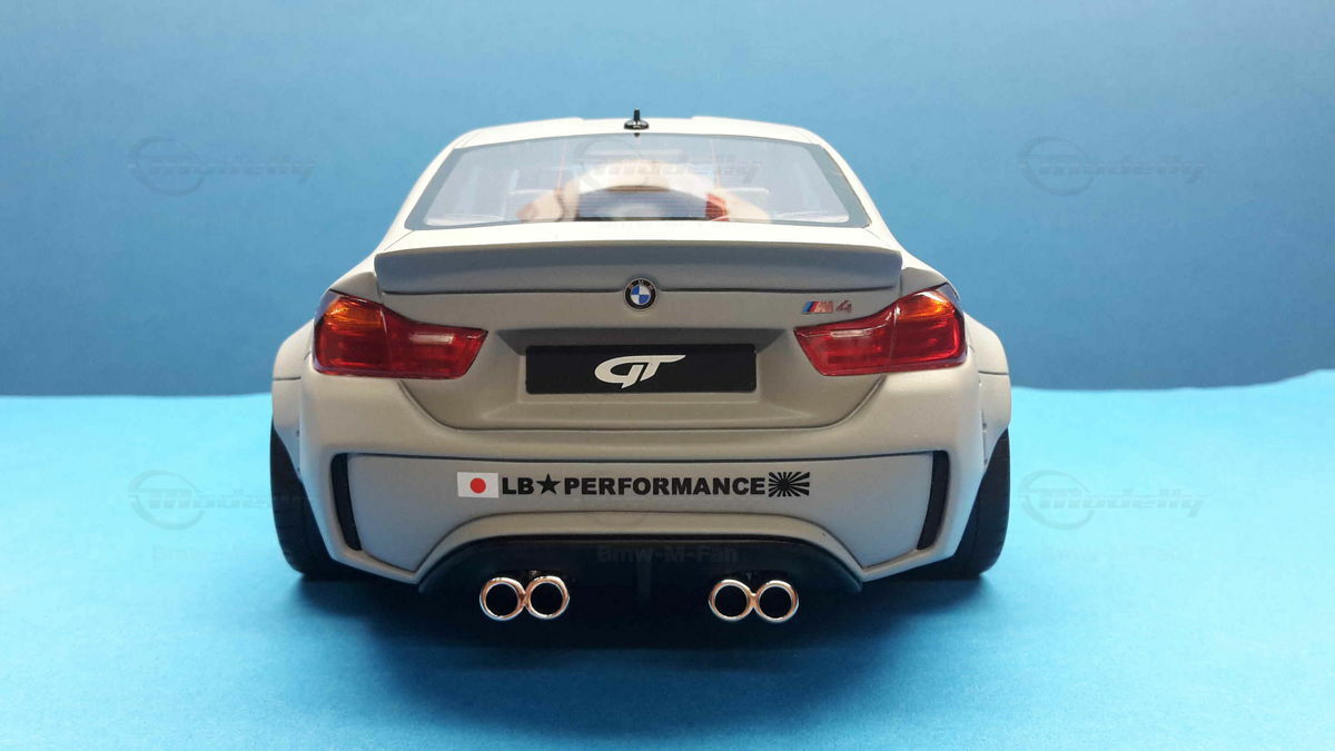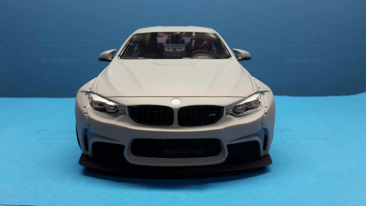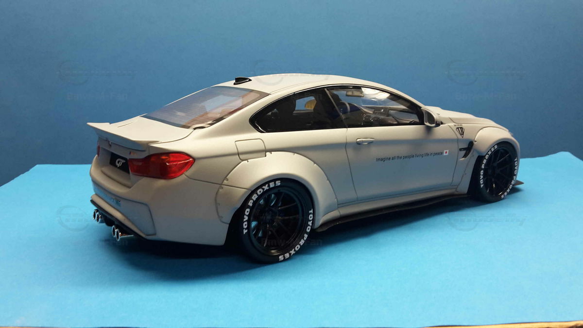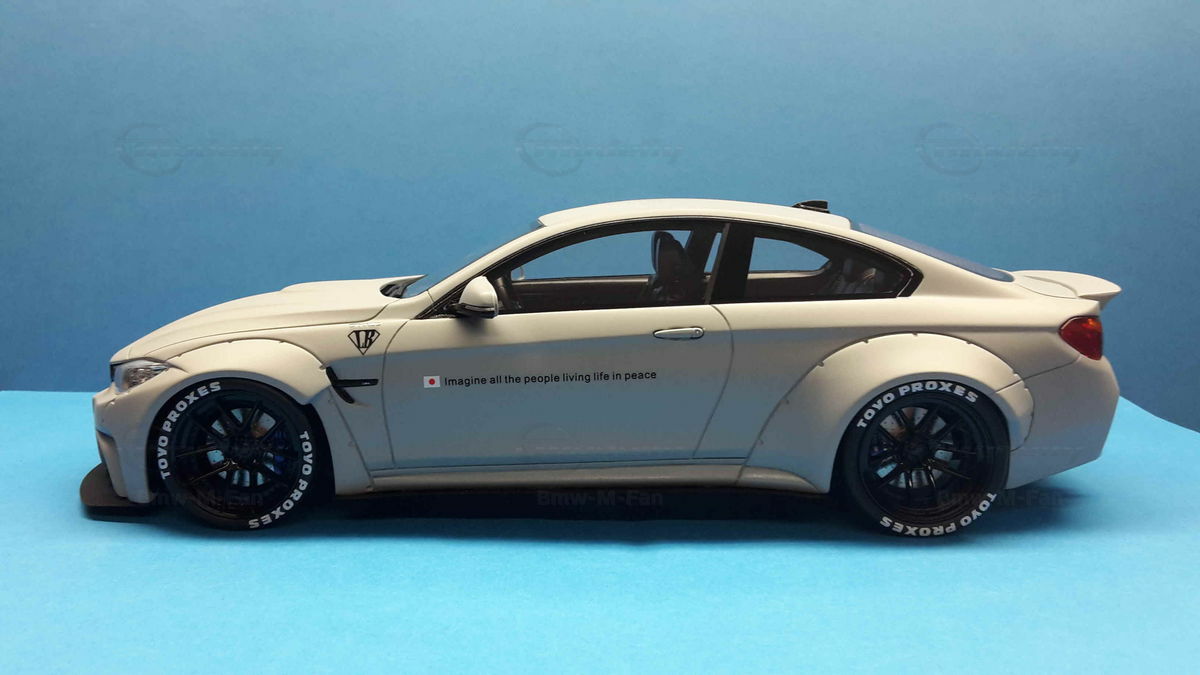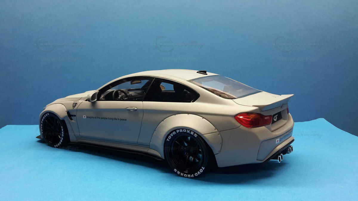 The special design of the miniature showcased here, belonging to Modelly member "Bmw-M-Fan", has been modified by Liberty Walk. Liberty Walk is a Japanese tuning company founded in 2008, known for its eye-catching widebody kits. These modifications include widened fenders, lowered suspension, and special aerodynamic components. In the photos of the 1/18 scale model, the aggressive stance is clearly visible through the prominently flared wheel arches and the lowering kit. The wheels used are from Liberty Walk, identified by the specially designed Toyo Proxes tires.