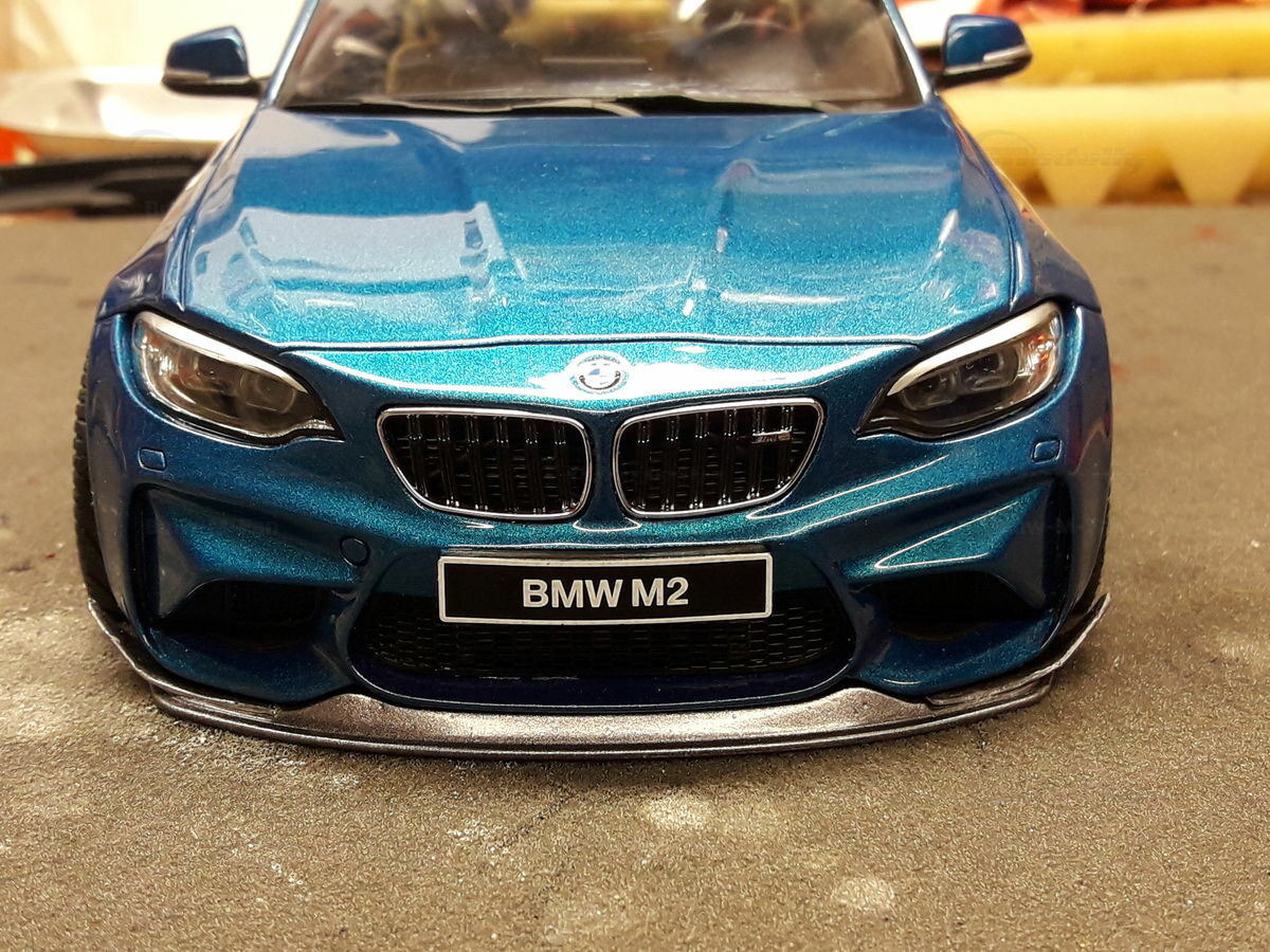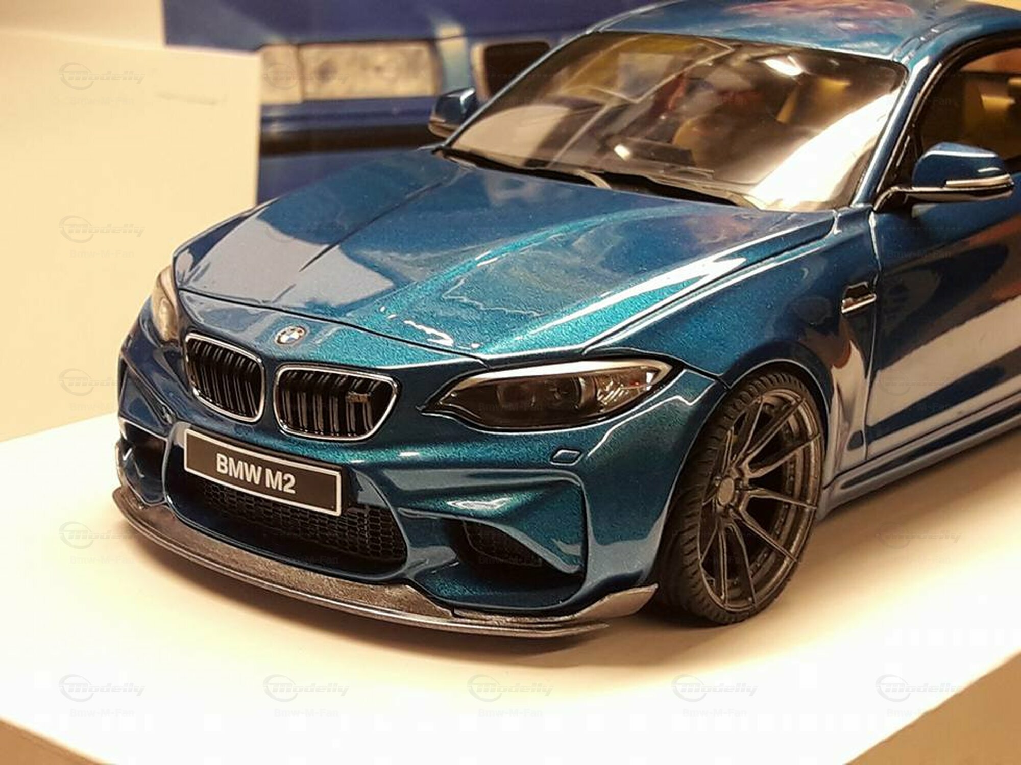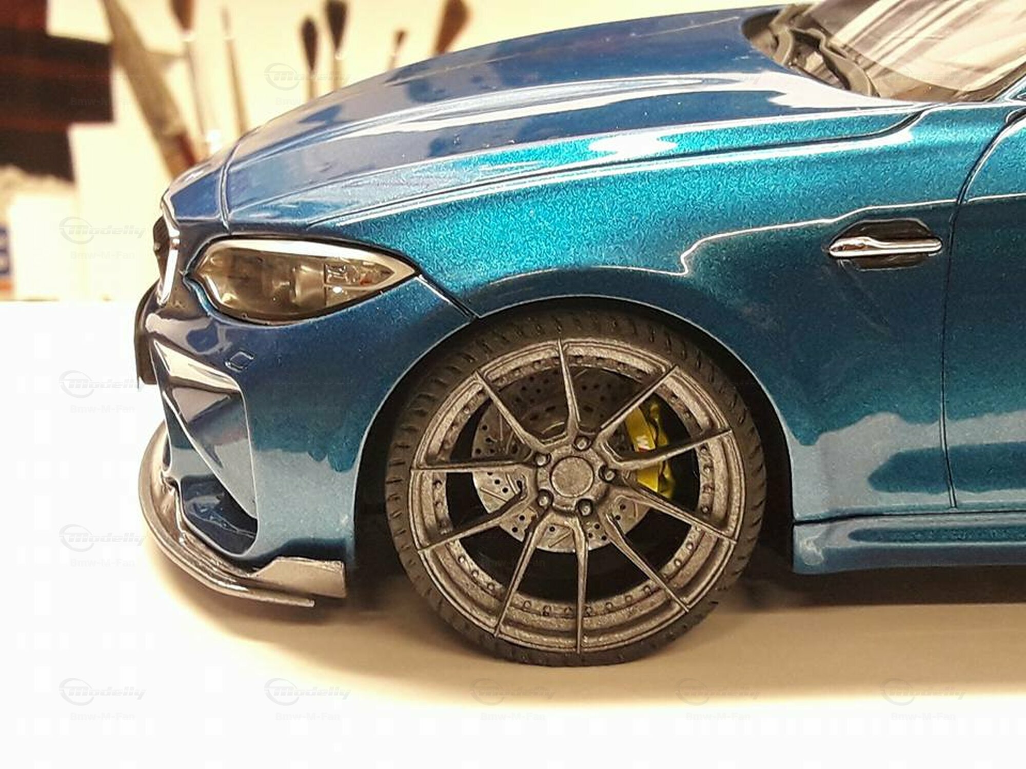 The model has been customized and showcases specific enhancements that were added during modification. It features individually designed rims, which may come from a specialized manufacturer. In the photos, the rims are compared to the original wheels, indicating a customization by the collector. The interior has been artfully replicated, including detailed seats and a realistic dashboard. The vehicle has been painted in a striking blue shade that reflects the unique lines and sporty character of the M2. The paintwork is flawless, standing out for its precision in modeling.