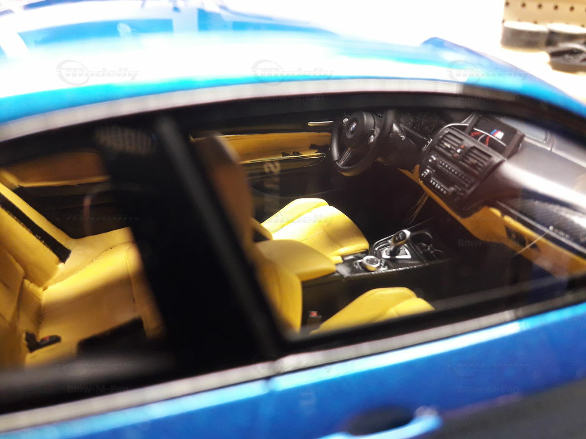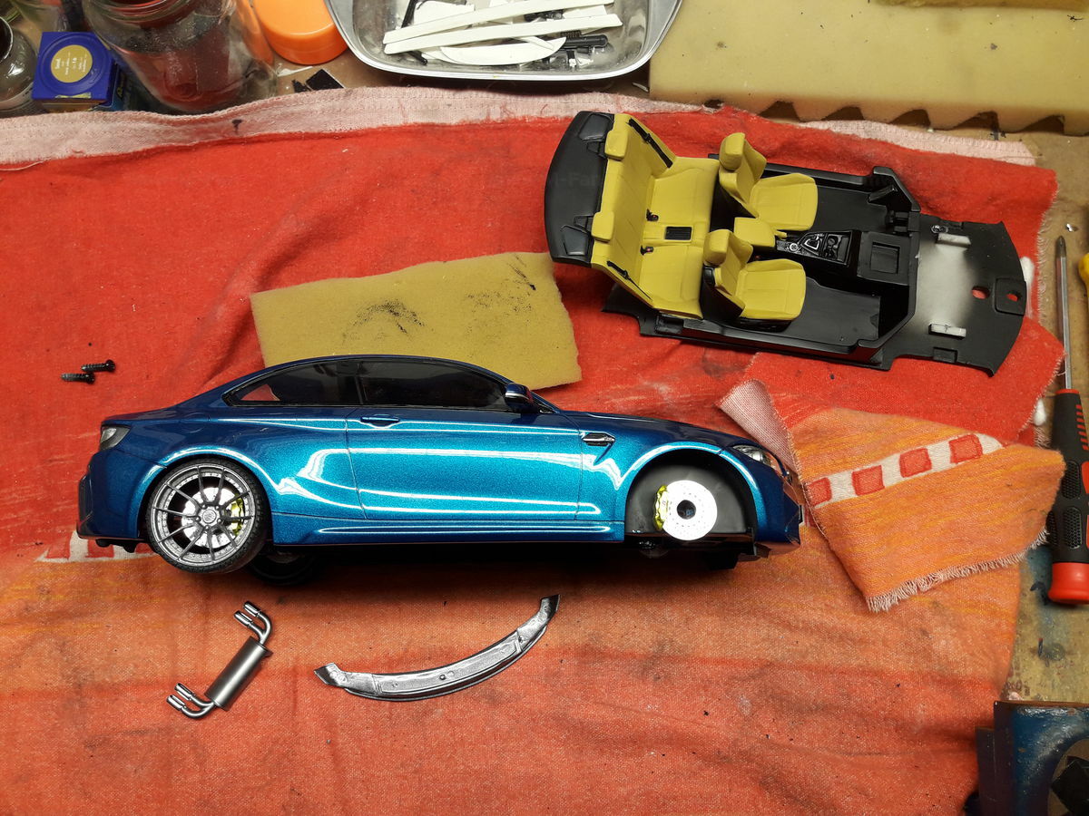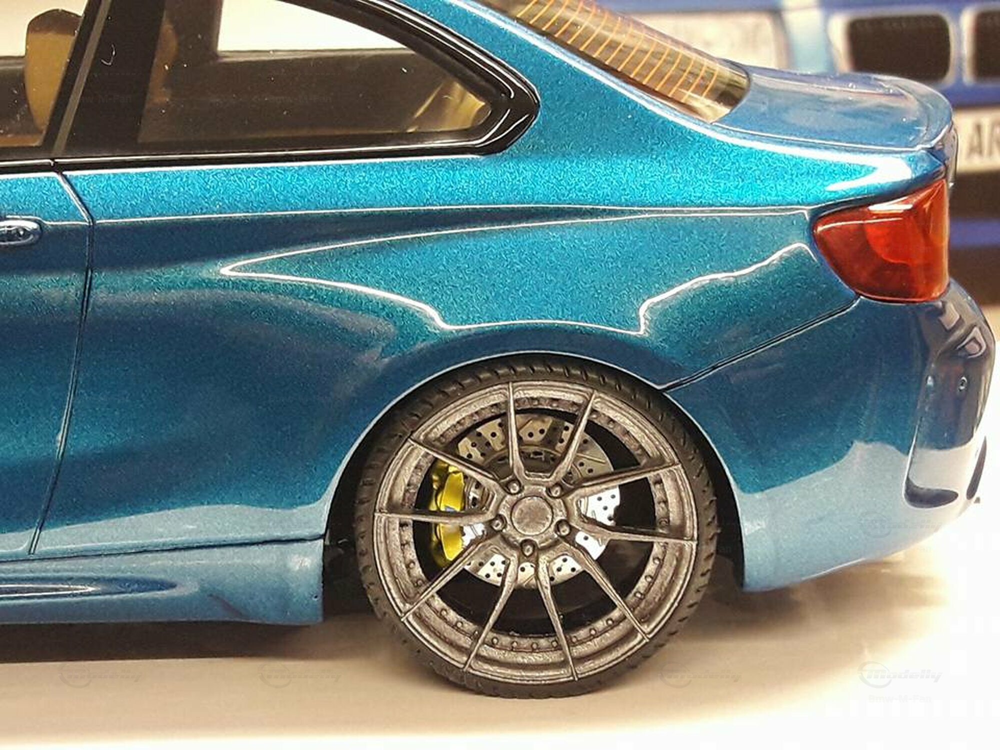 The model has been customized and showcases specific enhancements that were added during modification. It features individually designed rims, which may come from a specialized manufacturer. In the photos, the rims are compared to the original wheels, indicating a customization by the collector. The interior has been artfully replicated, including detailed seats and a realistic dashboard. The vehicle has been painted in a striking blue shade that reflects the unique lines and sporty character of the M2. The paintwork is flawless, standing out for its precision in modeling.