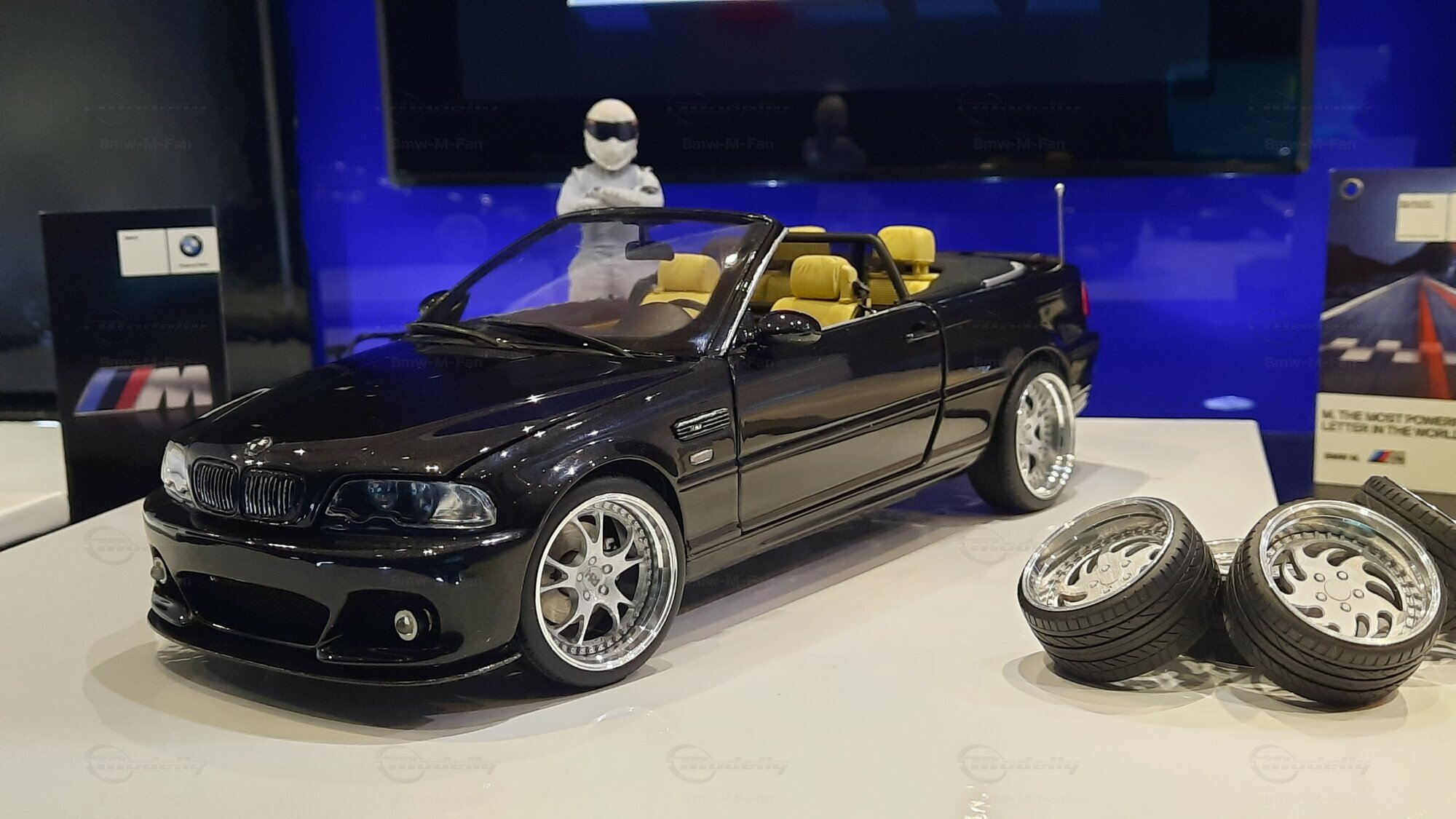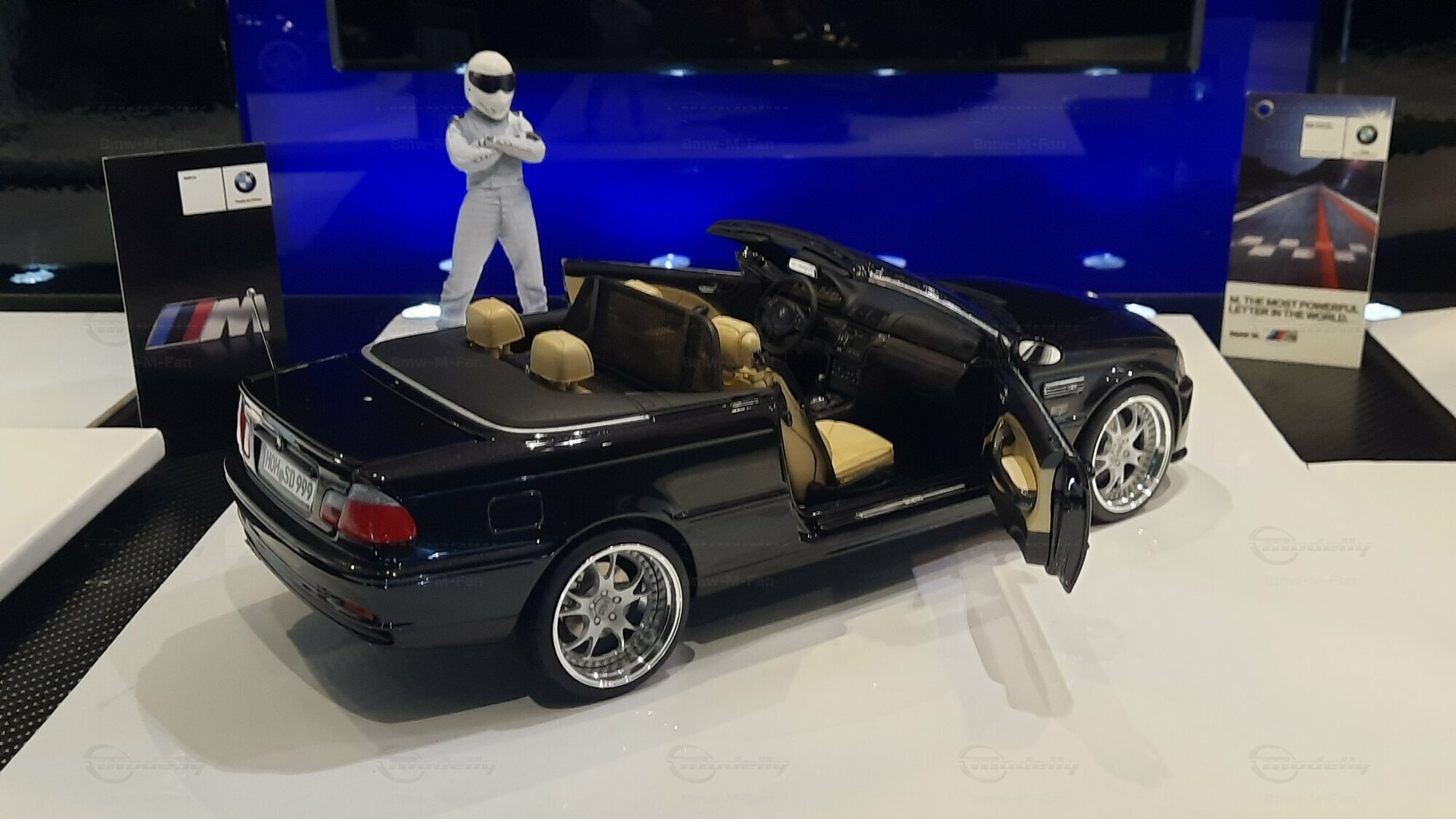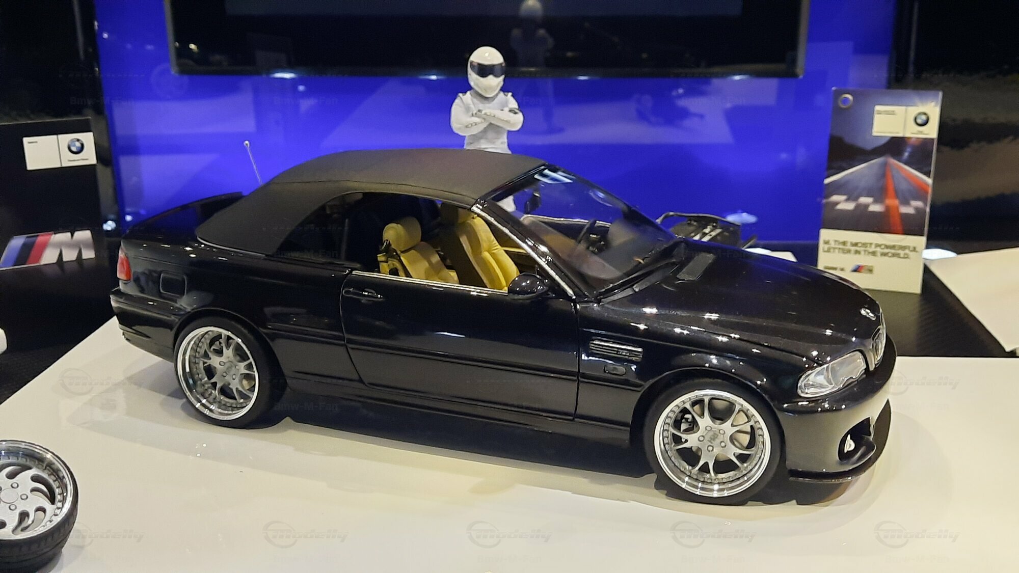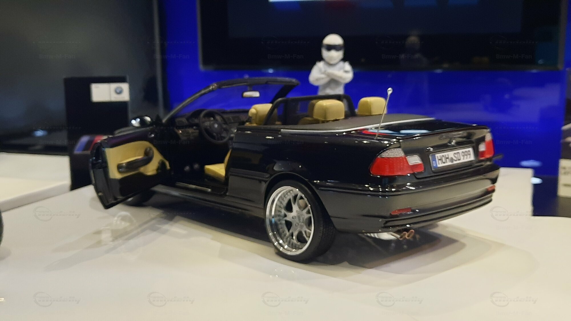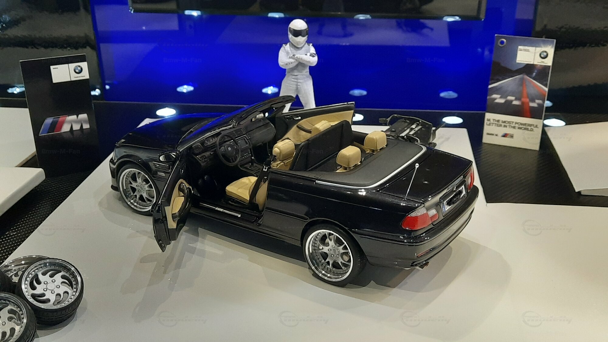 Modelly user "Bmw-M-Fan" proudly showcases this modified model, which stands out for its high level of detail and many true-to-life features. The beige interior stands out and provides a contrast to the black exterior. Even the smallest details like the functional doors, hood latch, and realistically replicated light fixtures are faithfully reproduced. An interesting detail is the wheels, depicted as detachable, which is a rarity in the model world. Overall, this model car is a highlight for any collector and impressively showcases the brilliance of the Kyosho workshop, without neglecting the many individual modifications and special features.