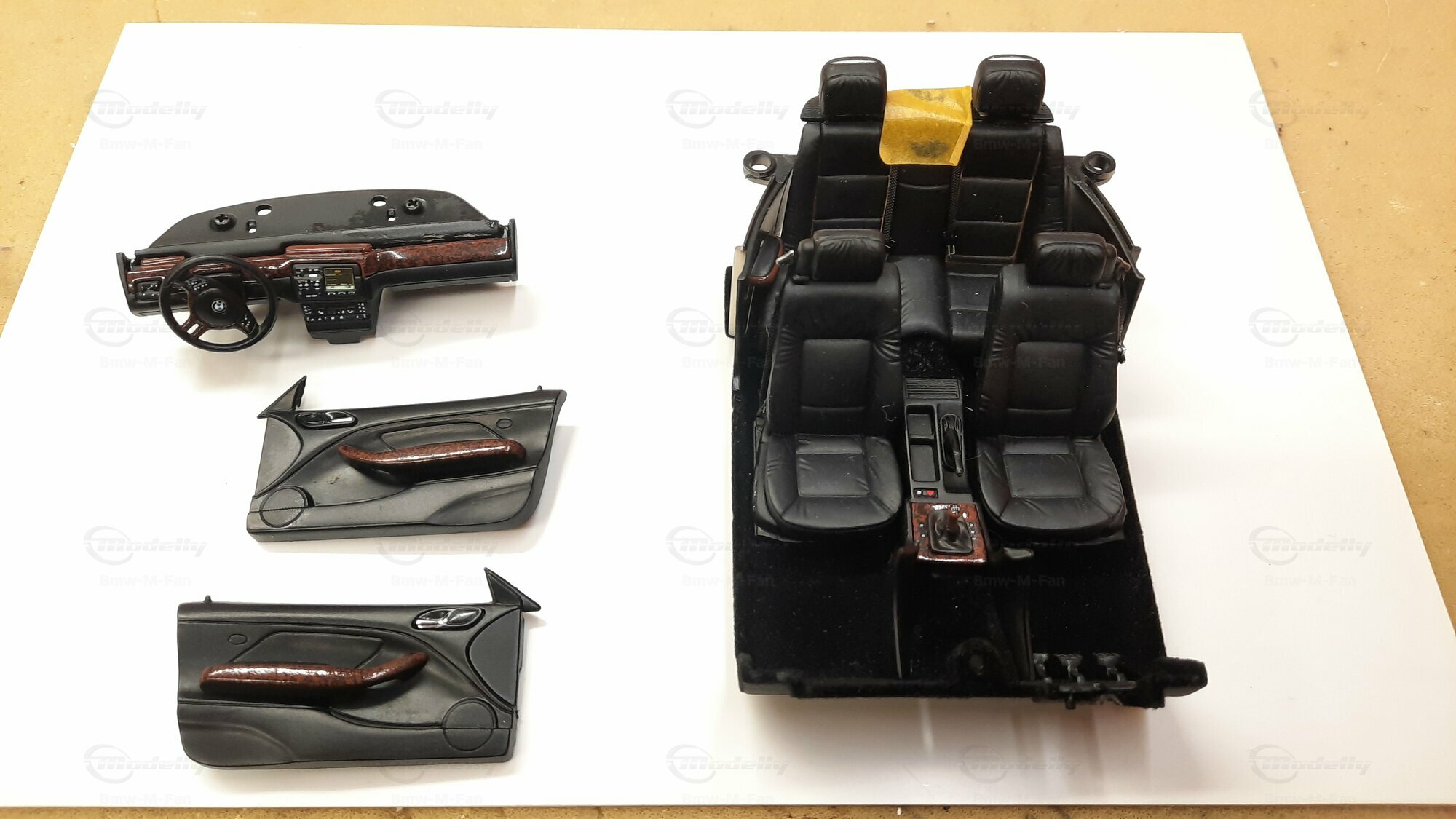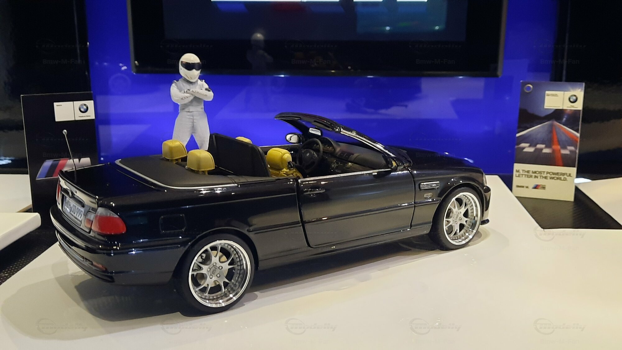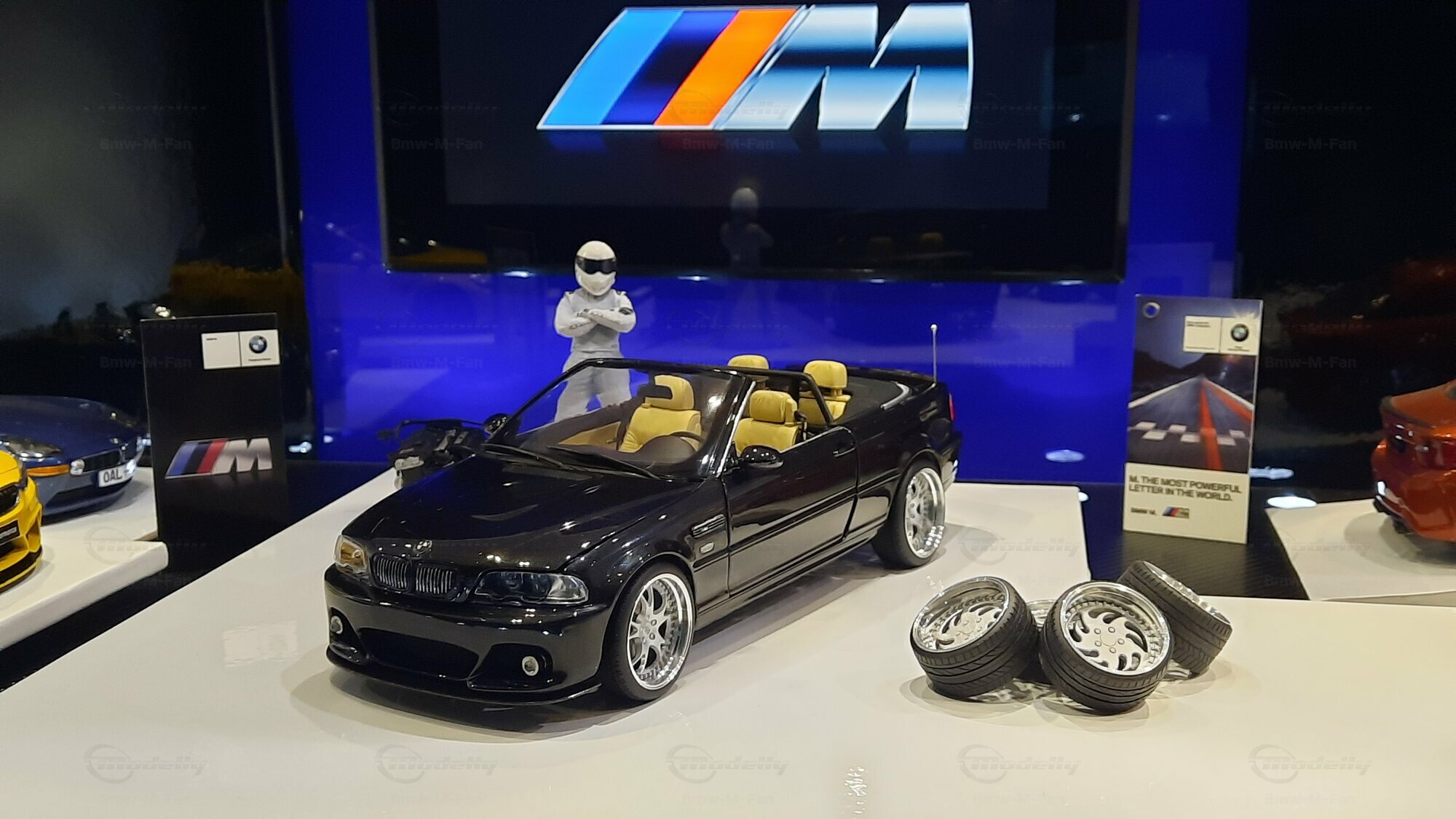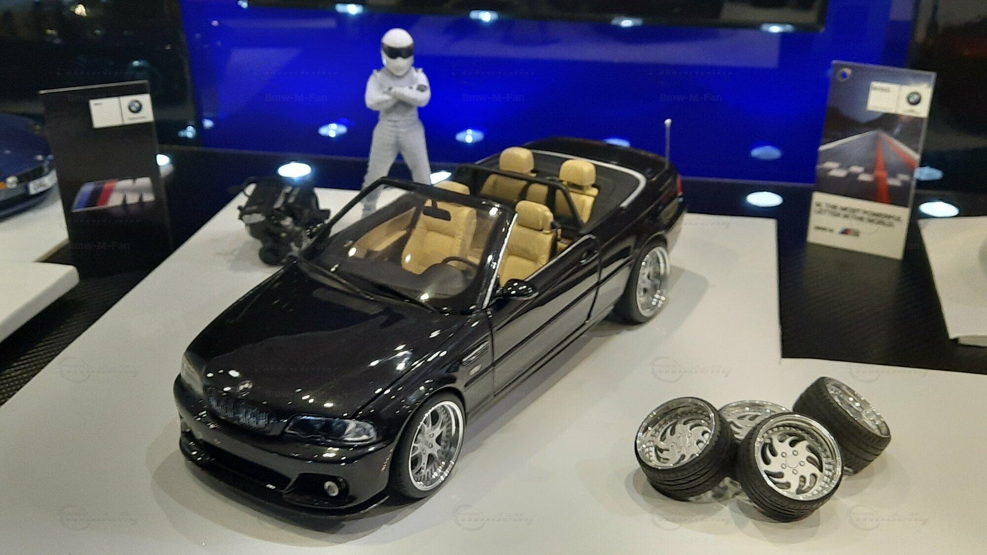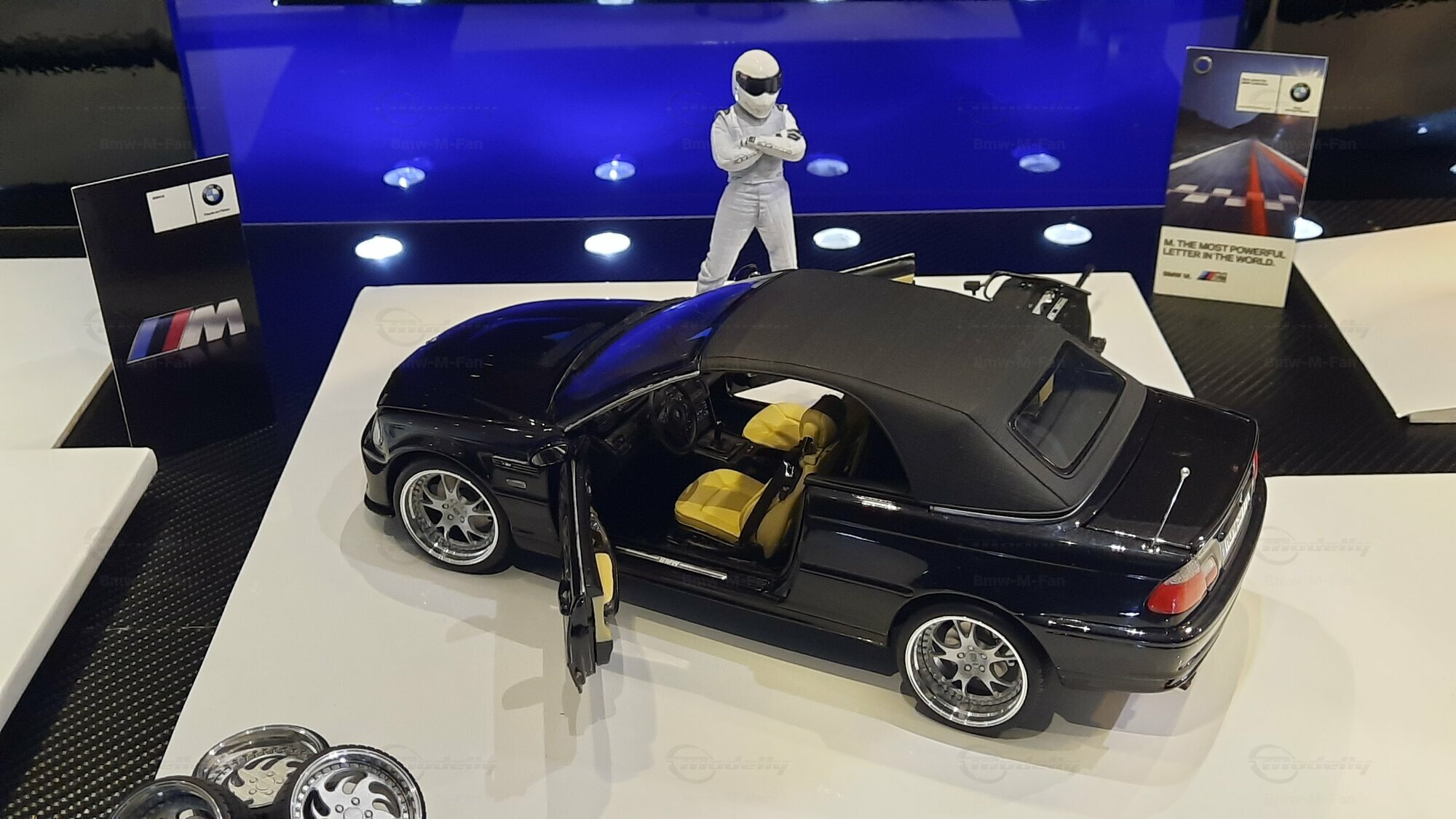Modelly user "Bmw-M-Fan" proudly showcases this modified model, which stands out for its high level of detail and many true-to-life features. The beige interior stands out and provides a contrast to the black exterior. Even the smallest details like the functional doors, hood latch, and realistically replicated light fixtures are faithfully reproduced. An interesting detail is the wheels, depicted as detachable, which is a rarity in the model world. Overall, this model car is a highlight for any collector and impressively showcases the brilliance of the Kyosho workshop, without neglecting the many individual modifications and special features.