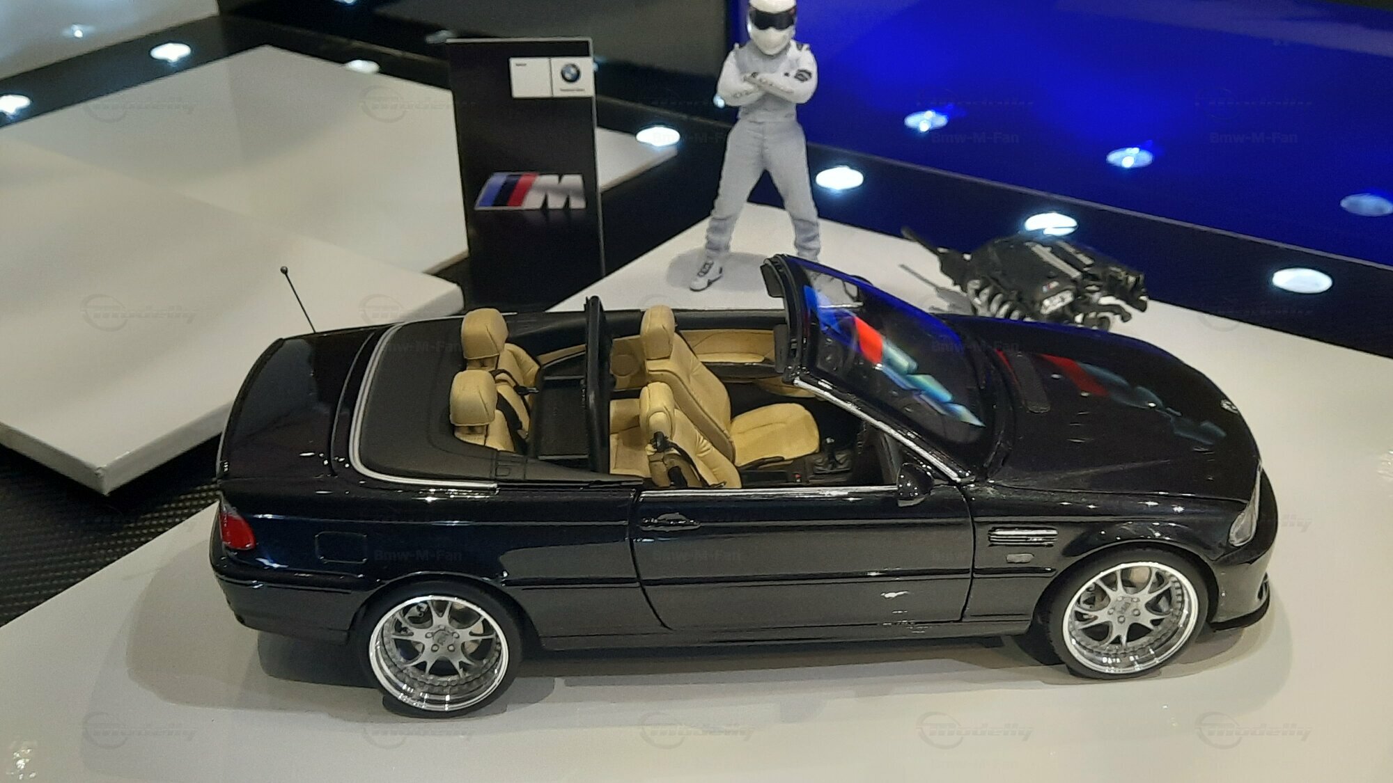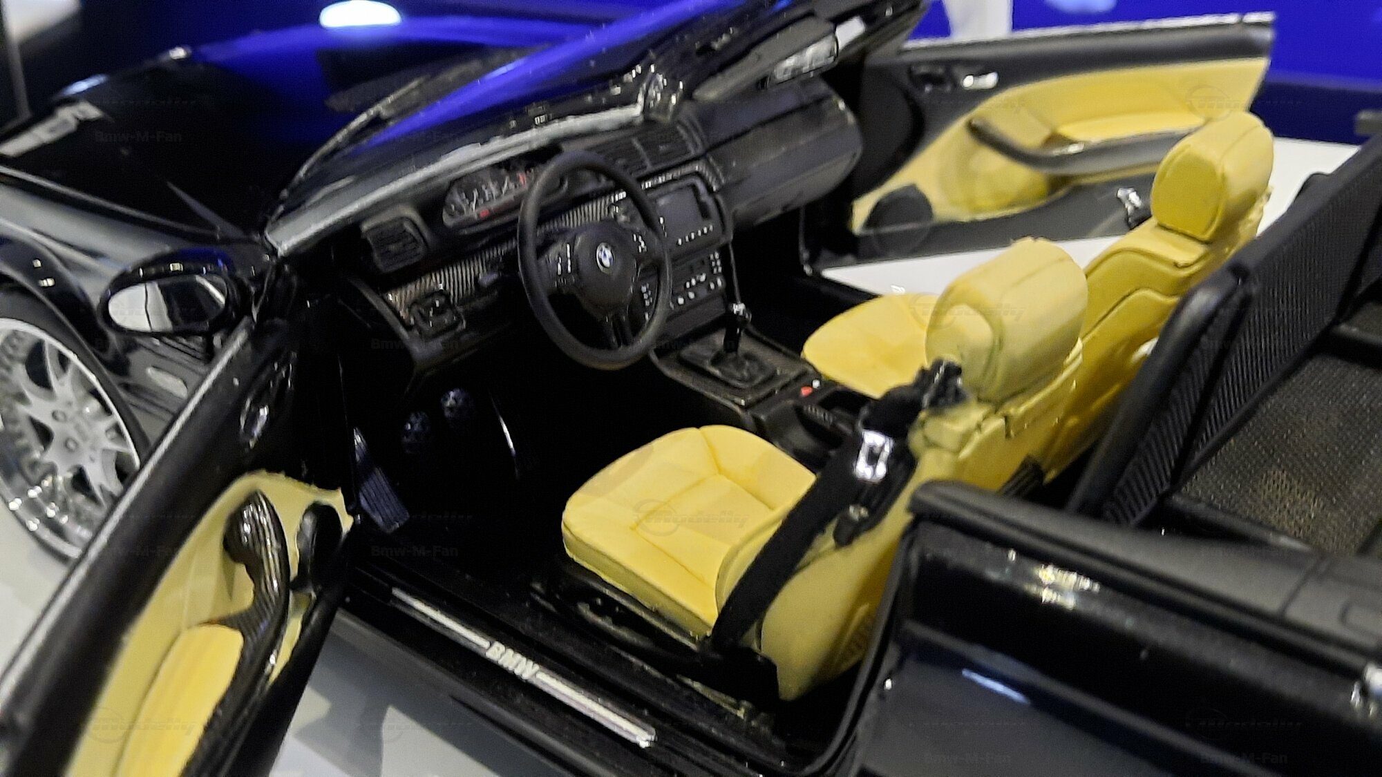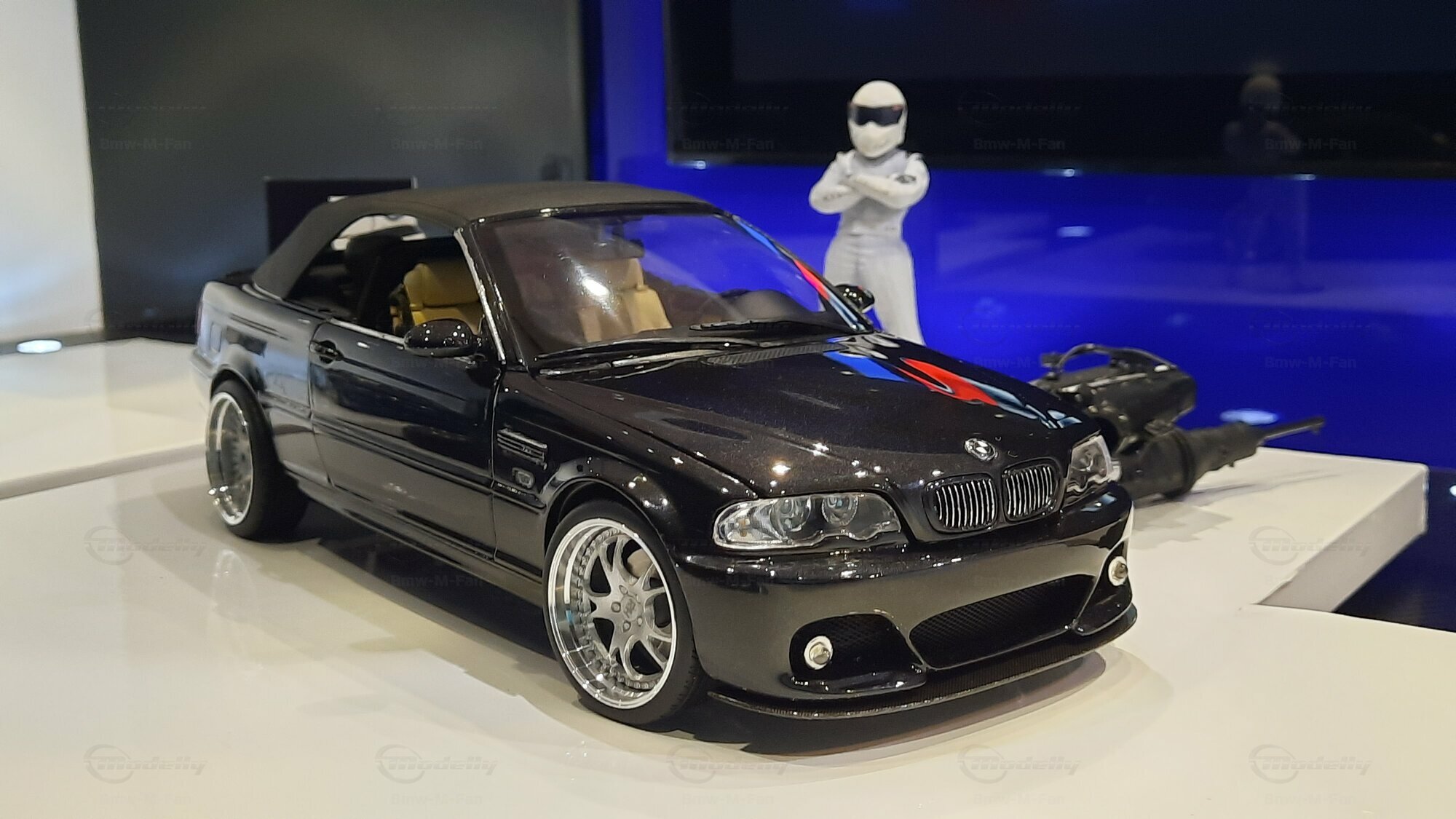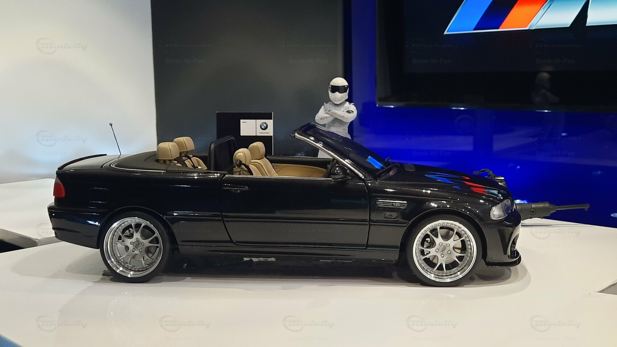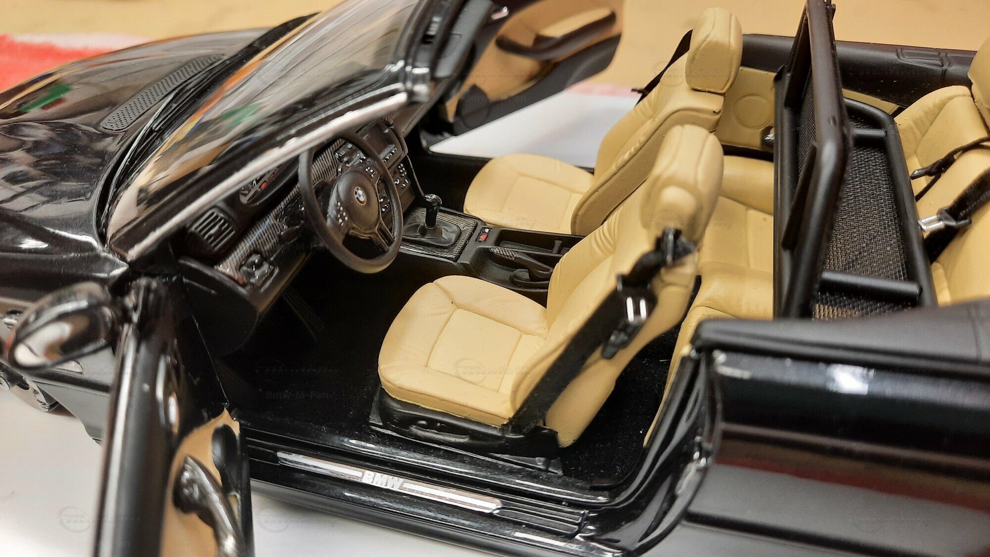 The model car made in the scale of 1/18 is crafted from Diecast material, ensuring high strength and detail accuracy. This particular model is modified, evident from the visible changes like the specific rims. The rims are from BBS and are the LM model, known for its sporty look and high quality. The model car's paint job is a deep black, creating an elegant contrast with the beige interior. The M-stripe decal on the hood is particularly striking, hinting at its sporty lineage. Details and decals in the photos, like the BMW emblem and the M logo, further reinforce this sporty impression.