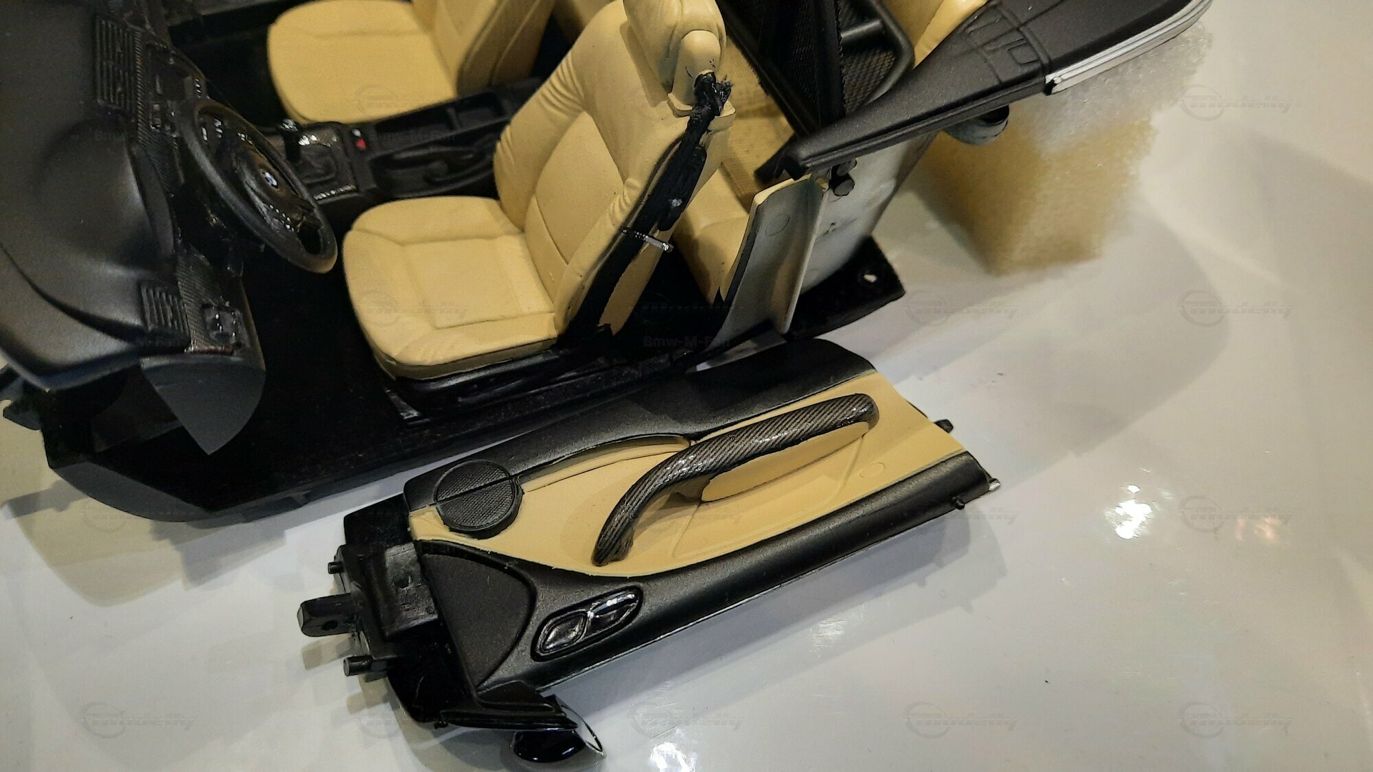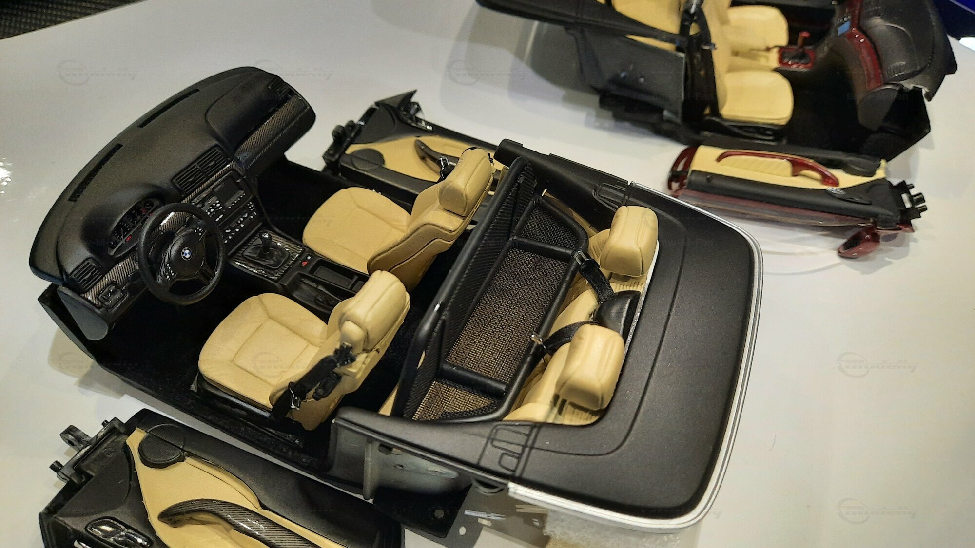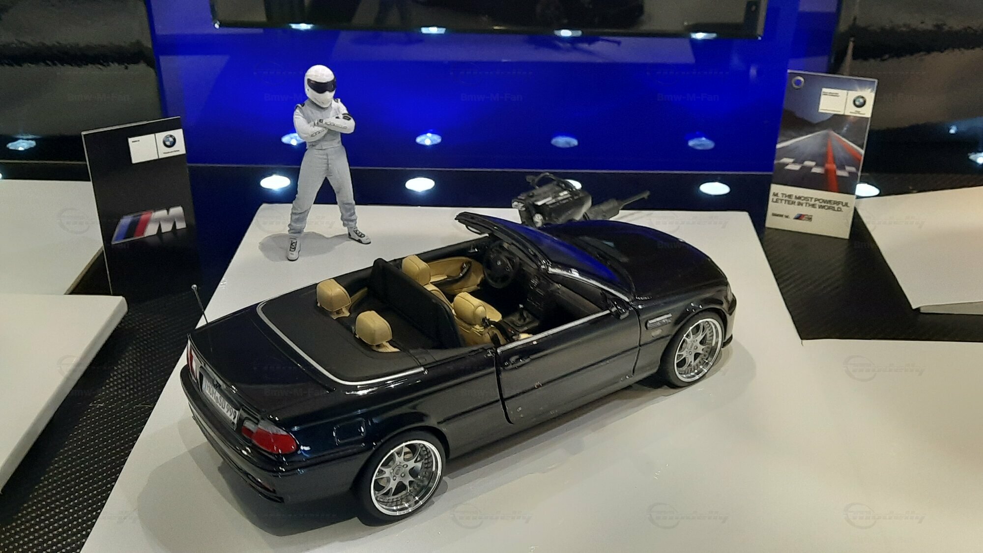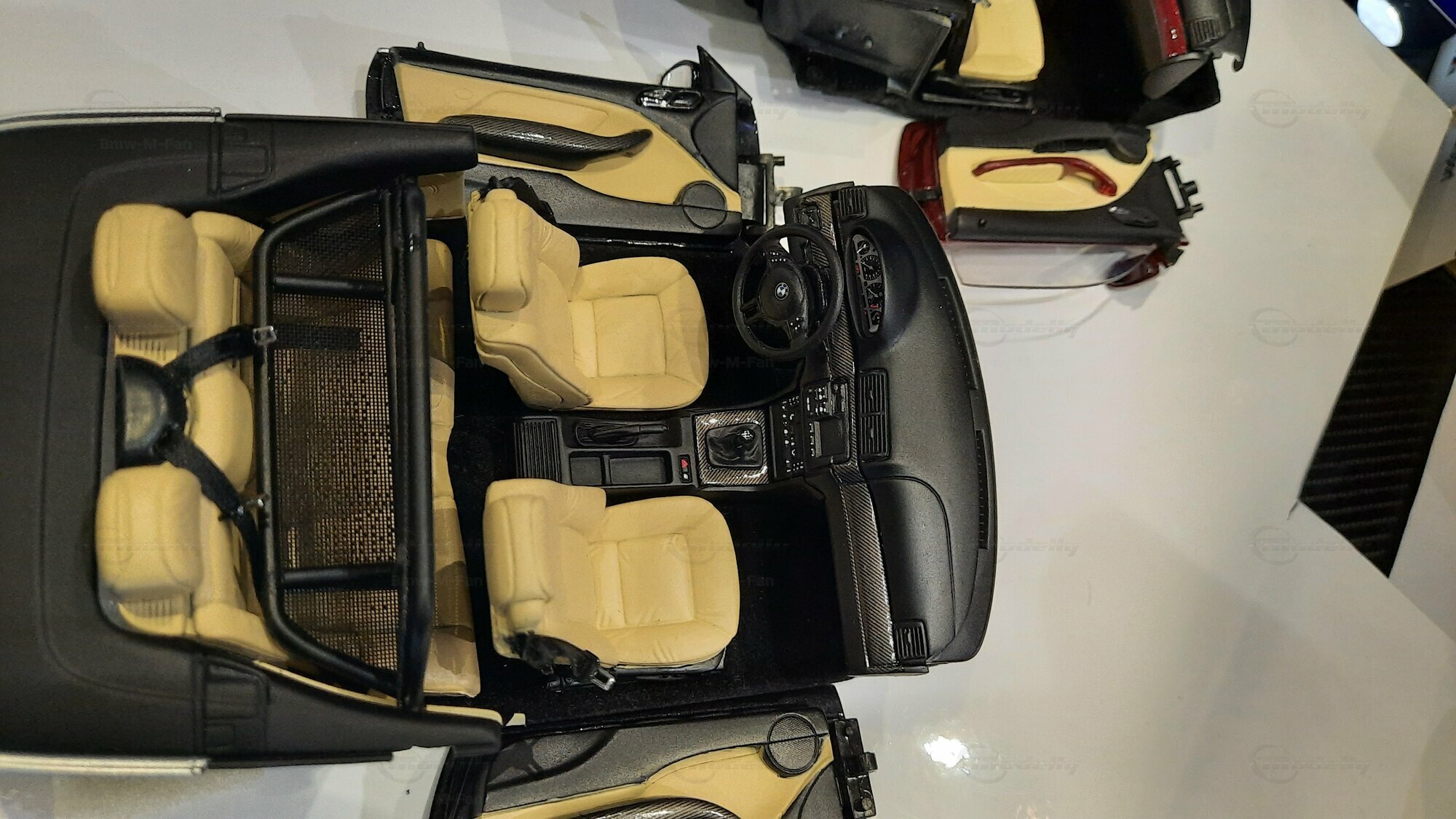 The model car made in the scale of 1/18 is crafted from Diecast material, ensuring high strength and detail accuracy. This particular model is modified, evident from the visible changes like the specific rims. The rims are from BBS and are the LM model, known for its sporty look and high quality. The model car's paint job is a deep black, creating an elegant contrast with the beige interior. The M-stripe decal on the hood is particularly striking, hinting at its sporty lineage. Details and decals in the photos, like the BMW emblem and the M logo, further reinforce this sporty impression.