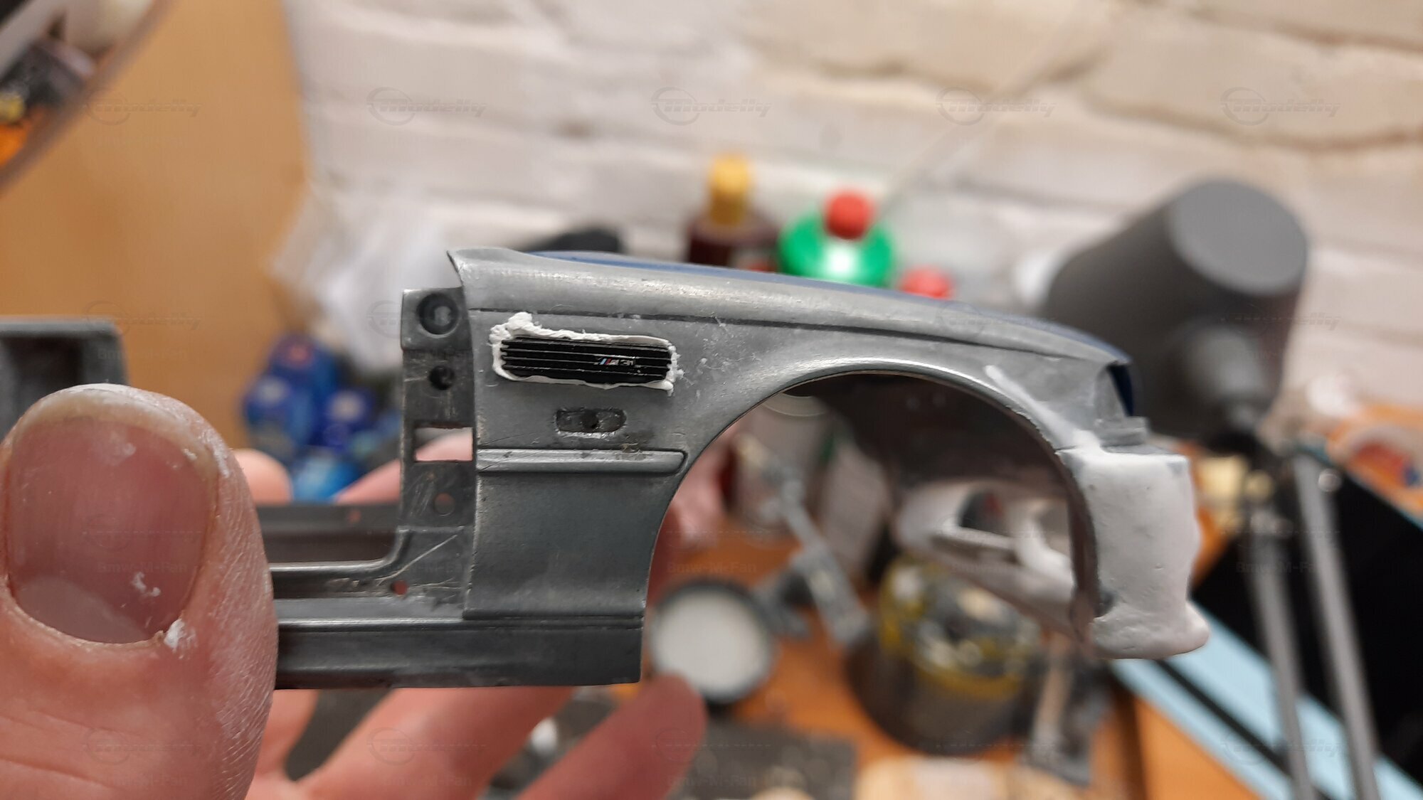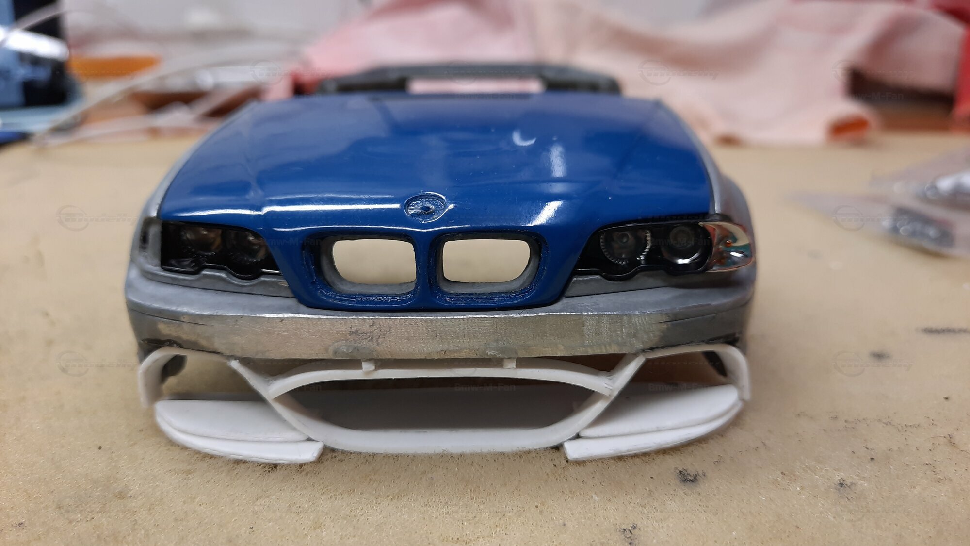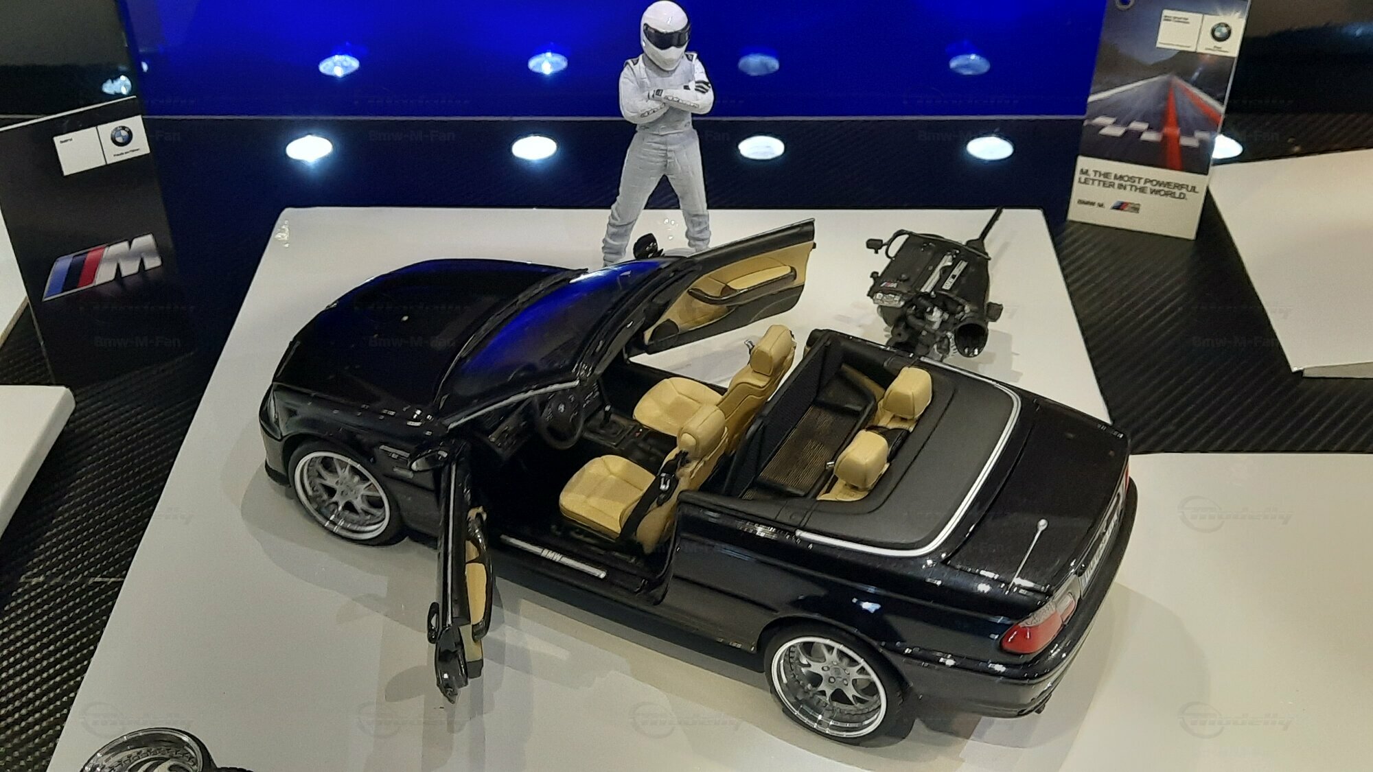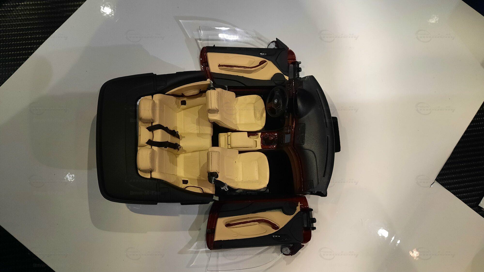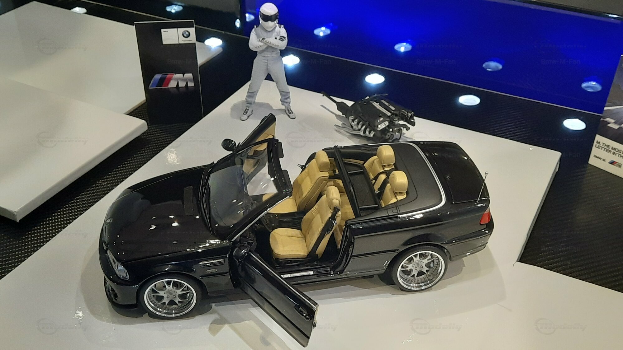 The model car made in the scale of 1/18 is crafted from Diecast material, ensuring high strength and detail accuracy. This particular model is modified, evident from the visible changes like the specific rims. The rims are from BBS and are the LM model, known for its sporty look and high quality. The model car's paint job is a deep black, creating an elegant contrast with the beige interior. The M-stripe decal on the hood is particularly striking, hinting at its sporty lineage. Details and decals in the photos, like the BMW emblem and the M logo, further reinforce this sporty impression.
