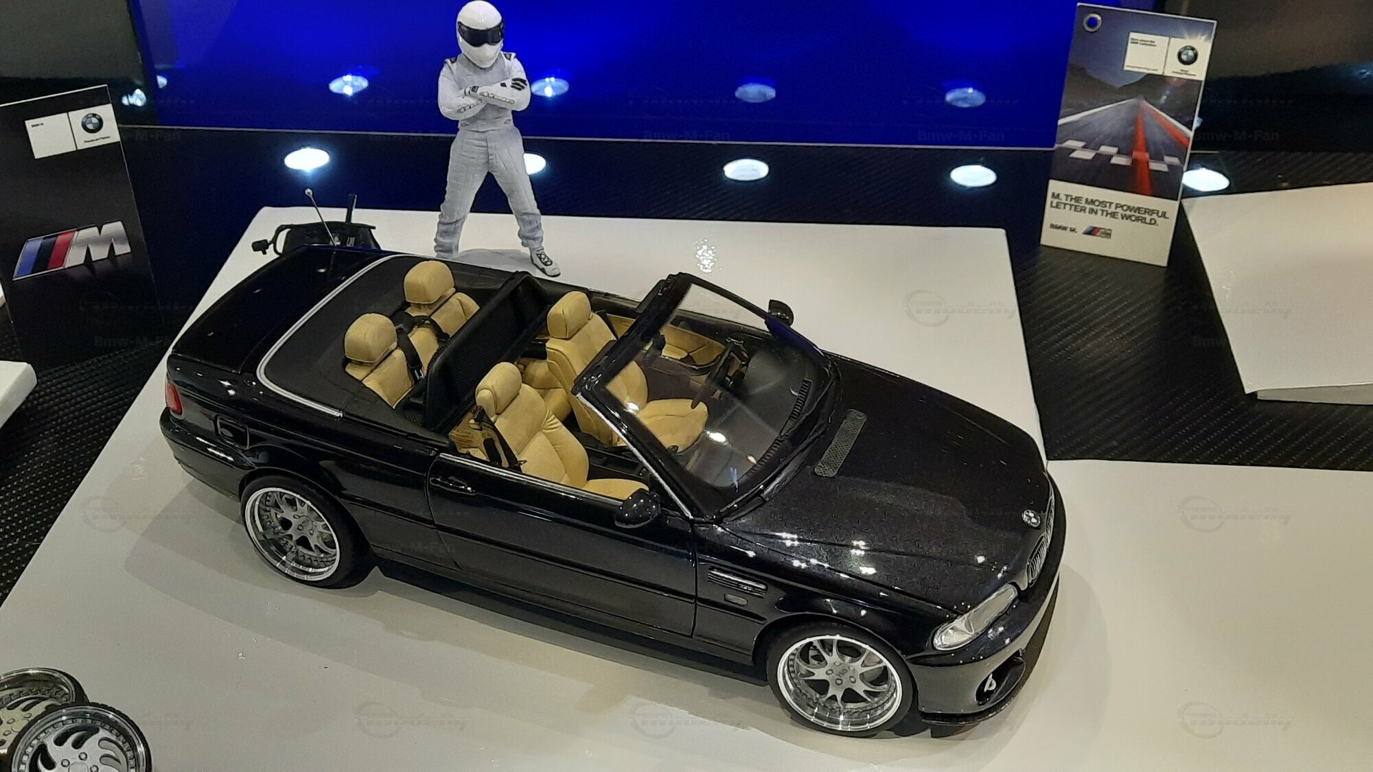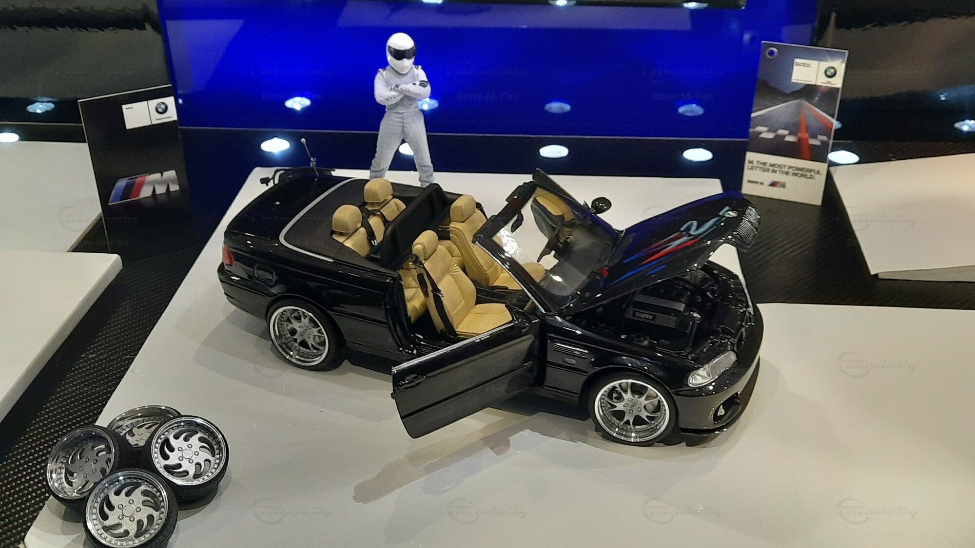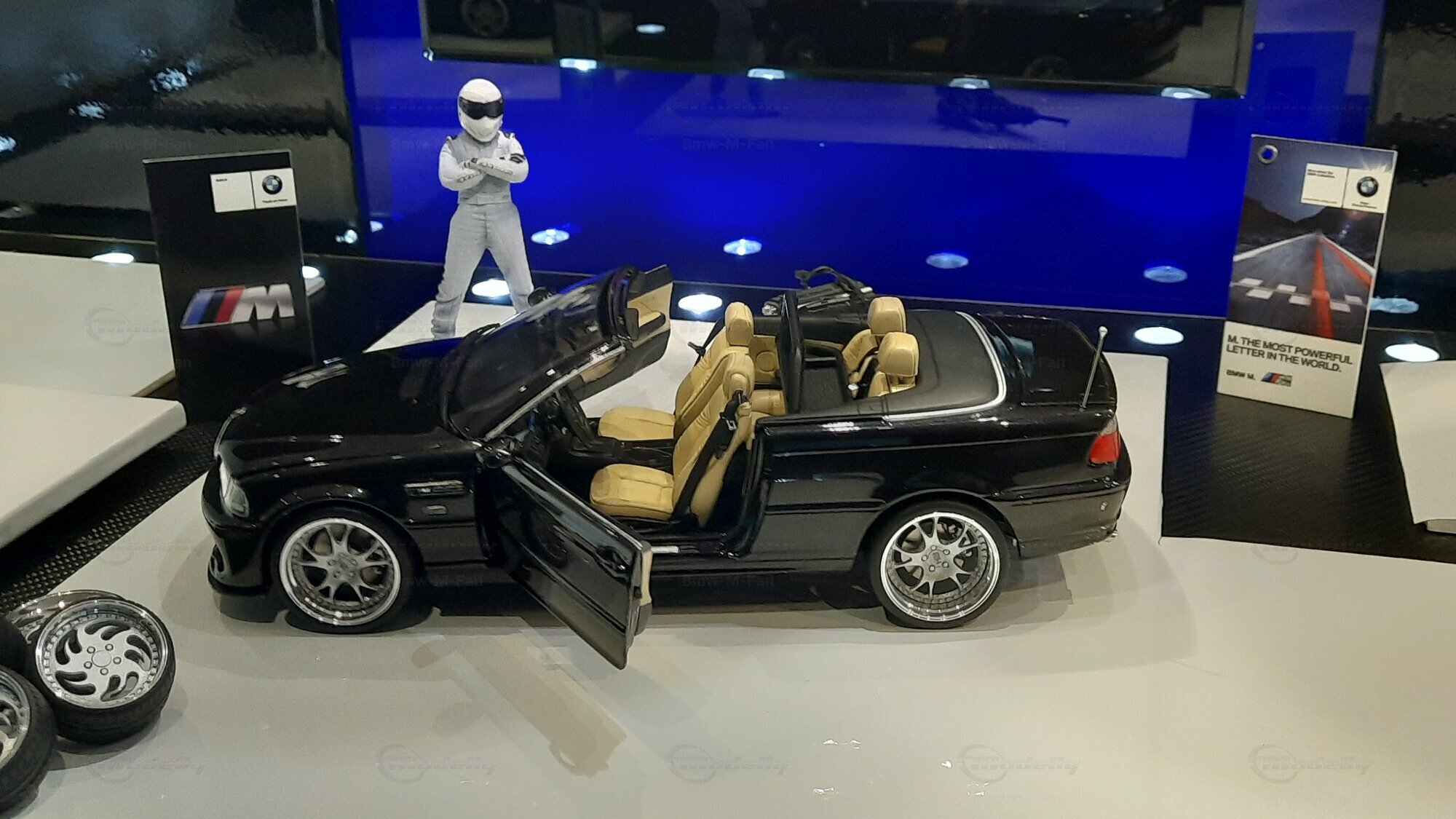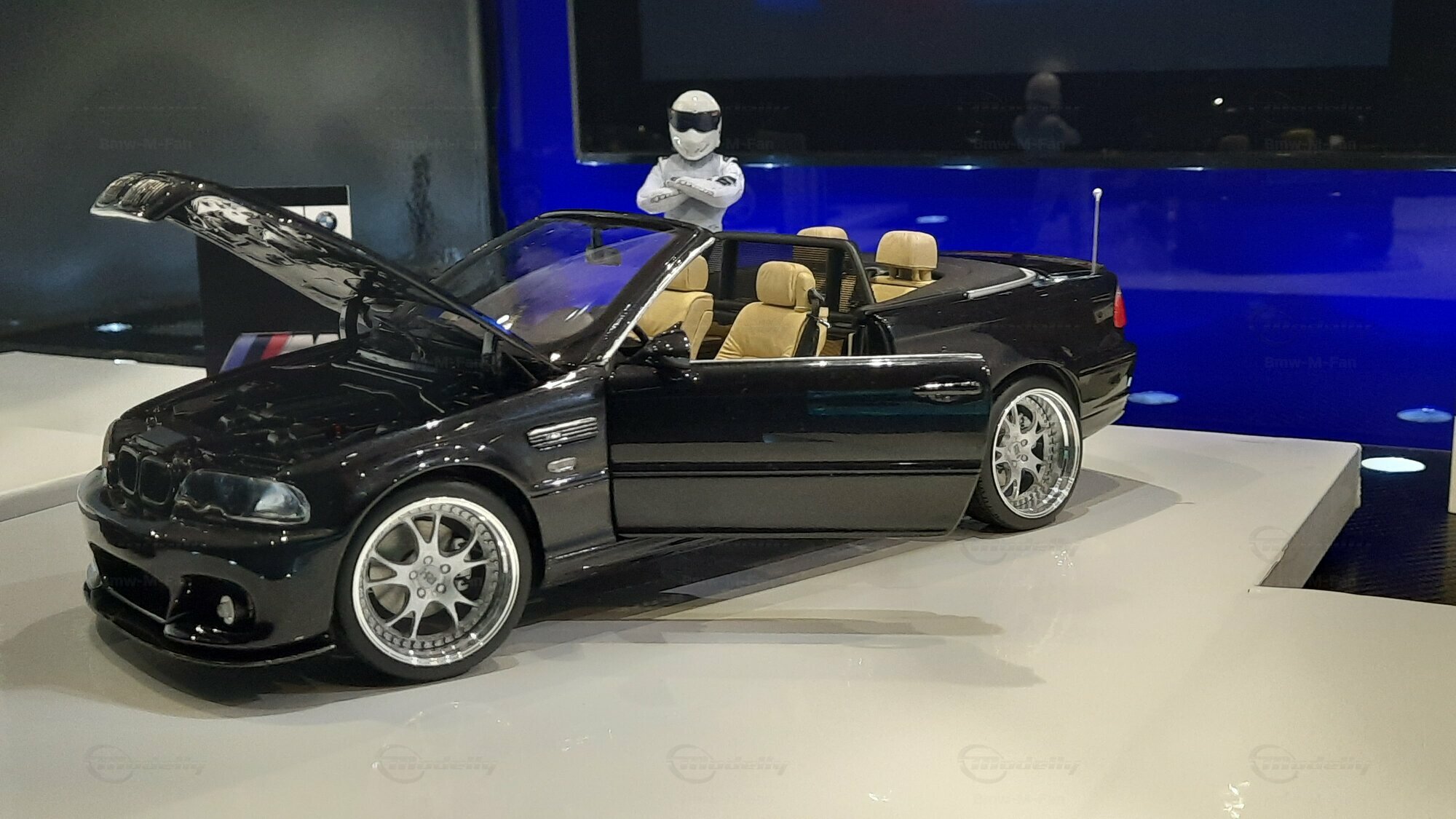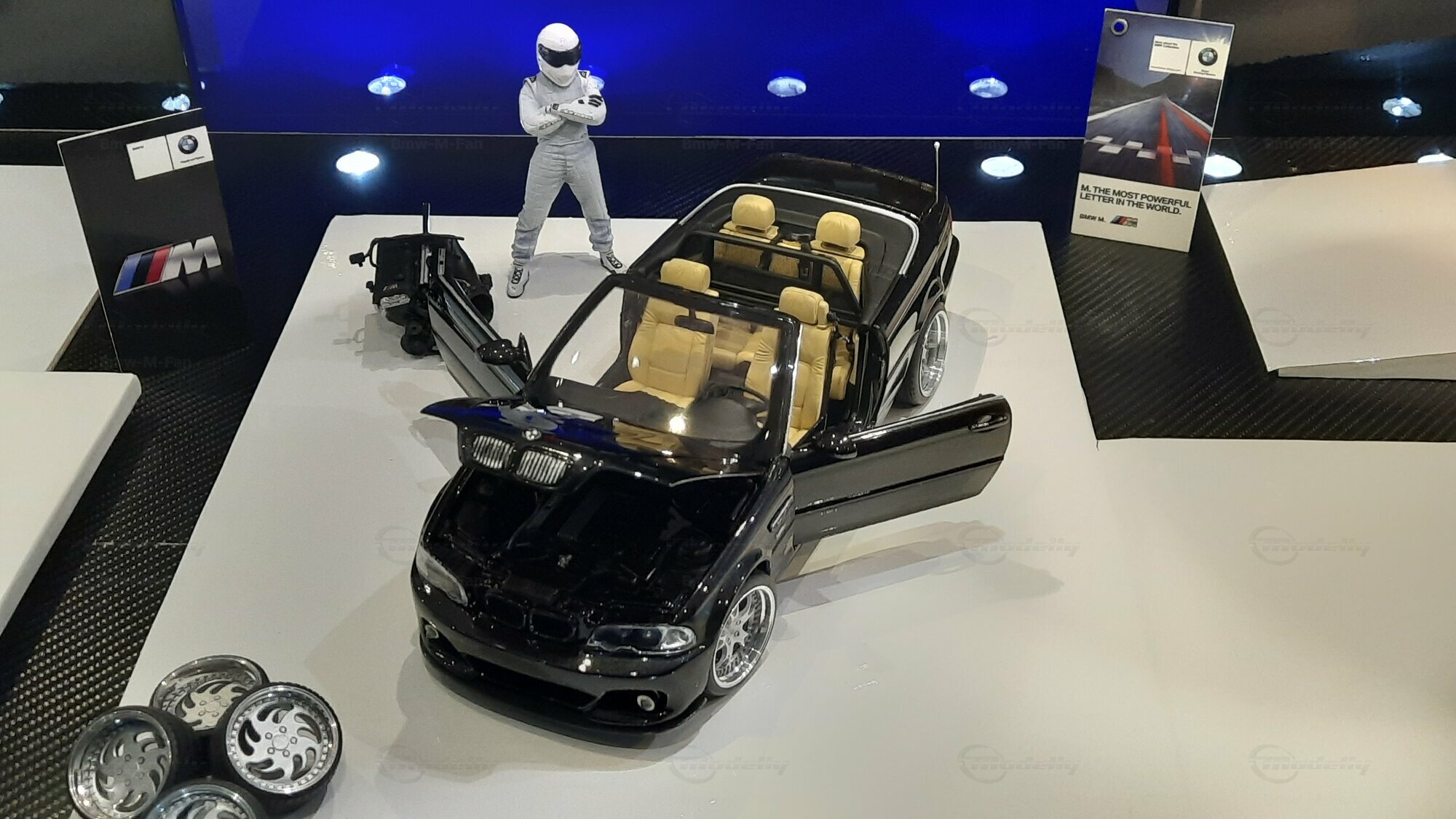 Modelly user "Bmw-M-Fan" proudly showcases this modified model, which stands out for its high level of detail and many true-to-life features. The beige interior stands out and provides a contrast to the black exterior. Even the smallest details like the functional doors, hood latch, and realistically replicated light fixtures are faithfully reproduced. An interesting detail is the wheels, depicted as detachable, which is a rarity in the model world. Overall, this model car is a highlight for any collector and impressively showcases the brilliance of the Kyosho workshop, without neglecting the many individual modifications and special features.