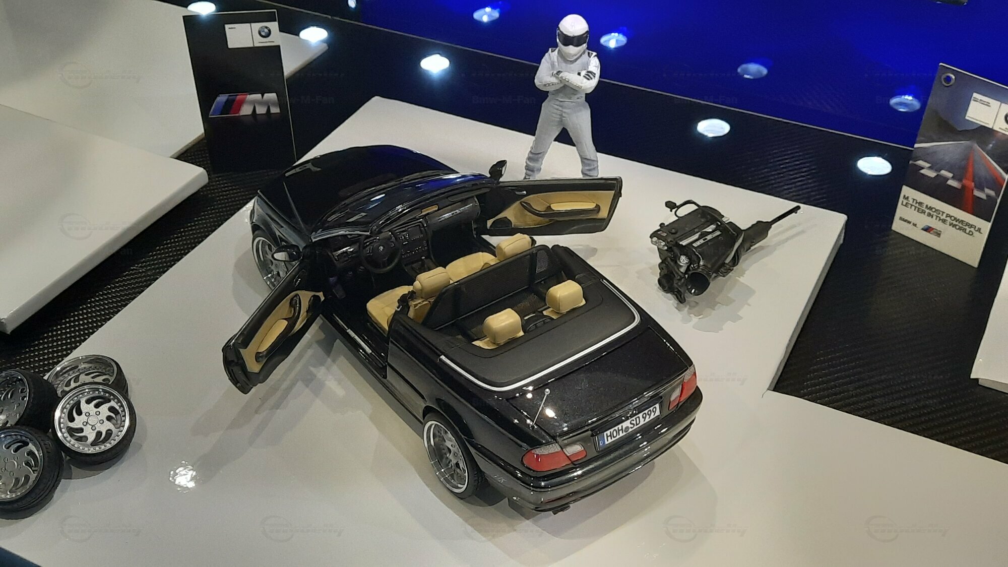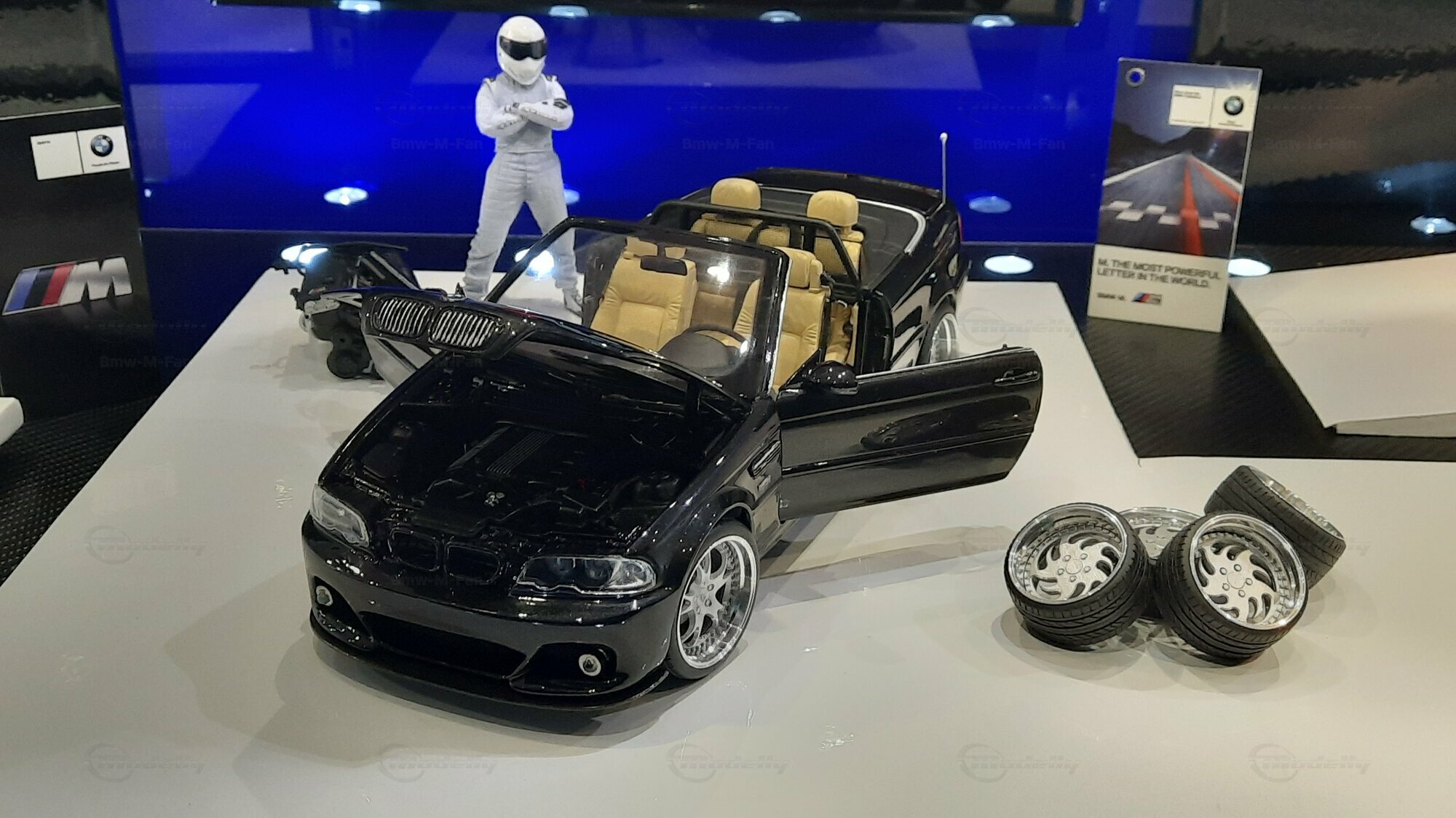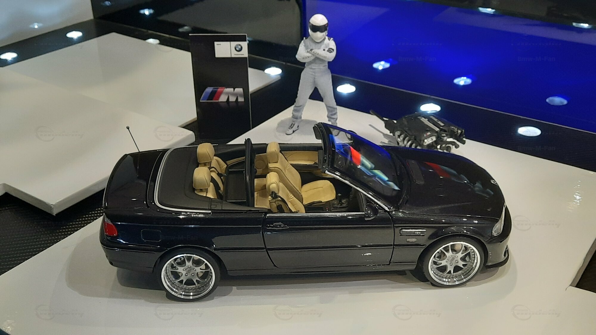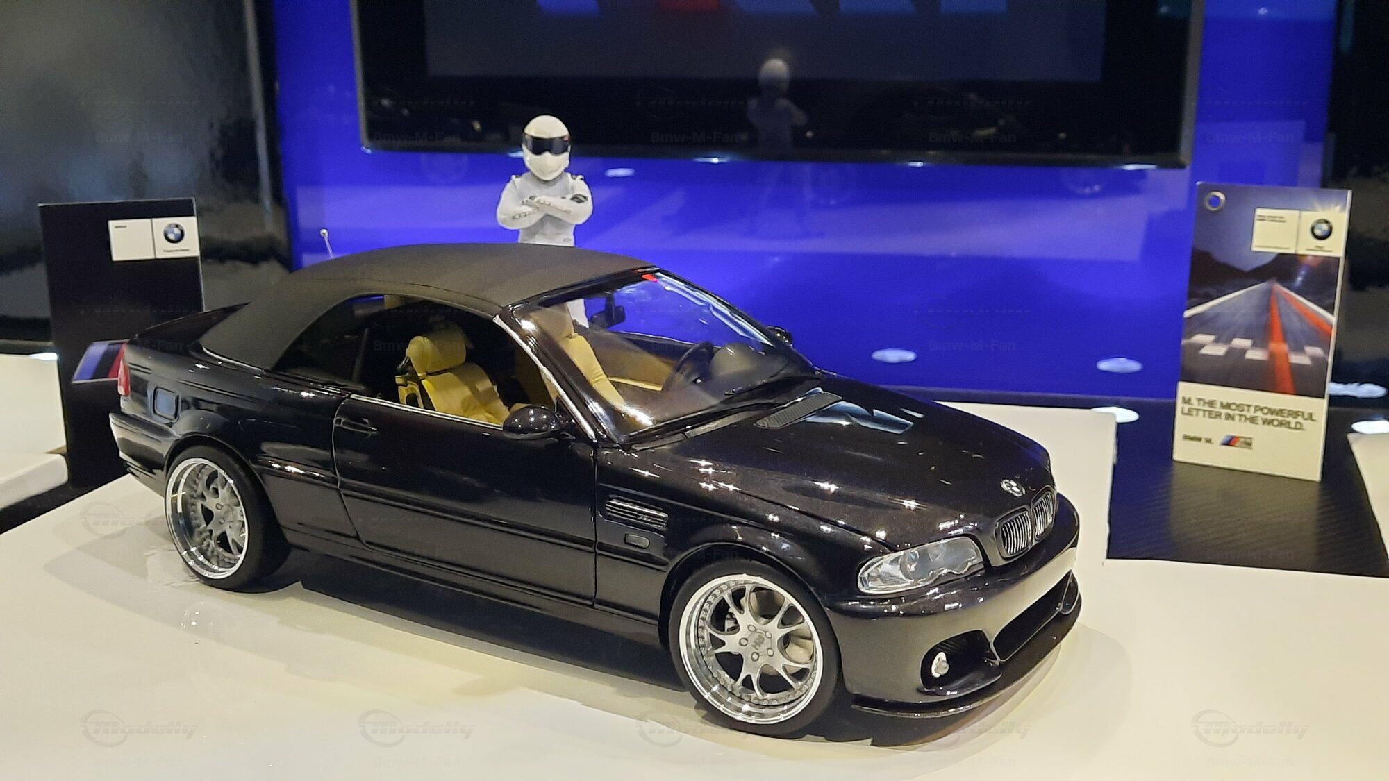 Modelly user "Bmw-M-Fan" proudly showcases this modified model, which stands out for its high level of detail and many true-to-life features. The beige interior stands out and provides a contrast to the black exterior. Even the smallest details like the functional doors, hood latch, and realistically replicated light fixtures are faithfully reproduced. An interesting detail is the wheels, depicted as detachable, which is a rarity in the model world. Overall, this model car is a highlight for any collector and impressively showcases the brilliance of the Kyosho workshop, without neglecting the many individual modifications and special features.