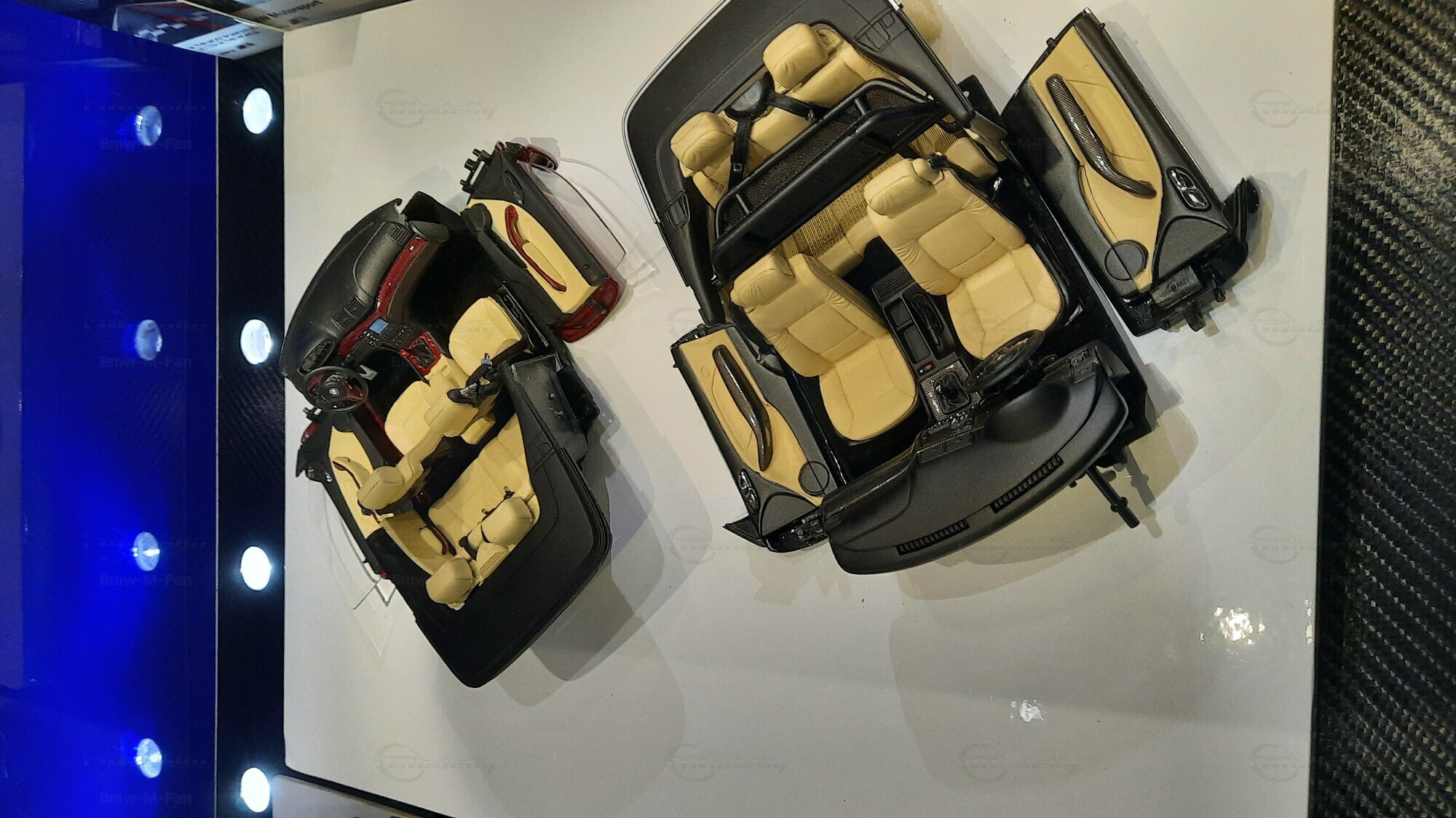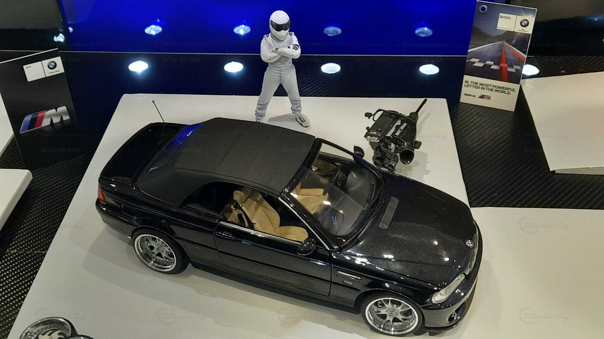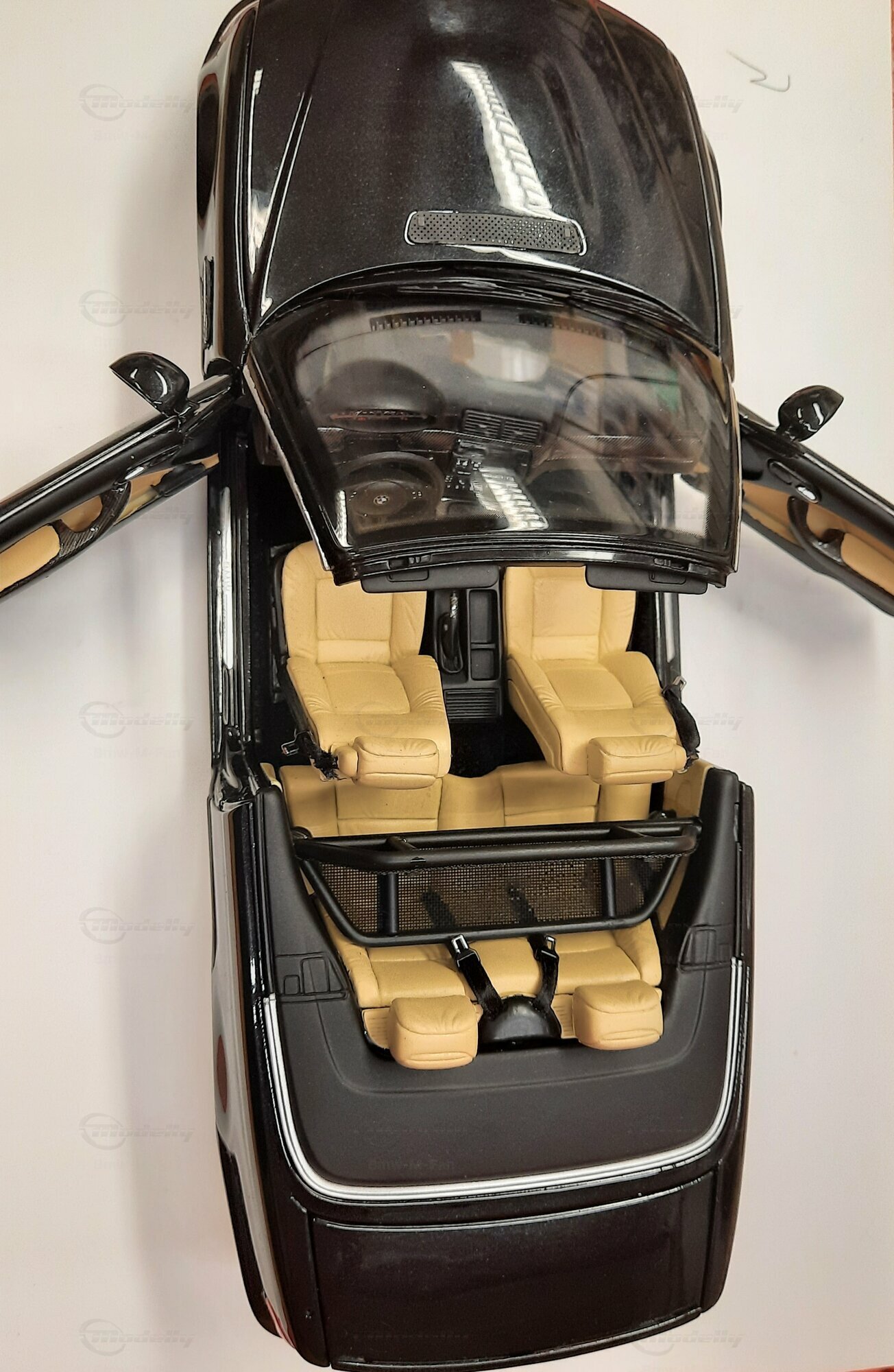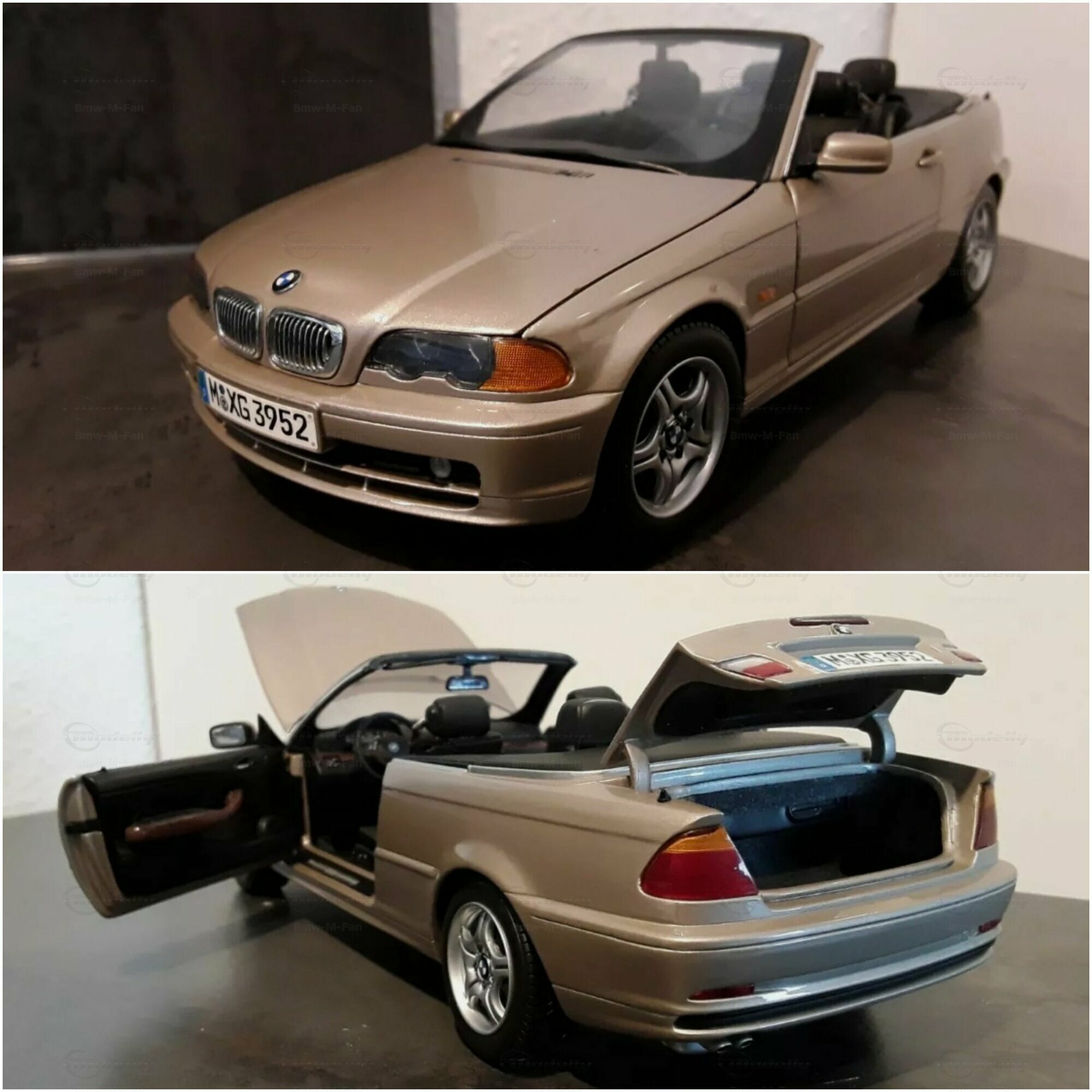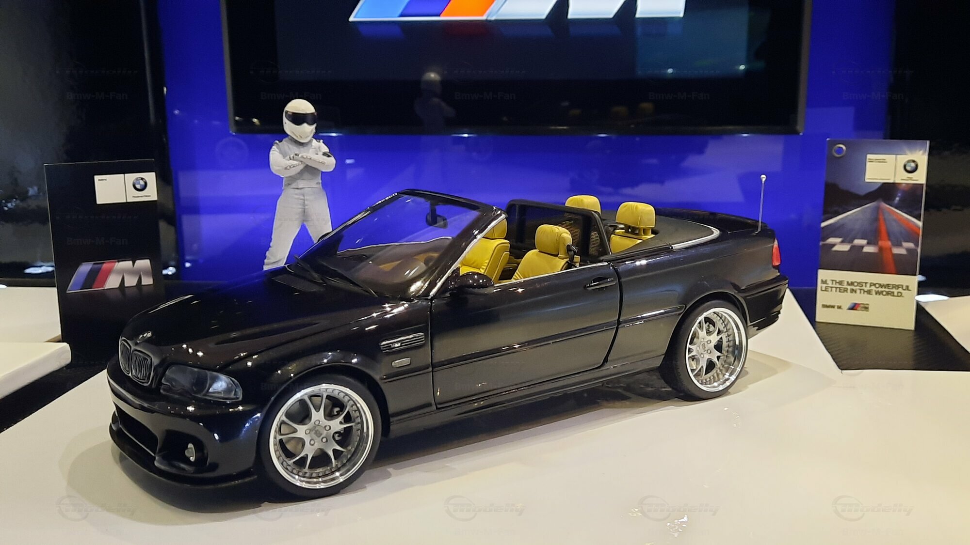 Modelly user "Bmw-M-Fan" proudly showcases this modified model, which stands out for its high level of detail and many true-to-life features. The beige interior stands out and provides a contrast to the black exterior. Even the smallest details like the functional doors, hood latch, and realistically replicated light fixtures are faithfully reproduced. An interesting detail is the wheels, depicted as detachable, which is a rarity in the model world. Overall, this model car is a highlight for any collector and impressively showcases the brilliance of the Kyosho workshop, without neglecting the many individual modifications and special features.