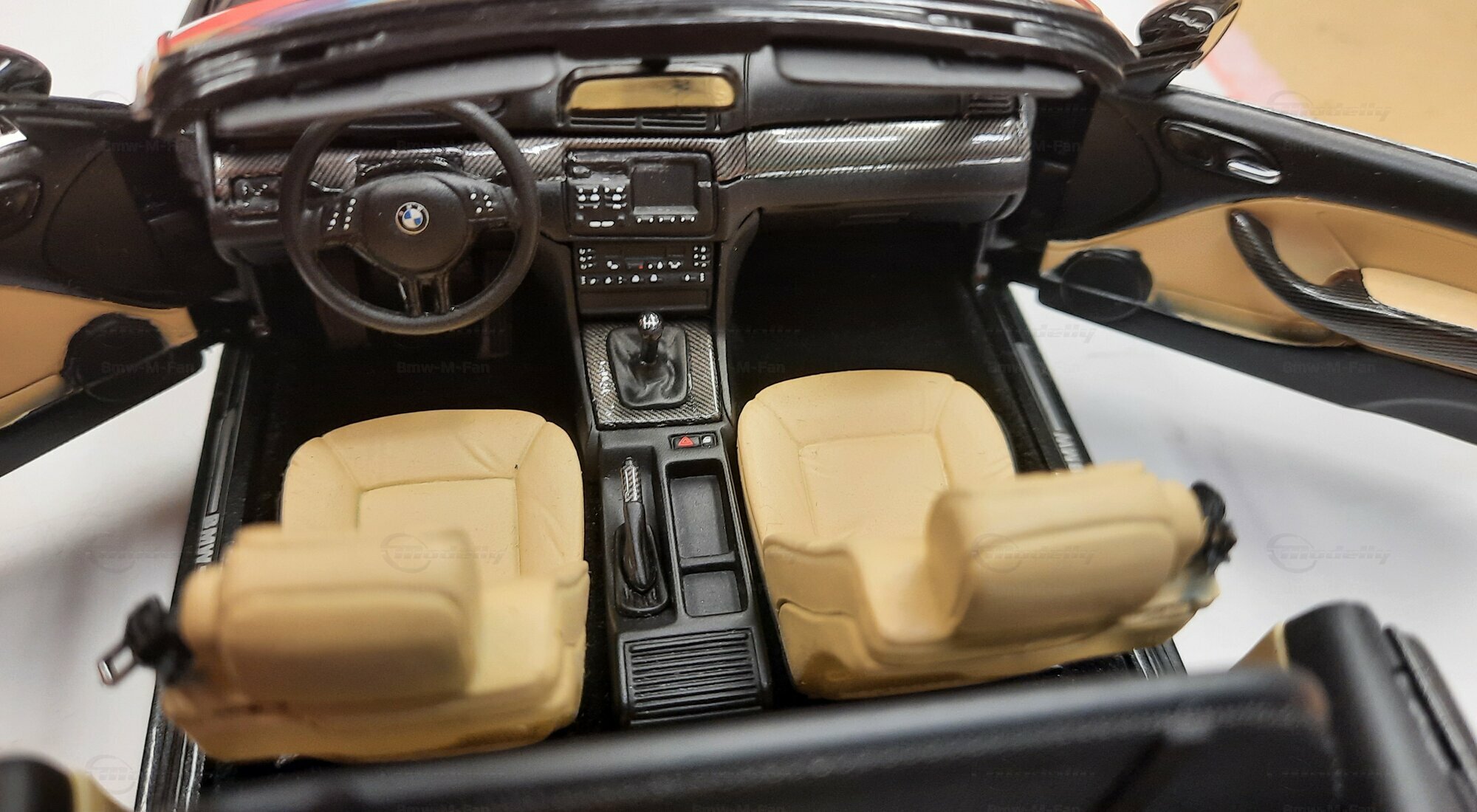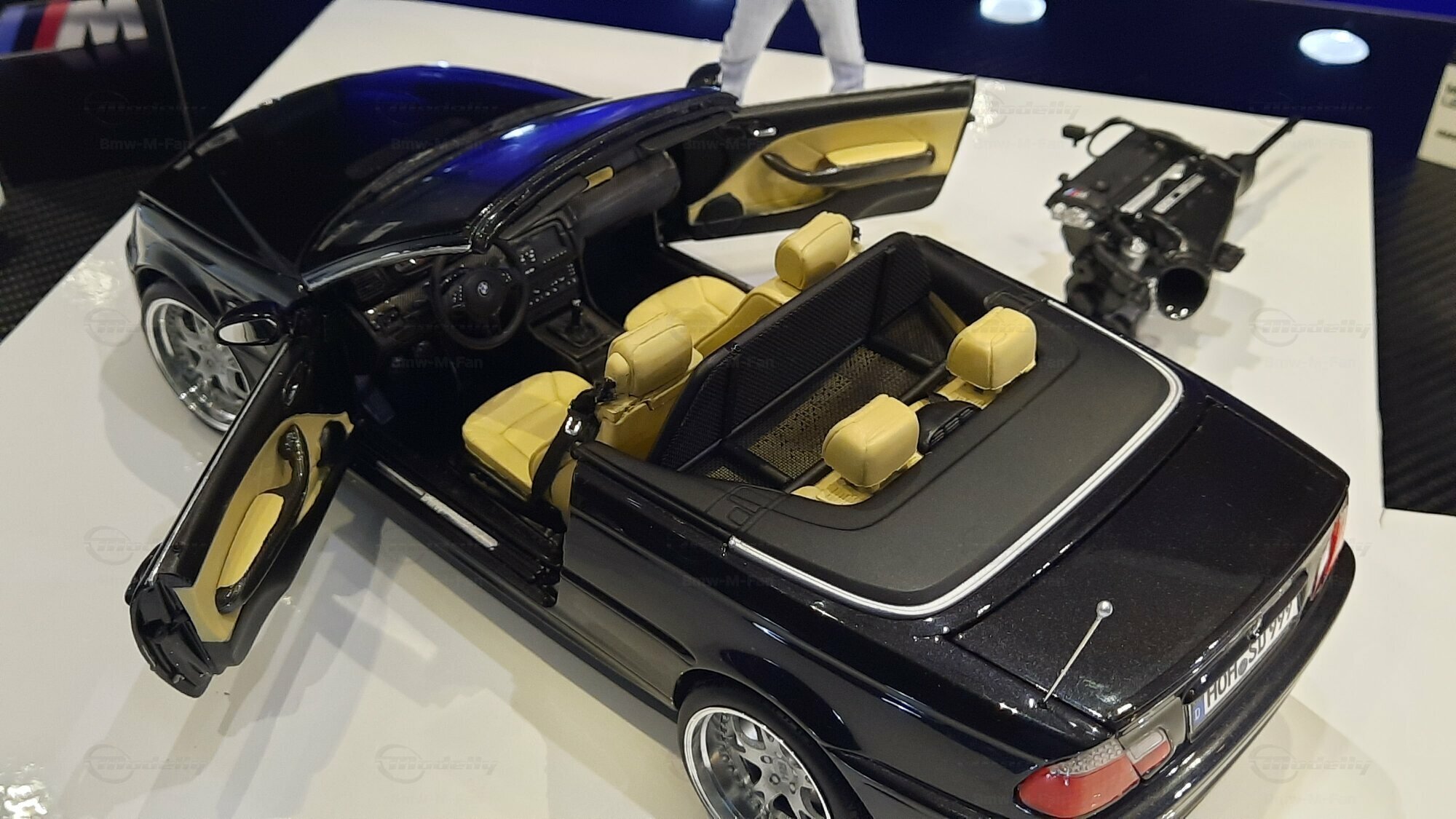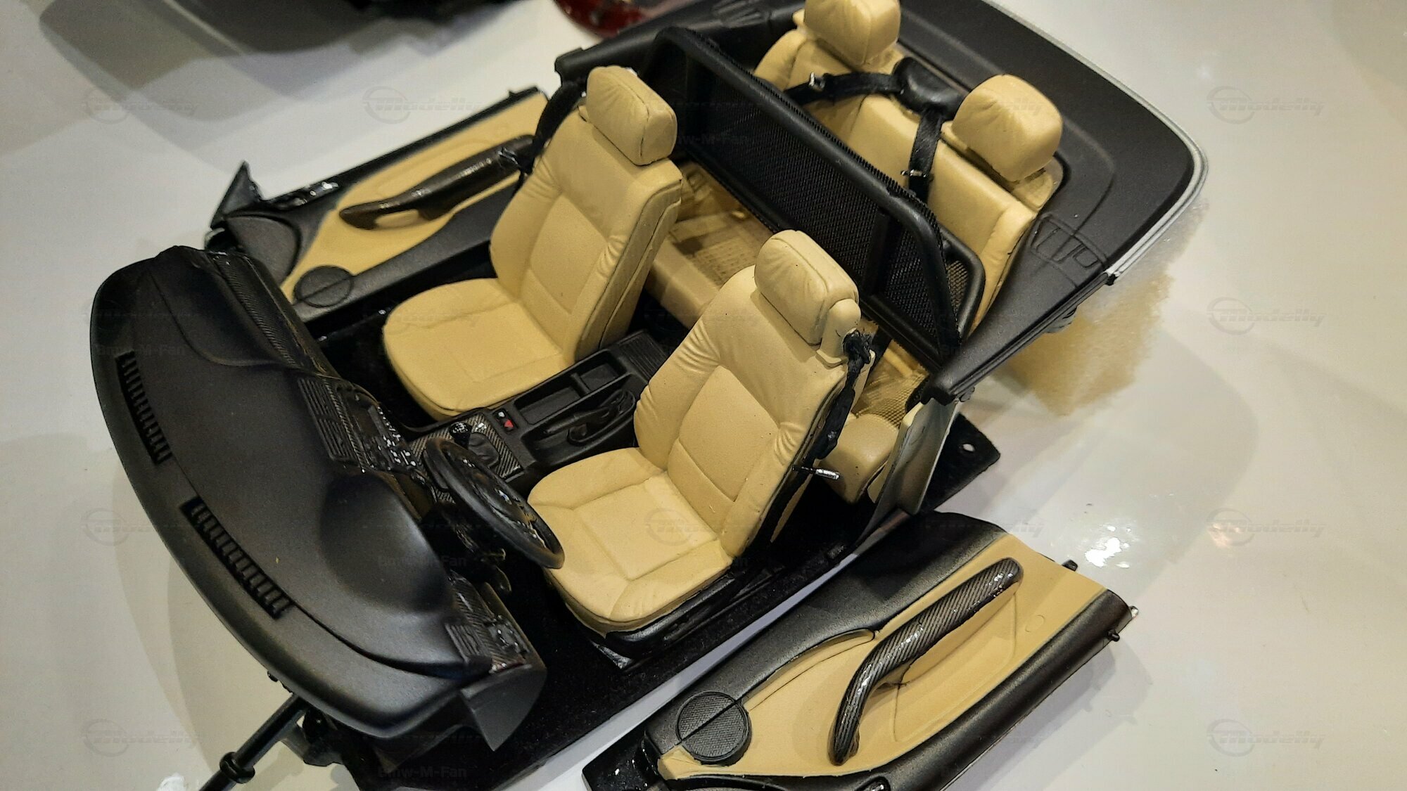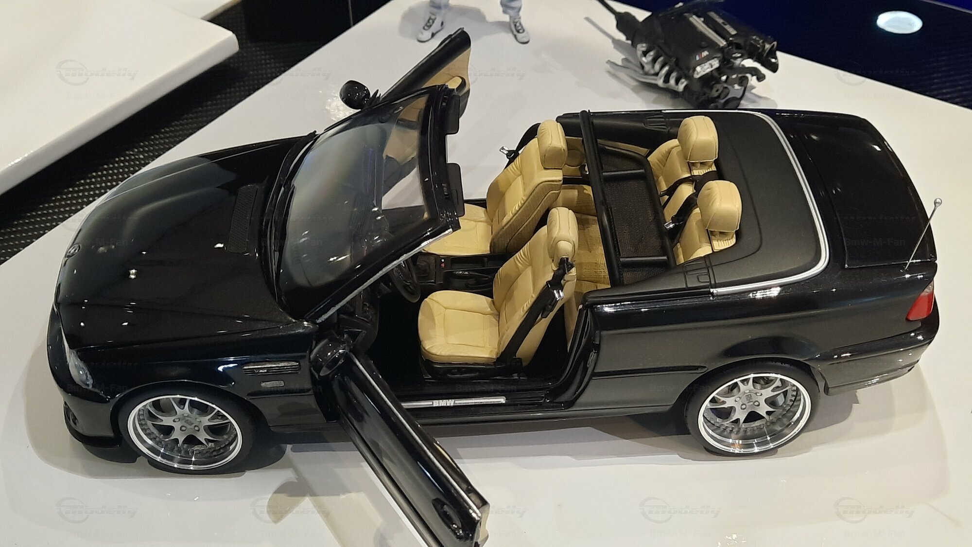 The model car made in the scale of 1/18 is crafted from Diecast material, ensuring high strength and detail accuracy. This particular model is modified, evident from the visible changes like the specific rims. The rims are from BBS and are the LM model, known for its sporty look and high quality. The model car's paint job is a deep black, creating an elegant contrast with the beige interior. The M-stripe decal on the hood is particularly striking, hinting at its sporty lineage. Details and decals in the photos, like the BMW emblem and the M logo, further reinforce this sporty impression.