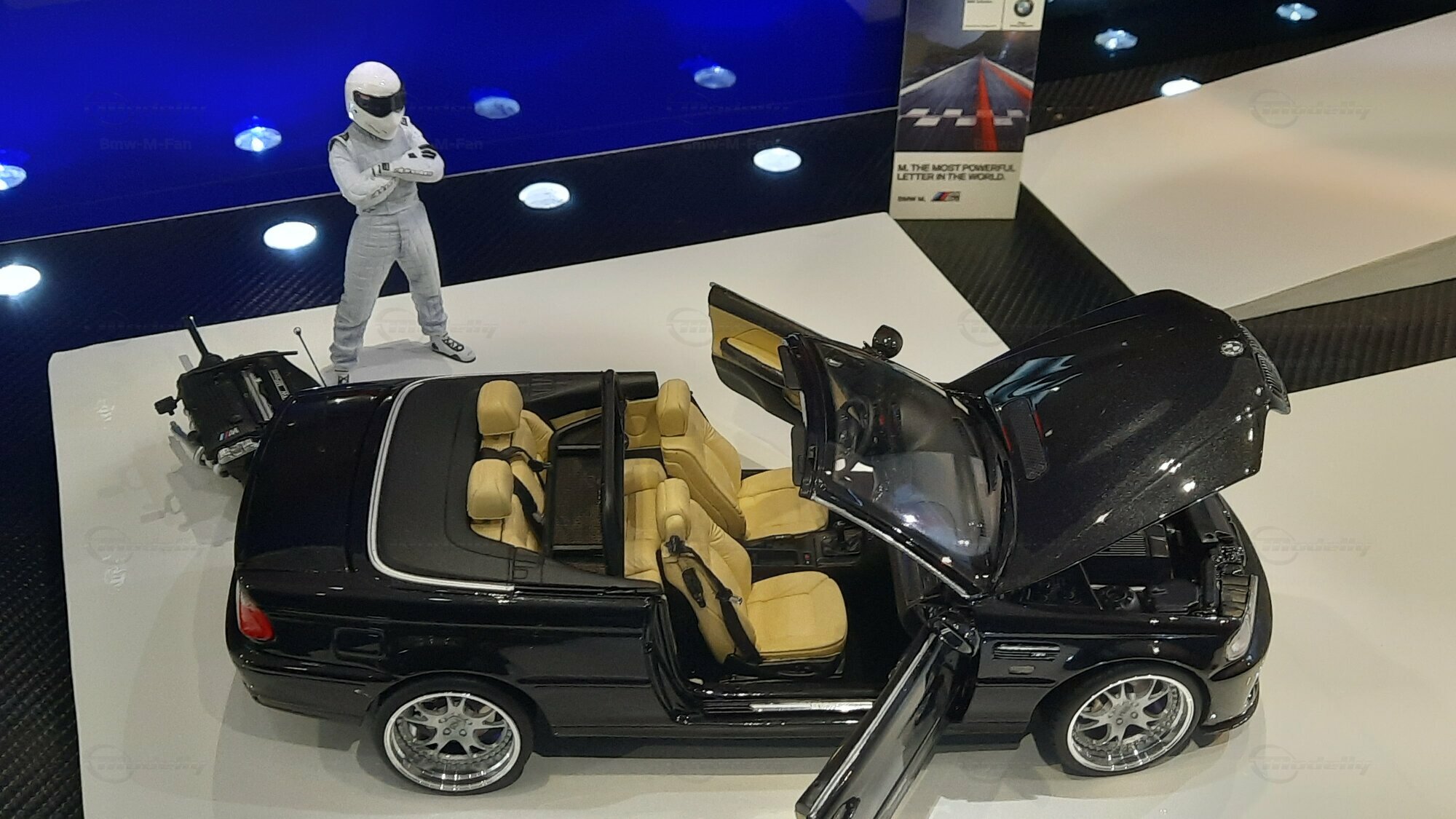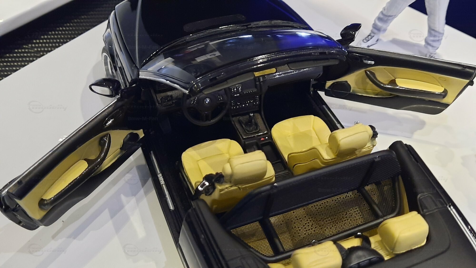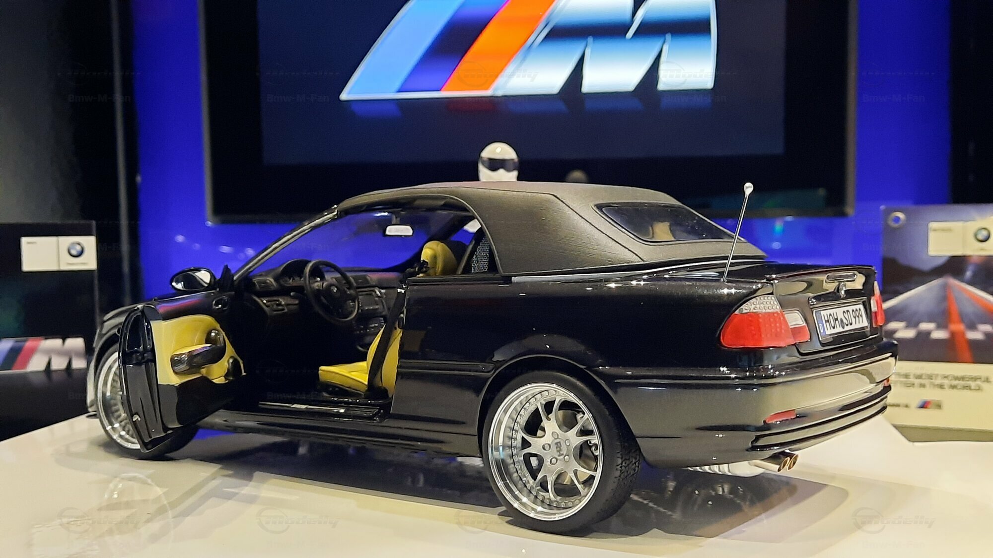 The model car made in the scale of 1/18 is crafted from Diecast material, ensuring high strength and detail accuracy. This particular model is modified, evident from the visible changes like the specific rims. The rims are from BBS and are the LM model, known for its sporty look and high quality. The model car's paint job is a deep black, creating an elegant contrast with the beige interior. The M-stripe decal on the hood is particularly striking, hinting at its sporty lineage. Details and decals in the photos, like the BMW emblem and the M logo, further reinforce this sporty impression.