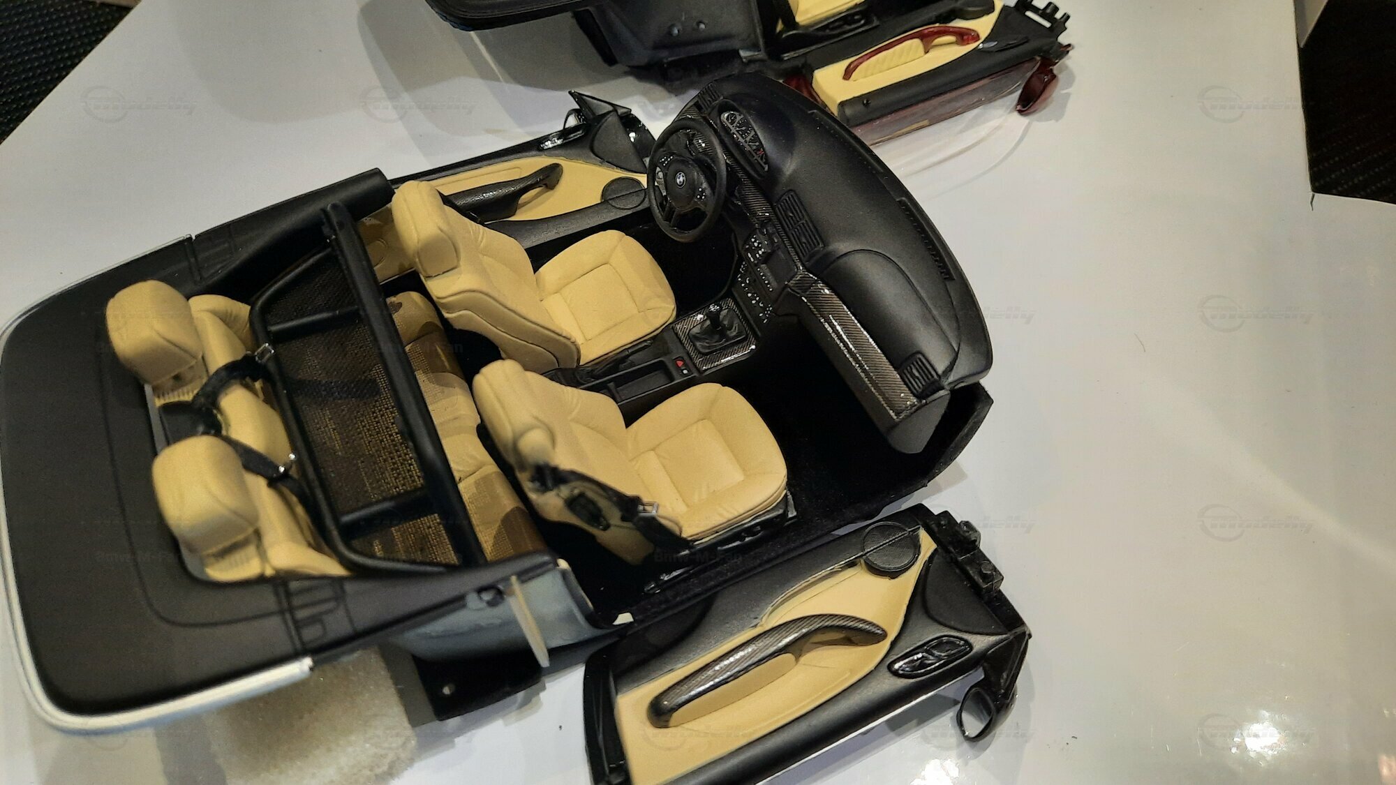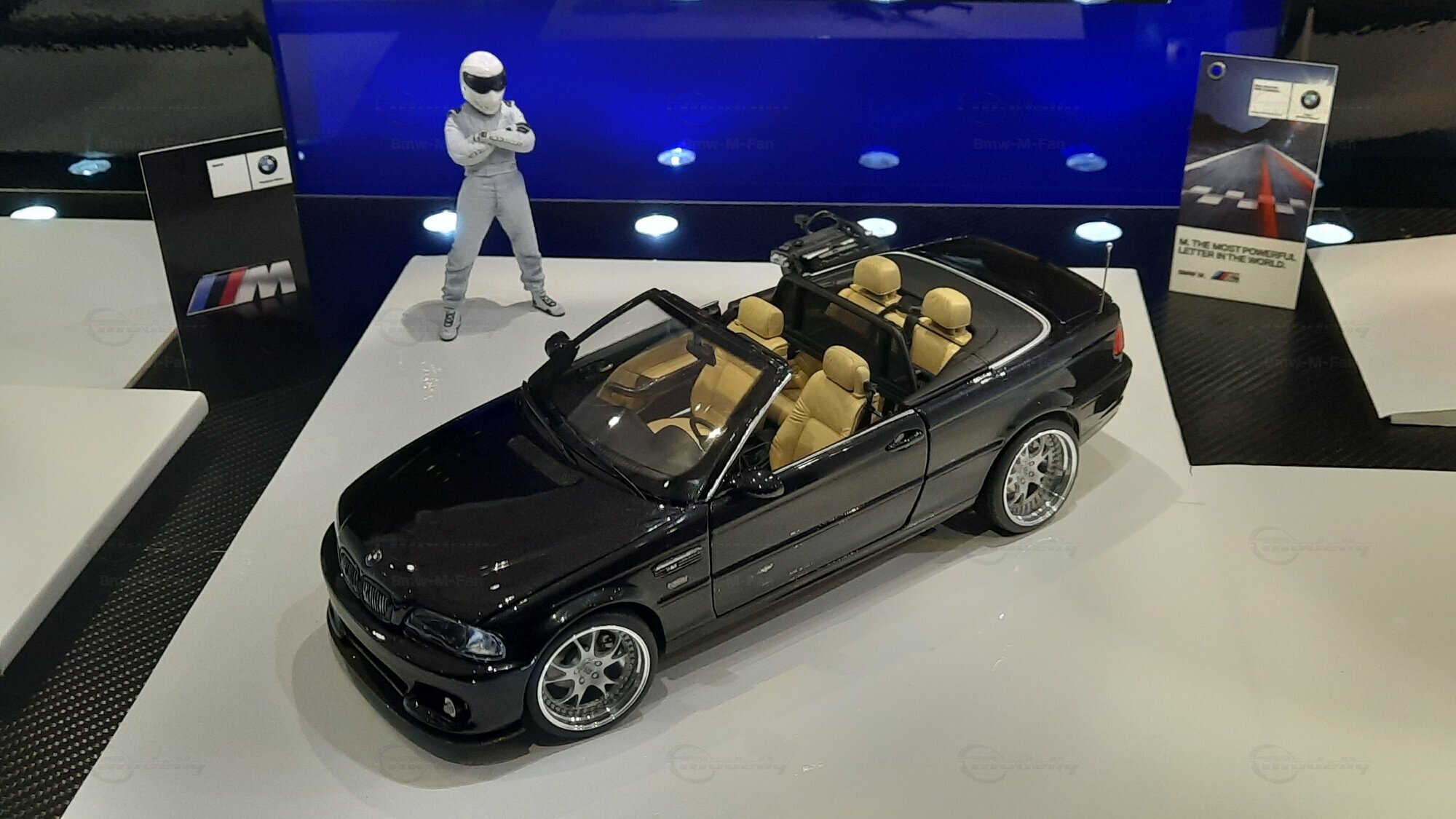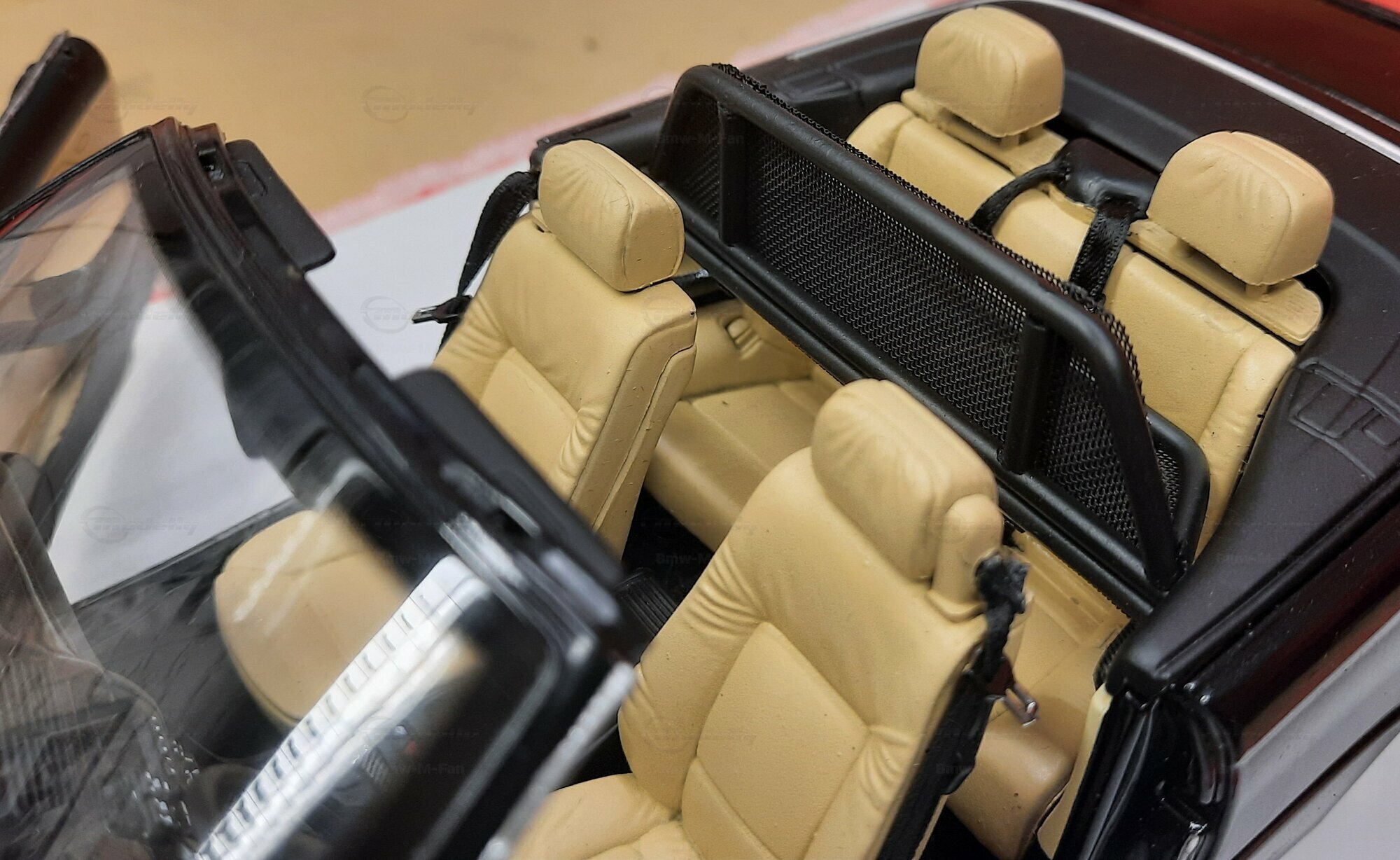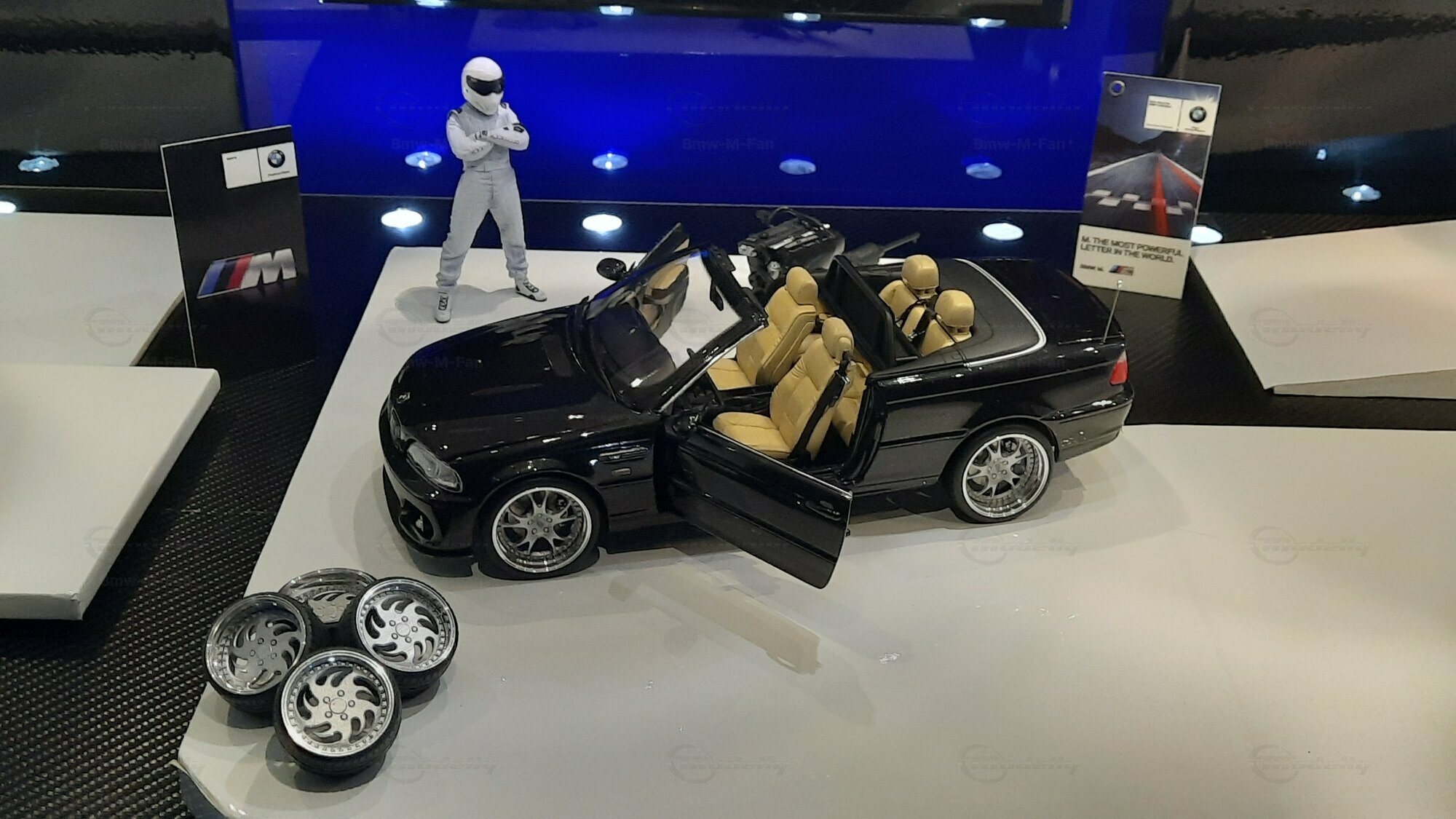 The model car made in the scale of 1/18 is crafted from Diecast material, ensuring high strength and detail accuracy. This particular model is modified, evident from the visible changes like the specific rims. The rims are from BBS and are the LM model, known for its sporty look and high quality. The model car's paint job is a deep black, creating an elegant contrast with the beige interior. The M-stripe decal on the hood is particularly striking, hinting at its sporty lineage. Details and decals in the photos, like the BMW emblem and the M logo, further reinforce this sporty impression.