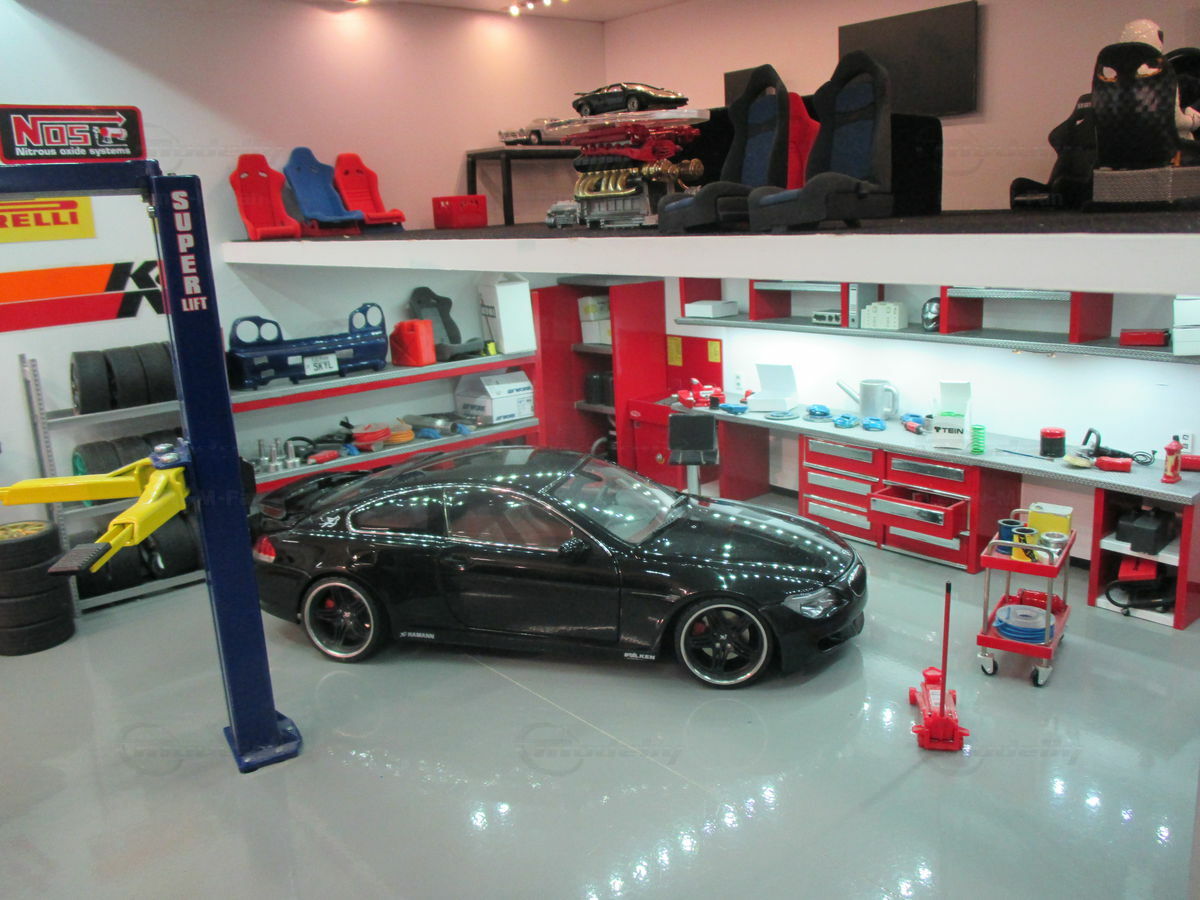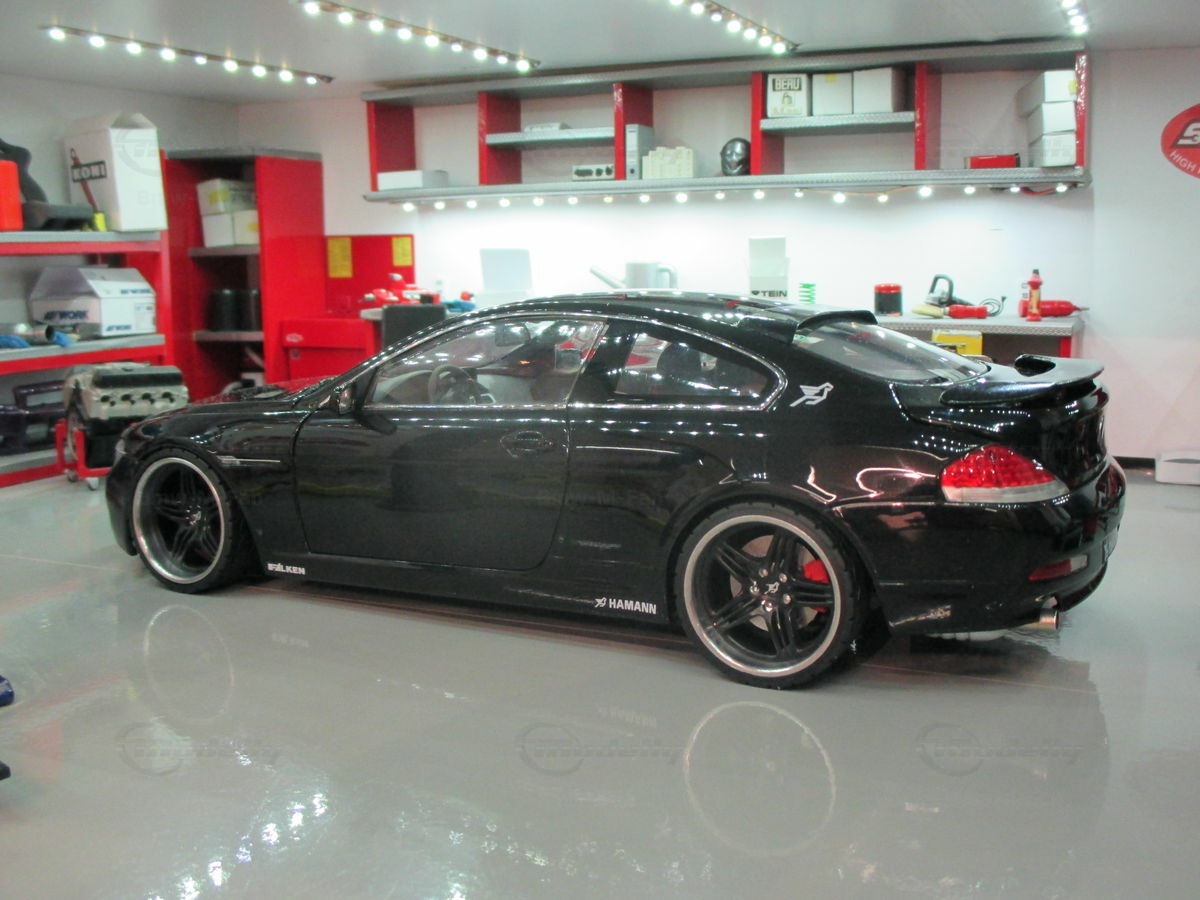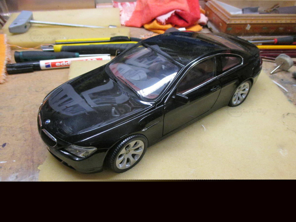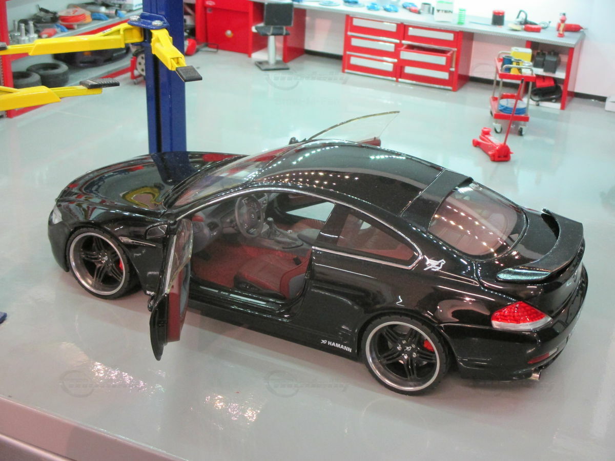The miniature presented here is a model of a BMW E63 650i, crafted in a 1/18 scale. This model from the collection of Modelly member "Bmw-M-Fan" was originally manufactured by Kyosho. This is a modified version and does not represent the original product produced by Kyosho. The model car is made of high-quality diecast material, providing remarkable detail accuracy and durability. Displayed in a realistically designed miniature car workshop setting, the model showcases its impressive aesthetics and the faithful reproduction of the original.