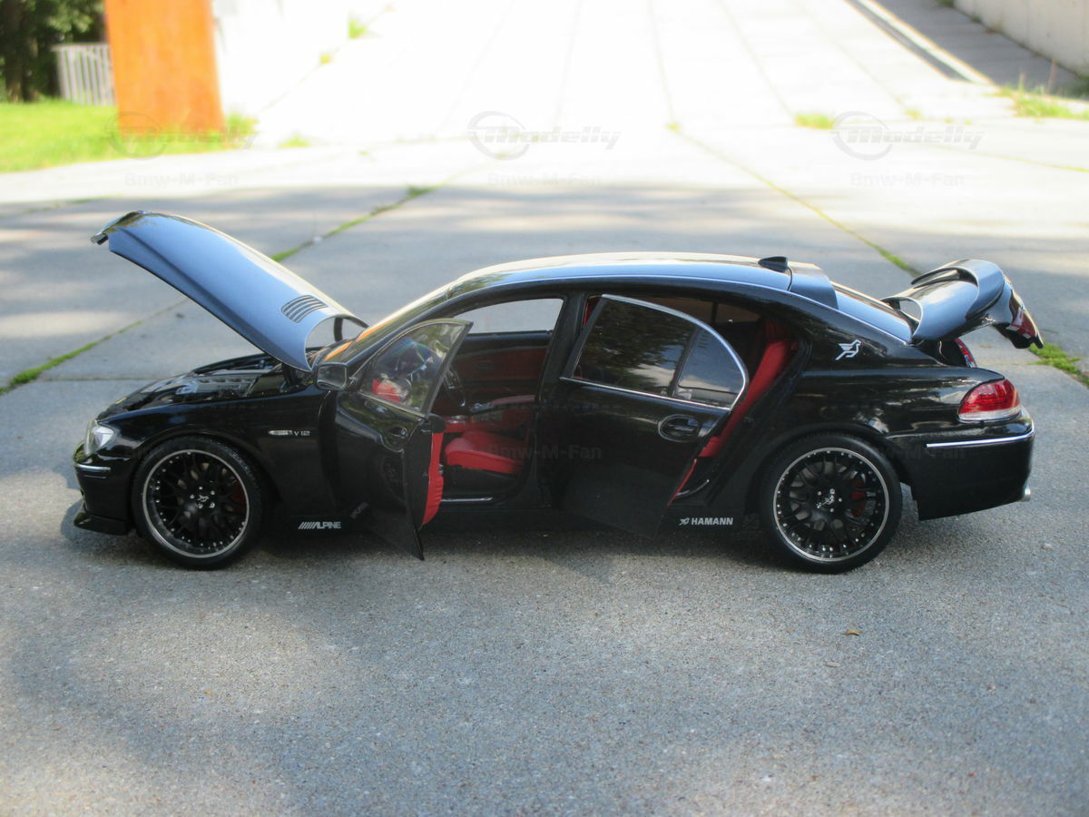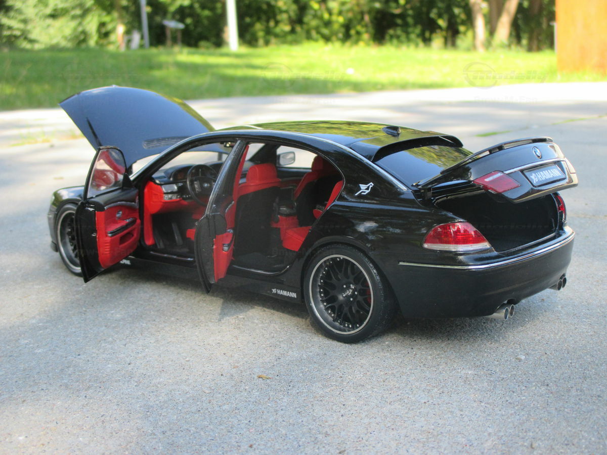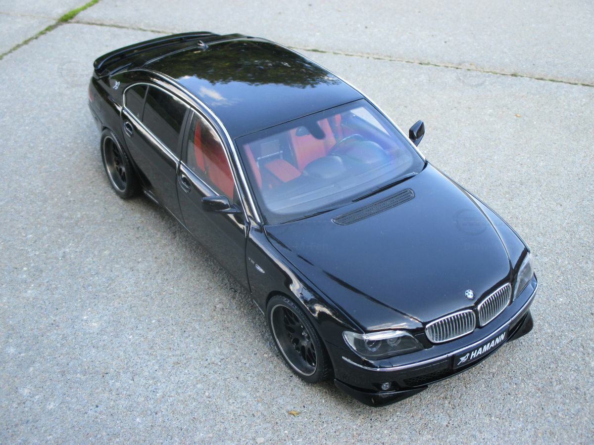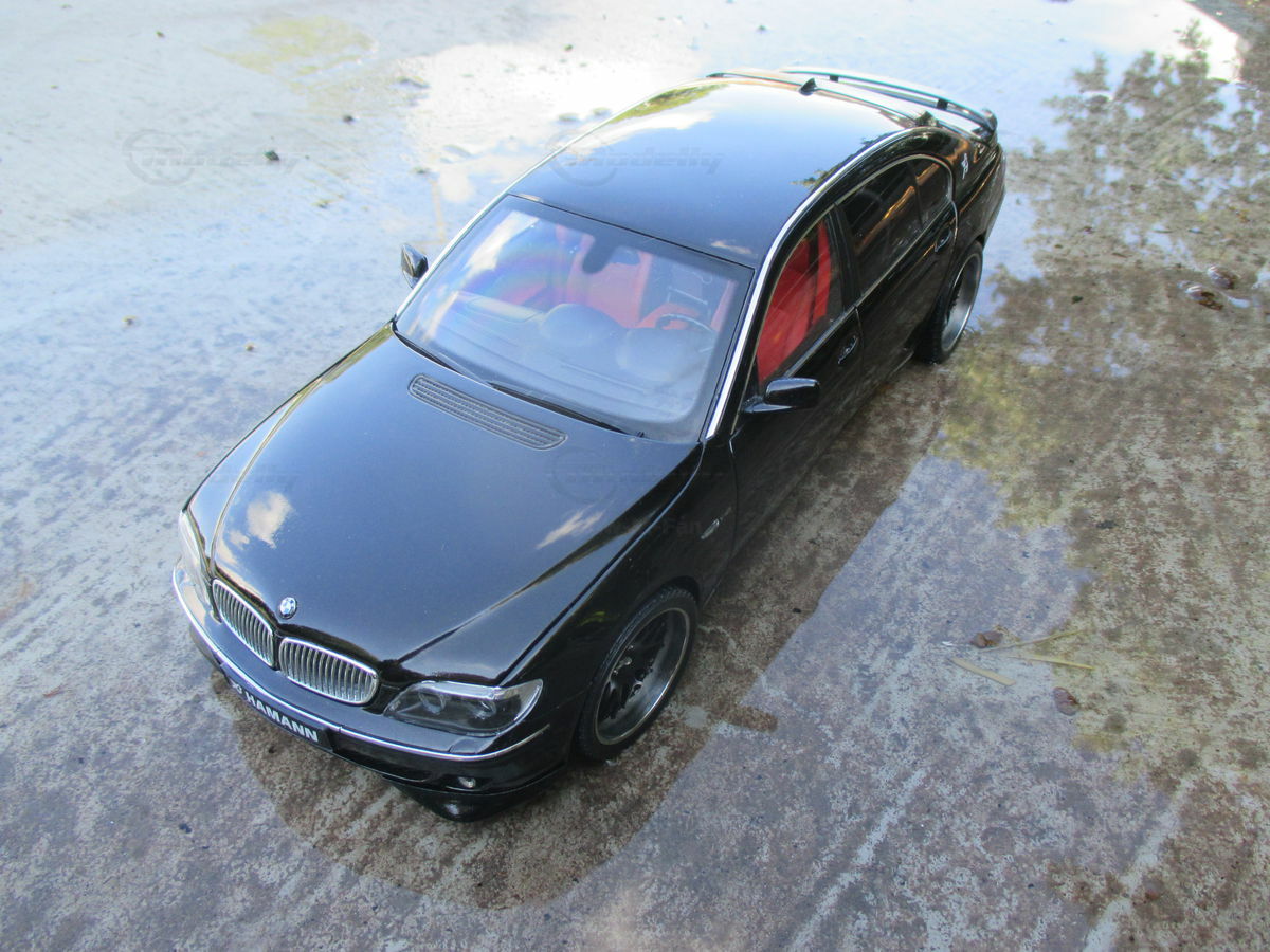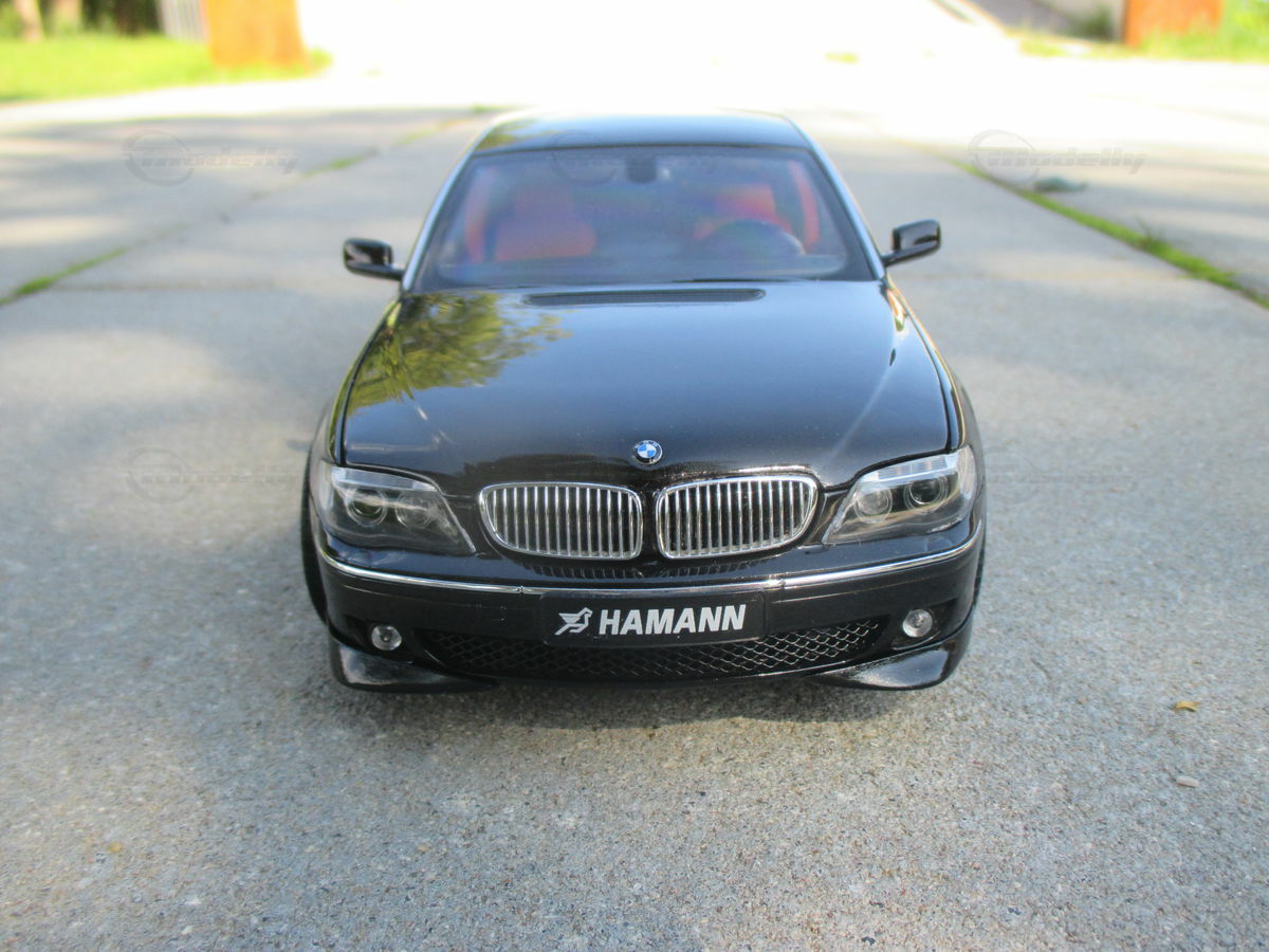 The model car shown here in 1/18 scale was manufactured by Kyosho. It is a precision replica of the BMW E66 760li. The model is made from diecast material and exhibits a high level of detail accuracy. It is worth noting that the displayed model is modified and does not represent the original product manufactured by Kyosho. This model belongs to the collection of "Modelly" member "Bmw-M-Fan". This modified version was particularly valued for its attention to detail and the distinctive black exterior. The external features, including the Hamann body kit, differentiate the model from the stock version.