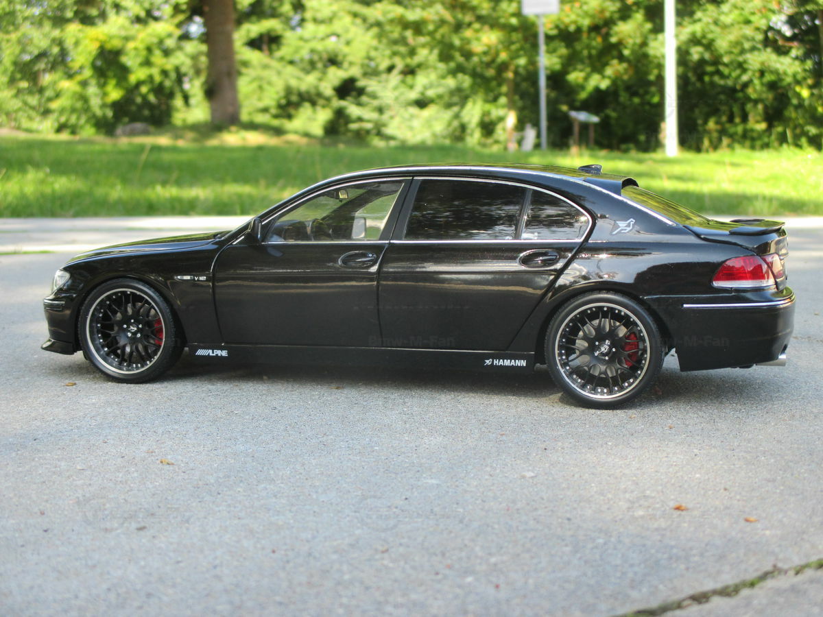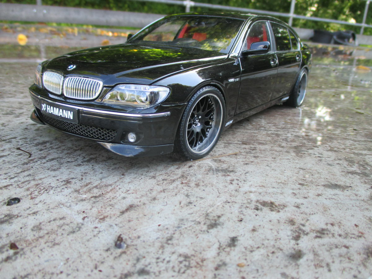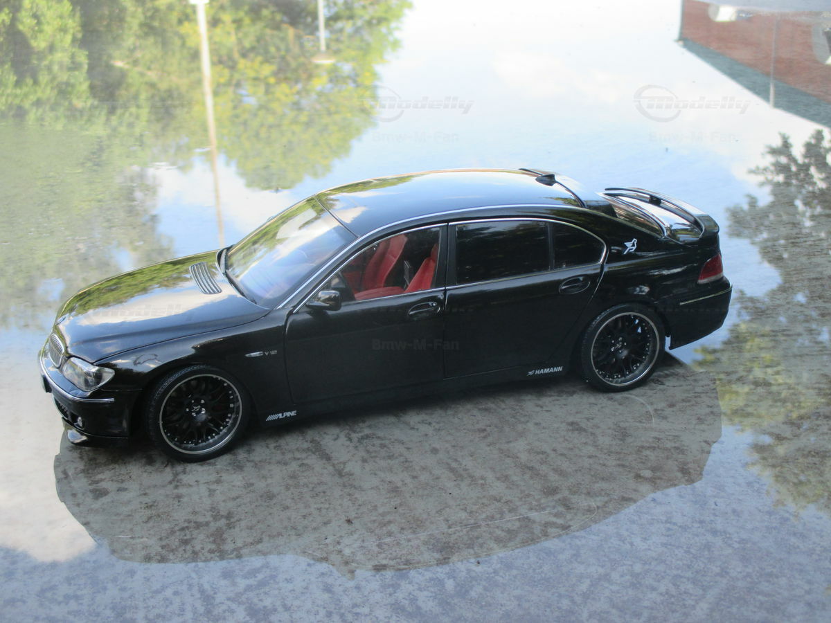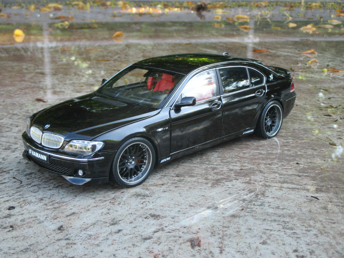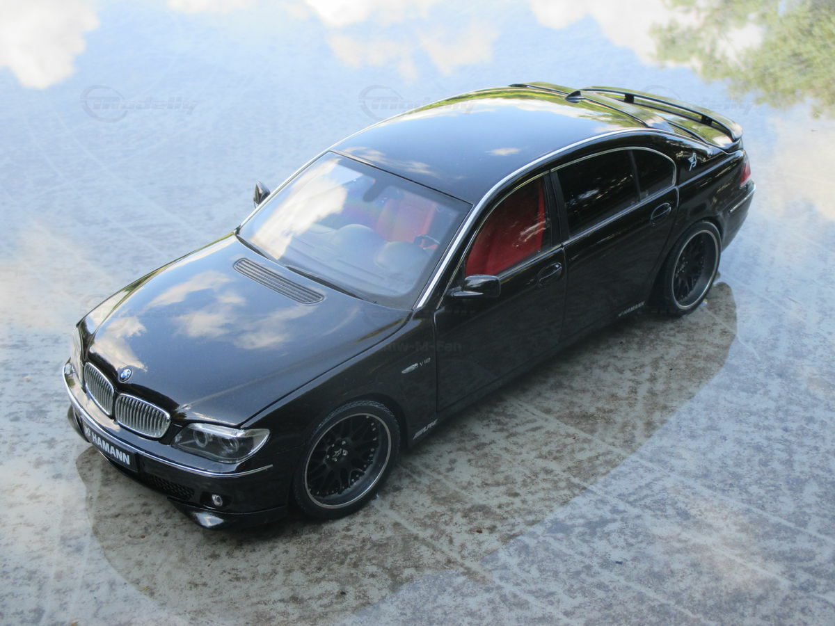 The model car shown here in 1/18 scale was manufactured by Kyosho. It is a precision replica of the BMW E66 760li. The model is made from diecast material and exhibits a high level of detail accuracy. It is worth noting that the displayed model is modified and does not represent the original product manufactured by Kyosho. This model belongs to the collection of "Modelly" member "Bmw-M-Fan". This modified version was particularly valued for its attention to detail and the distinctive black exterior. The external features, including the Hamann body kit, differentiate the model from the stock version.
